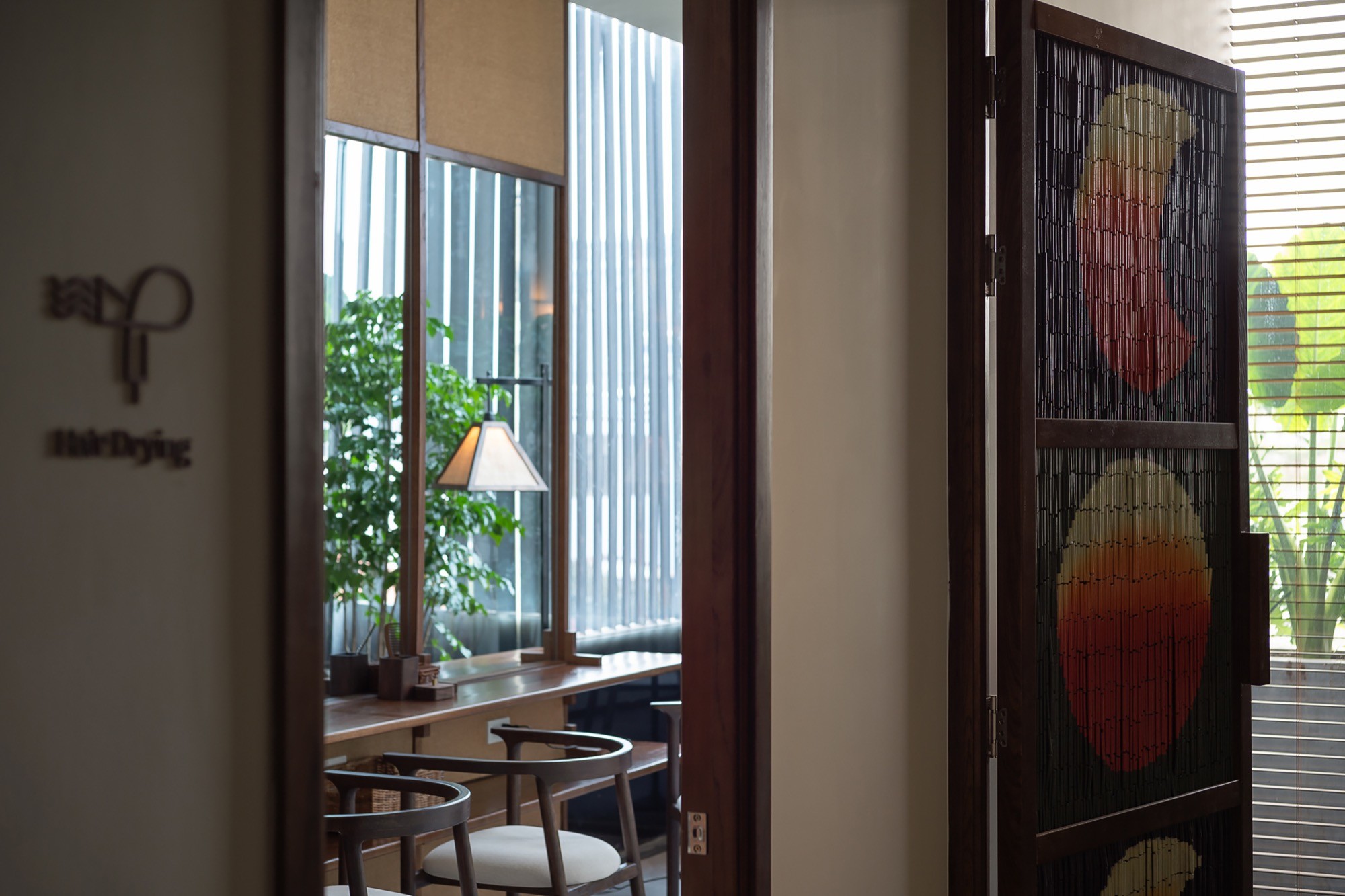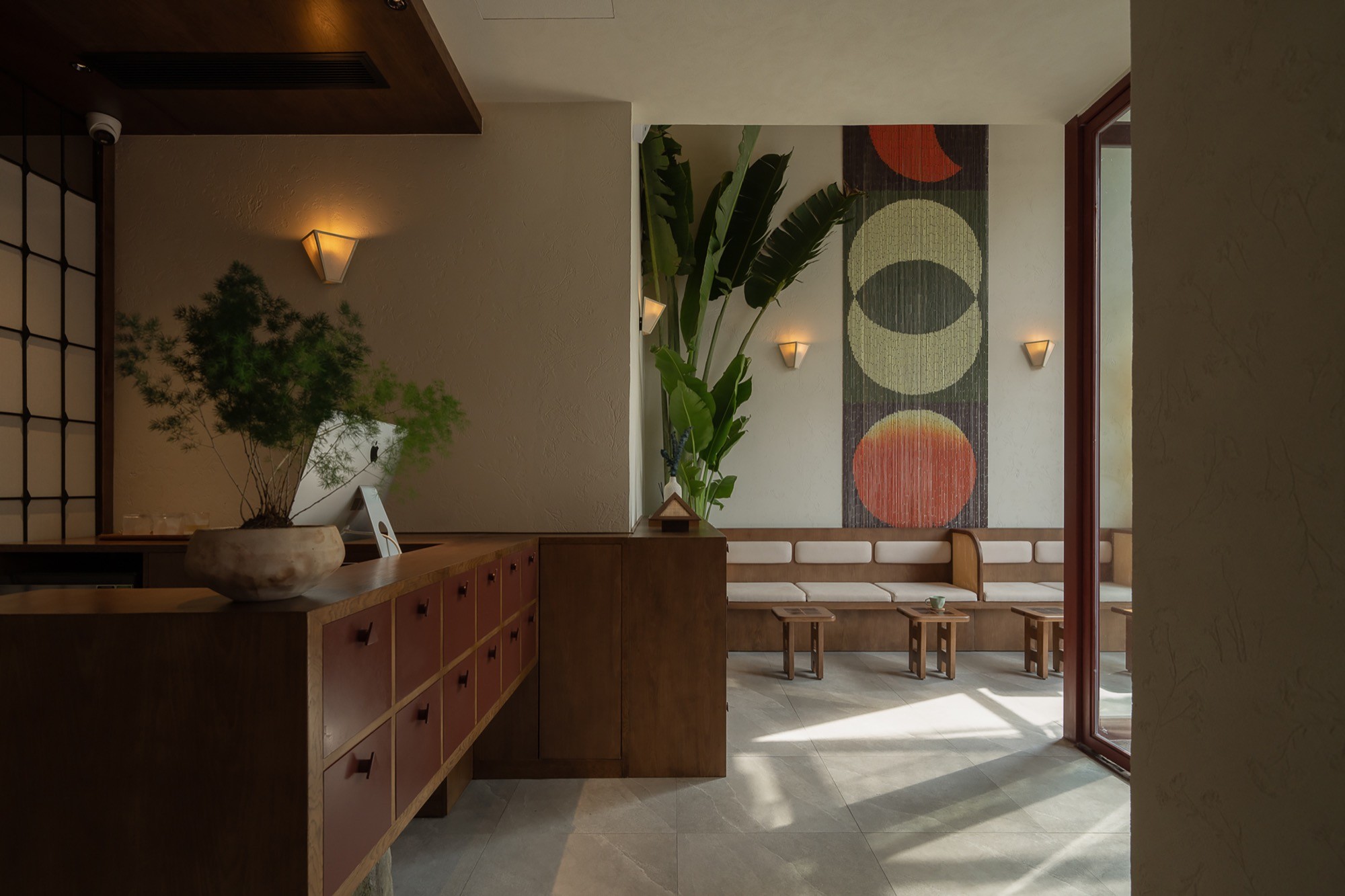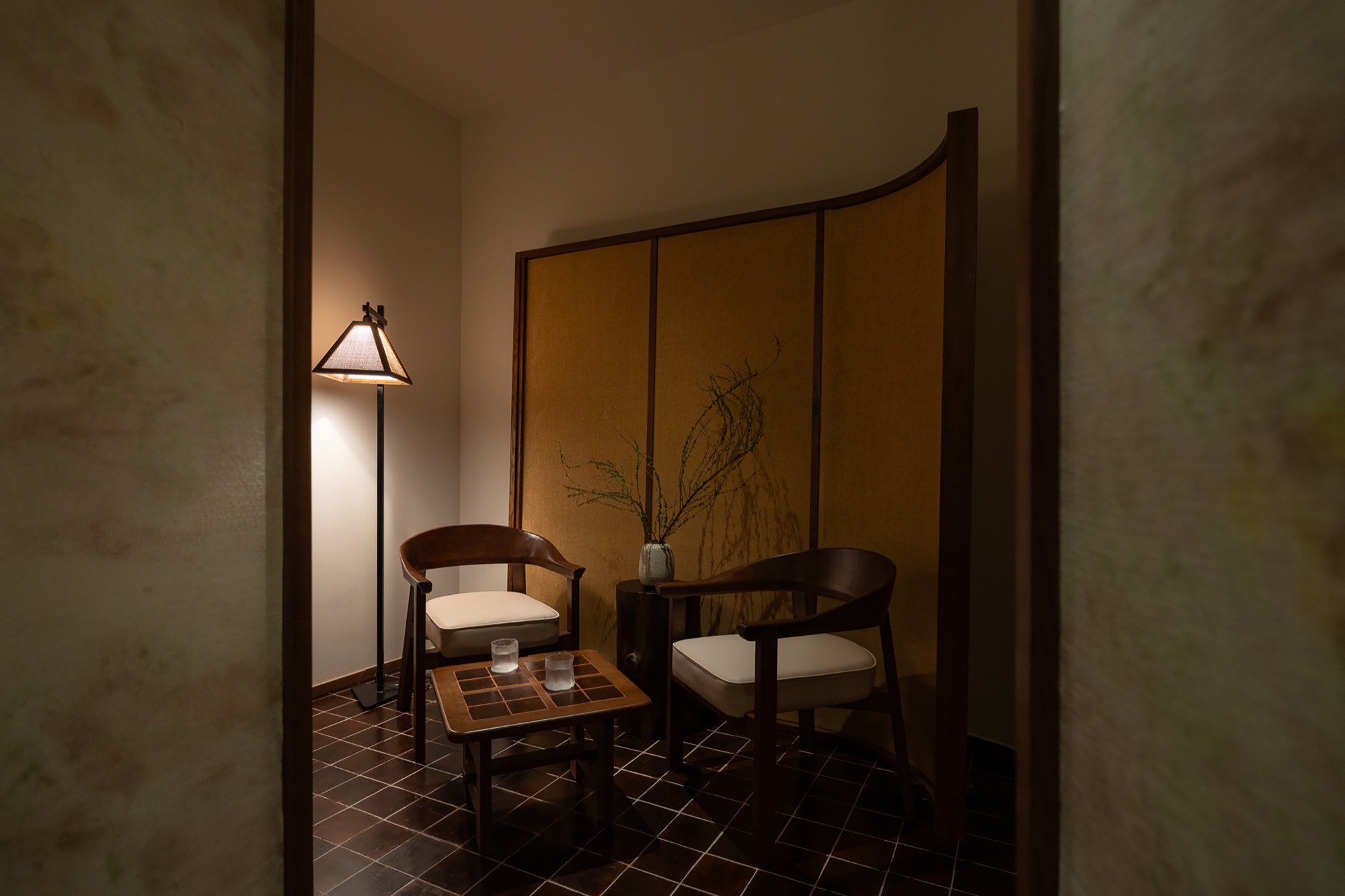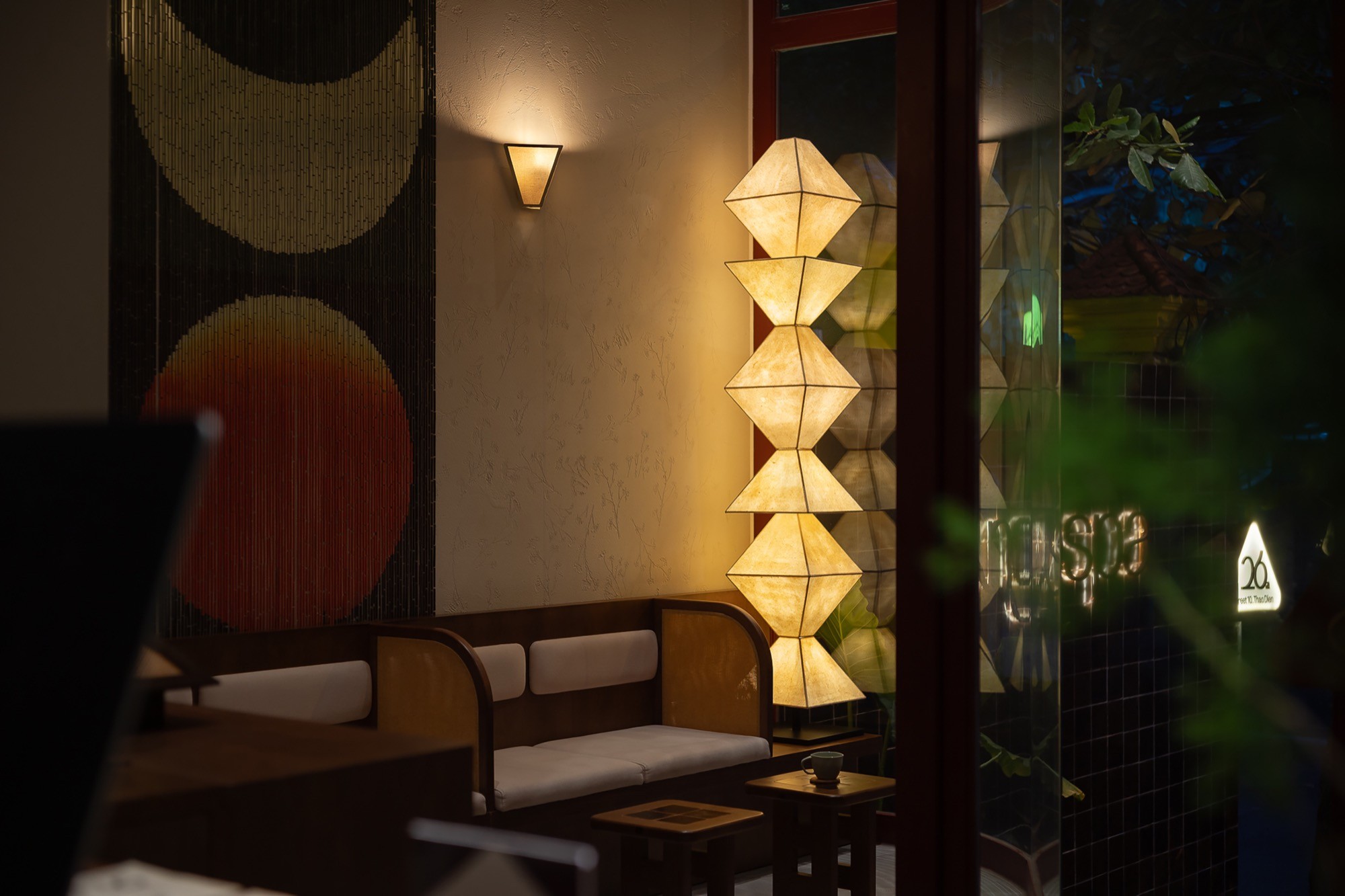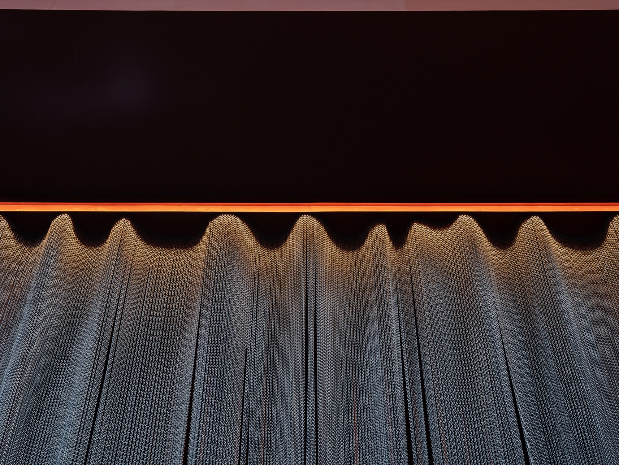 Lớp rèm kim loại rủ mềm ở mặt đứng vừa che chắn vừa gợi mở, cho phép ánh sáng xuyên qua thành những dải mờ, hình thành một lớp trung gian giàu cảm xúc. Bên dưới, gam màu trầm ấm kết hợp với ánh đèn vàng và bề mặt gạch tối tạo nên một tiền sảnh chuyển tiếp, đưa người dùng rời khỏi nhịp sống gấp gáp để bước vào trạng thái chậm và tĩnh hơn.