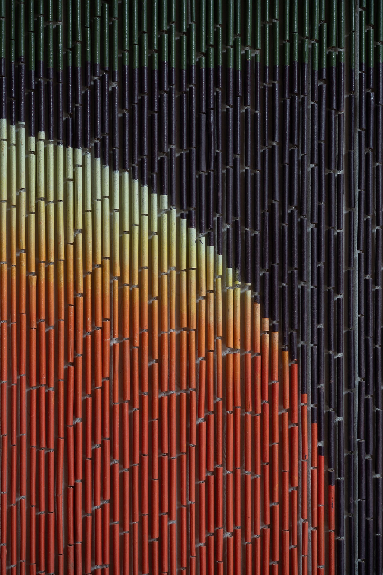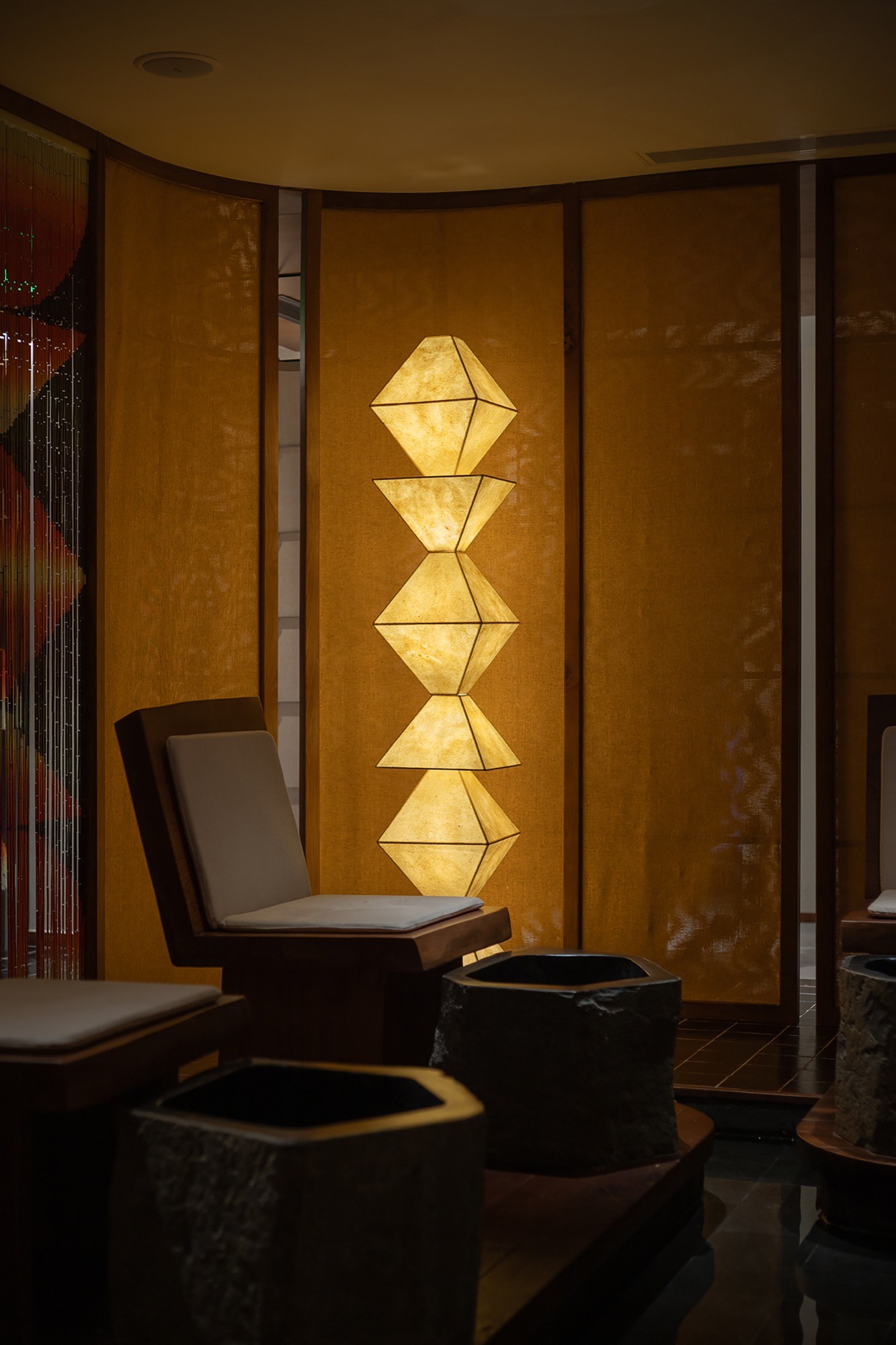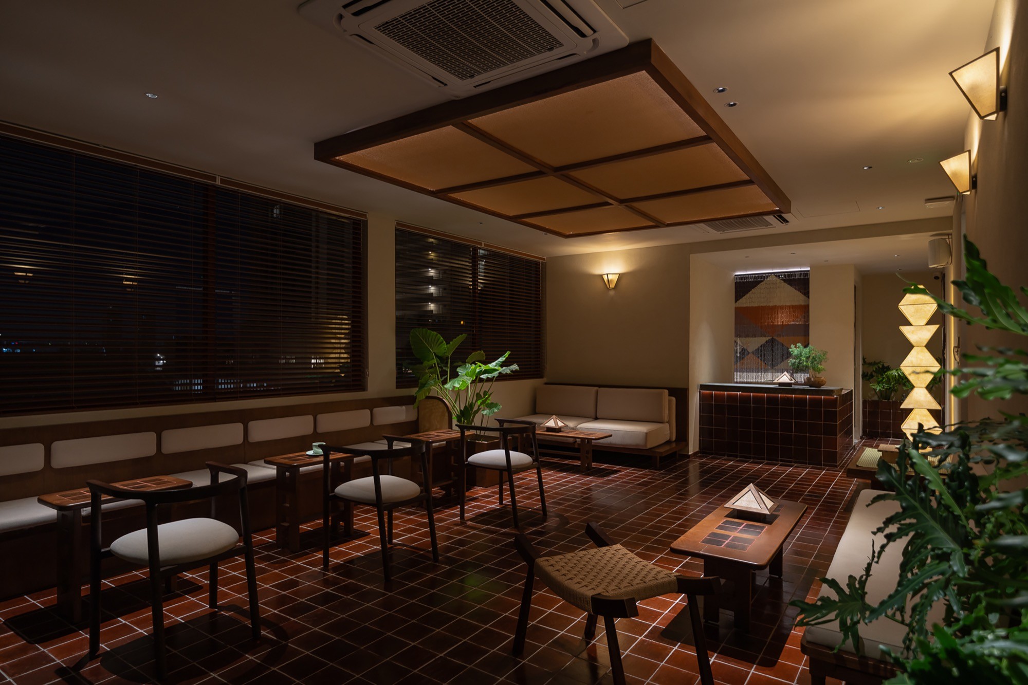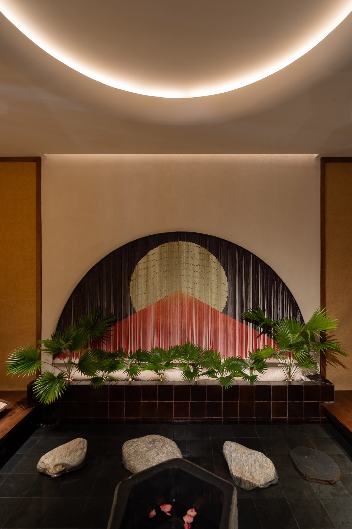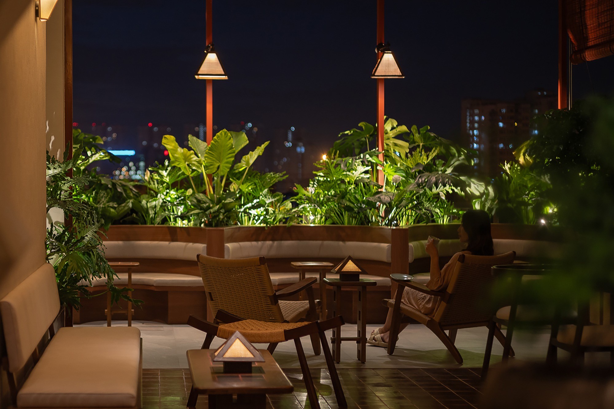 Lớp rèm kim loại rủ mềm ở mặt đứng vừa che chắn vừa gợi mở, cho phép ánh sáng xuyên qua thành những dải mờ, hình thành một lớp trung gian giàu cảm xúc. Bên dưới, gam màu trầm ấm kết hợp với ánh đèn vàng và bề mặt gạch tối tạo nên một tiền sảnh chuyển tiếp, đưa người dùng rời khỏi nhịp sống gấp gáp để bước vào trạng thái chậm và tĩnh hơn.