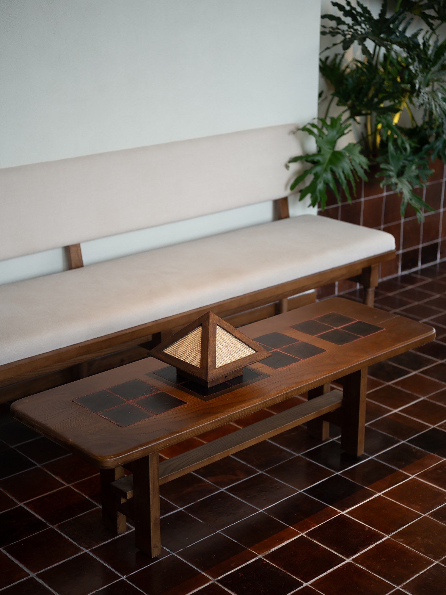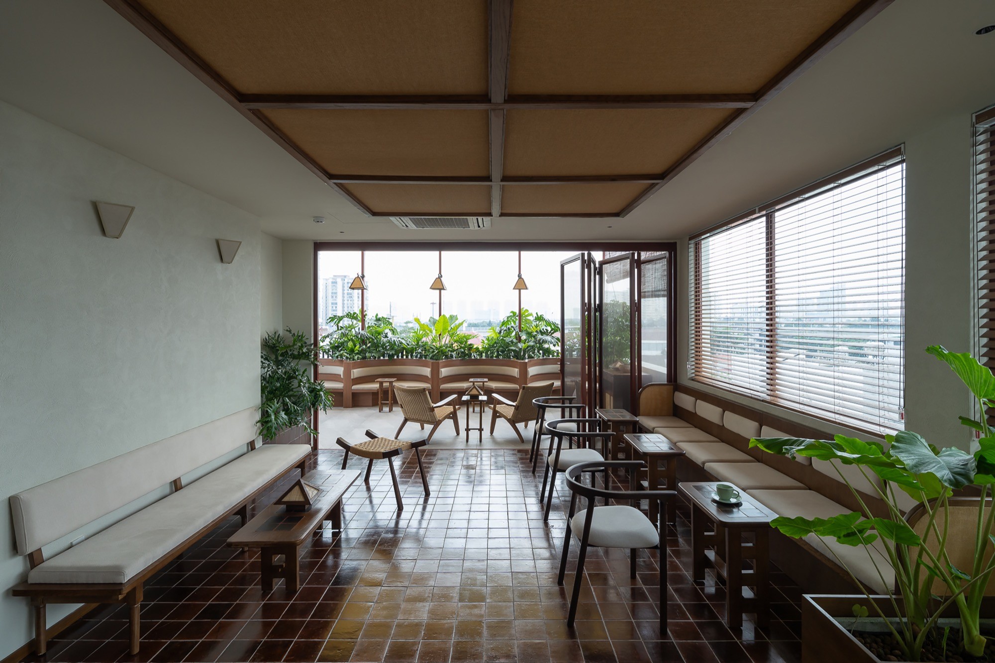 Bên trong, không gian được tổ chức qua các lớp chuyển tiếp mềm. Ánh sáng và vật liệu tự nhiên như gỗ, gạch, vải được kiểm soát chặt chẽ, tạo nên một nền không gian ổn định và hướng nội. Trần giật cấp cùng nội thất thấp định hình một cấu trúc gần gũi, giữ tỷ lệ ở mức thân mật.