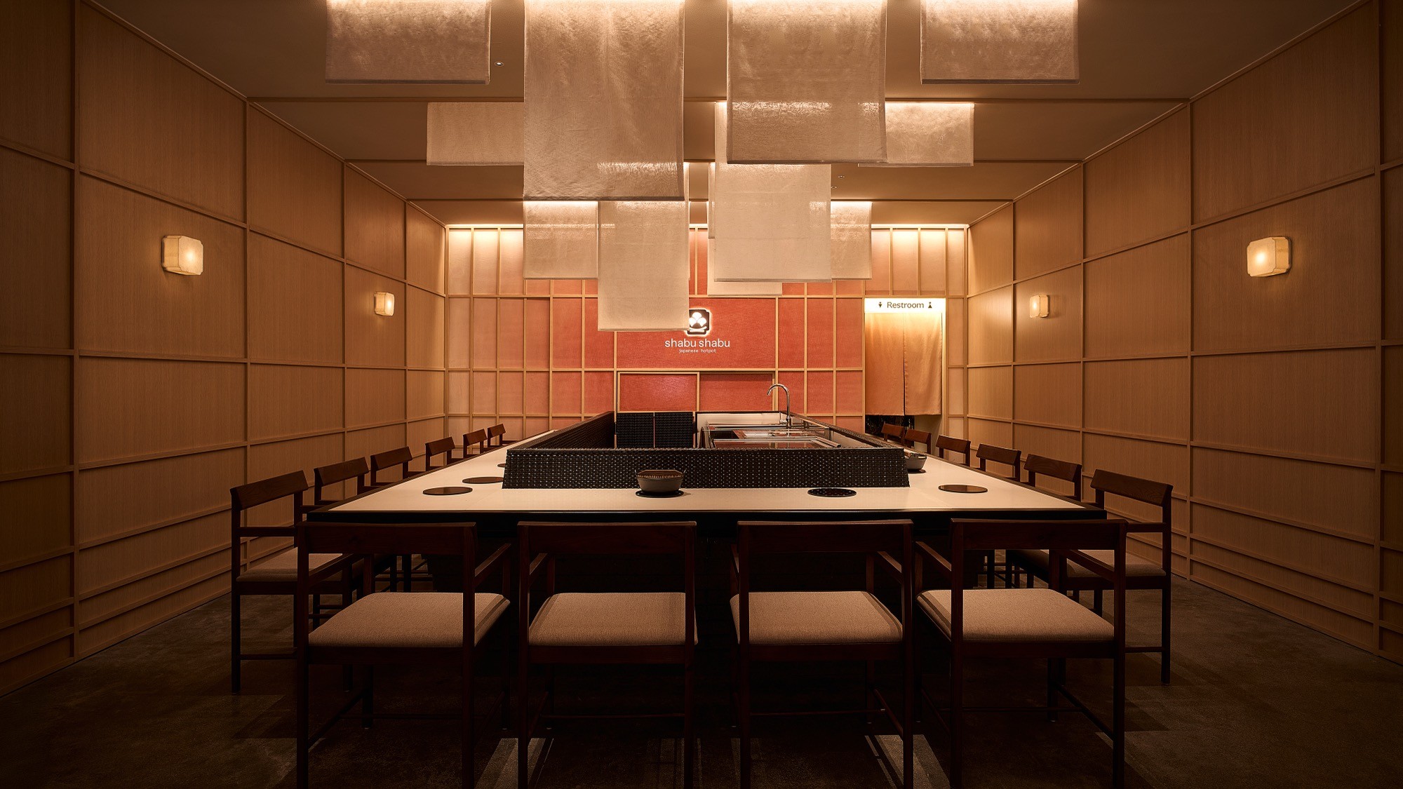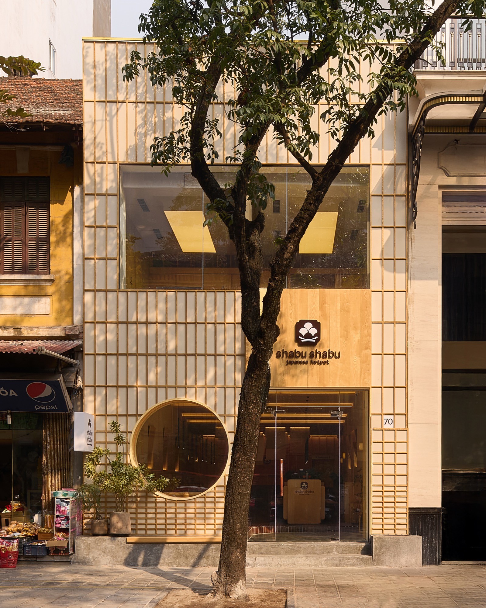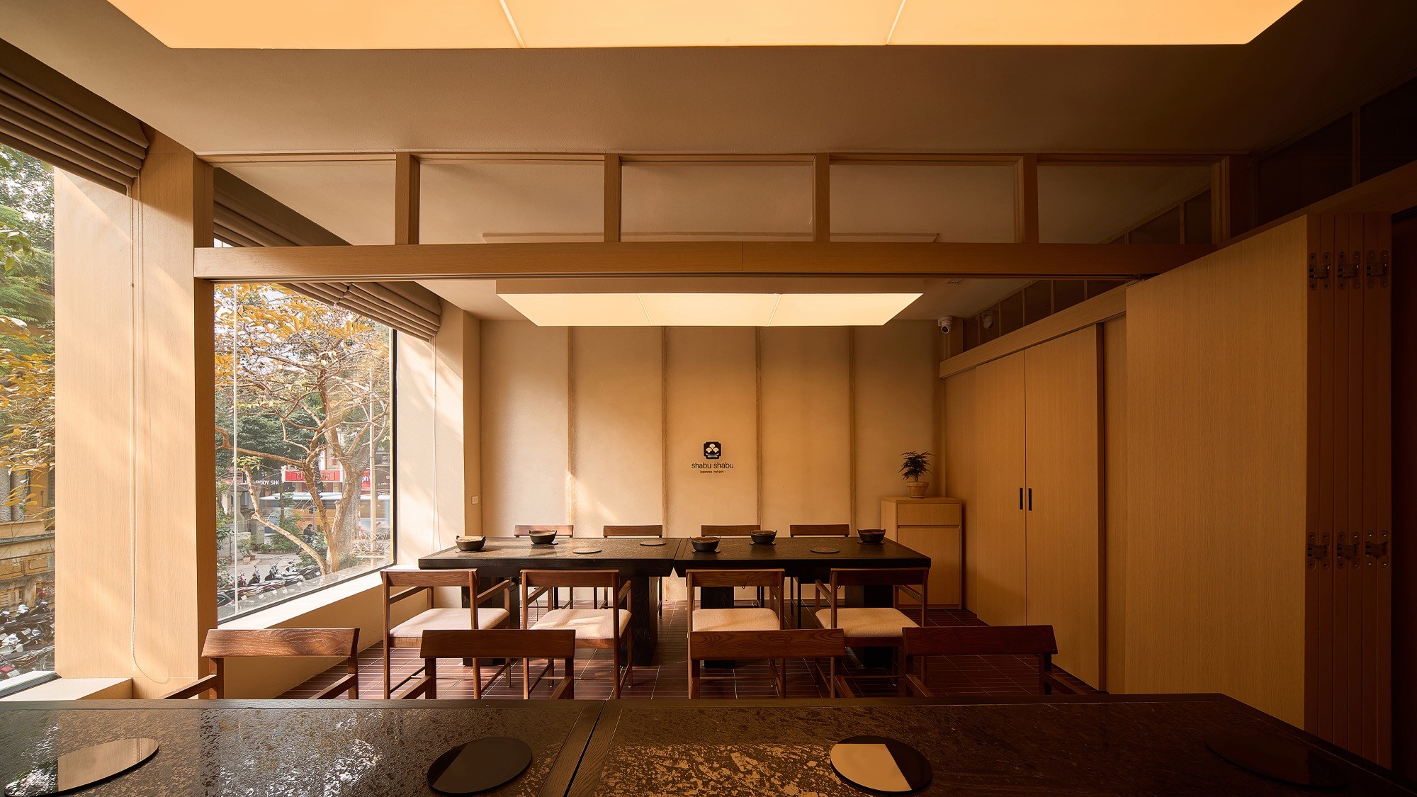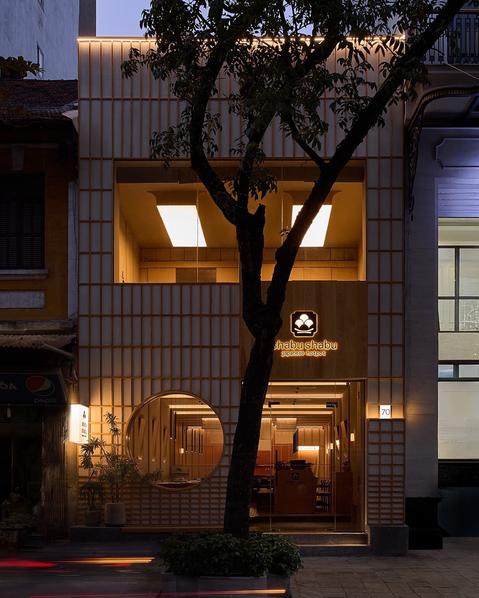 Sự đan xen của lớp nan, ánh sáng và bề mặt khơi gợi hình ảnh chuyển động nhẹ nhàng, lan toả và liên tục của làn hơi bốc lên từ nồi lẩu. Các yếu tố của kiến trúc Nhật truyền thống như nan gỗ và hình tròn được chắt lọc và tái hiện trong một ngôn ngữ đương đại, tạo nên một cấu trúc không gian vừa rõ ràng vừa có độ mềm cần thiết.