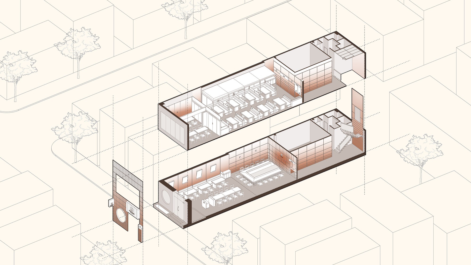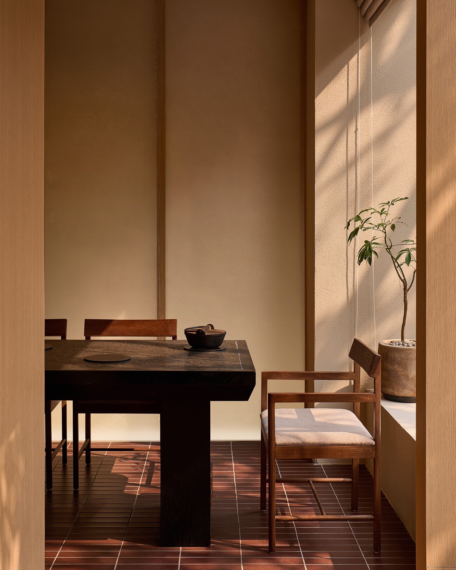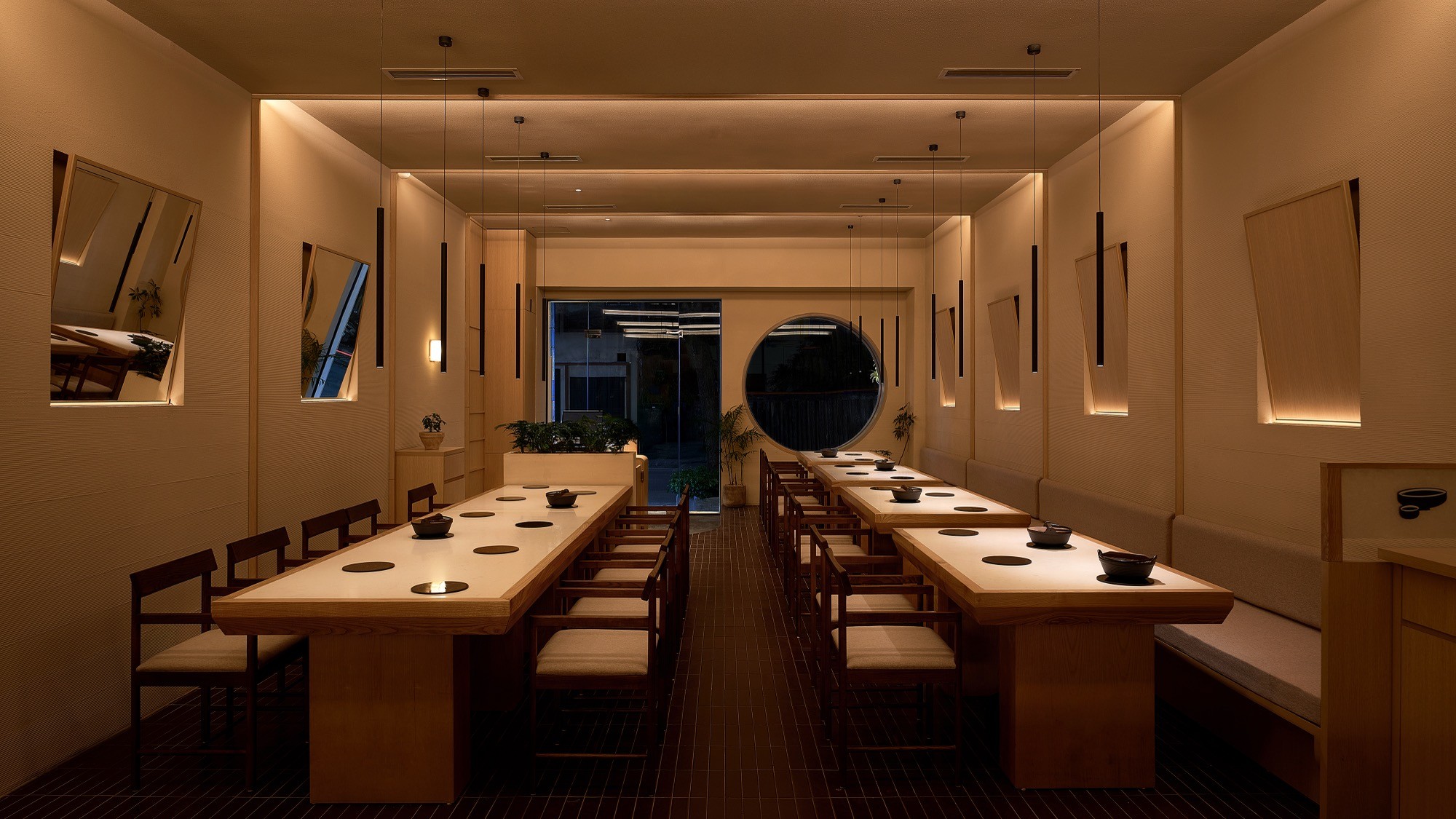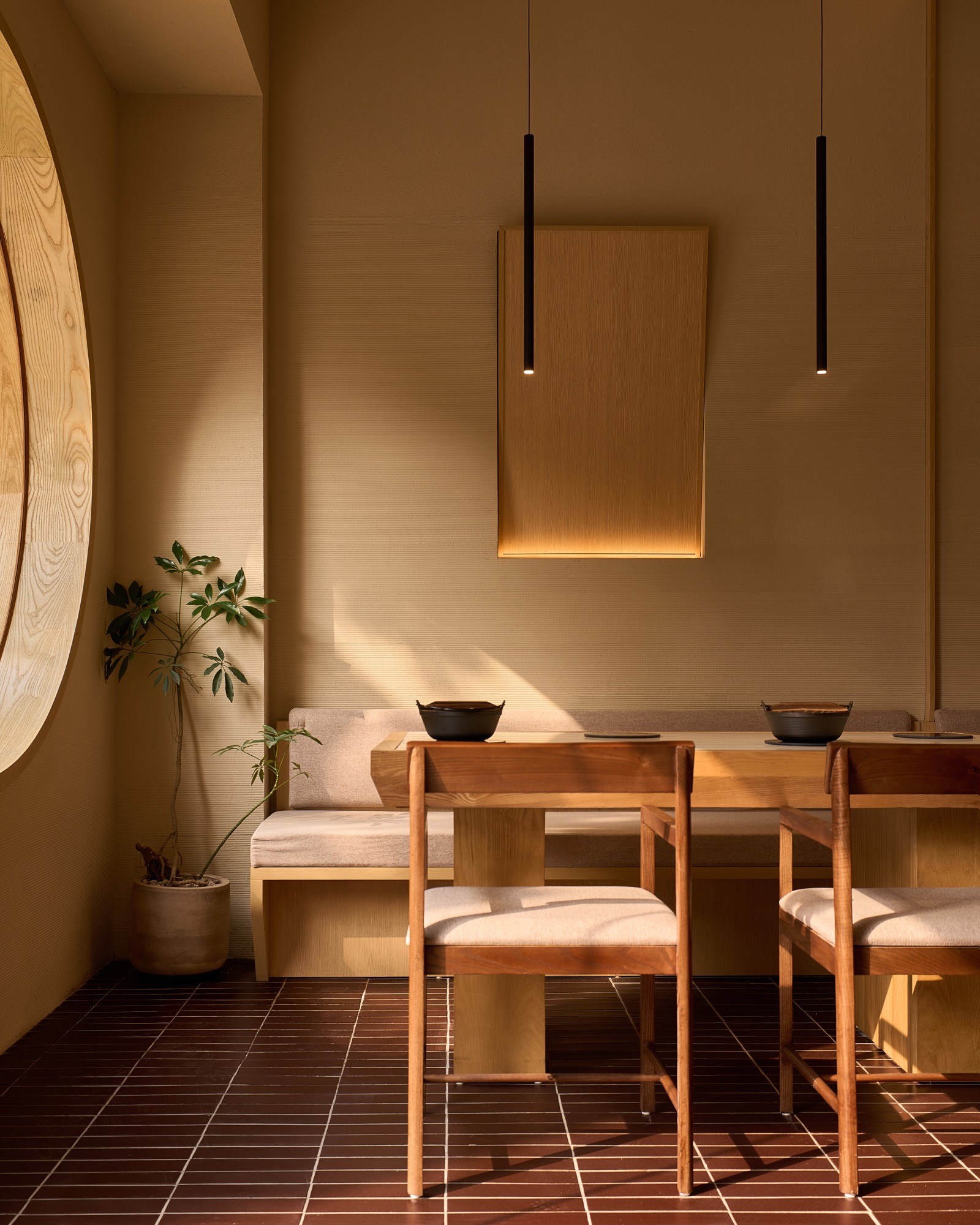 Sự đan xen của lớp nan, ánh sáng và bề mặt khơi gợi hình ảnh chuyển động nhẹ nhàng, lan toả và liên tục của làn hơi bốc lên từ nồi lẩu. Các yếu tố của kiến trúc Nhật truyền thống như nan gỗ và hình tròn được chắt lọc và tái hiện trong một ngôn ngữ đương đại, tạo nên một cấu trúc không gian vừa rõ ràng vừa có độ mềm cần thiết.