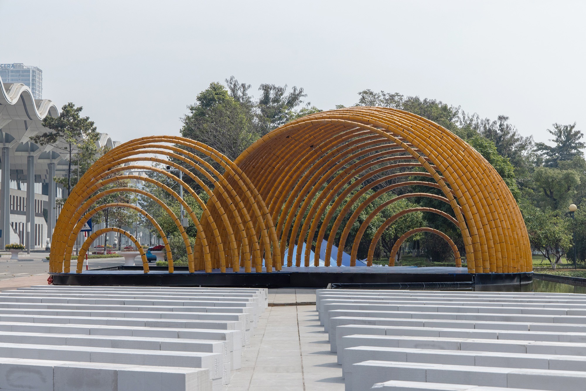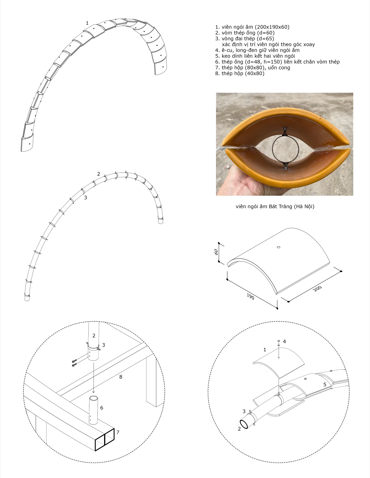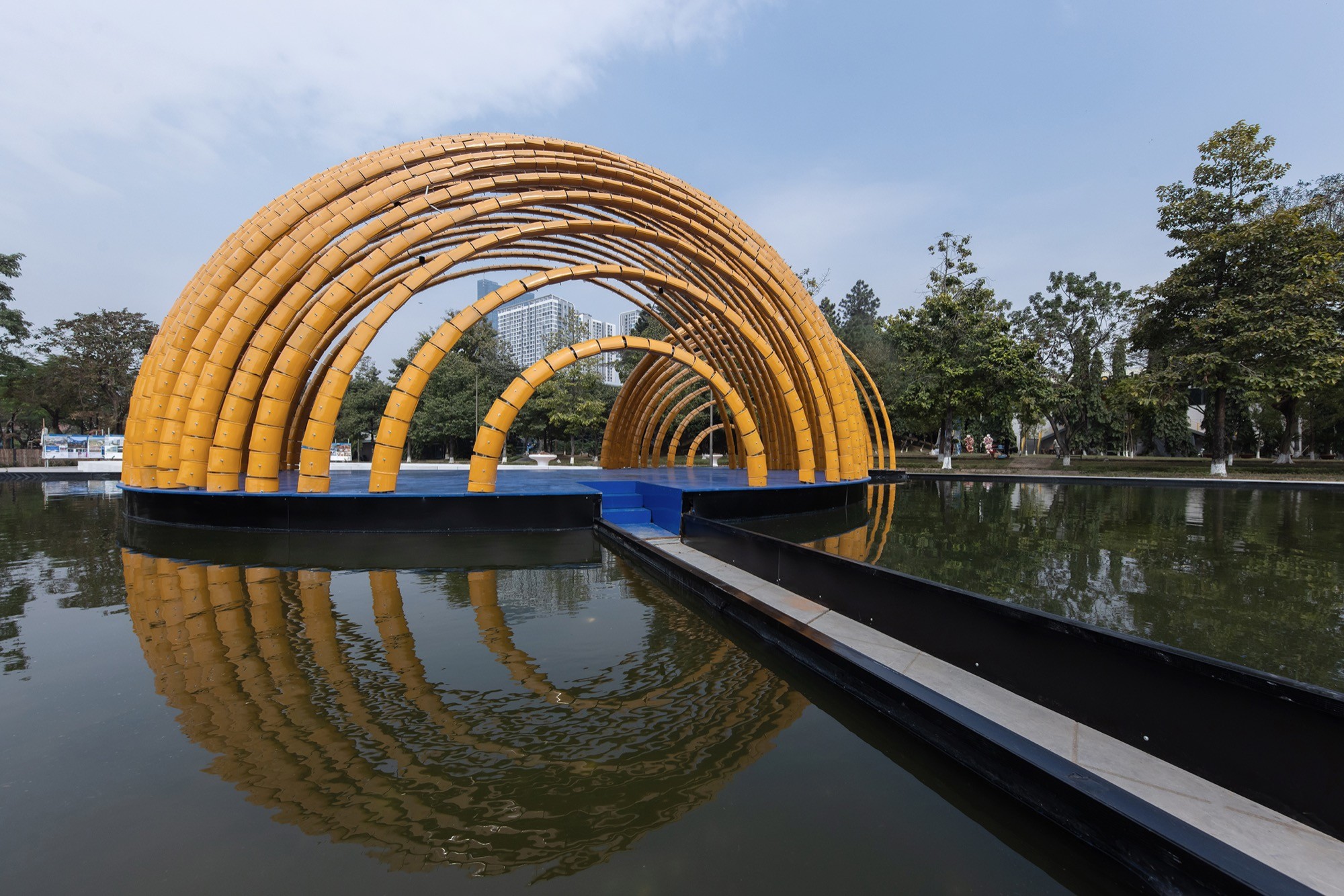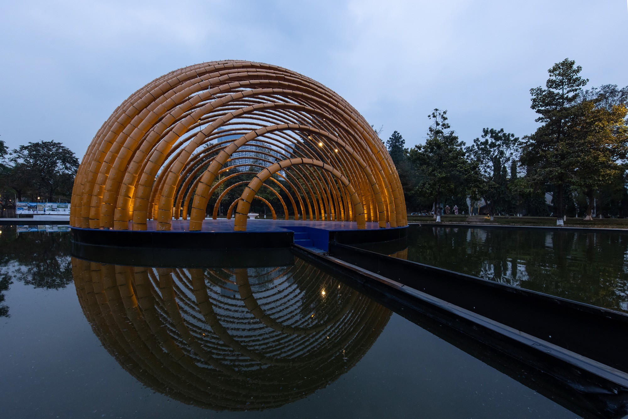 Ngói âm truyền thống tráng men vàng được sử dụng như vật liệu chủ đạo, định hình lớp vỏ với những lớp liên tưởng chồng xếp, từ giọt nước, đốt tre, đến những tia nước vươn lên và vòm trời căng sáng. Ở chiều ngược lại, đó cũng có thể là cơn “mưa vàng” nuôi dưỡng sự sống, một ẩn dụ nhẹ nhàng về chu trình tự nhiên và khả năng tái sinh của đô thị.