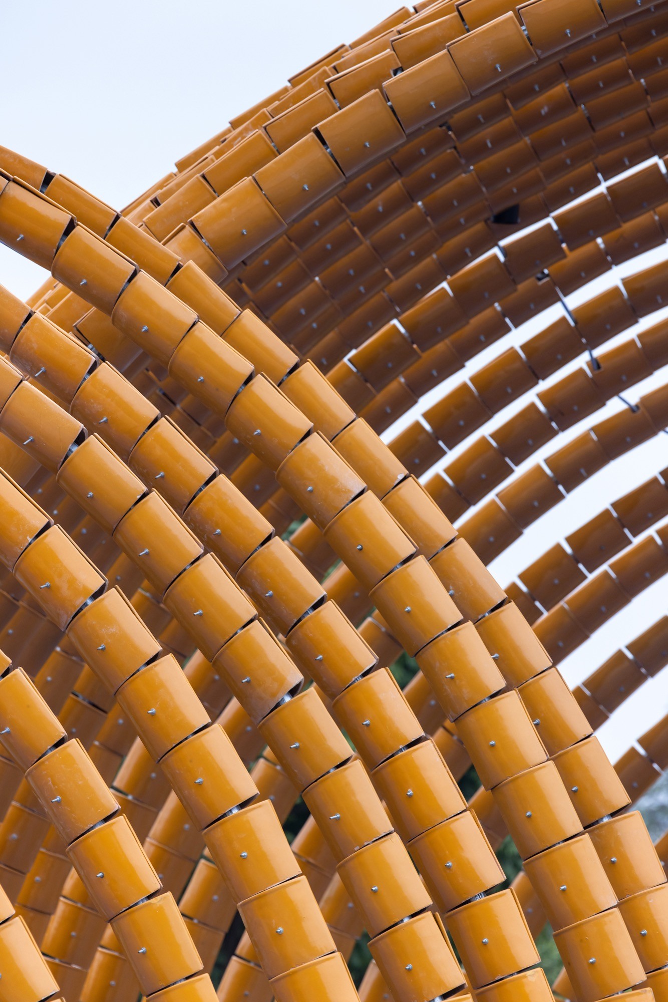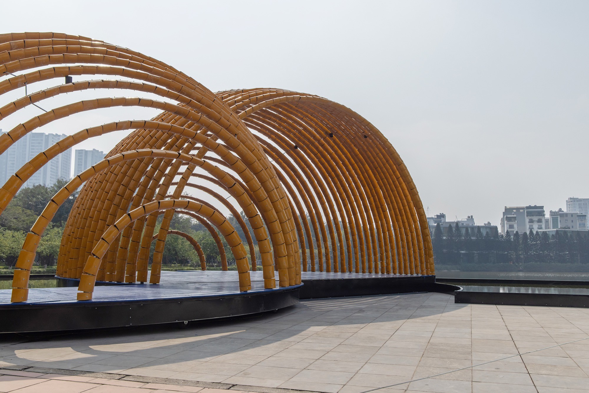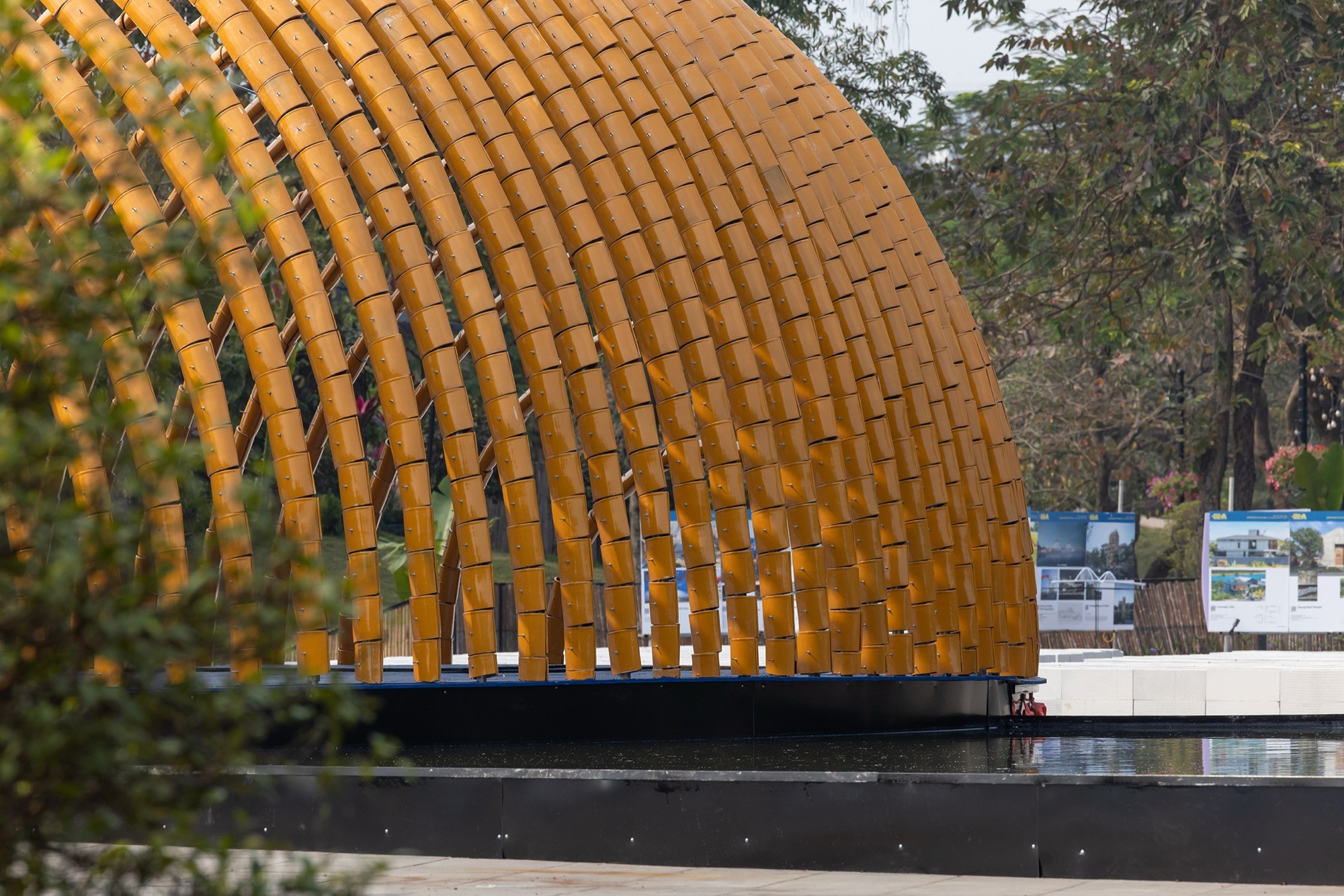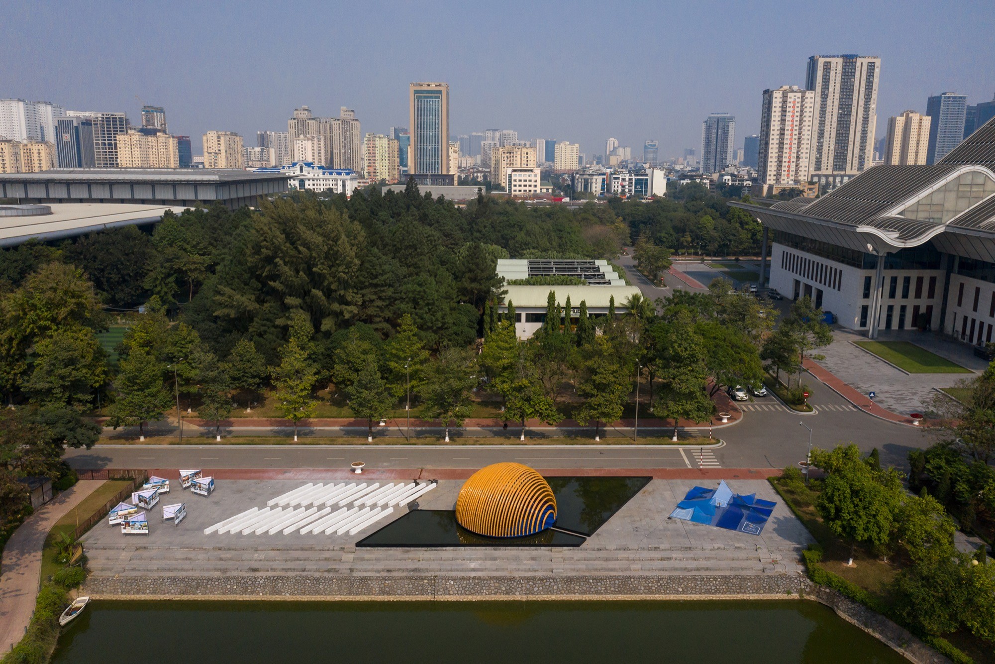 Ngói âm truyền thống tráng men vàng được sử dụng như vật liệu chủ đạo, định hình lớp vỏ với những lớp liên tưởng chồng xếp, từ giọt nước, đốt tre, đến những tia nước vươn lên và vòm trời căng sáng. Ở chiều ngược lại, đó cũng có thể là cơn “mưa vàng” nuôi dưỡng sự sống, một ẩn dụ nhẹ nhàng về chu trình tự nhiên và khả năng tái sinh của đô thị.