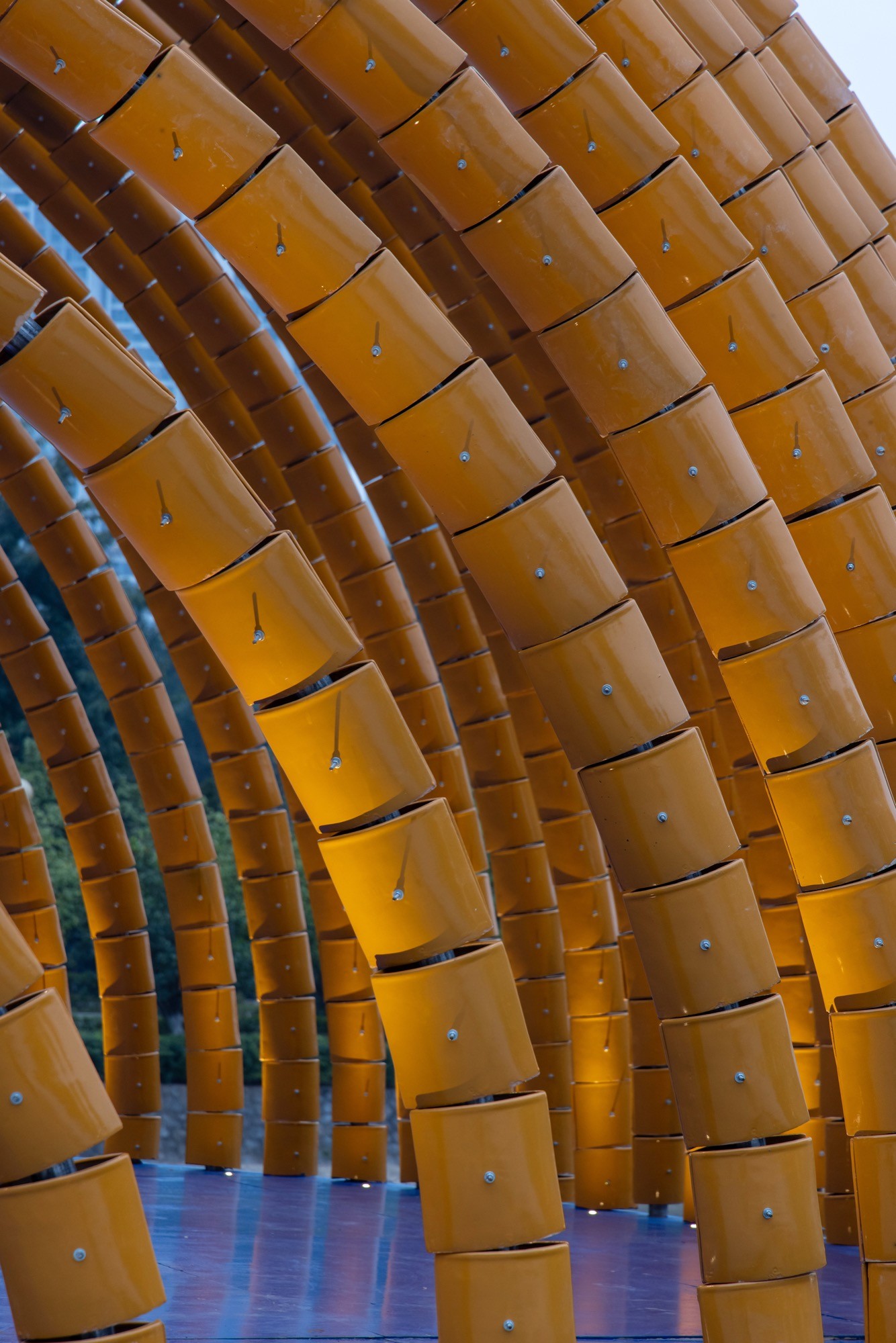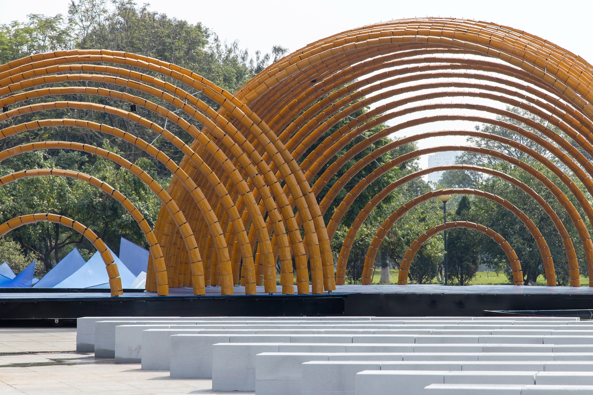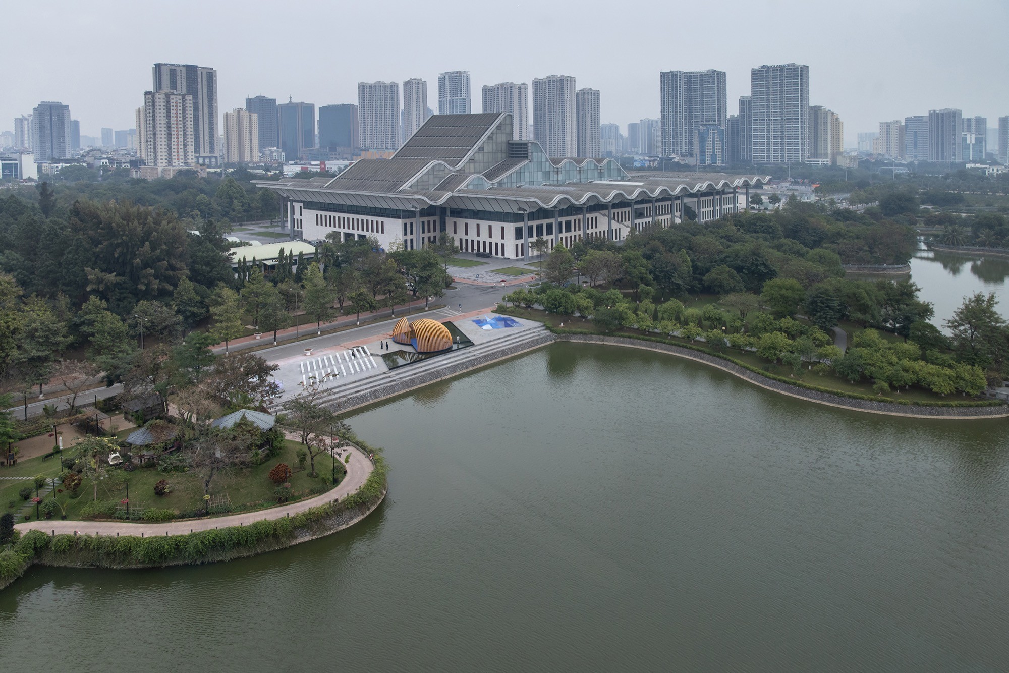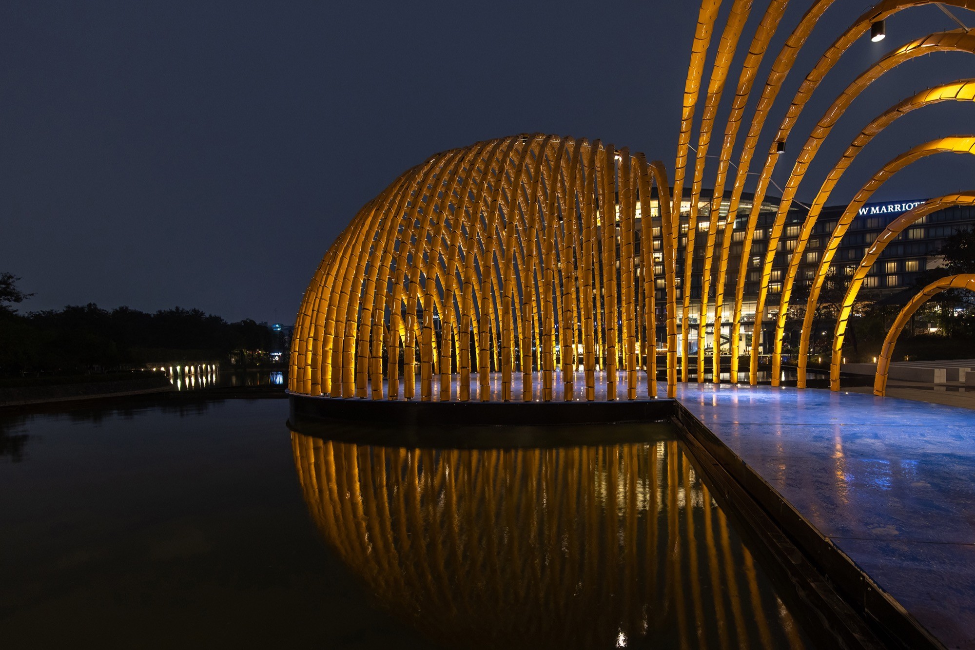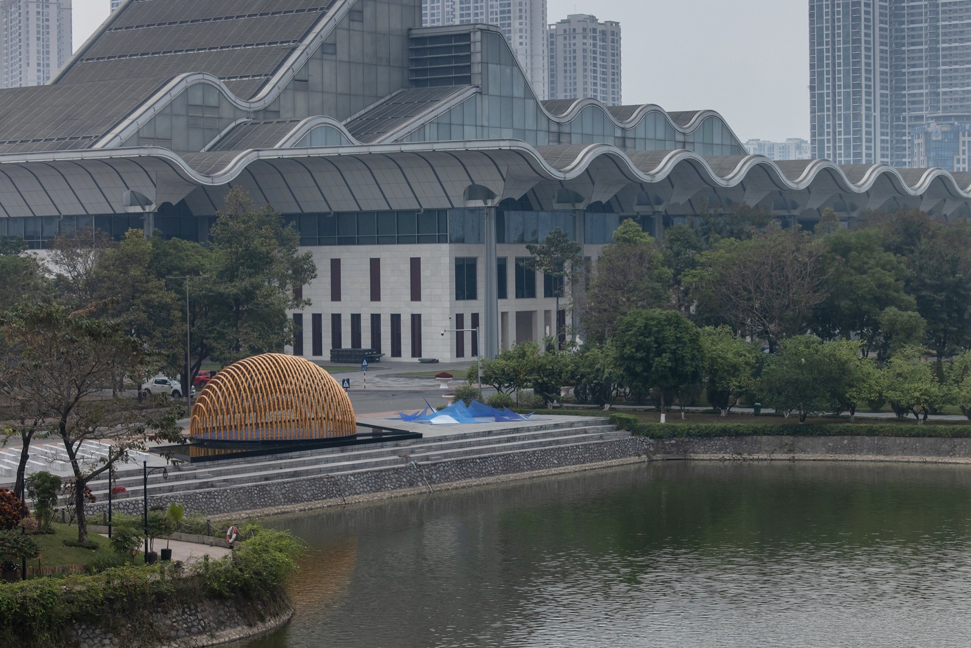 Ngói âm truyền thống tráng men vàng được sử dụng như vật liệu chủ đạo, định hình lớp vỏ với những lớp liên tưởng chồng xếp, từ giọt nước, đốt tre, đến những tia nước vươn lên và vòm trời căng sáng. Ở chiều ngược lại, đó cũng có thể là cơn “mưa vàng” nuôi dưỡng sự sống, một ẩn dụ nhẹ nhàng về chu trình tự nhiên và khả năng tái sinh của đô thị.