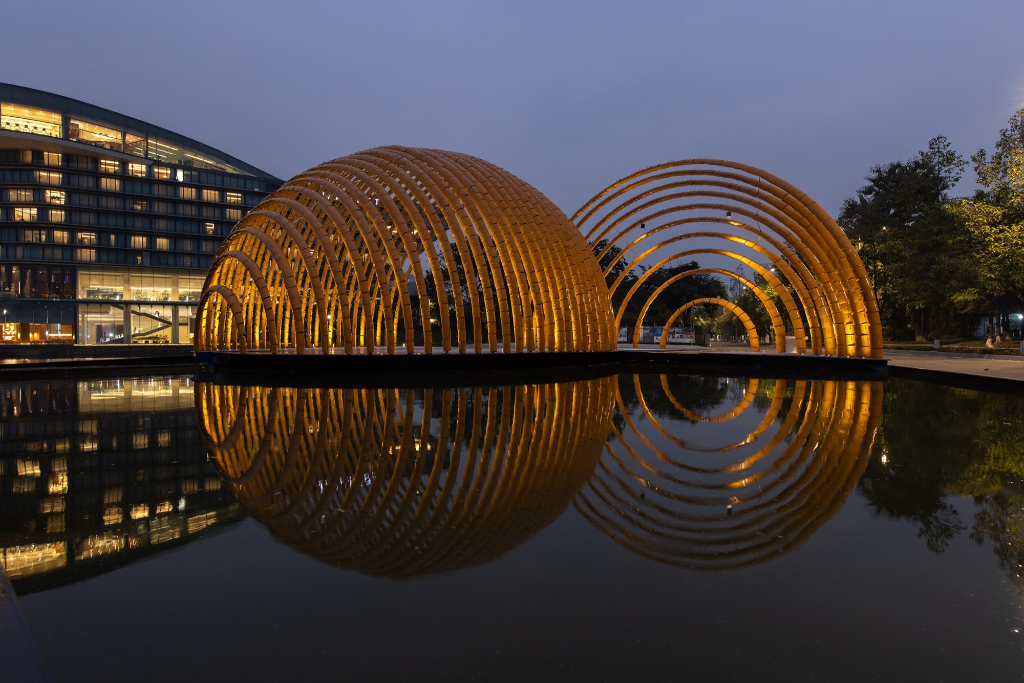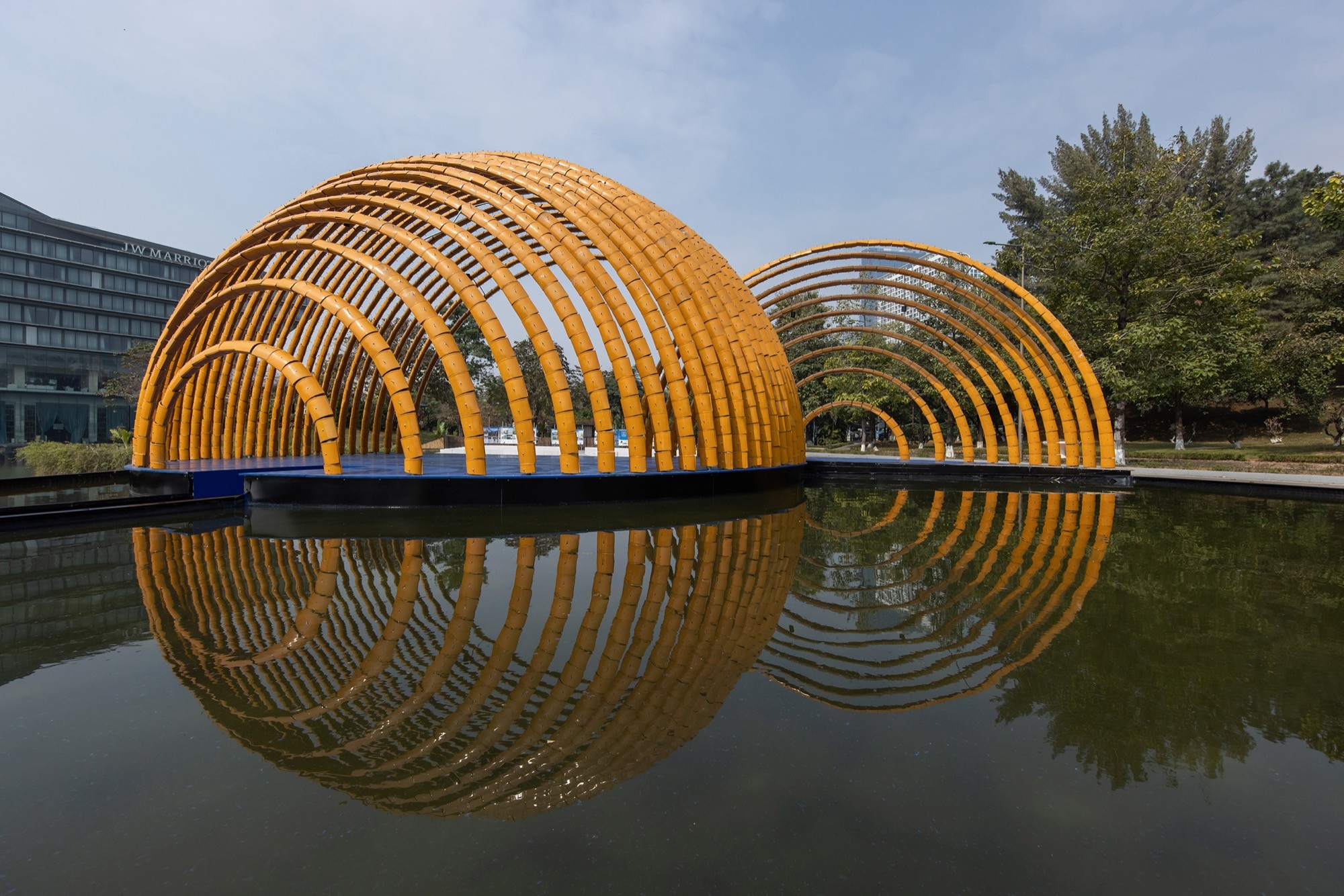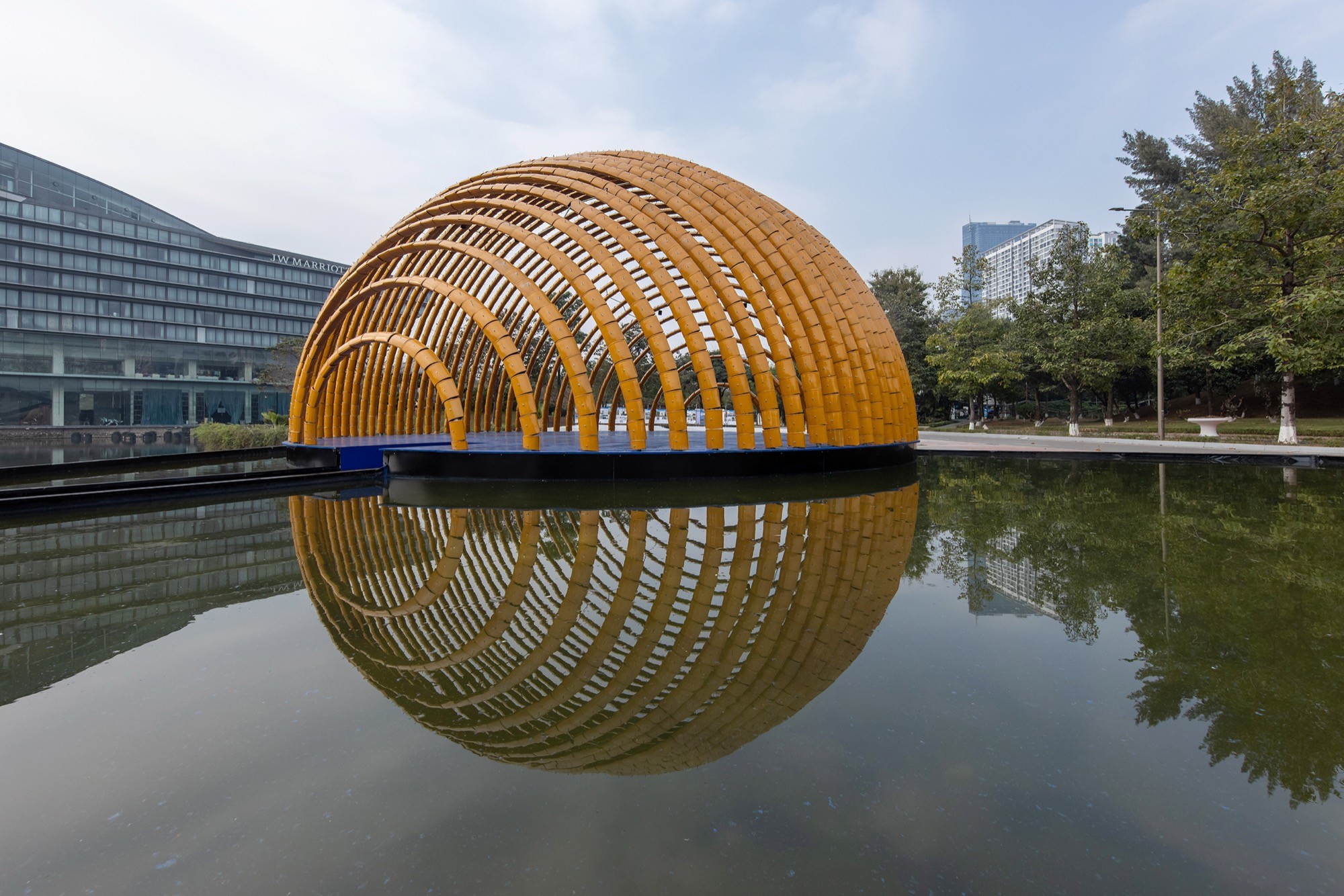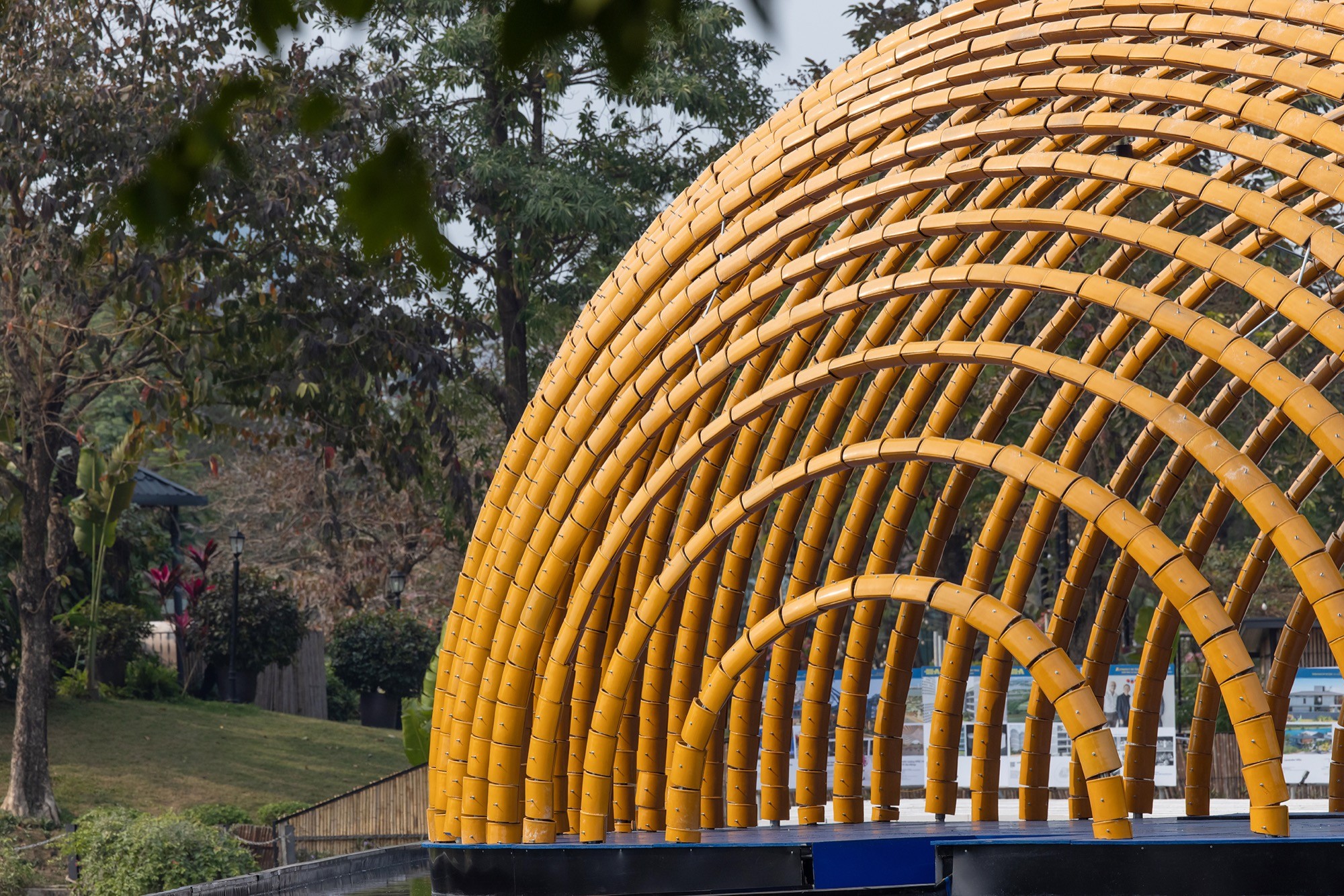 Ngói âm truyền thống tráng men vàng được sử dụng như vật liệu chủ đạo, định hình lớp vỏ với những lớp liên tưởng chồng xếp, từ giọt nước, đốt tre, đến những tia nước vươn lên và vòm trời căng sáng. Ở chiều ngược lại, đó cũng có thể là cơn “mưa vàng” nuôi dưỡng sự sống, một ẩn dụ nhẹ nhàng về chu trình tự nhiên và khả năng tái sinh của đô thị.