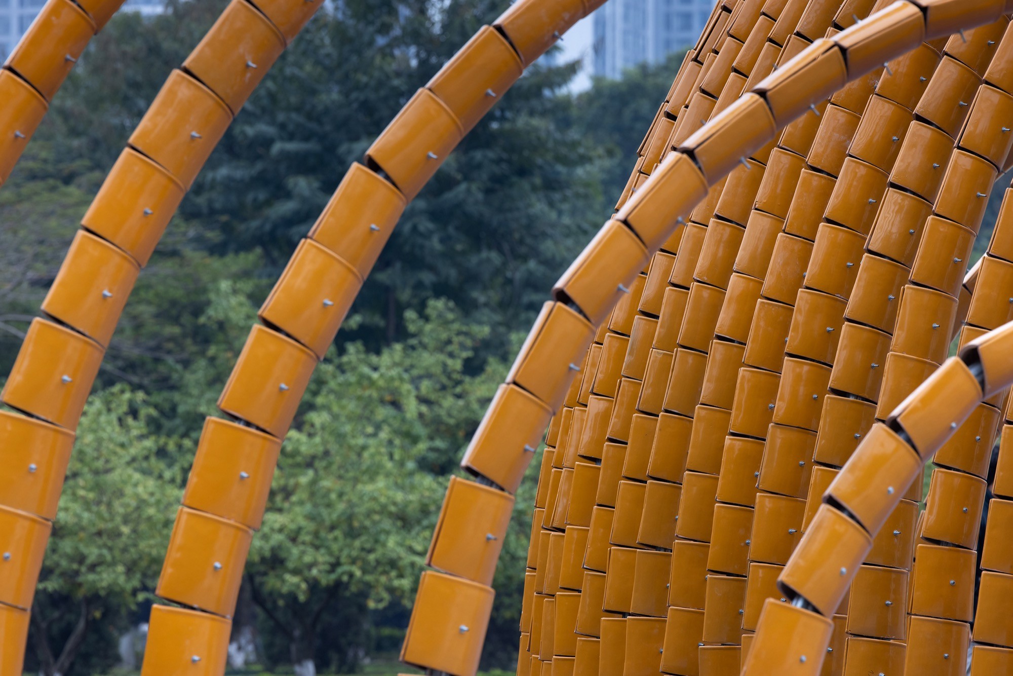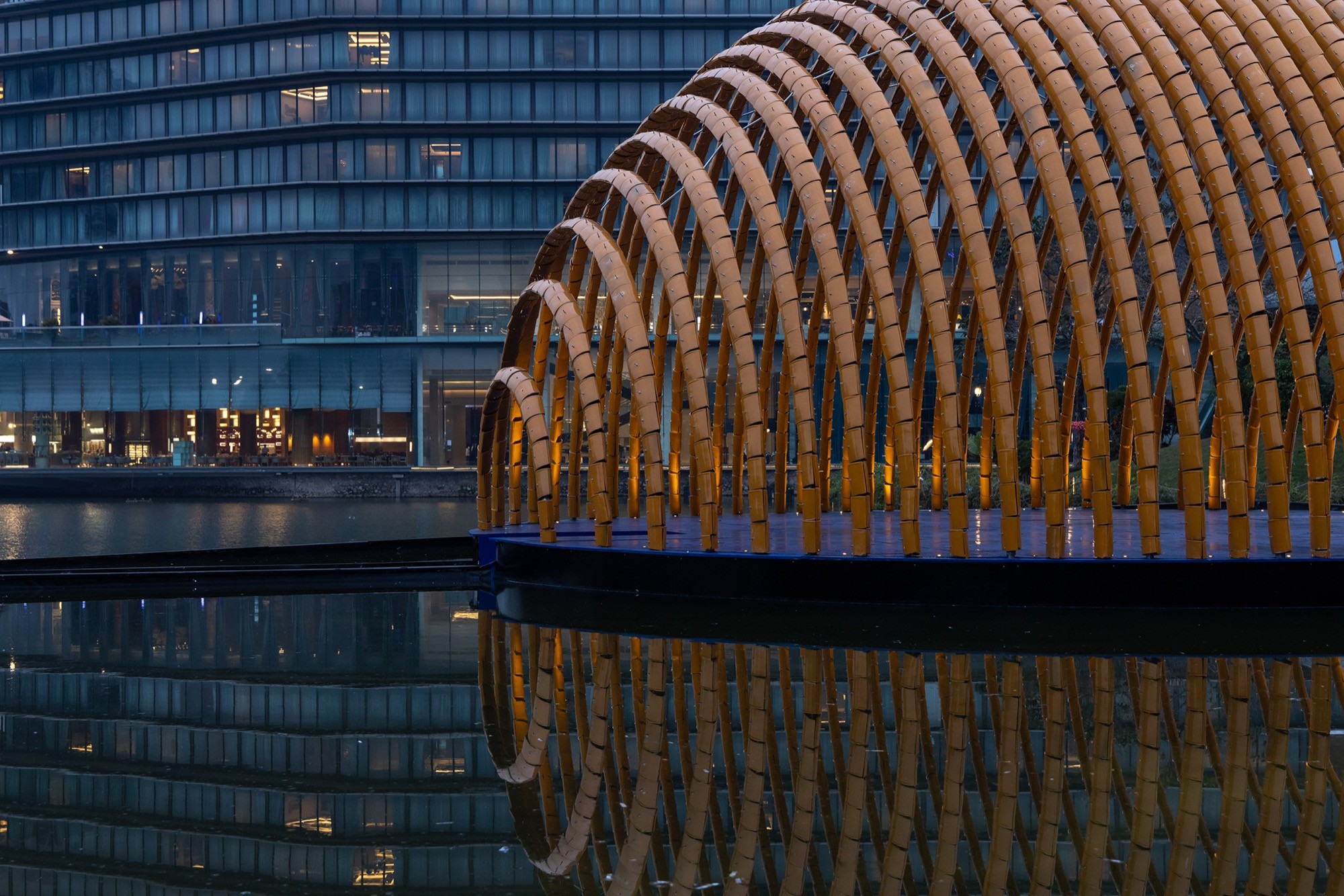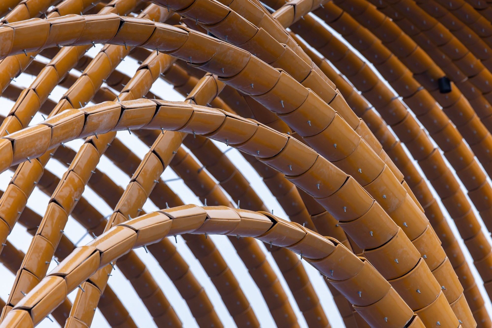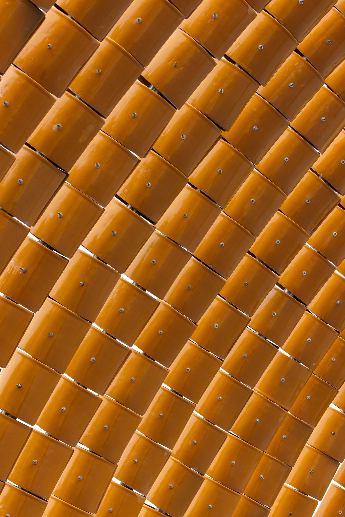 Ngói âm truyền thống tráng men vàng được sử dụng như vật liệu chủ đạo, định hình lớp vỏ với những lớp liên tưởng chồng xếp, từ giọt nước, đốt tre, đến những tia nước vươn lên và vòm trời căng sáng. Ở chiều ngược lại, đó cũng có thể là cơn “mưa vàng” nuôi dưỡng sự sống, một ẩn dụ nhẹ nhàng về chu trình tự nhiên và khả năng tái sinh của đô thị.