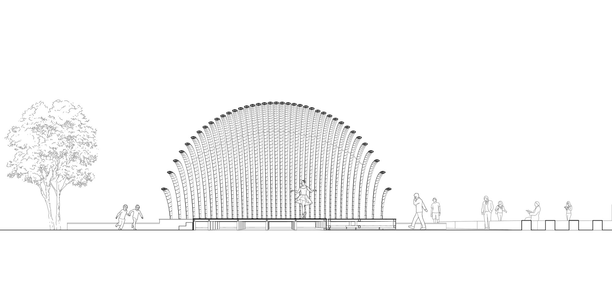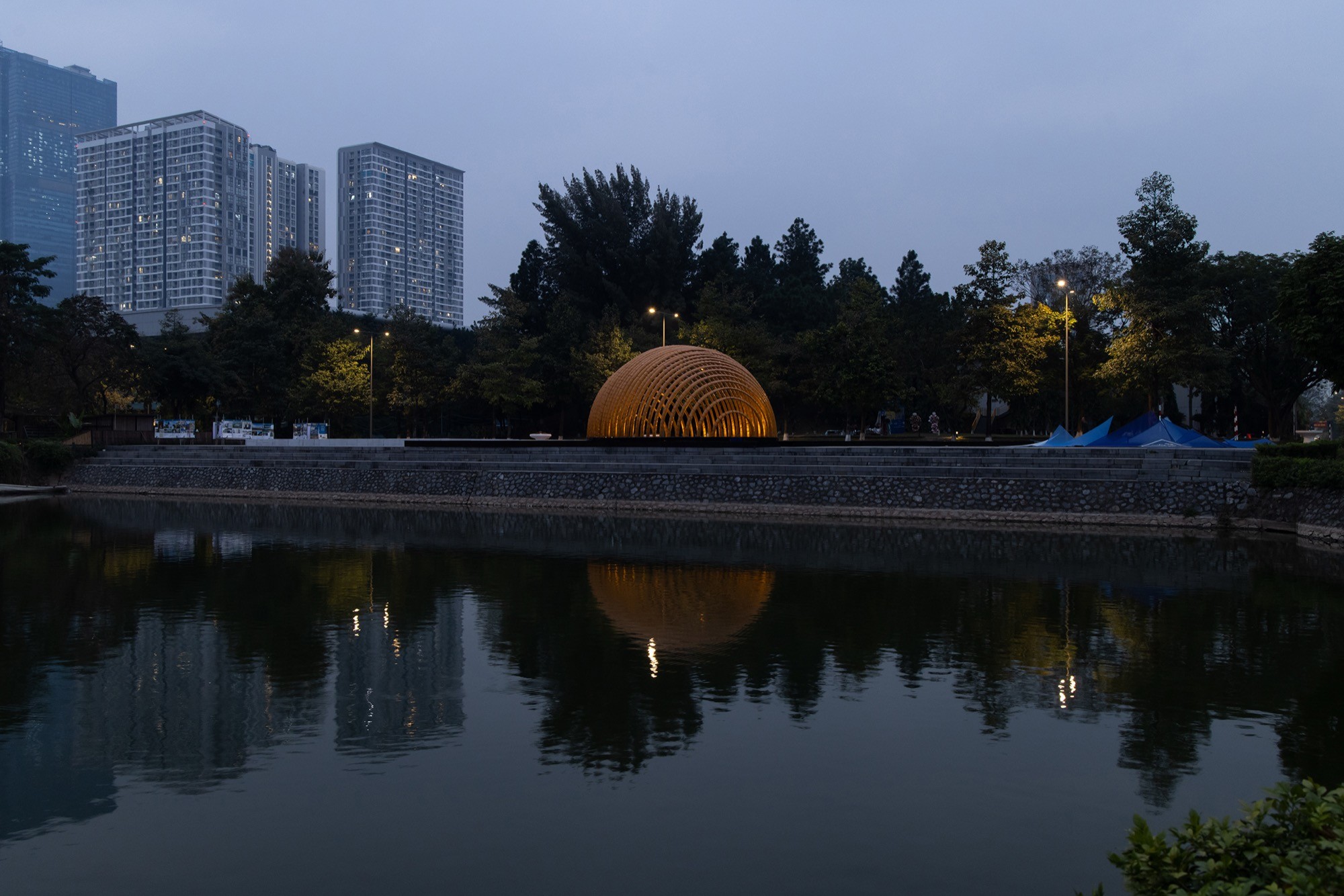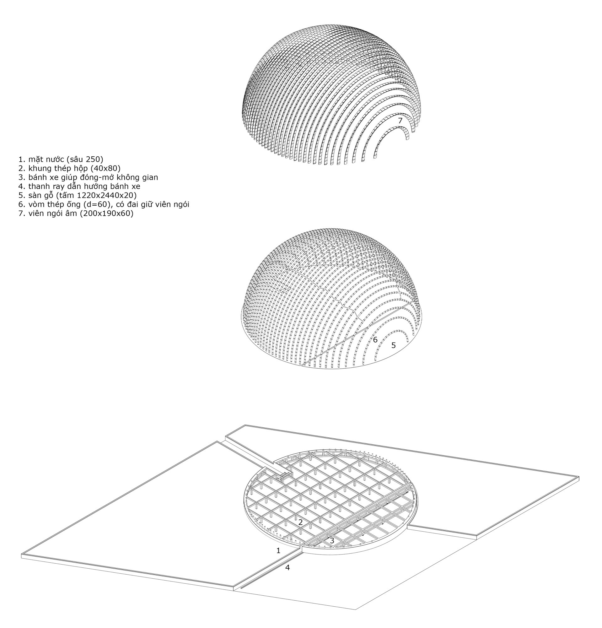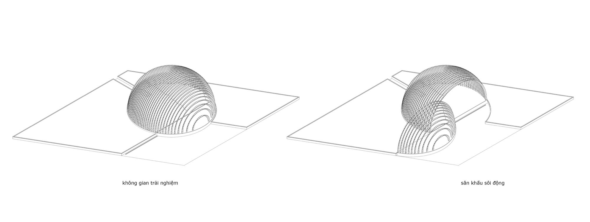Công trình được tổ chức như một cấu trúc bán cầu đường kính 10 mét, tập hợp từ các đường cong liên tiếp, không gian bên trong có khả năng biến đổi linh hoạt: khi mở ra như một sân khấu cộng đồng, khi khép lại thành một trải nghiệm tĩnh, tập trung vào cảm nhận không gian và ánh sáng.