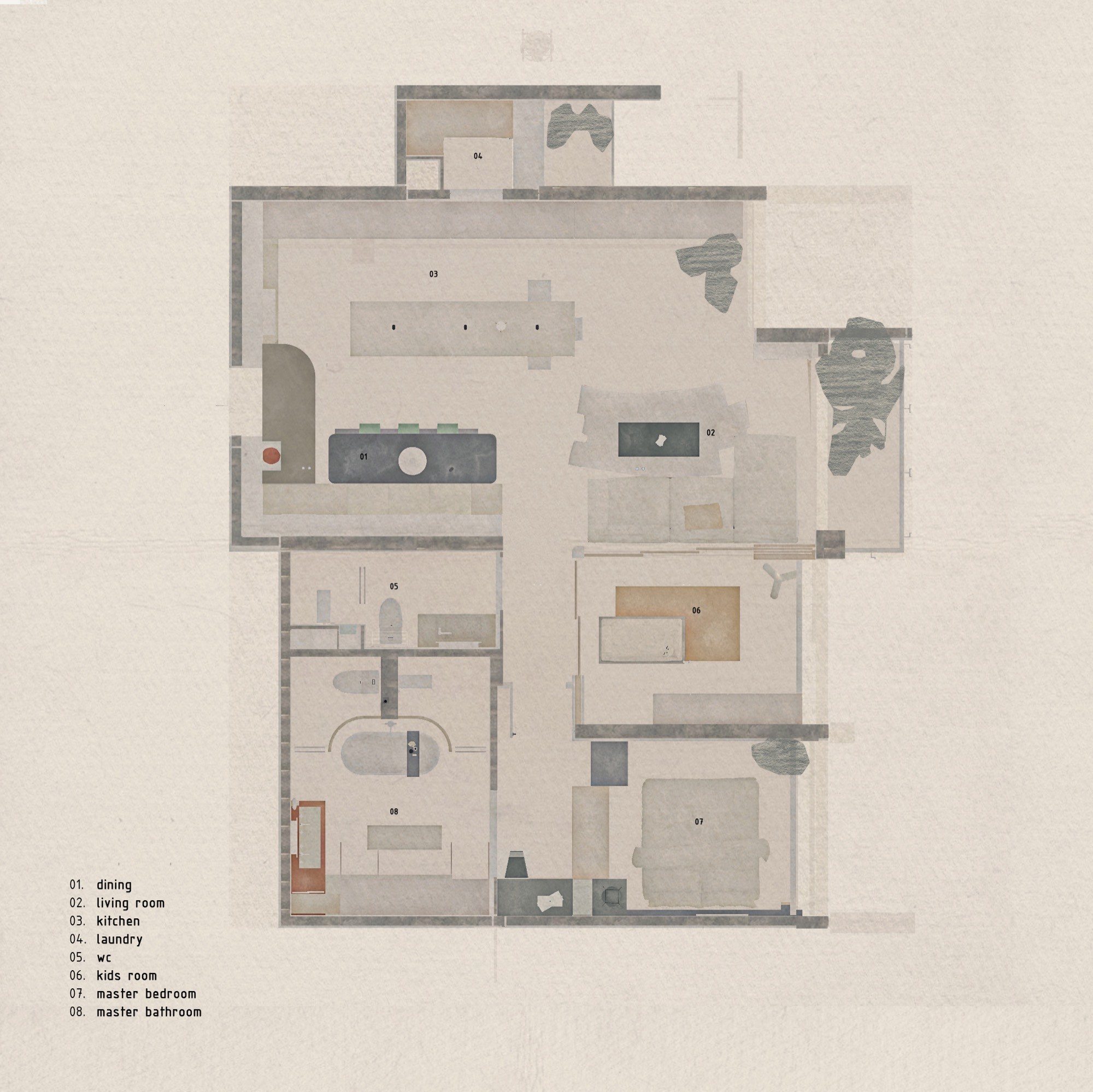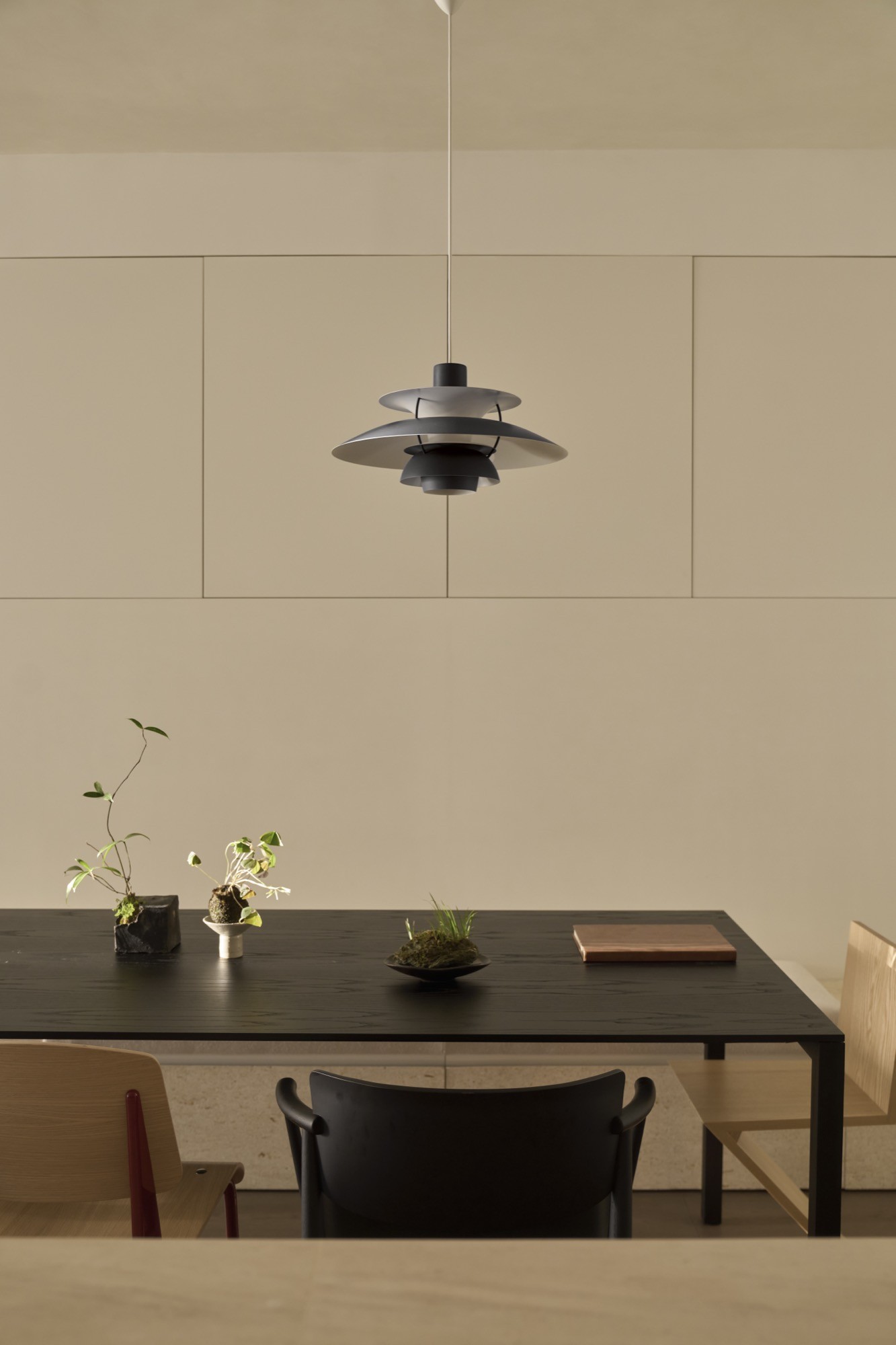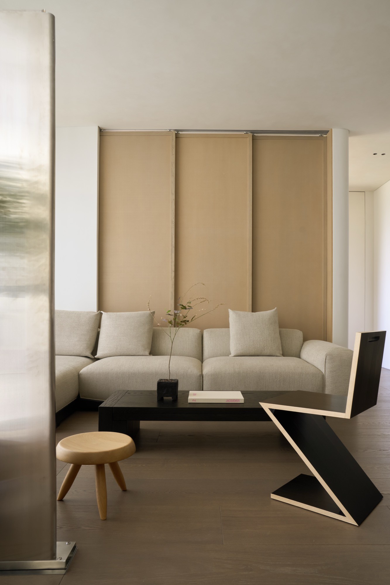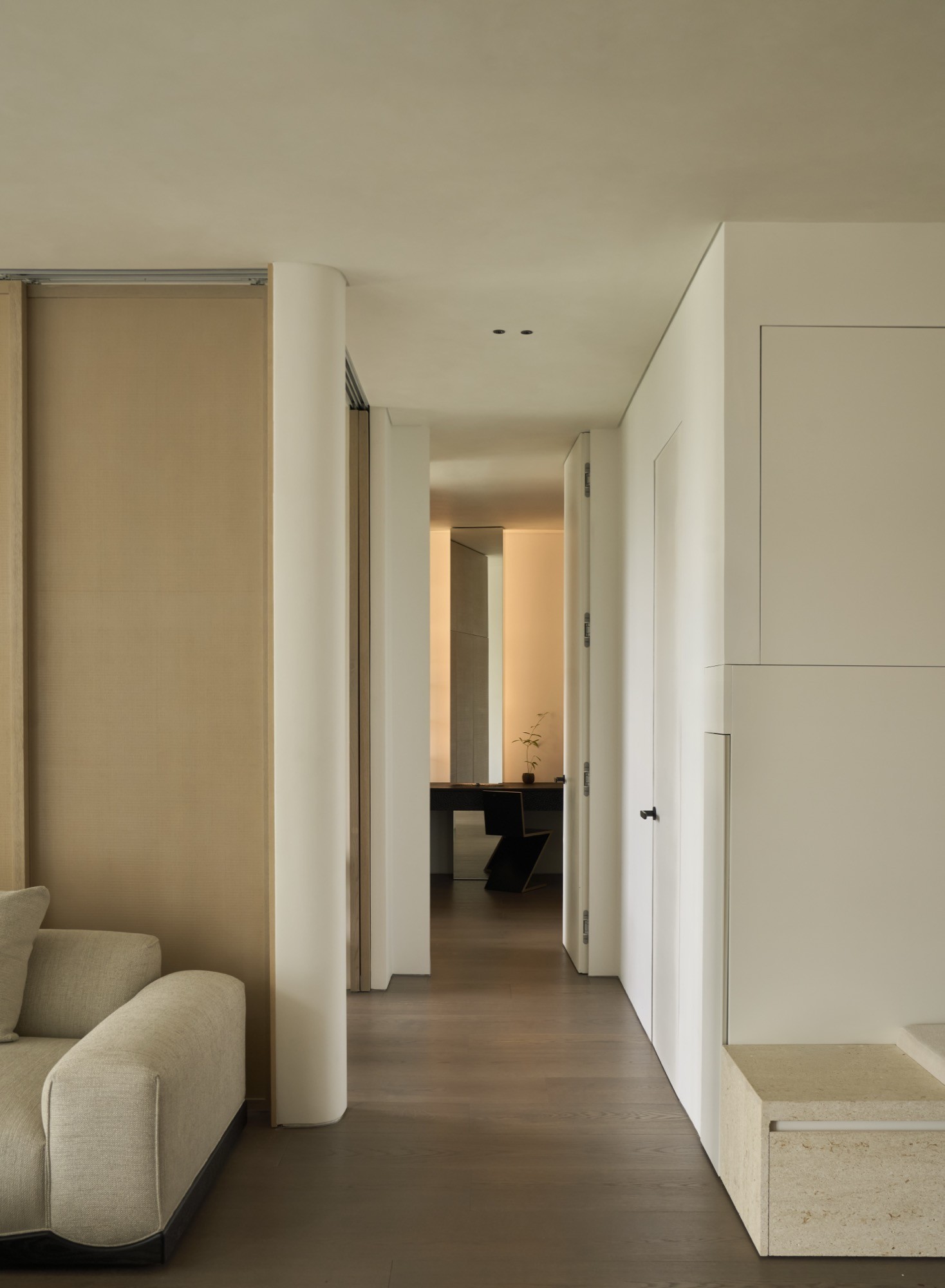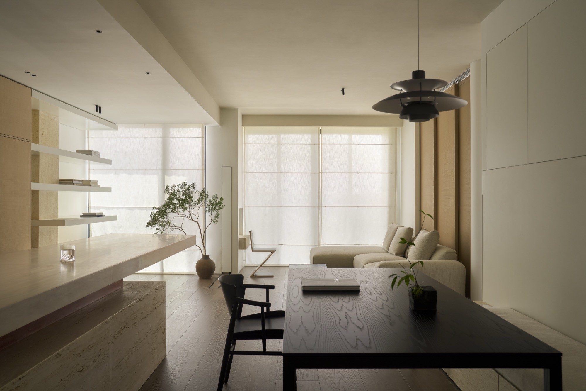 Ngôn ngữ kiến trúc được tiết chế với bảng màu trung tính và vật liệu tự nhiên. Ánh sáng kết hợp với lớp rèm mỏng, góp phần hoàn thiện một không gian sống tối giản, cân bằng và bền bỉ theo thời gian.