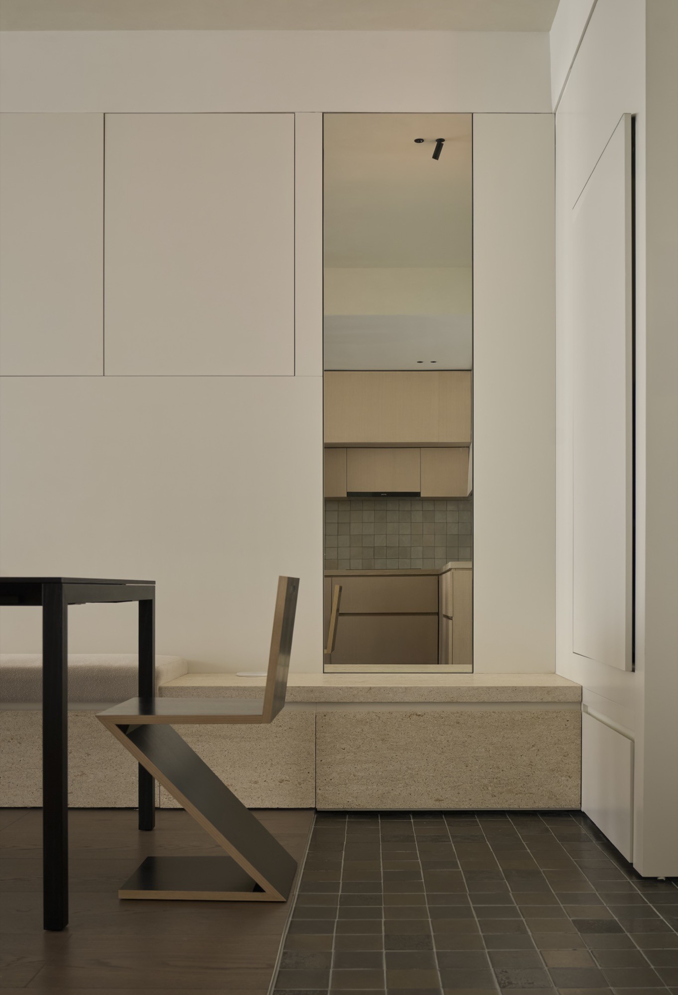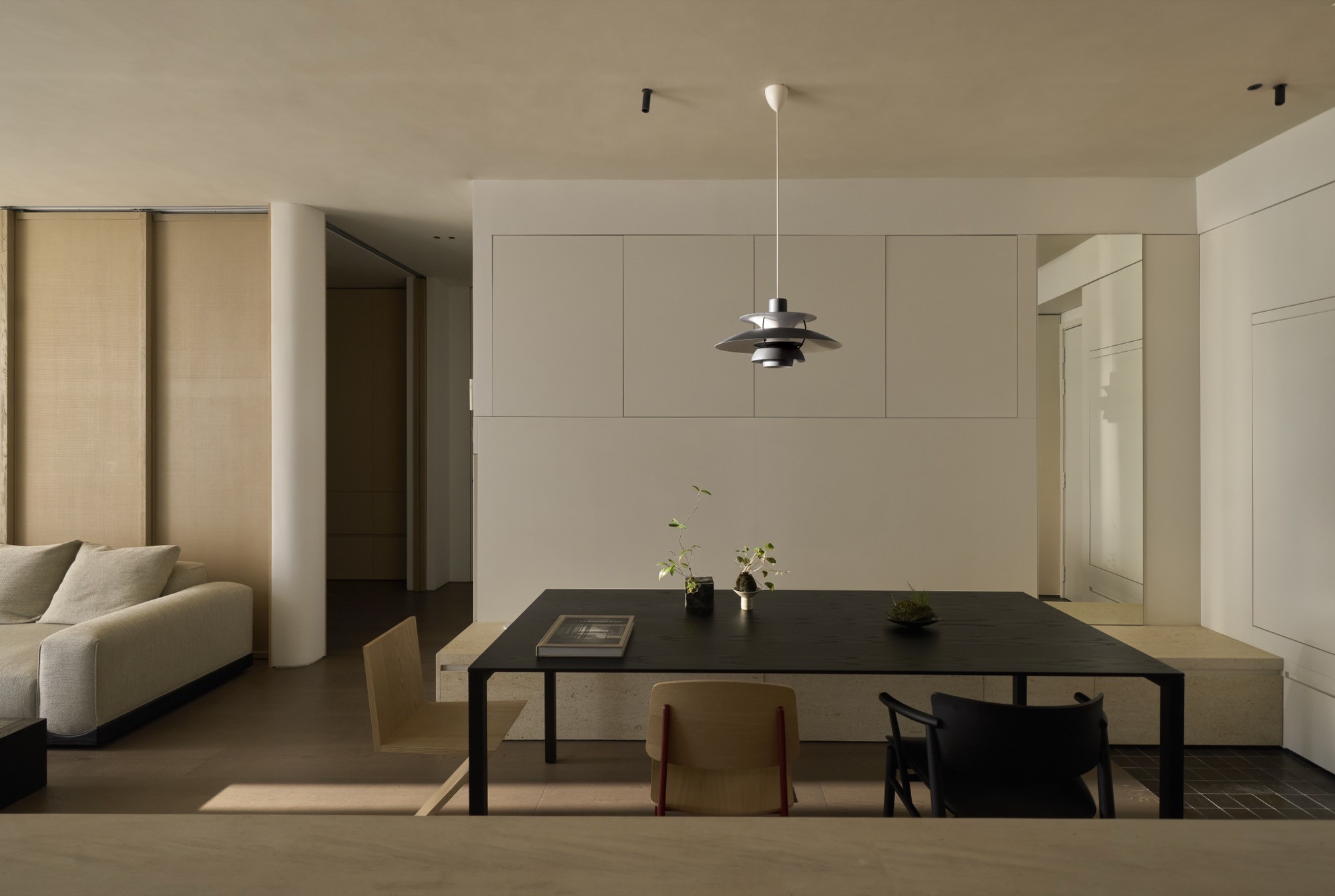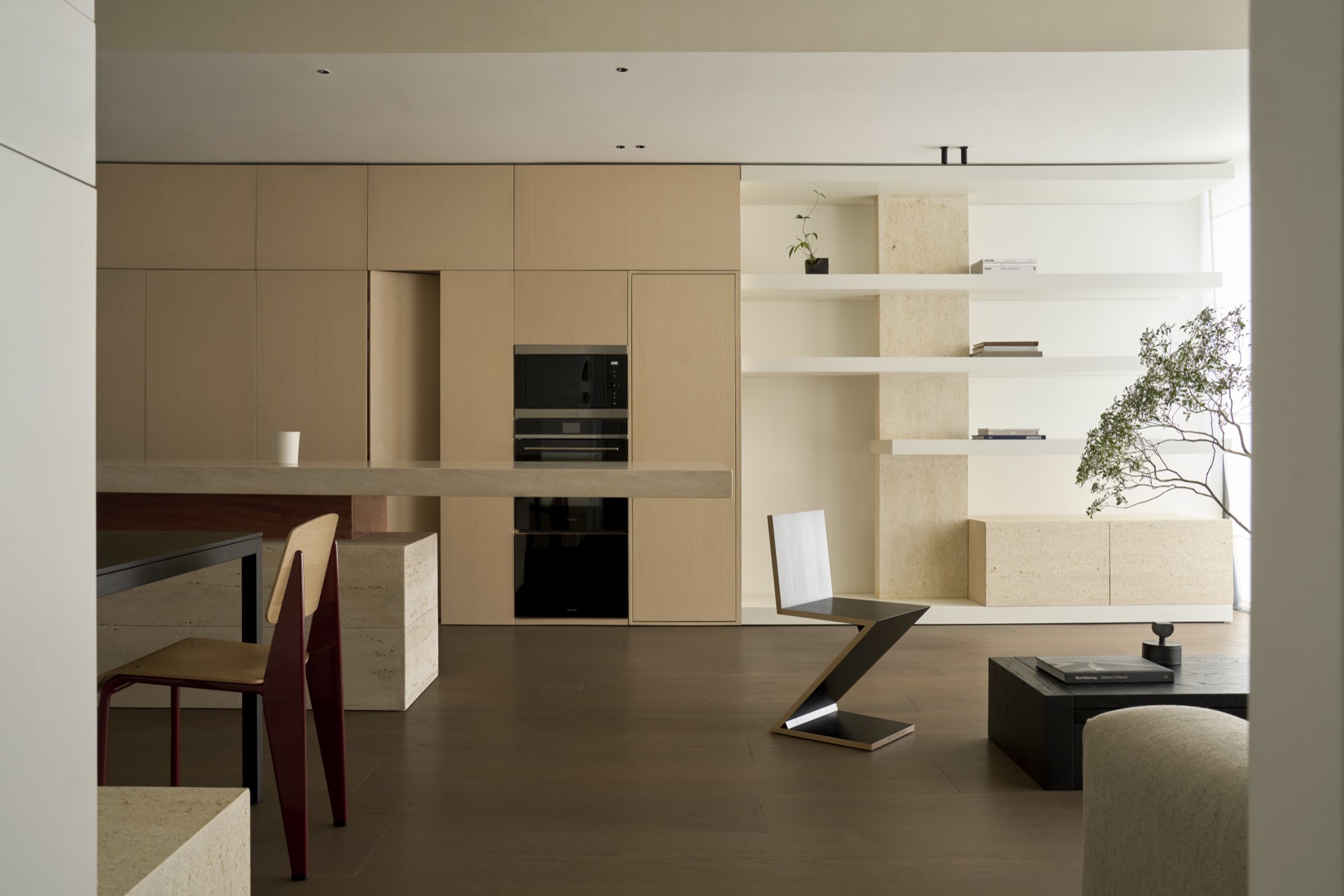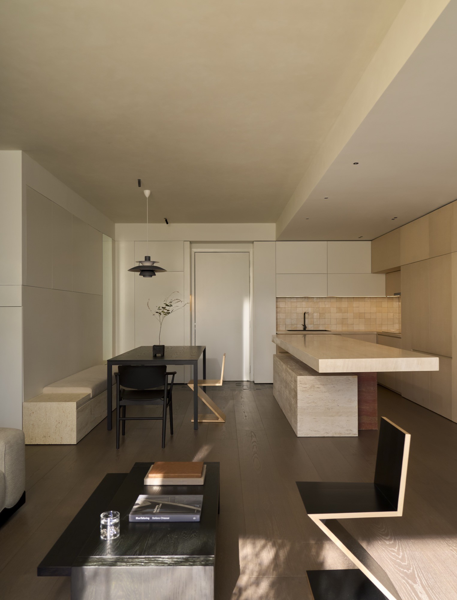 Tổ chức không gian được dẫn dắt bởi hai trục nhìn chính, kéo dài từ lối vào ra ban công và từ bếp vào khu nghỉ ngơi, qua đó làm rõ chiều sâu và tính liên tục của căn hộ. Trên nền đó, đảo bếp dạng treo đóng vai trò như một yếu tố trung tâm, vừa định hình công năng vừa kết nối các hoạt động thường nhật. Các giải pháp như giấu thiết bị, tích hợp lưu trữ hay sử dụng gương được triển khai có kiểm soát, nhằm giữ lại sự thông thoáng và liền mạch thị giác.