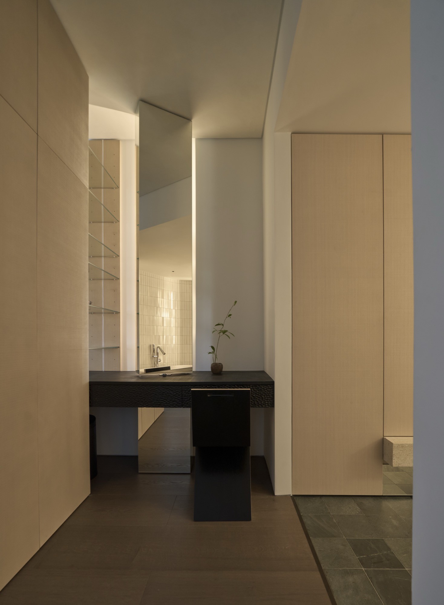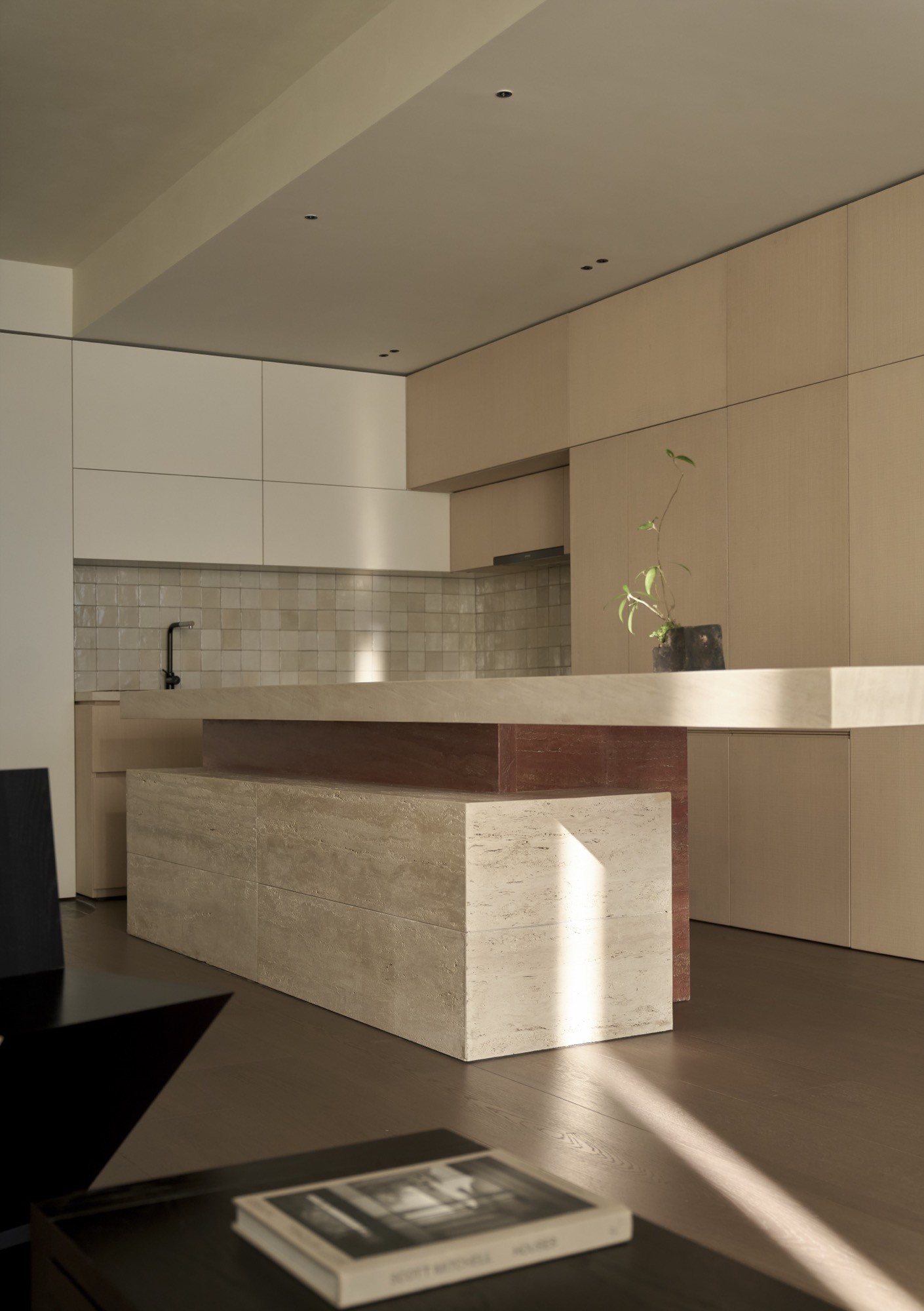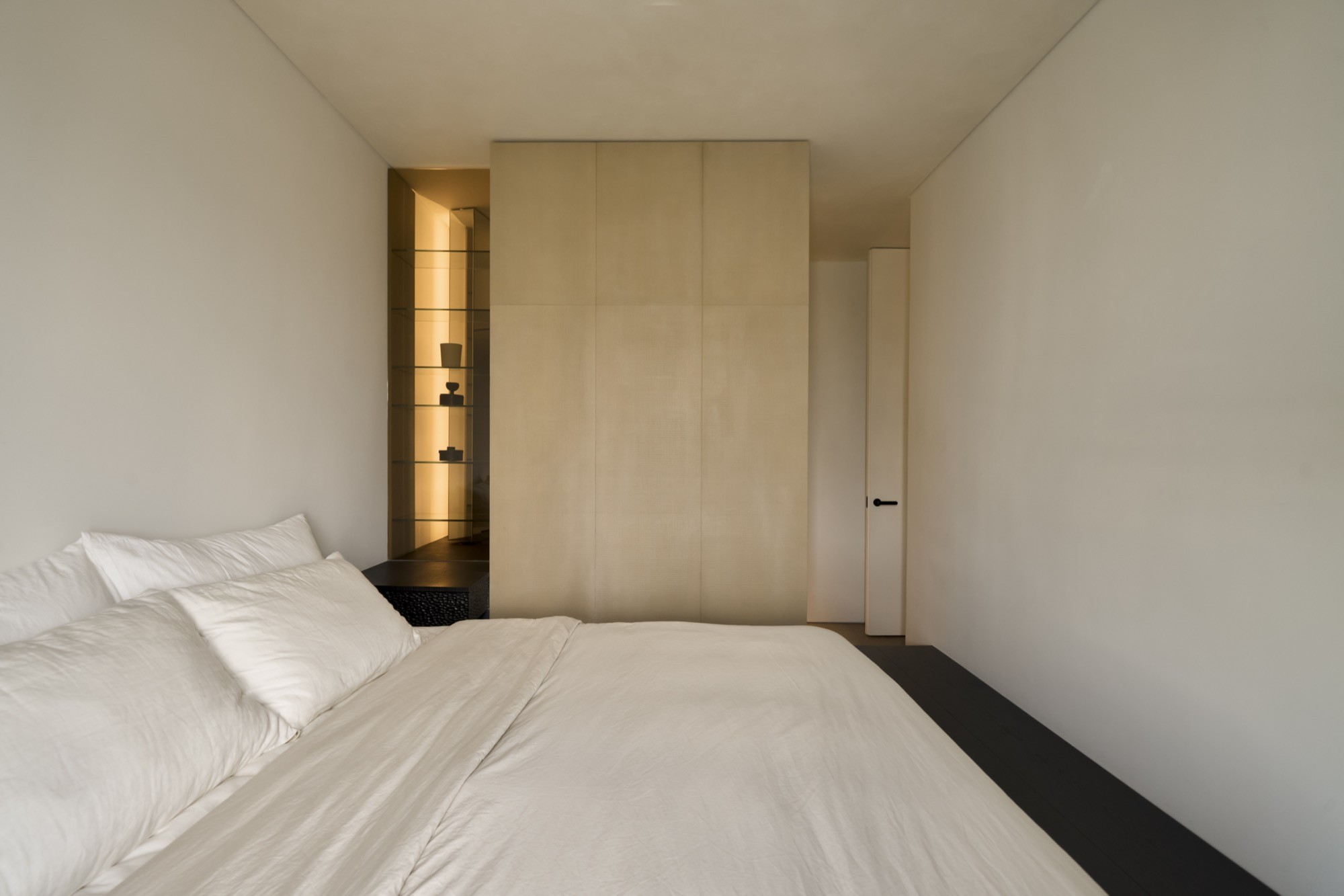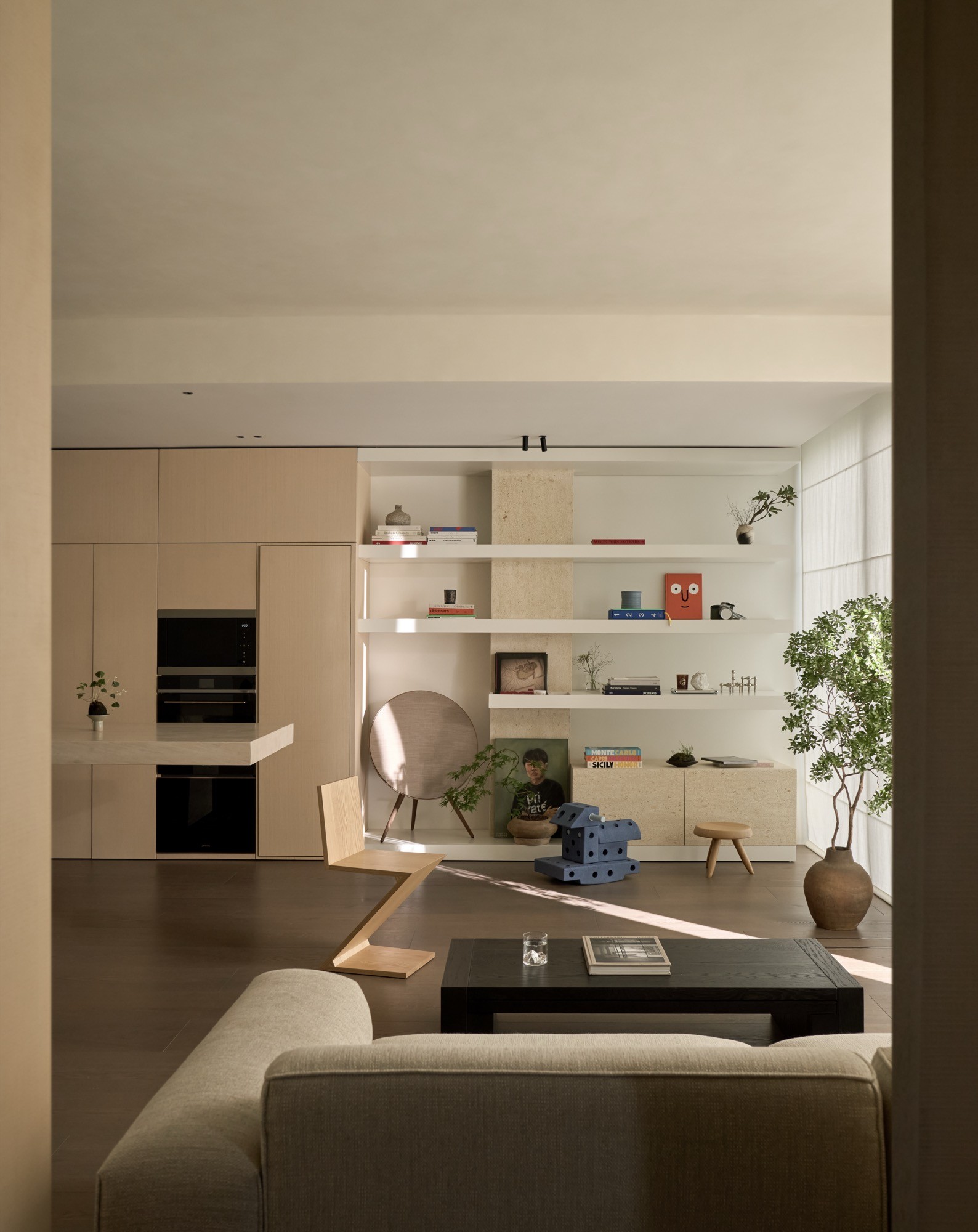 Tổ chức không gian được dẫn dắt bởi hai trục nhìn chính, kéo dài từ lối vào ra ban công và từ bếp vào khu nghỉ ngơi, qua đó làm rõ chiều sâu và tính liên tục của căn hộ. Trên nền đó, đảo bếp dạng treo đóng vai trò như một yếu tố trung tâm, vừa định hình công năng vừa kết nối các hoạt động thường nhật. Các giải pháp như giấu thiết bị, tích hợp lưu trữ hay sử dụng gương được triển khai có kiểm soát, nhằm giữ lại sự thông thoáng và liền mạch thị giác.