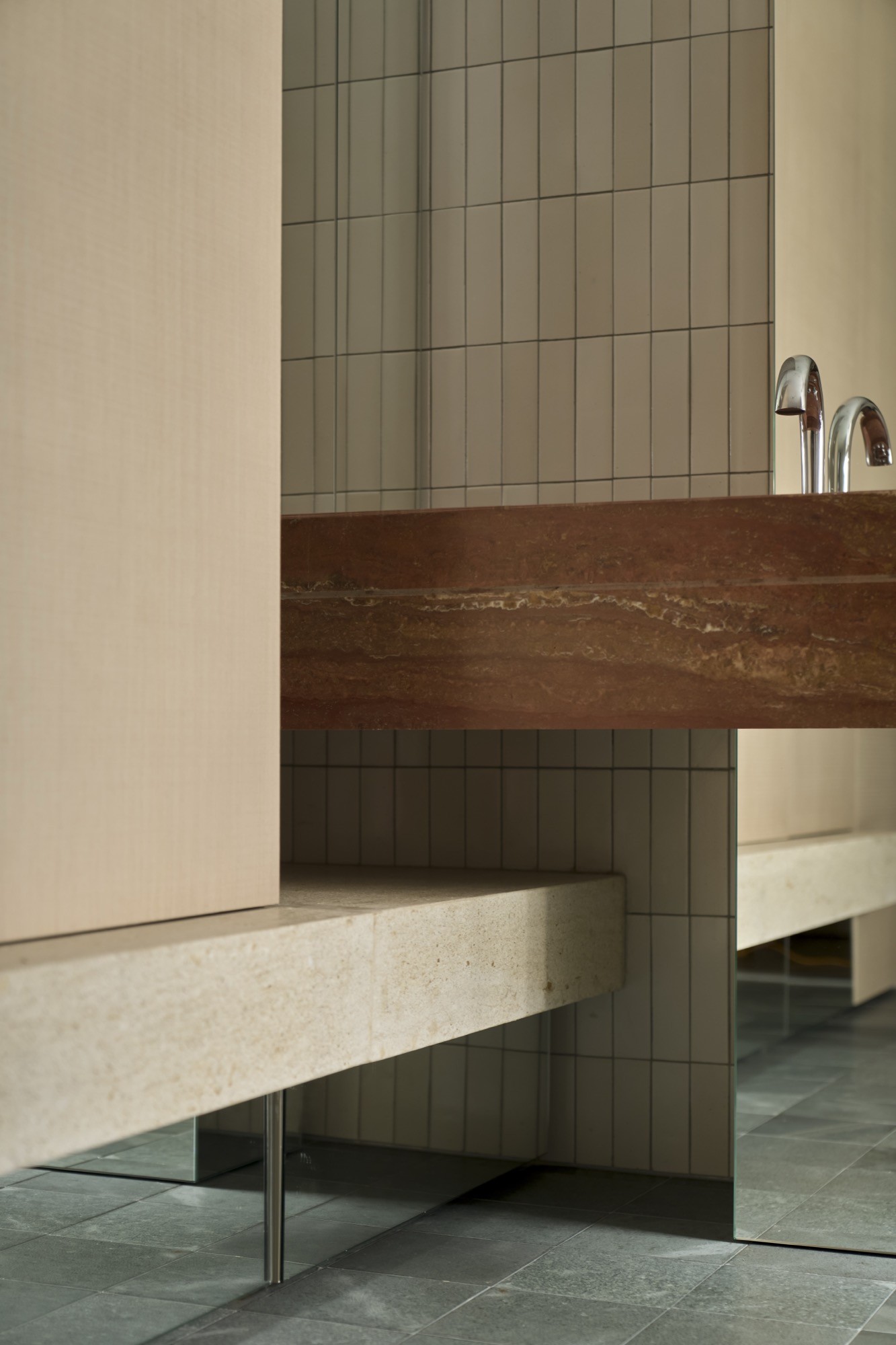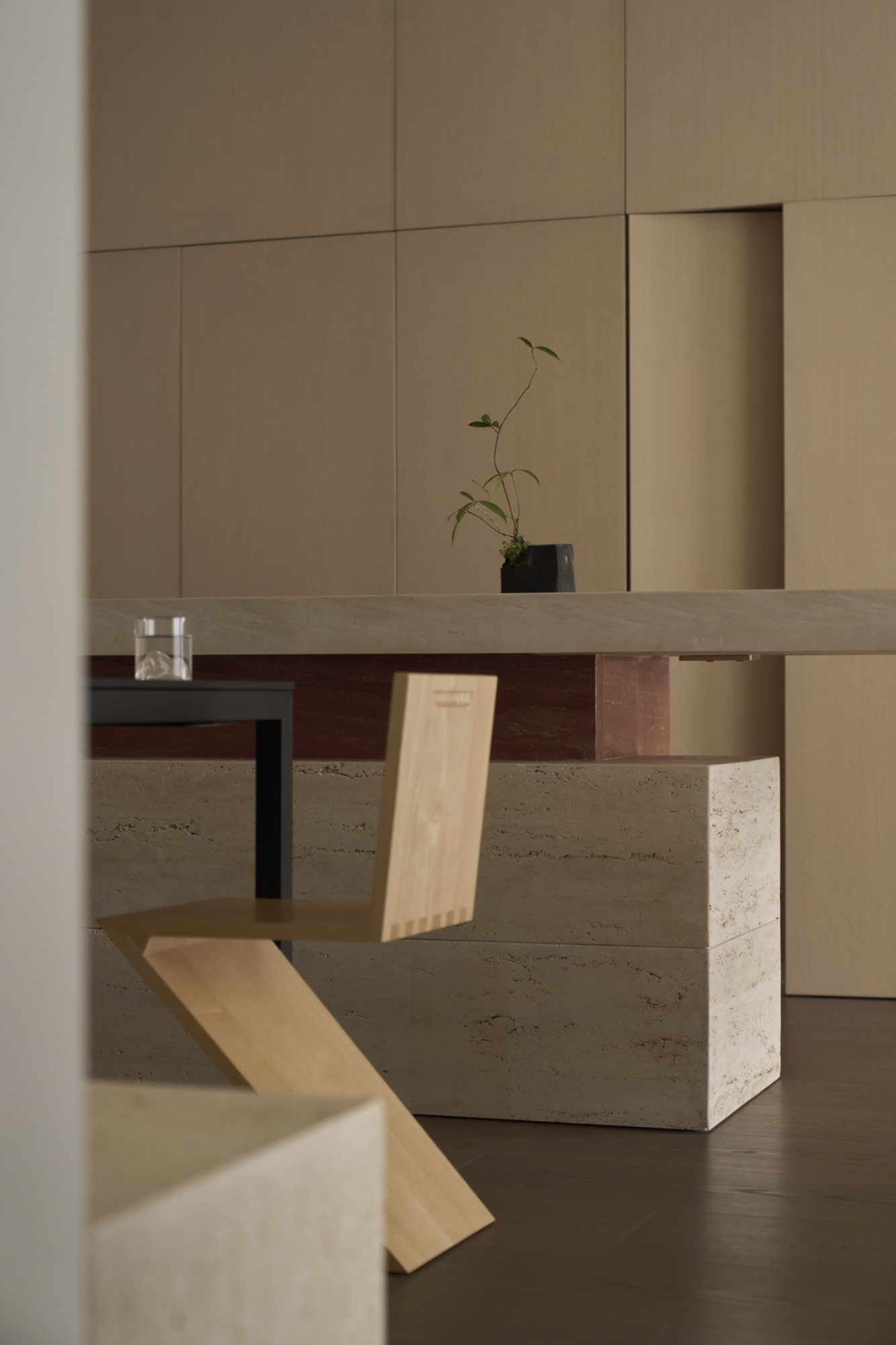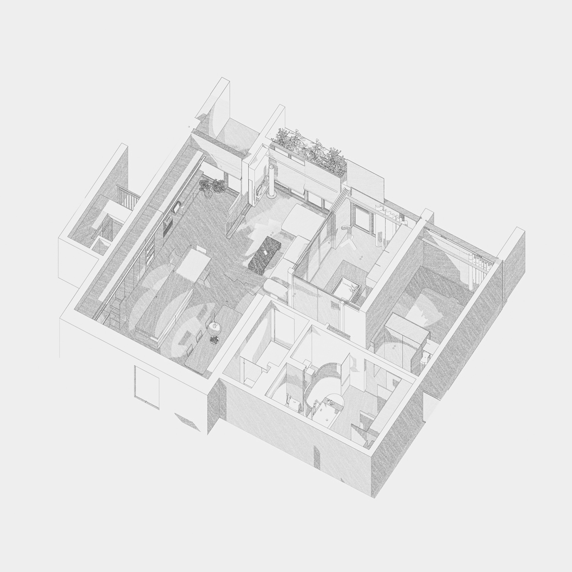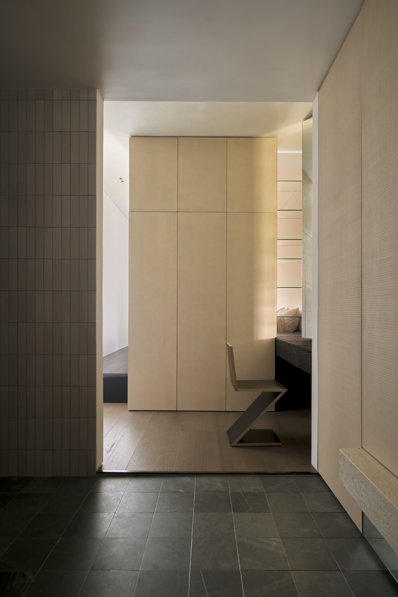 Tổ chức không gian được dẫn dắt bởi hai trục nhìn chính, kéo dài từ lối vào ra ban công và từ bếp vào khu nghỉ ngơi, qua đó làm rõ chiều sâu và tính liên tục của căn hộ. Trên nền đó, đảo bếp dạng treo đóng vai trò như một yếu tố trung tâm, vừa định hình công năng vừa kết nối các hoạt động thường nhật. Các giải pháp như giấu thiết bị, tích hợp lưu trữ hay sử dụng gương được triển khai có kiểm soát, nhằm giữ lại sự thông thoáng và liền mạch thị giác.