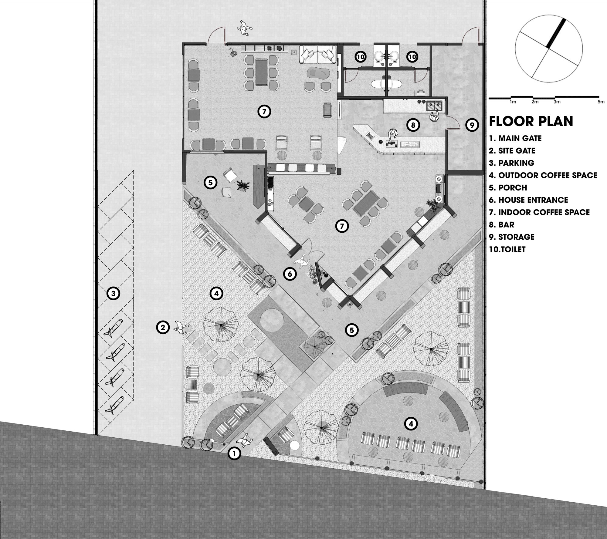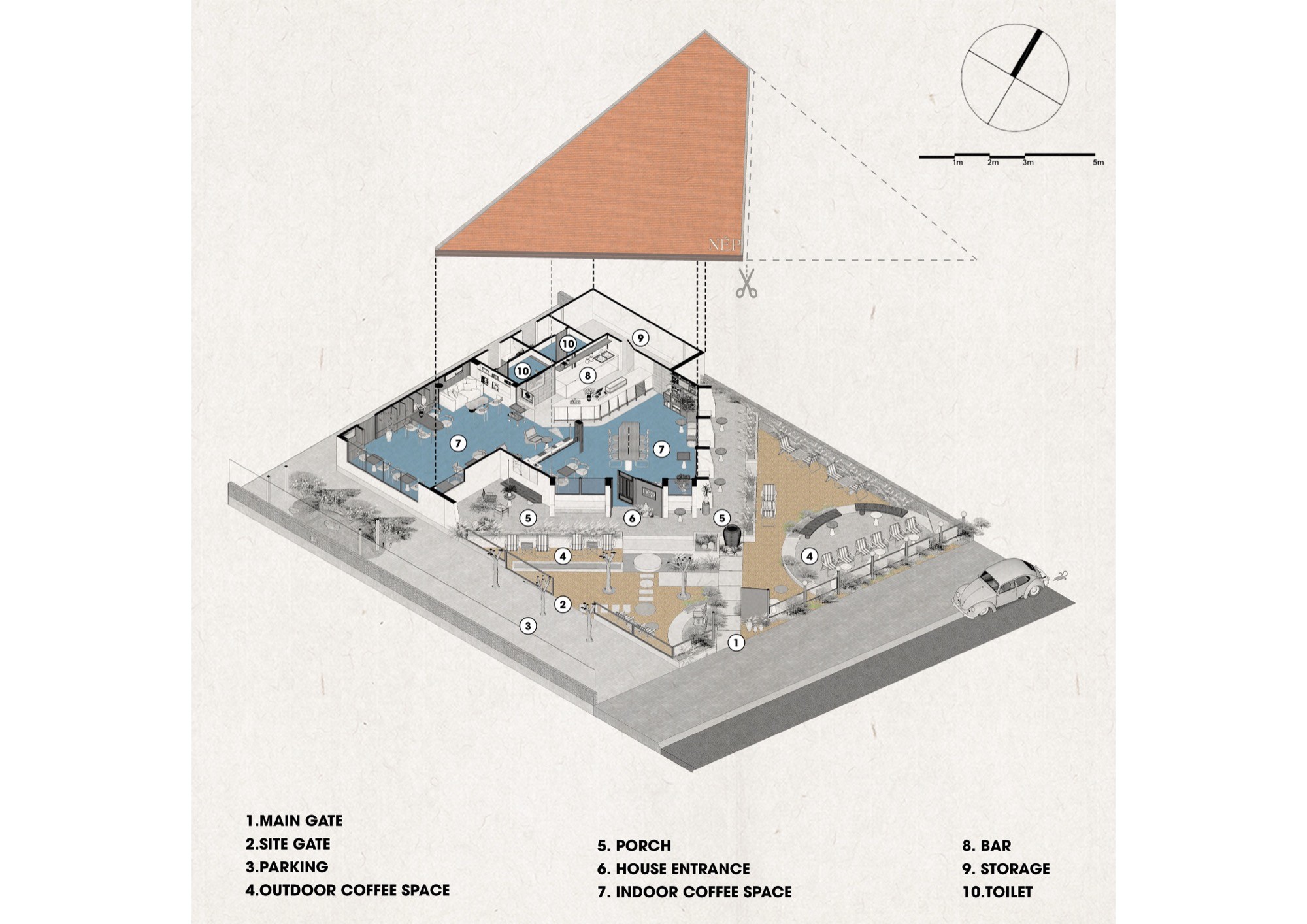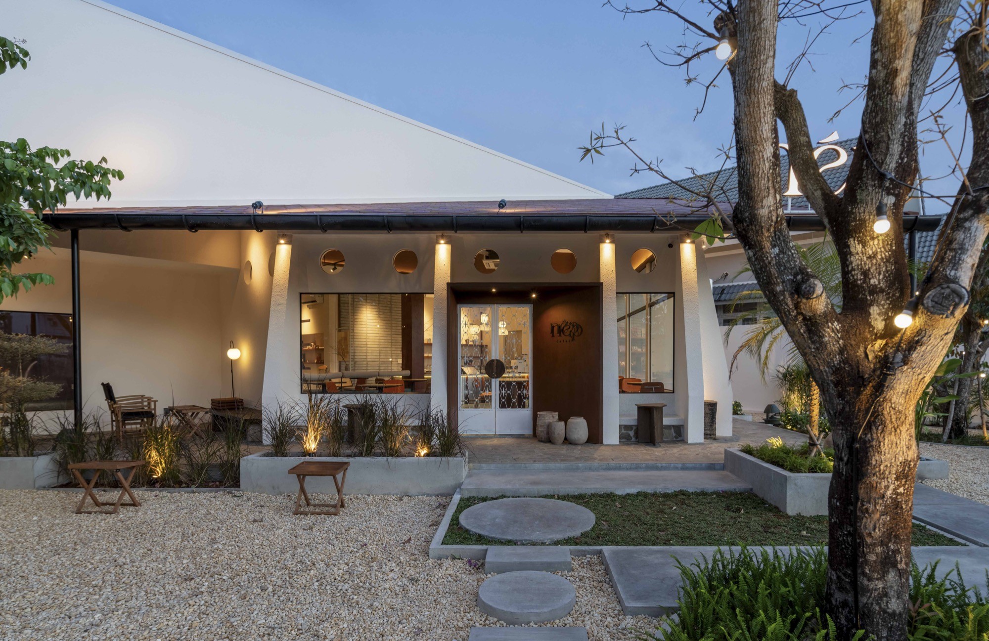 Chiến lược chính nằm ở việc đưa các yếu tố thiên nhiên và hình ảnh văn hóa bản địa vào tổ chức không gian, nhằm làm mềm đi tính chất công nghiệp ban đầu. Không gian quán được mở ra theo nhiều lớp, nơi ranh giới giữa trong và ngoài được làm mờ thông qua cây xanh, ánh sáng và các khoảng chuyển tiếp. Các yếu tố này không chỉ đóng vai trò trang trí, mà trở thành cấu phần tổ chức trải nghiệm, giúp điều tiết vi khí hậu và tạo nên nhịp điệu sử dụng.