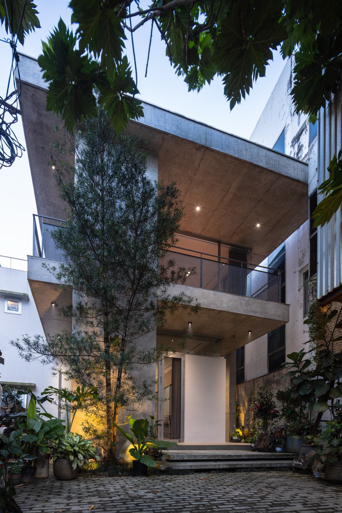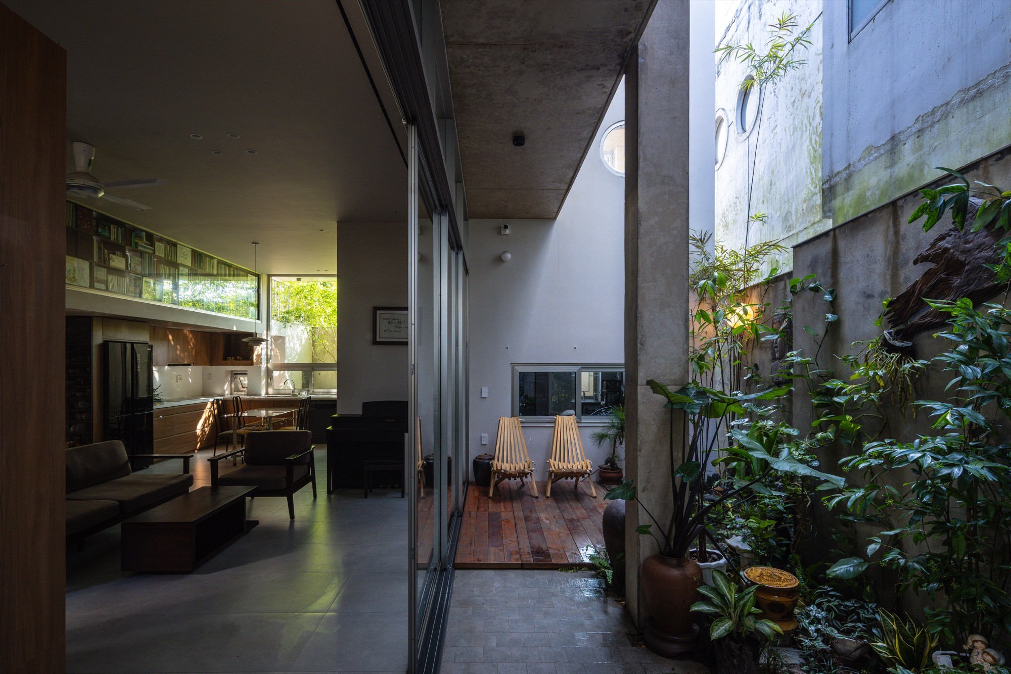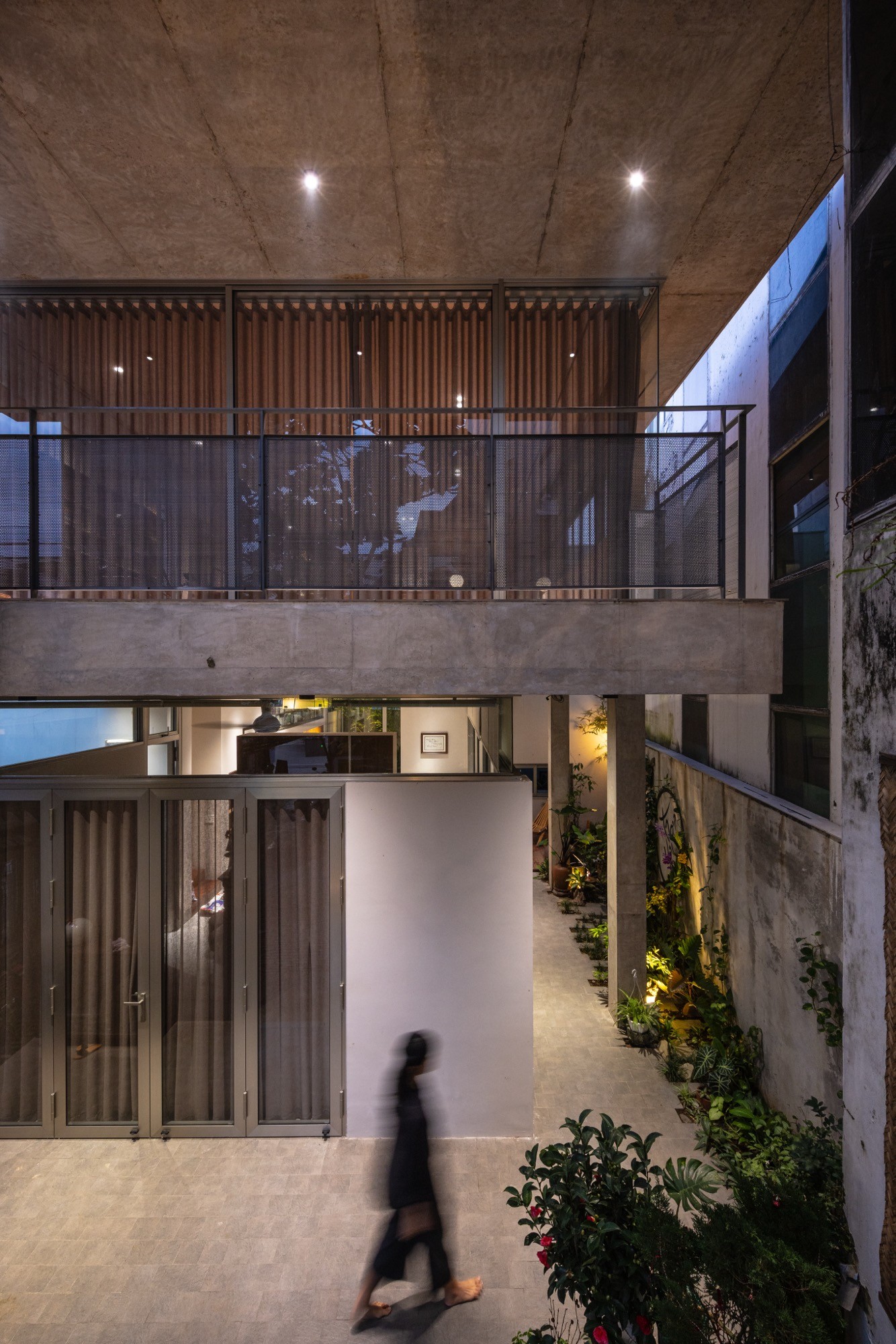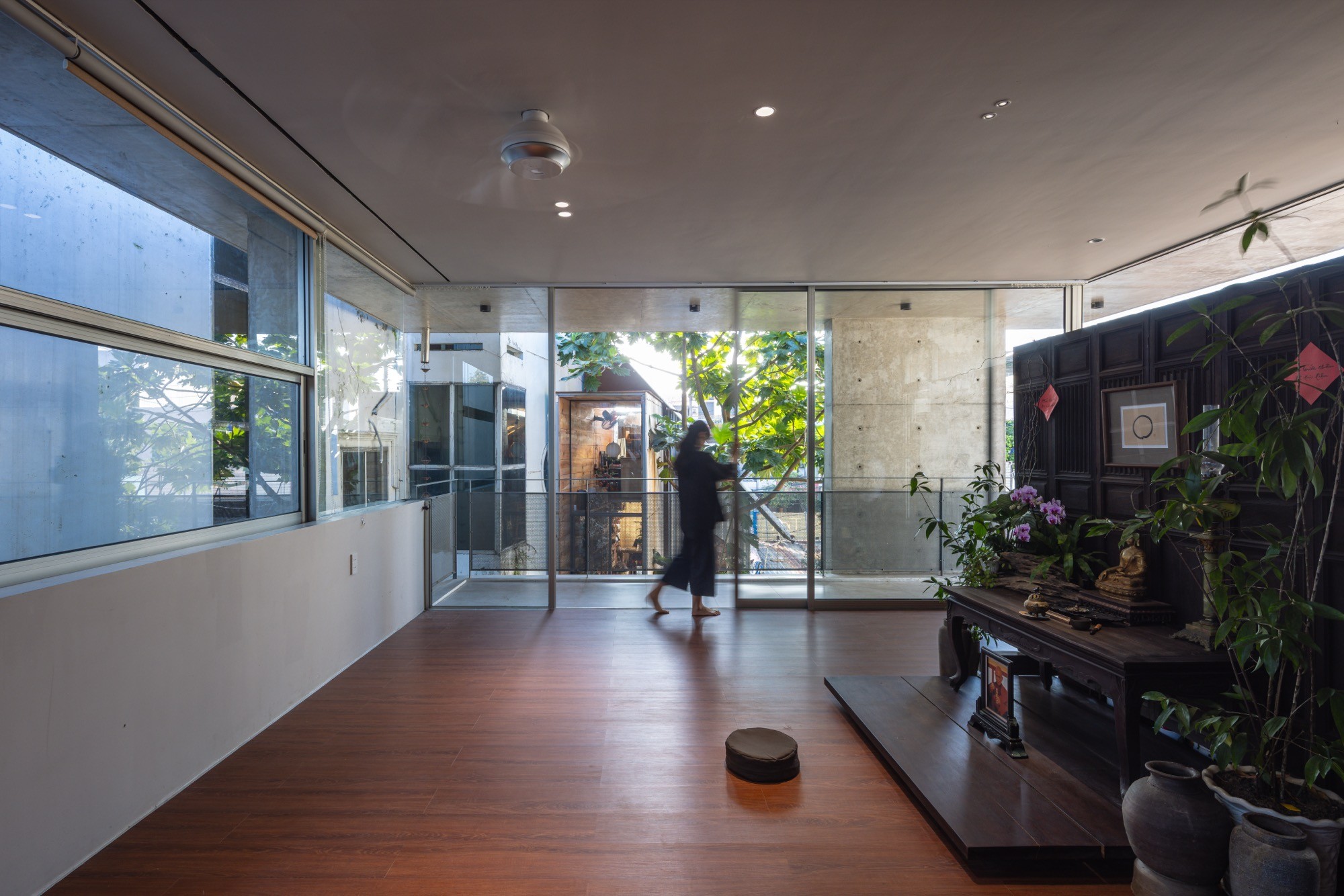 Không gian thờ được giữ nguyên tại vị trí của ngôi nhà cũ, từ vị trí đó, kiến trúc được triển khai xoay quanh, thiết lập mối quan hệ liên tục giữa cái mới và lớp ký ức hiện hữu. Một hệ mái bê tông lớn bao phủ toàn bộ công trình, tạo nên một vùng bao thống nhất. Dưới lớp mái này, các không gian liên kết thông qua cao độ, ánh sáng và khoảng rỗng, hạn chế sự phân chia bằng vách ngăn cứng.