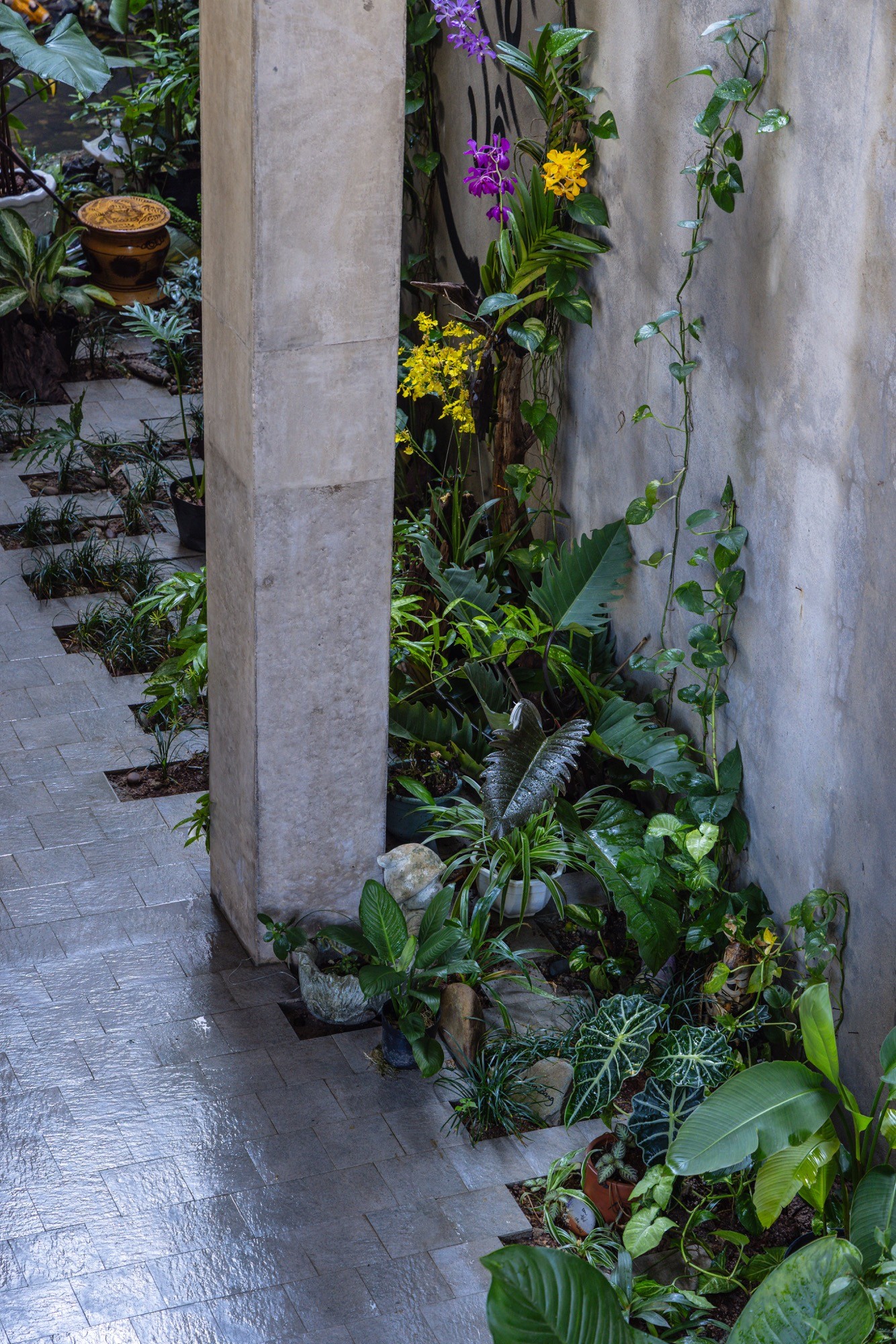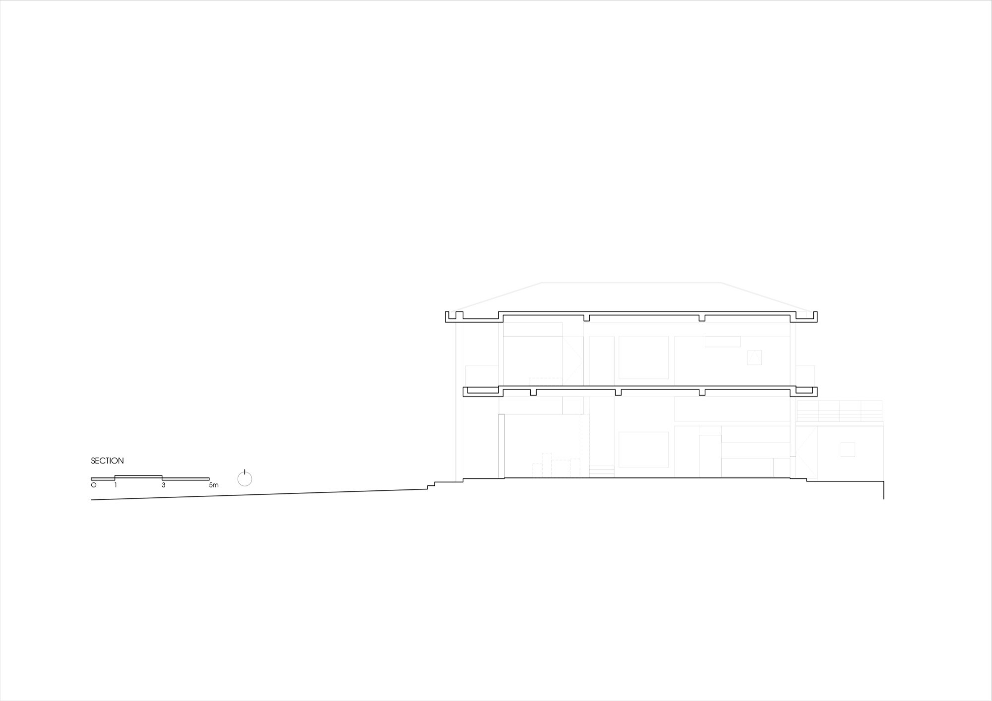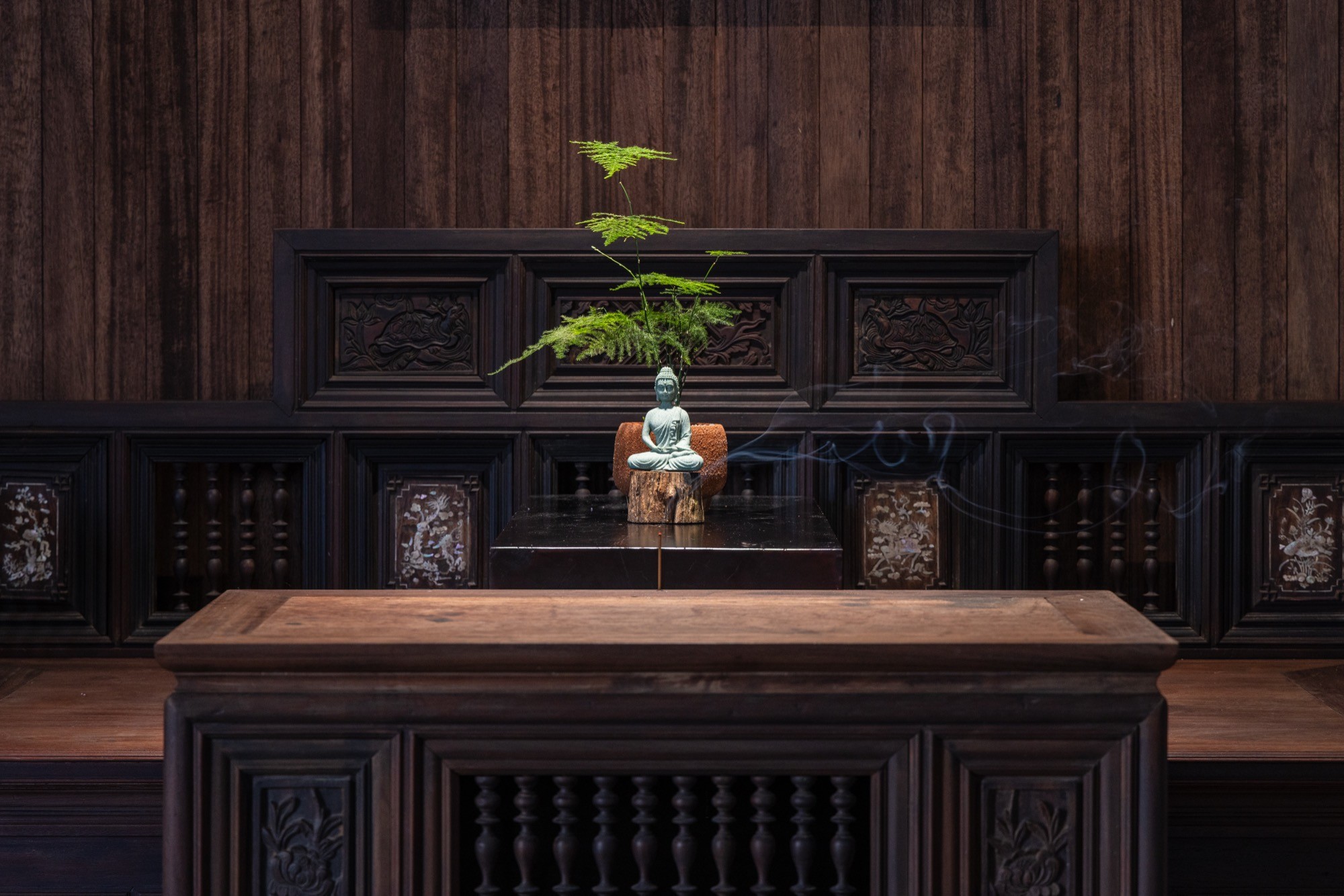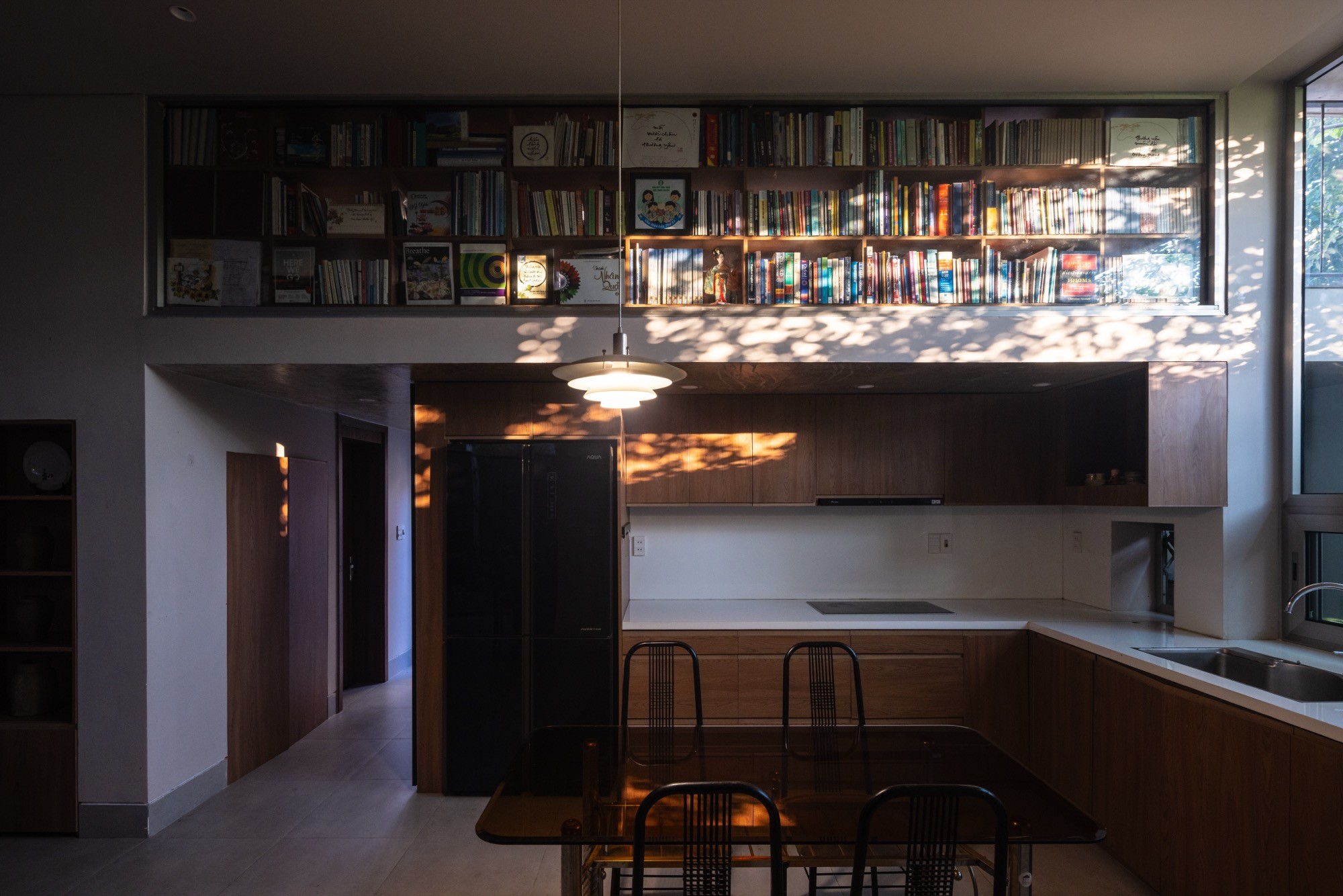 Không gian thờ được giữ nguyên tại vị trí của ngôi nhà cũ, từ vị trí đó, kiến trúc được triển khai xoay quanh, thiết lập mối quan hệ liên tục giữa cái mới và lớp ký ức hiện hữu. Một hệ mái bê tông lớn bao phủ toàn bộ công trình, tạo nên một vùng bao thống nhất. Dưới lớp mái này, các không gian liên kết thông qua cao độ, ánh sáng và khoảng rỗng, hạn chế sự phân chia bằng vách ngăn cứng.