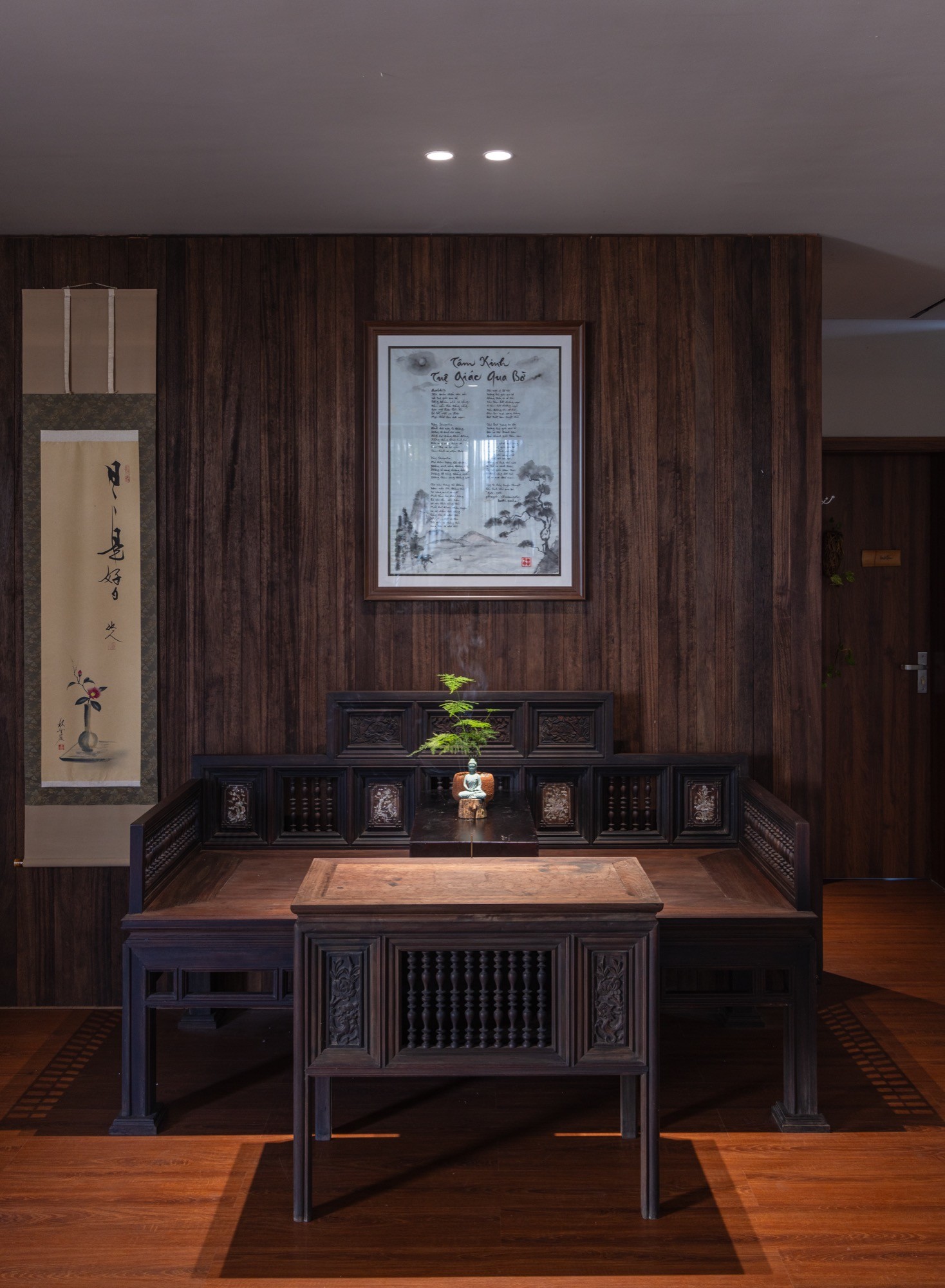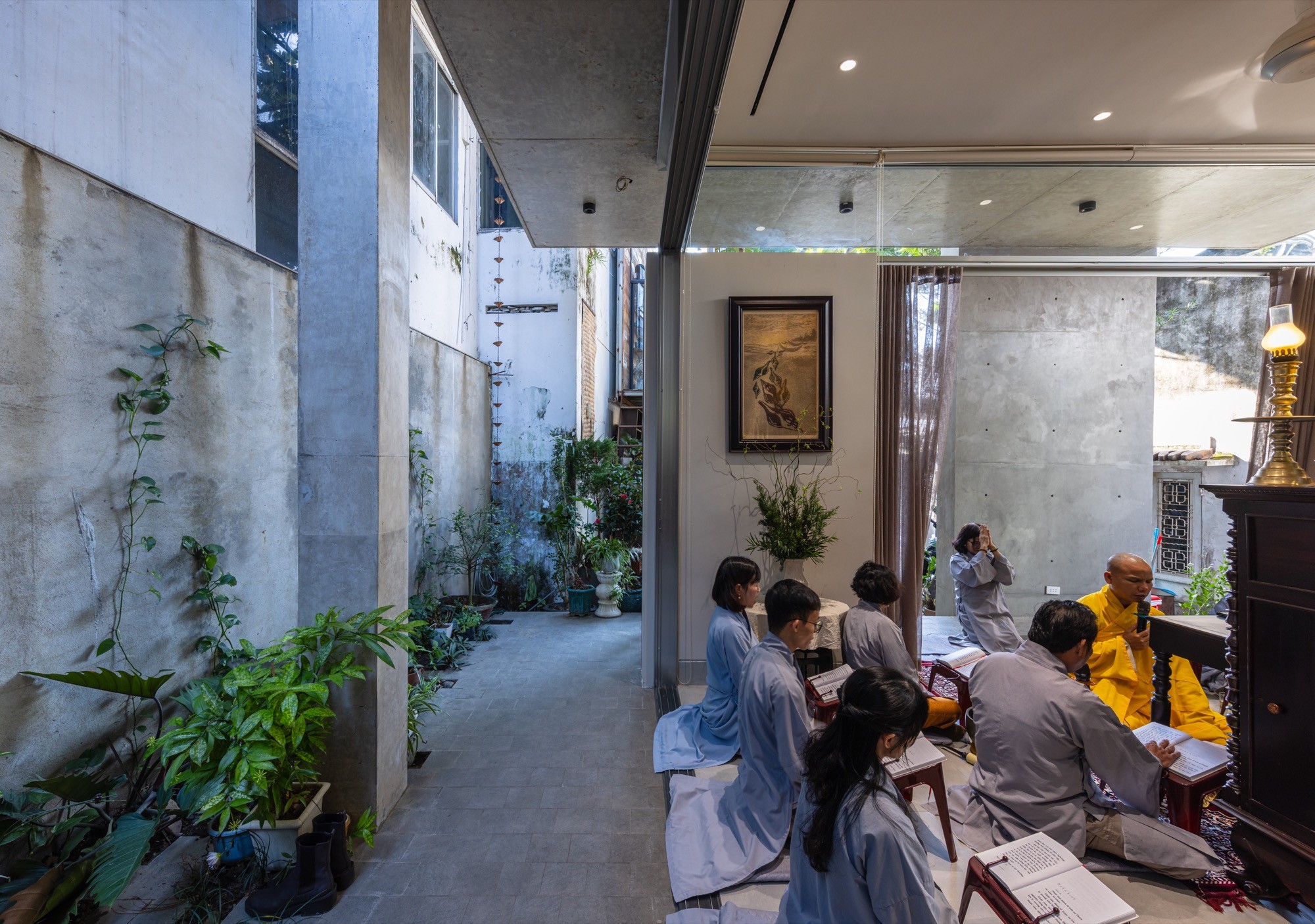 Công trình được thiết kế cho một gia đình Phật tử đa thế hệ tại Huế, với mục tiêu tạo dựng sự cân bằng giữa đời sống vật chất và tinh thần. Thay vì tìm kiếm sự biểu đạt hình thức, công trình được kiến tạo như một nền tảng tĩnh lặng, nơi kiến trúc lùi lại để đời sống thường nhật và thực hành tinh thần diễn ra một cách tự nhiên.