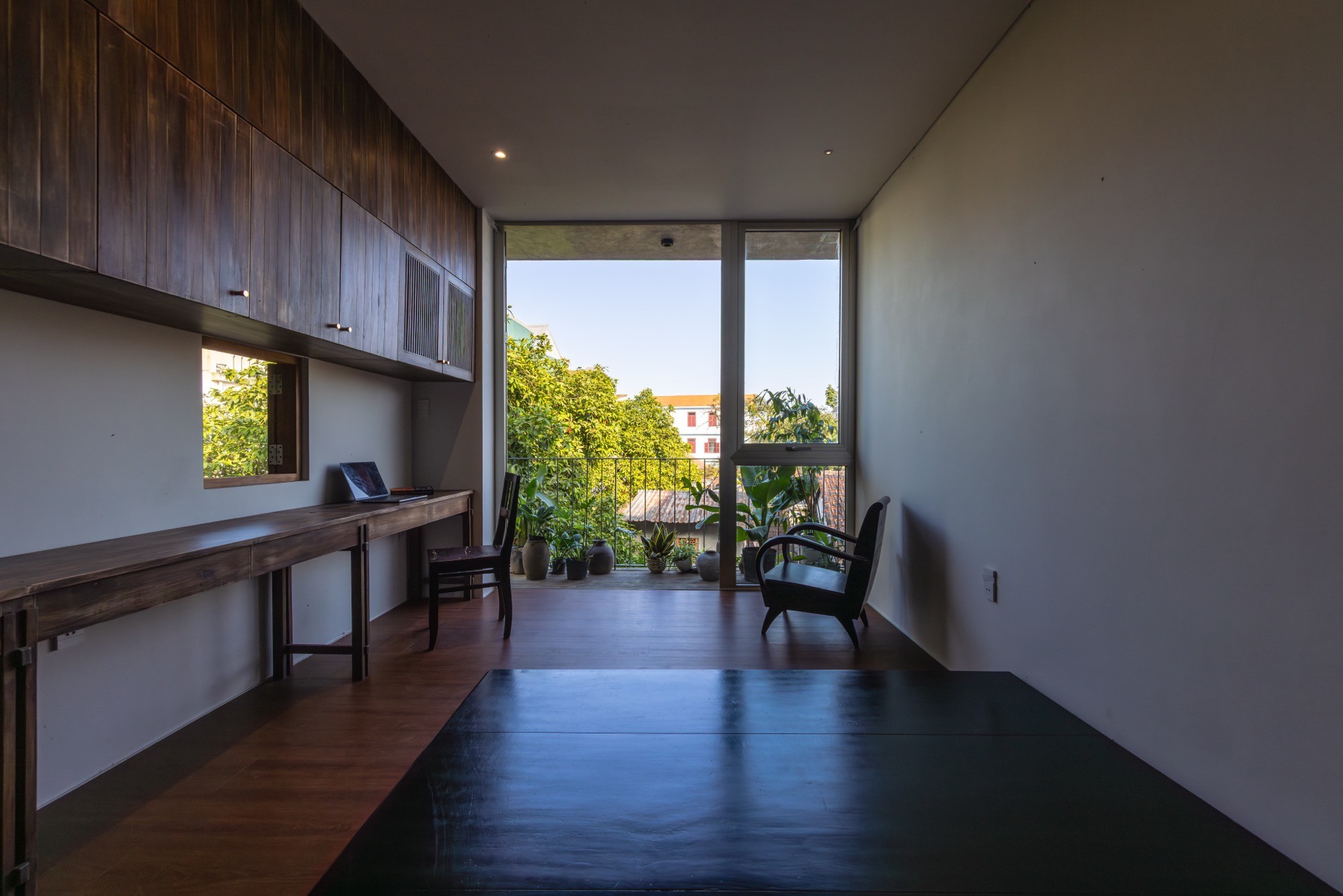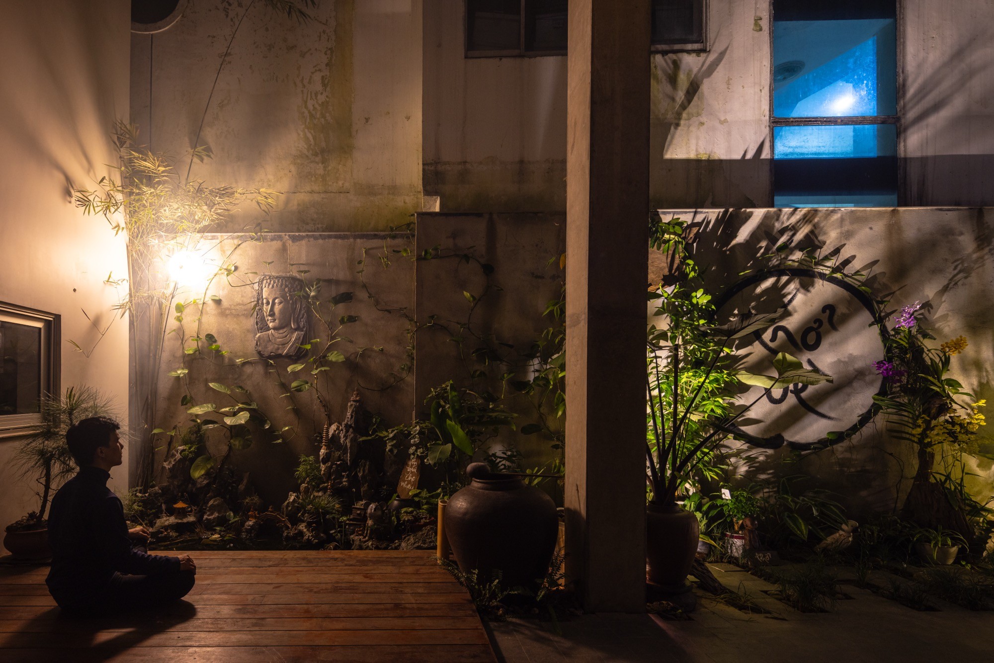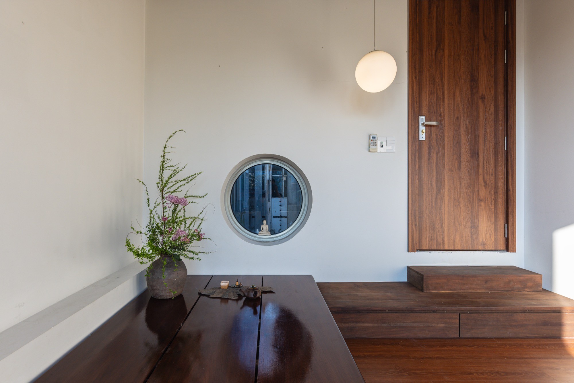Cầu thang, chiếu nghỉ và tầng lửng được mở rộng chức năng, không chỉ phục vụ giao thông mà còn trở thành những không gian sử dụng linh hoạt, nơi nhịp sinh hoạt được làm chậm lại. Tầng trên dành cho thiền định và sinh hoạt chung, tổ chức xoay quanh các khoảng trống đứng và hiên đệm, cho phép không gian thích ứng linh hoạt giữa sự tĩnh lặng cá nhân và các hoạt động tập thể. Sân thượng kết thúc công trình bằng một khoảng trống mở hướng lên bầu trời, tạo điều kiện cho sự dừng lại và chiêm nghiệm.