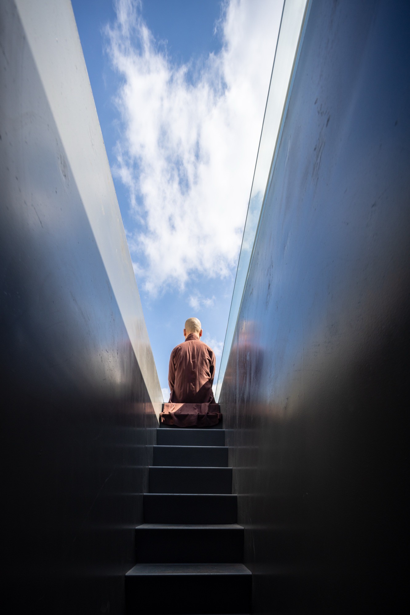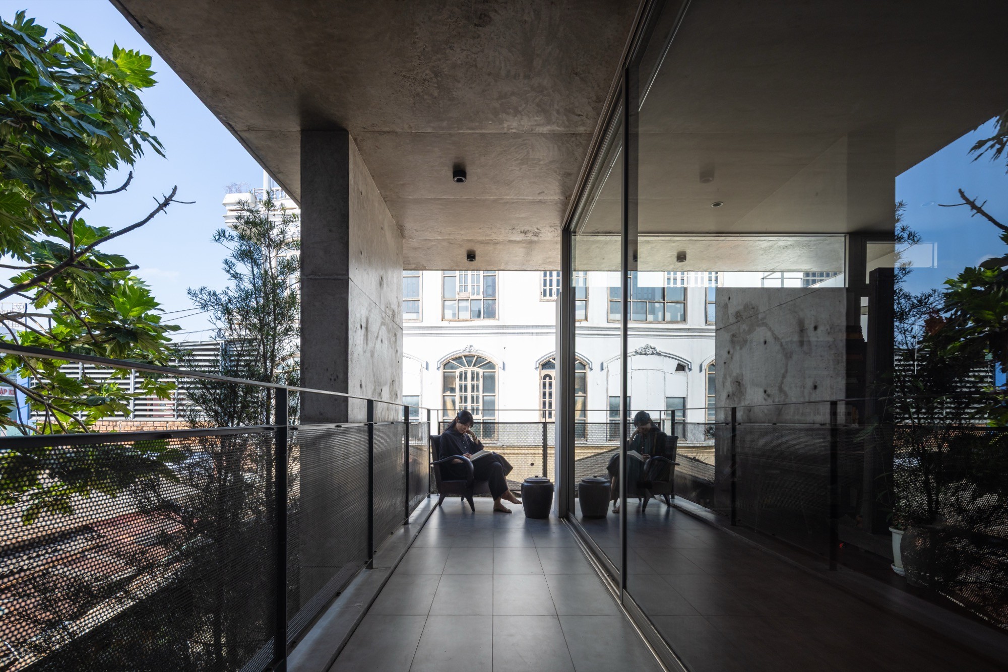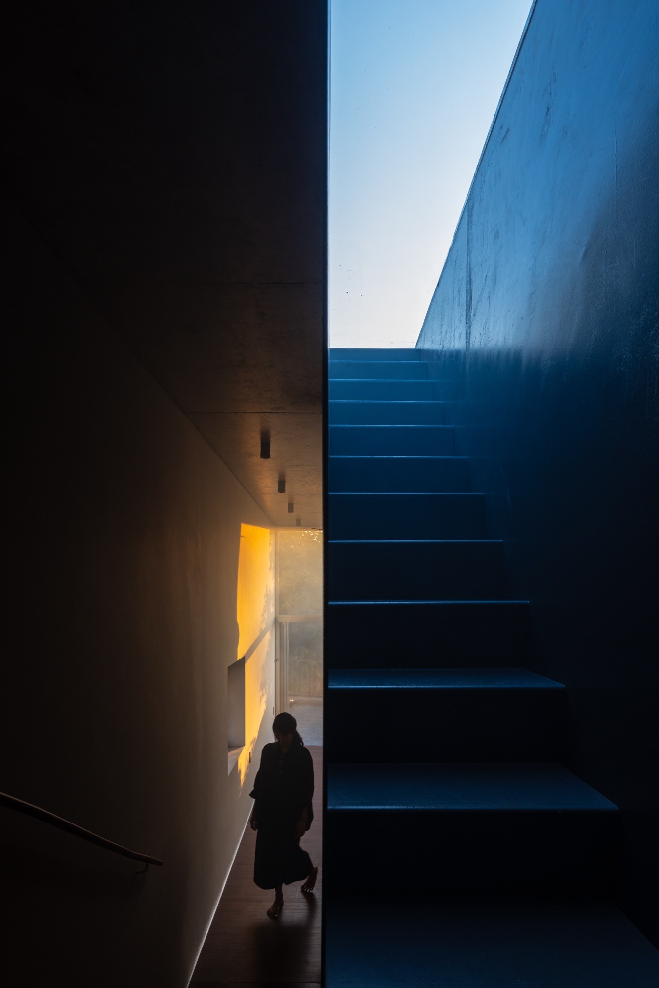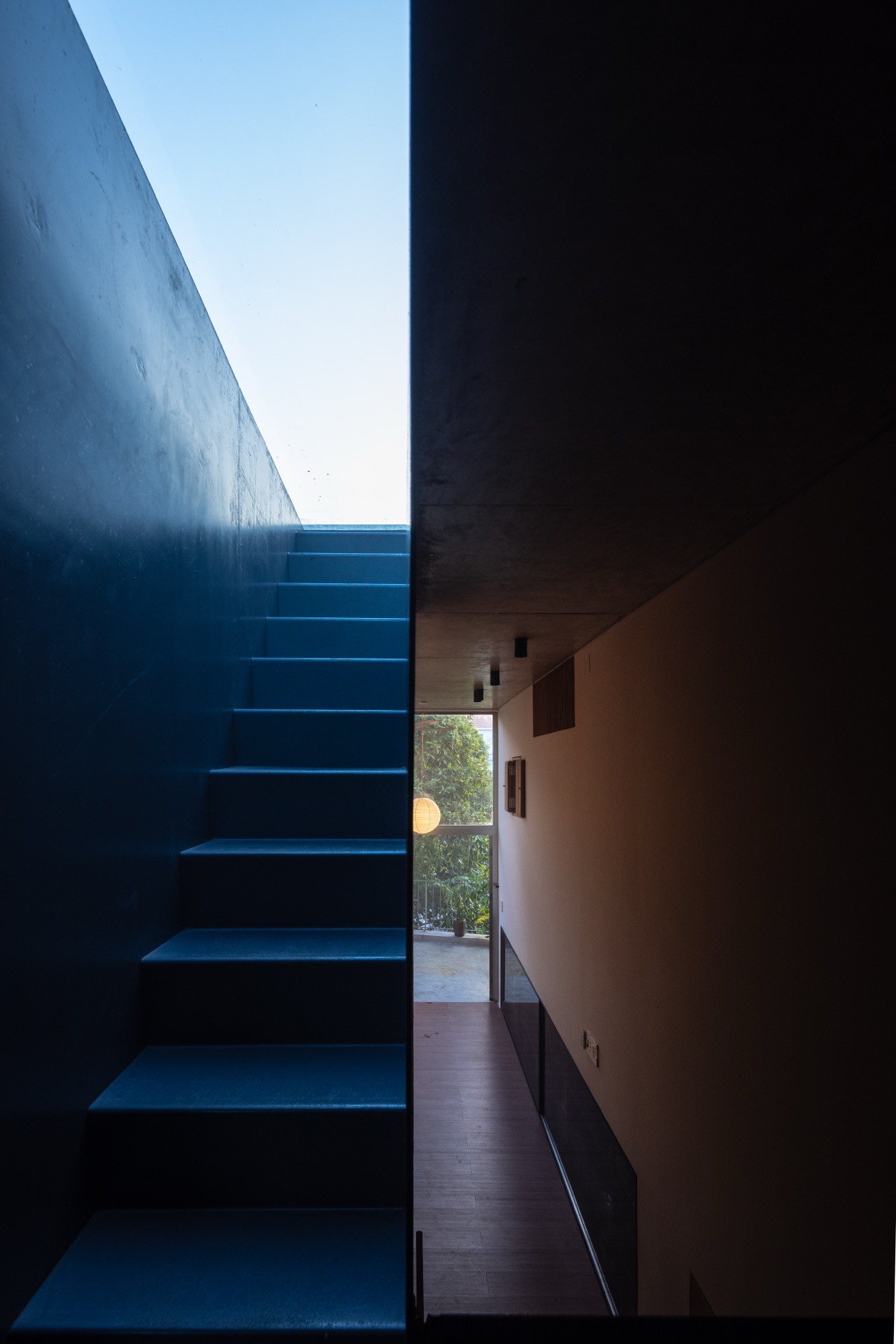 Cầu thang, chiếu nghỉ và tầng lửng được mở rộng chức năng, không chỉ phục vụ giao thông mà còn trở thành những không gian sử dụng linh hoạt, nơi nhịp sinh hoạt được làm chậm lại. Tầng trên dành cho thiền định và sinh hoạt chung, tổ chức xoay quanh các khoảng trống đứng và hiên đệm, cho phép không gian thích ứng linh hoạt giữa sự tĩnh lặng cá nhân và các hoạt động tập thể. Sân thượng kết thúc công trình bằng một khoảng trống mở hướng lên bầu trời, tạo điều kiện cho sự dừng lại và chiêm nghiệm.
