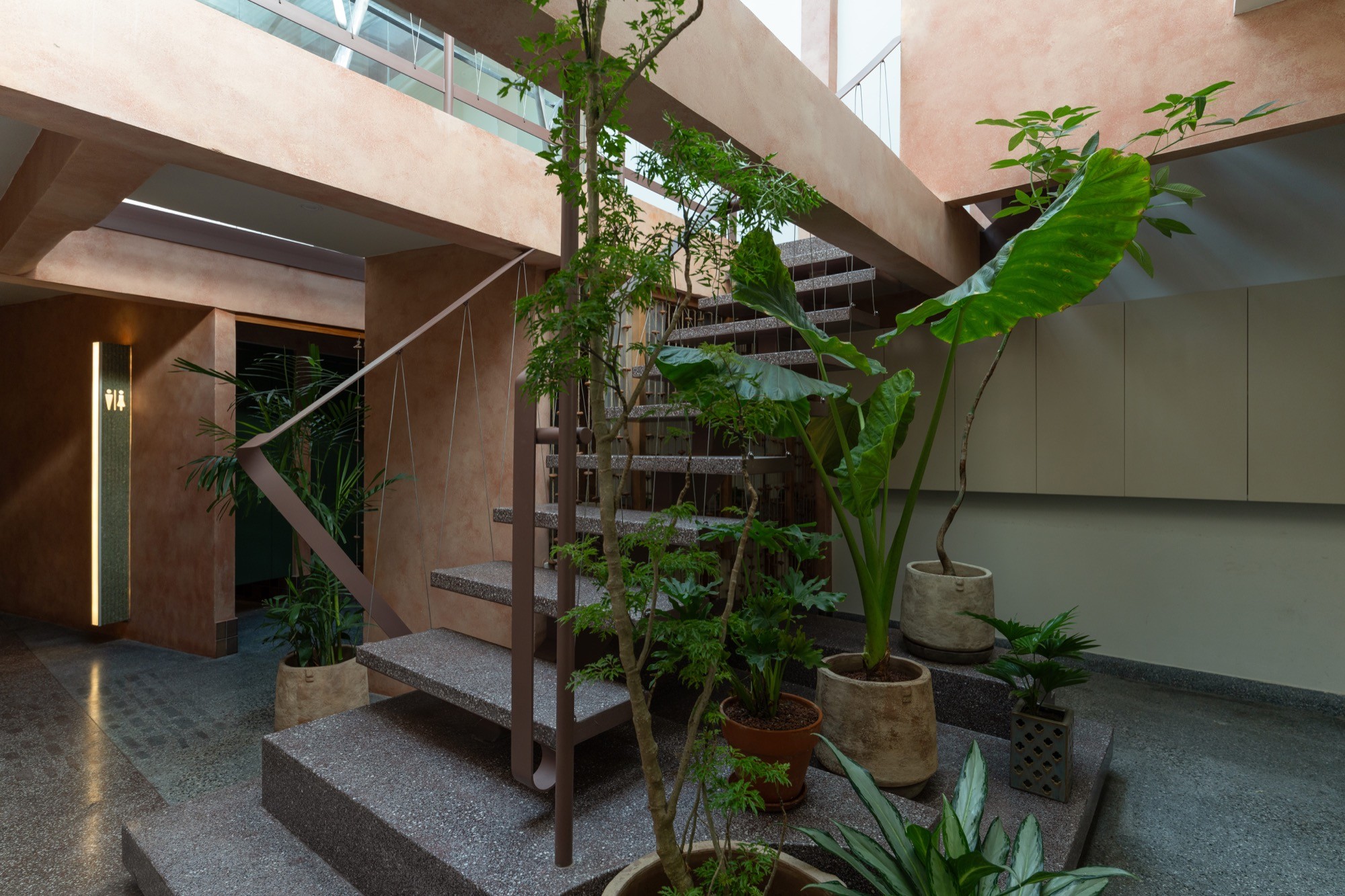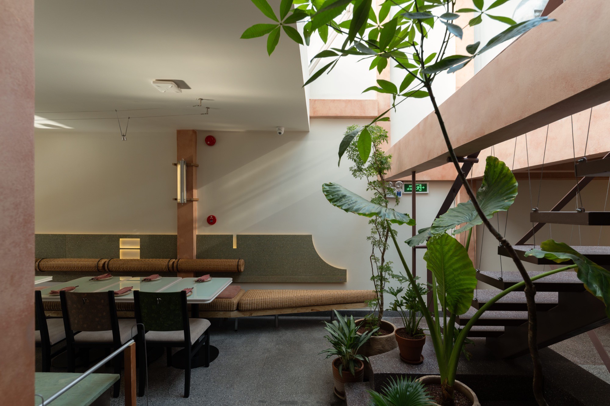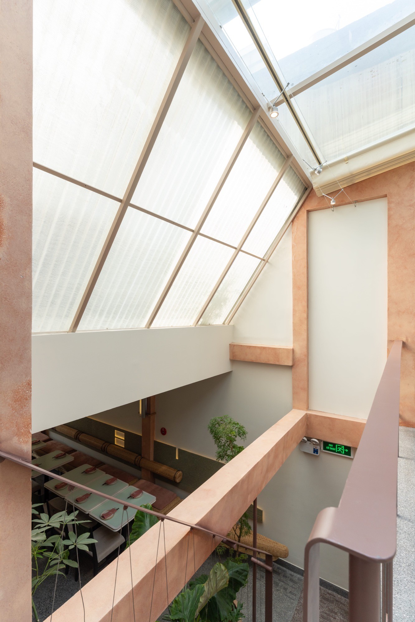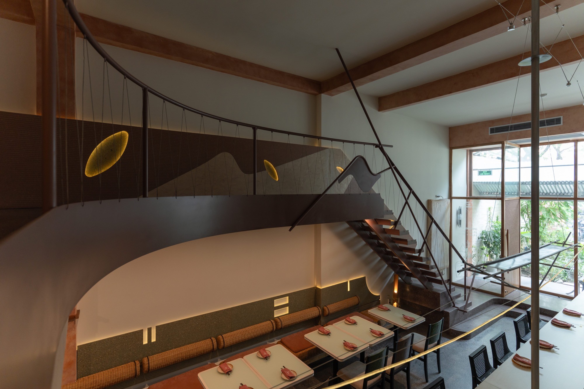 Các lối đi được bố trí lệch, liên tục mở ra những góc nhìn khác nhau theo từng bước di chuyển. Không gian trên và dưới được liên kết thông qua các khoảng mở, cho phép ánh sáng và tầm nhìn lan tỏa xuyên suốt, làm mờ đi ranh giới giữa các cao độ.