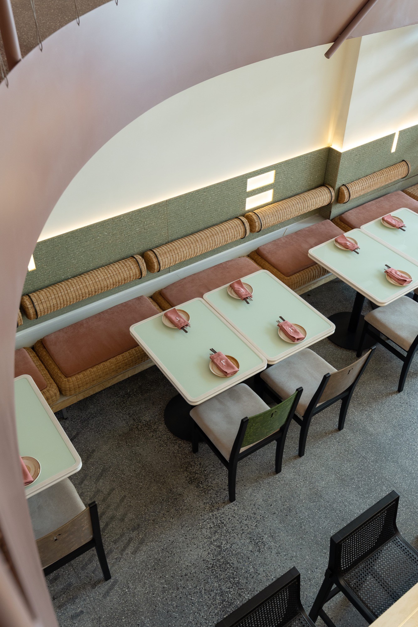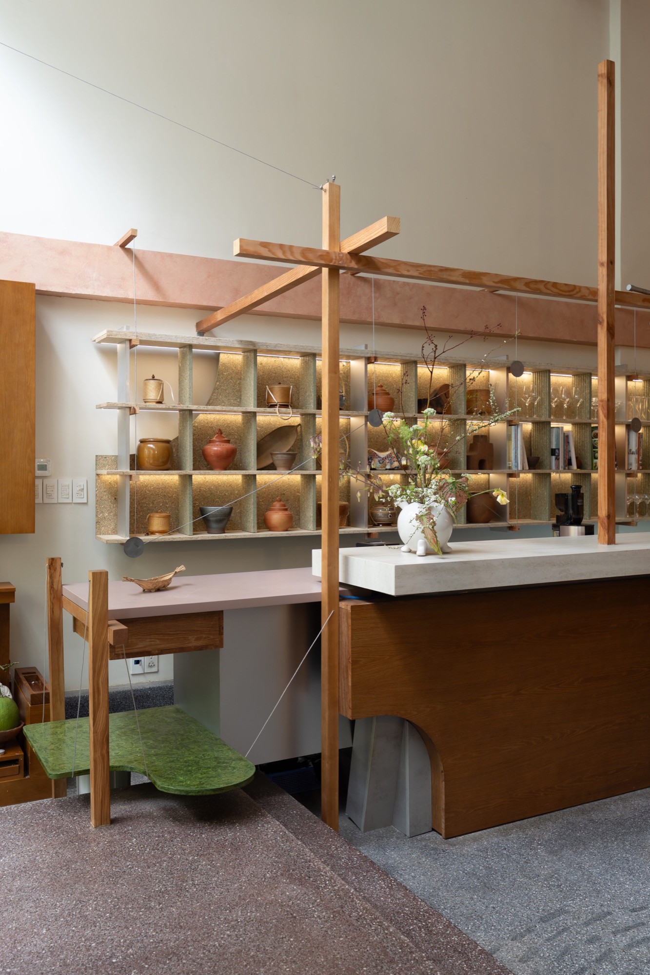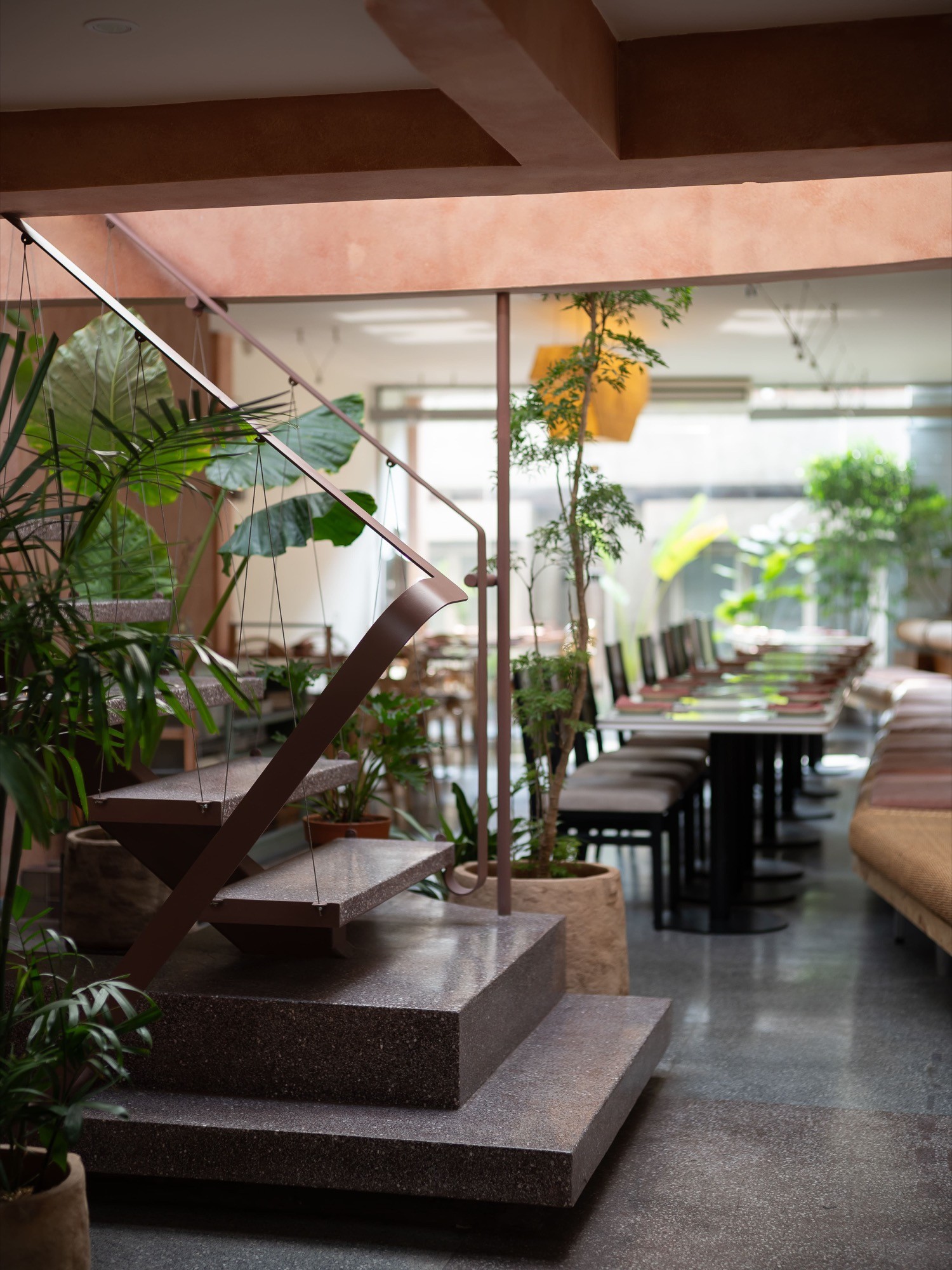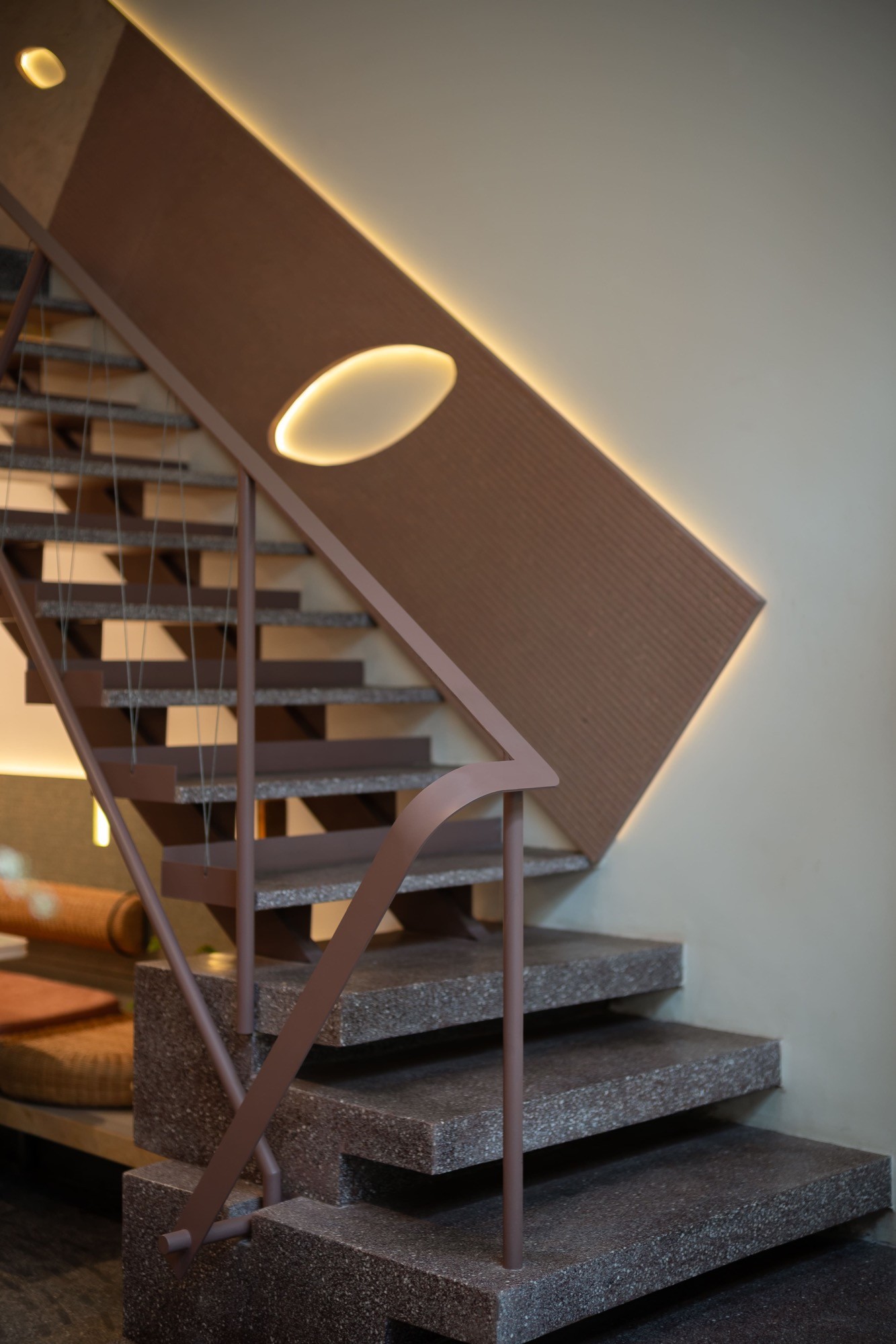 Các lối đi được bố trí lệch, liên tục mở ra những góc nhìn khác nhau theo từng bước di chuyển. Không gian trên và dưới được liên kết thông qua các khoảng mở, cho phép ánh sáng và tầm nhìn lan tỏa xuyên suốt, làm mờ đi ranh giới giữa các cao độ.