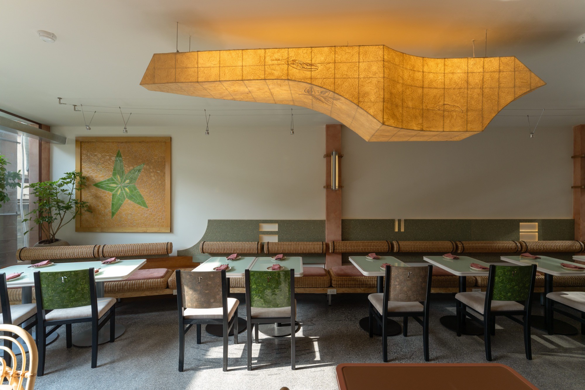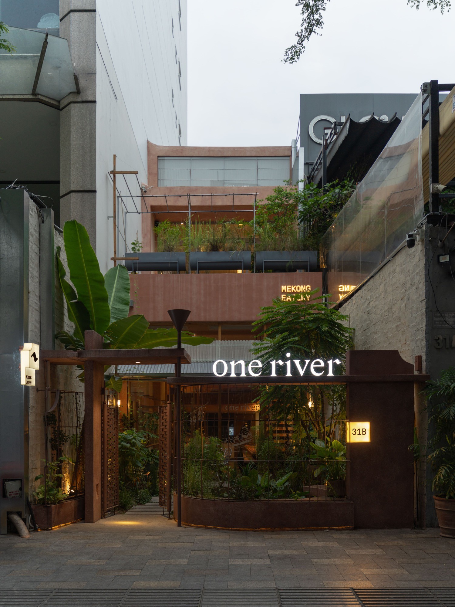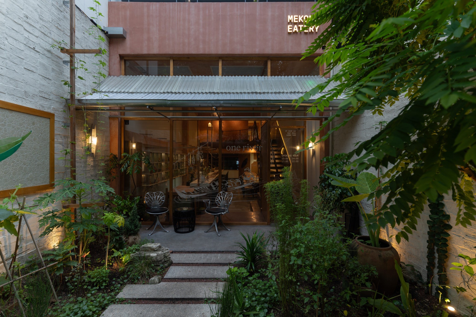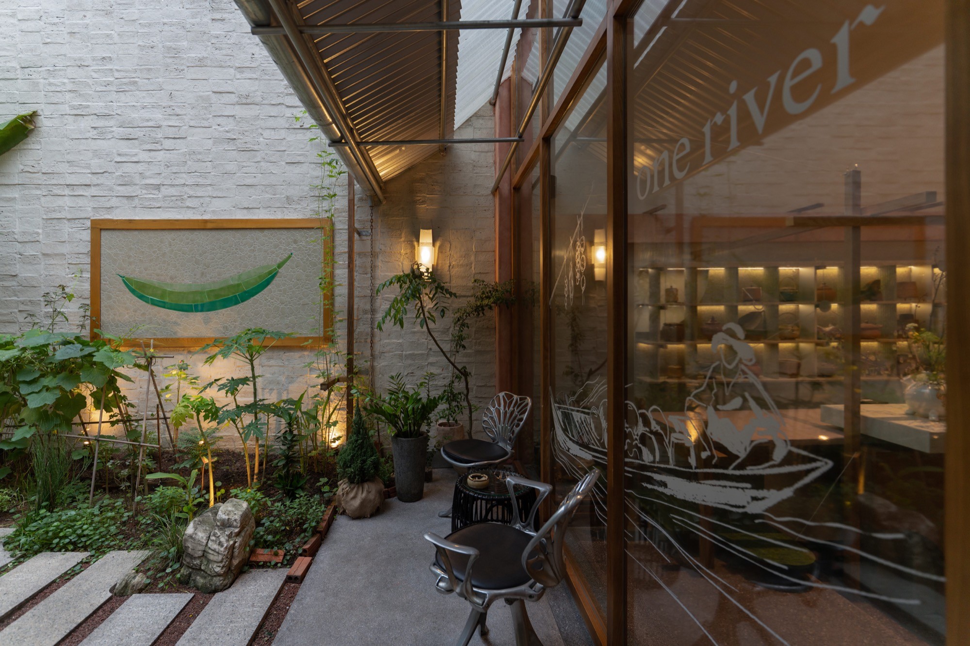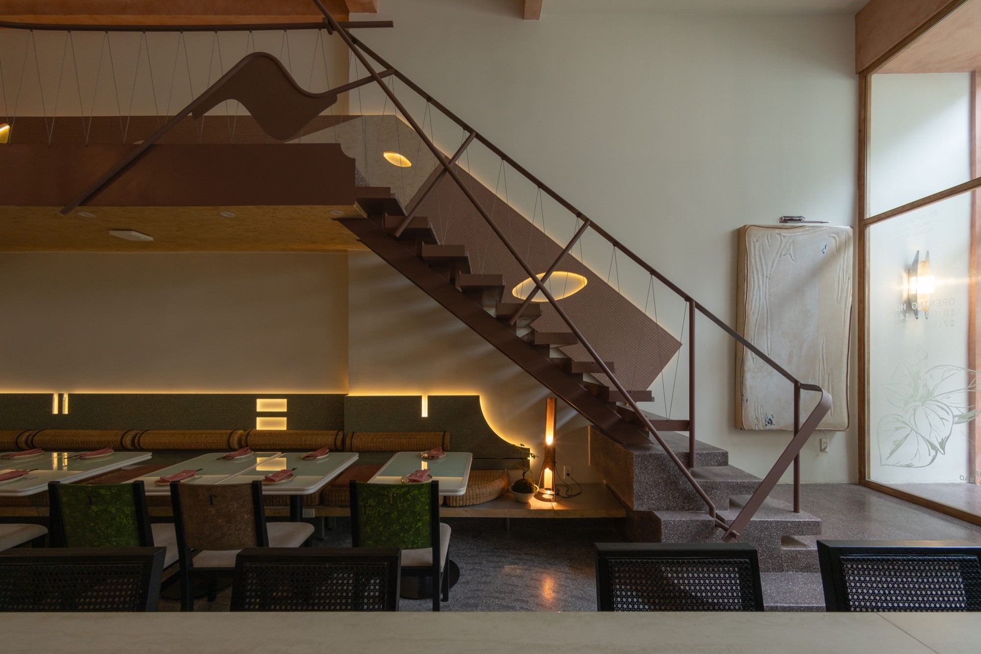 Kết cấu thép được đưa vào thay thế cho bê tông, như một cách giảm tải thị giác và tạo cảm giác nhẹ, thoáng hơn cho tổng thể. Hệ nội thất và vật liệu thiên về thủ công, với mây tre đan, sơn mài, đèn giấy trúc chỉ, kết hợp cùng đá mài và đá rửa. Các bề mặt không tách rời mà được nối kết bằng những chi tiết ghép, buộc, hình thành một dòng chảy liên tục trong cách tổ chức vật liệu.