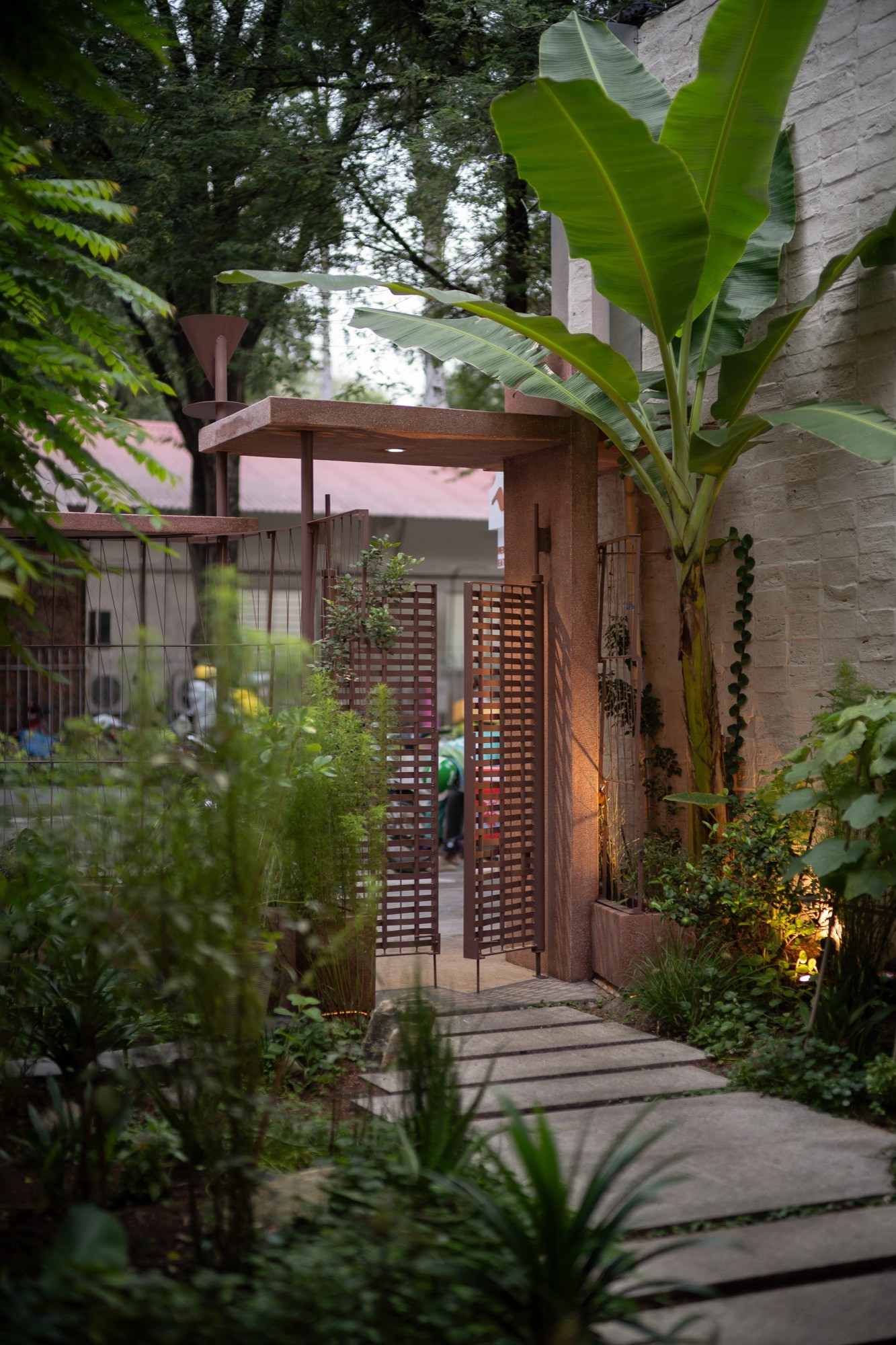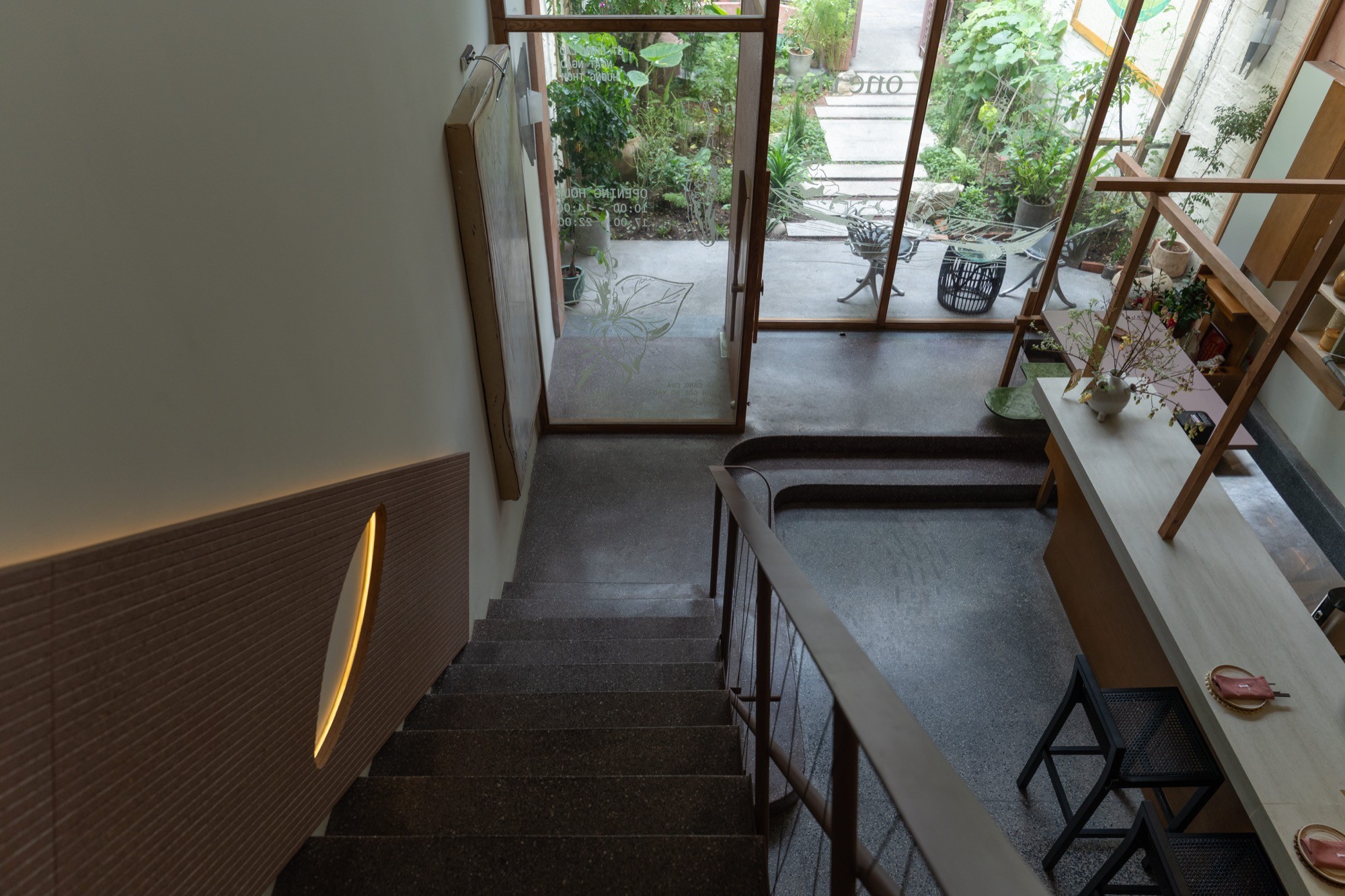 Công trình được cải tạo từ một cấu trúc nhà phố hiện hữu, nơi can thiệp thiết kế tập trung vào việc tái tổ chức các khoảng mở, khoảng lùi và vị trí cầu thang nhằm thiết lập một trục không gian liên tục. Từ điểm vào, hành trình được dẫn dắt qua một khu vườn nhỏ, nơi tầm nhìn mở ra cầu thang và các tầng phía trên, trước khi dần chuyển tiếp vào không gian nội thất và kết lại bằng một khoảng nhìn hướng ra hàng cây.