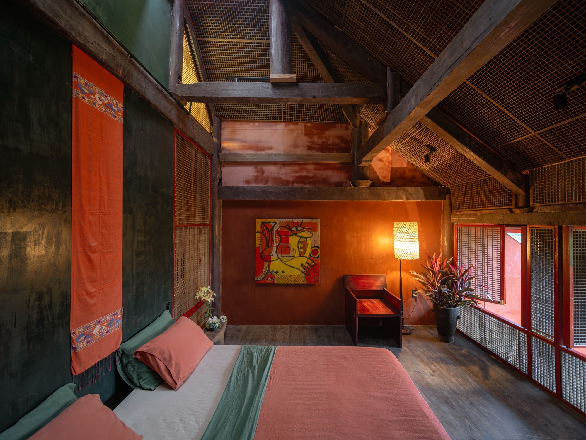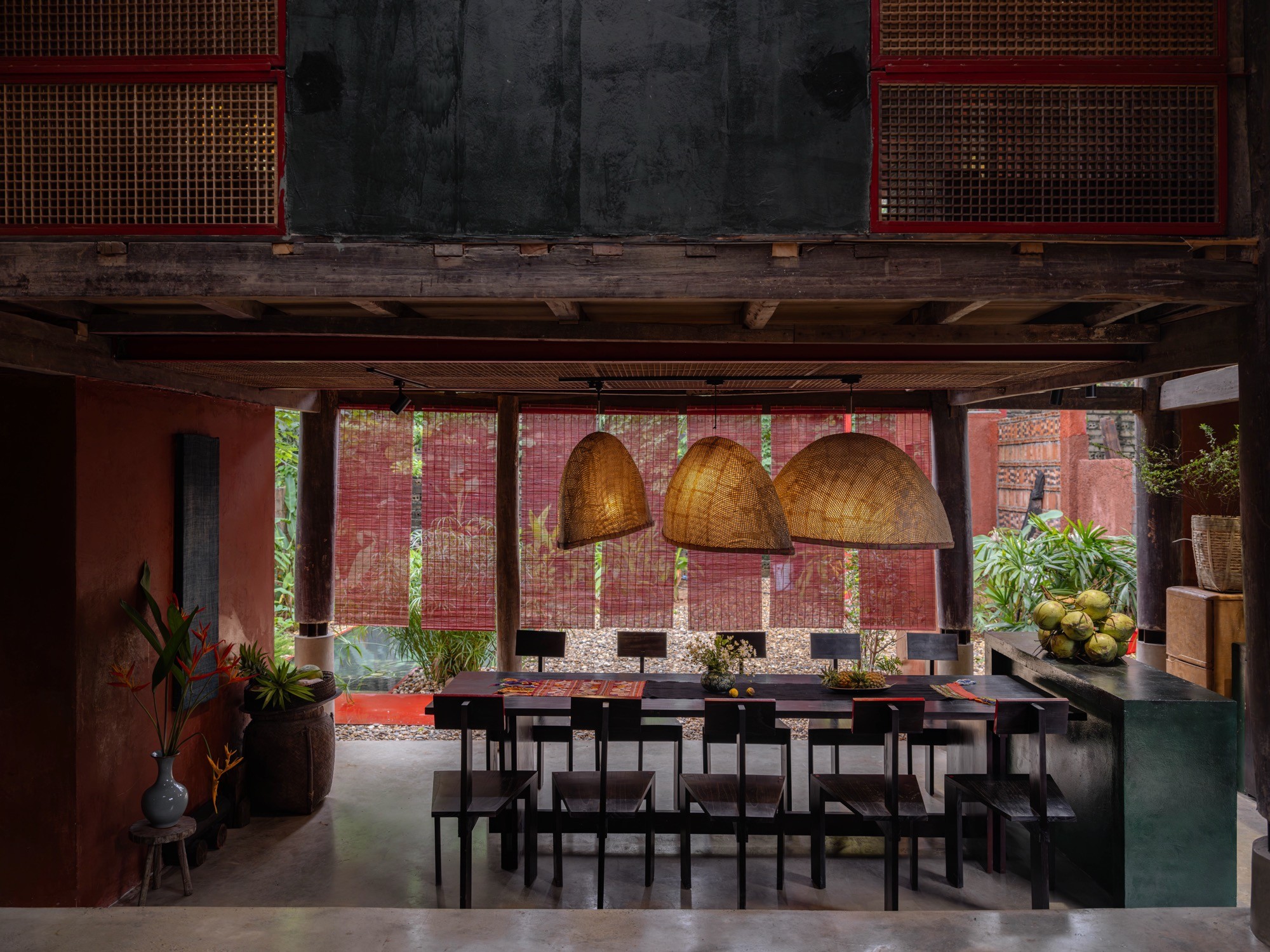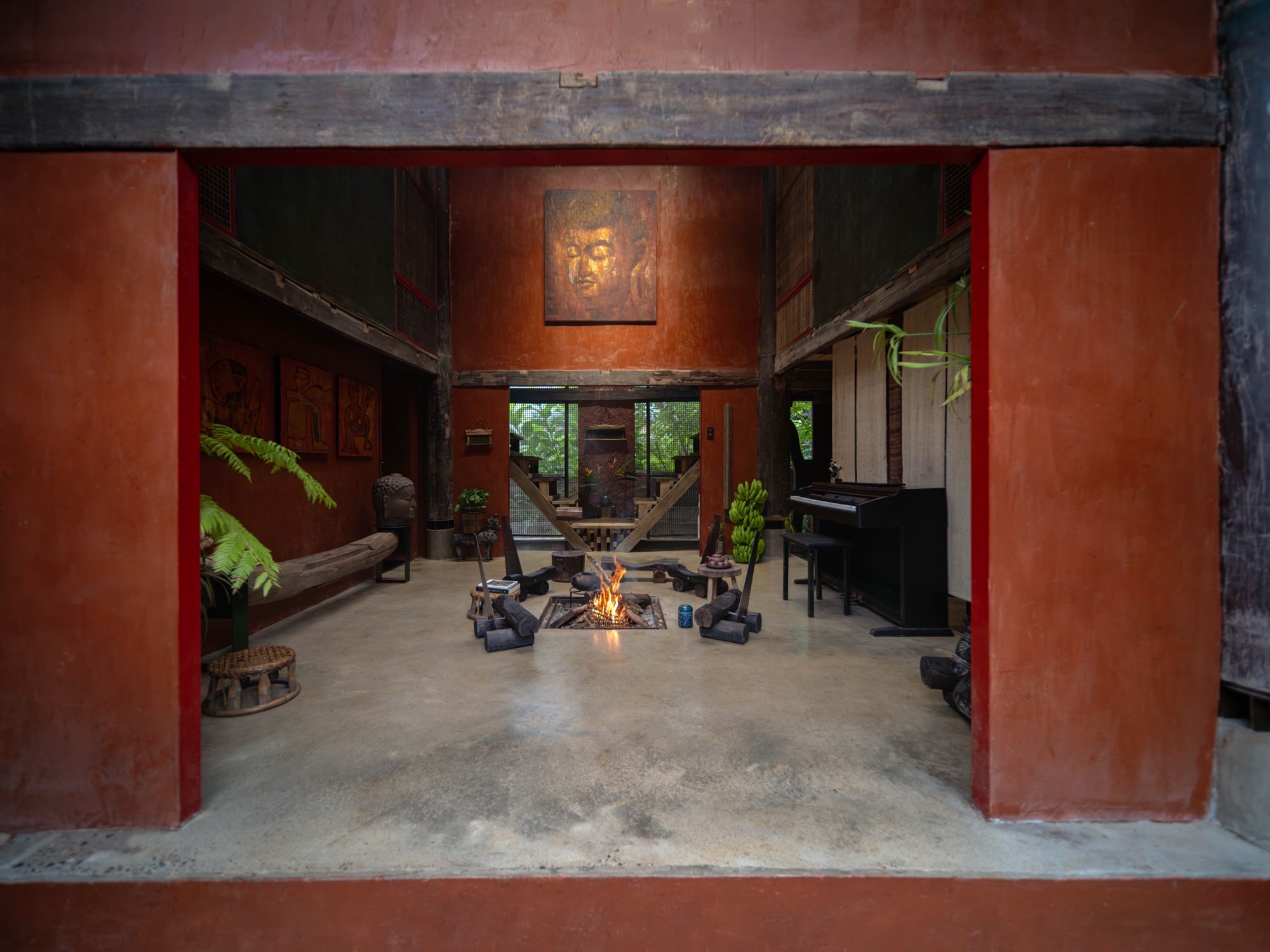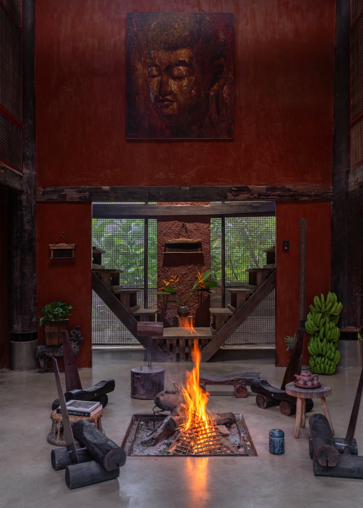 Không gian được tổ chức xoay quanh yếu tố “lửa” như một trục sinh hoạt và tinh thần, gợi lại cấu trúc cộng đồng của nhà ở truyền thống. Các yếu tố tự nhiên như nước, đất, gỗ và kim loại được điều tiết để tạo nên sự cân bằng cảm nhận về nhiệt độ, âm thanh và ánh sáng.