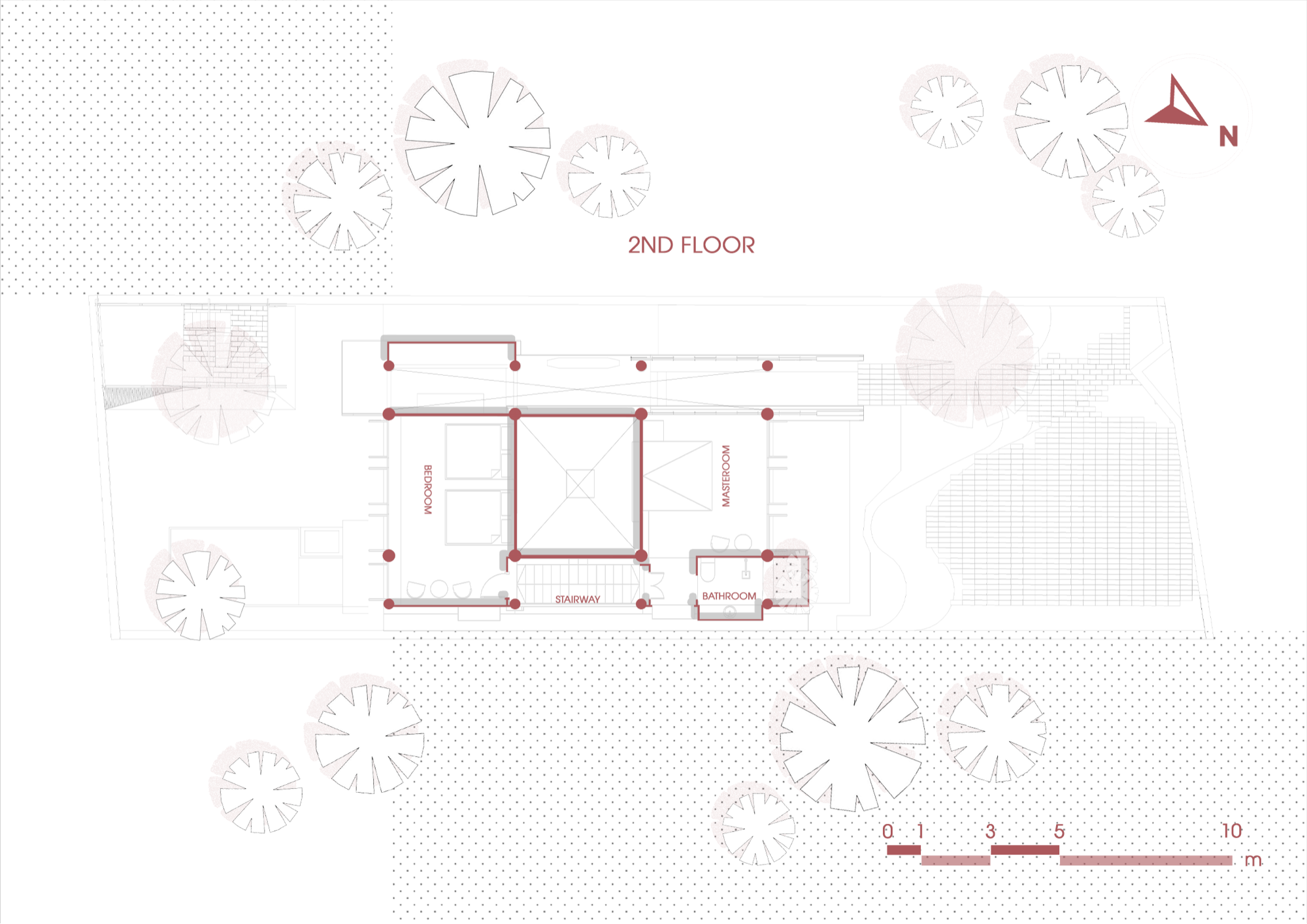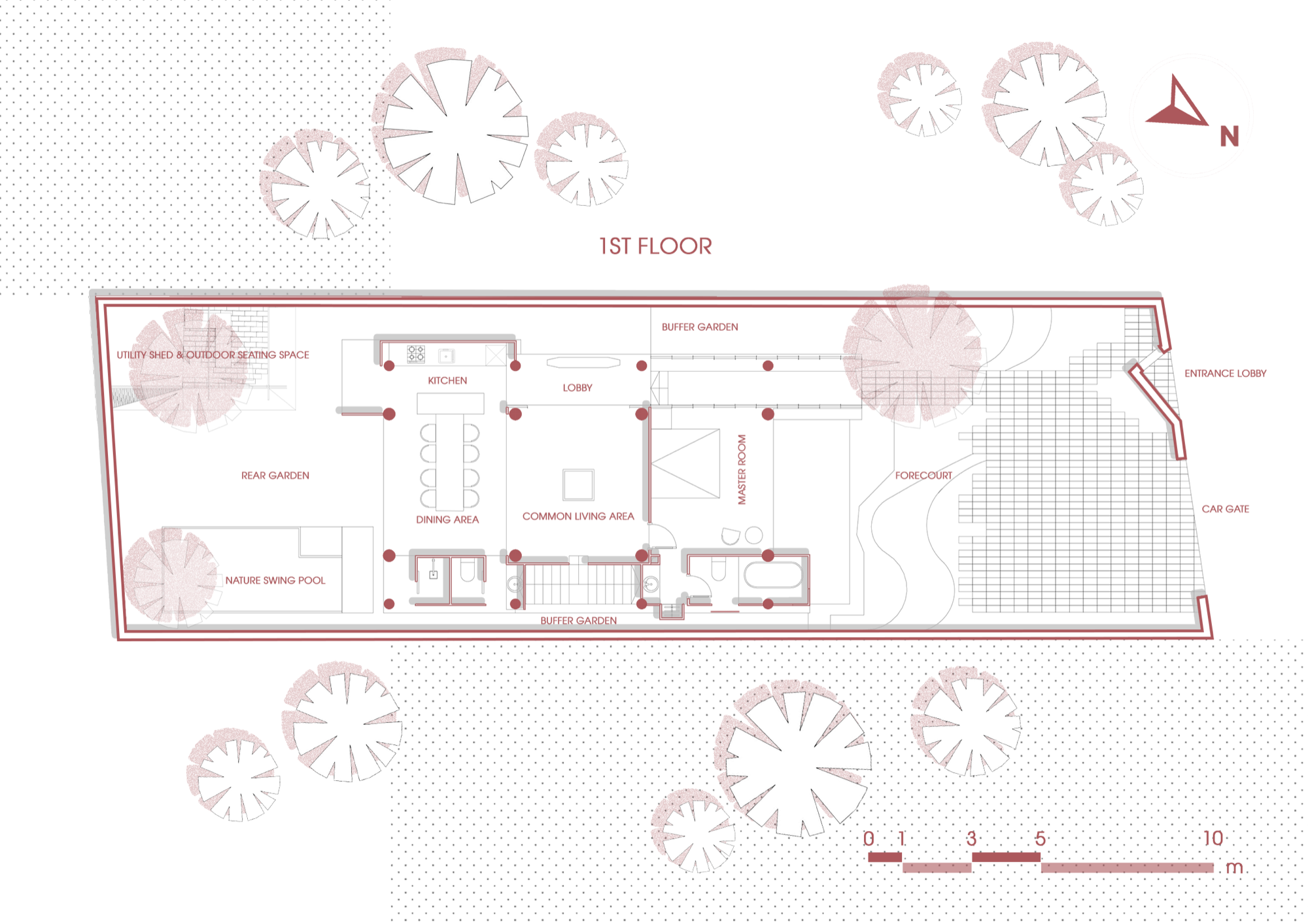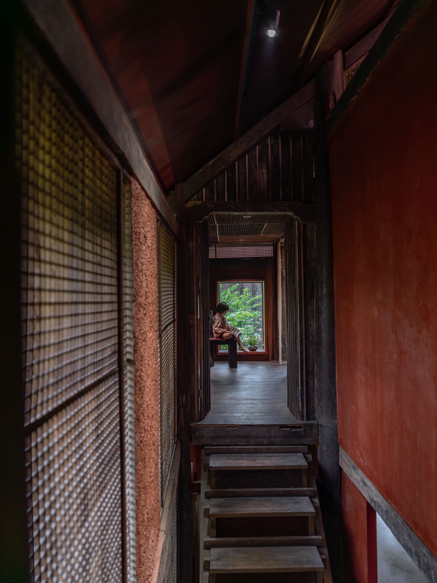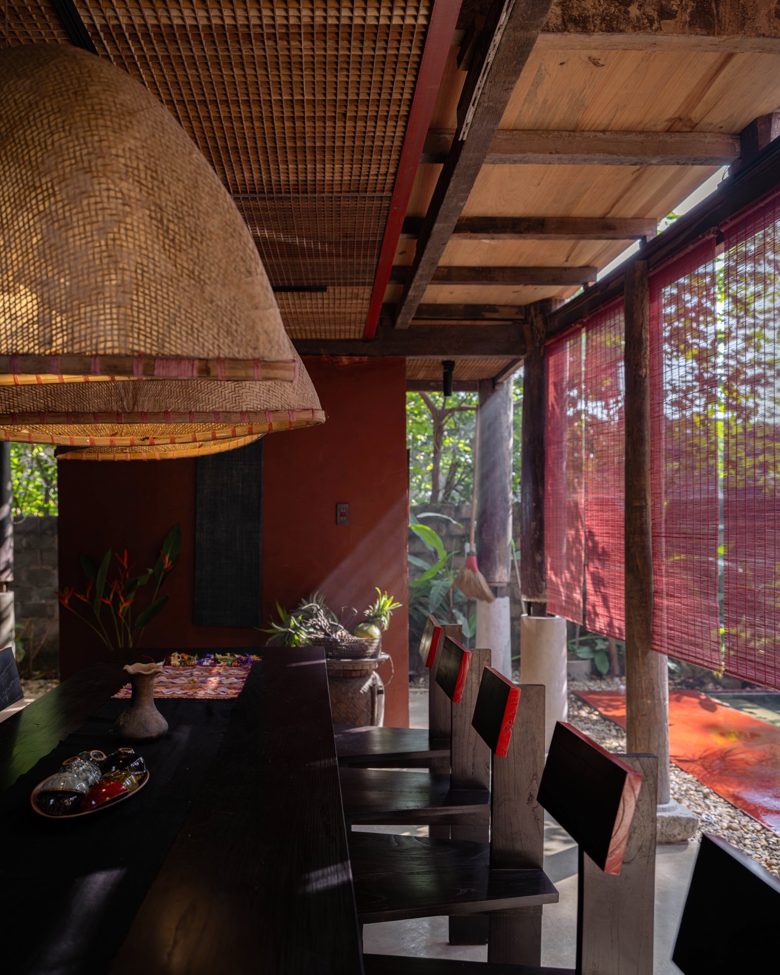 Không gian được tổ chức xoay quanh yếu tố “lửa” như một trục sinh hoạt và tinh thần, gợi lại cấu trúc cộng đồng của nhà ở truyền thống. Các yếu tố tự nhiên như nước, đất, gỗ và kim loại được điều tiết để tạo nên sự cân bằng cảm nhận về nhiệt độ, âm thanh và ánh sáng.