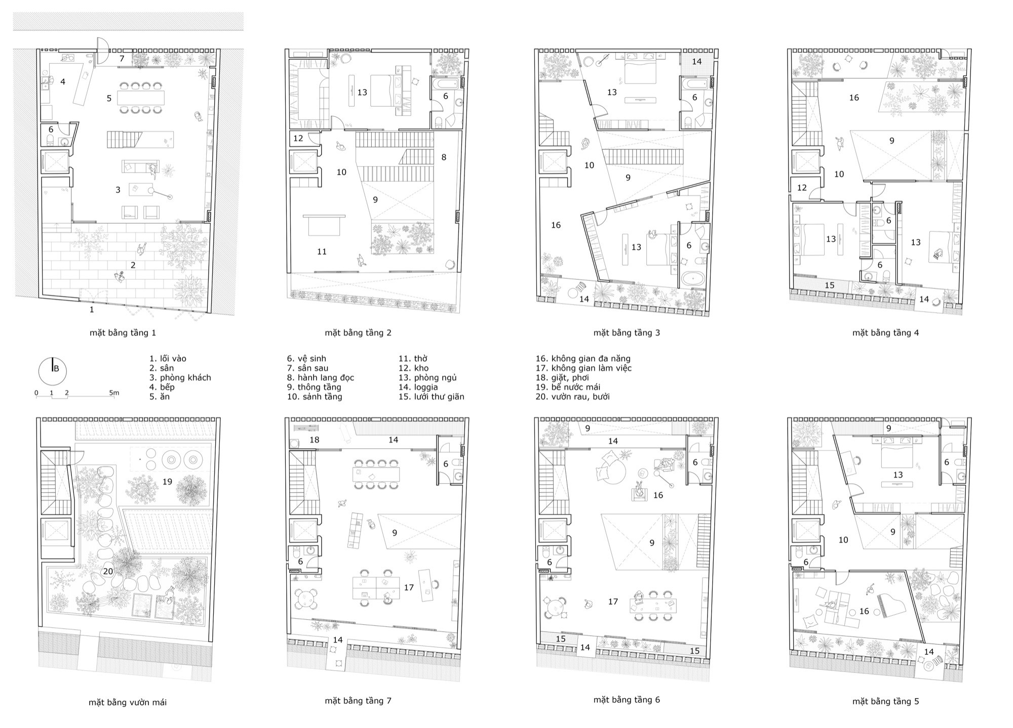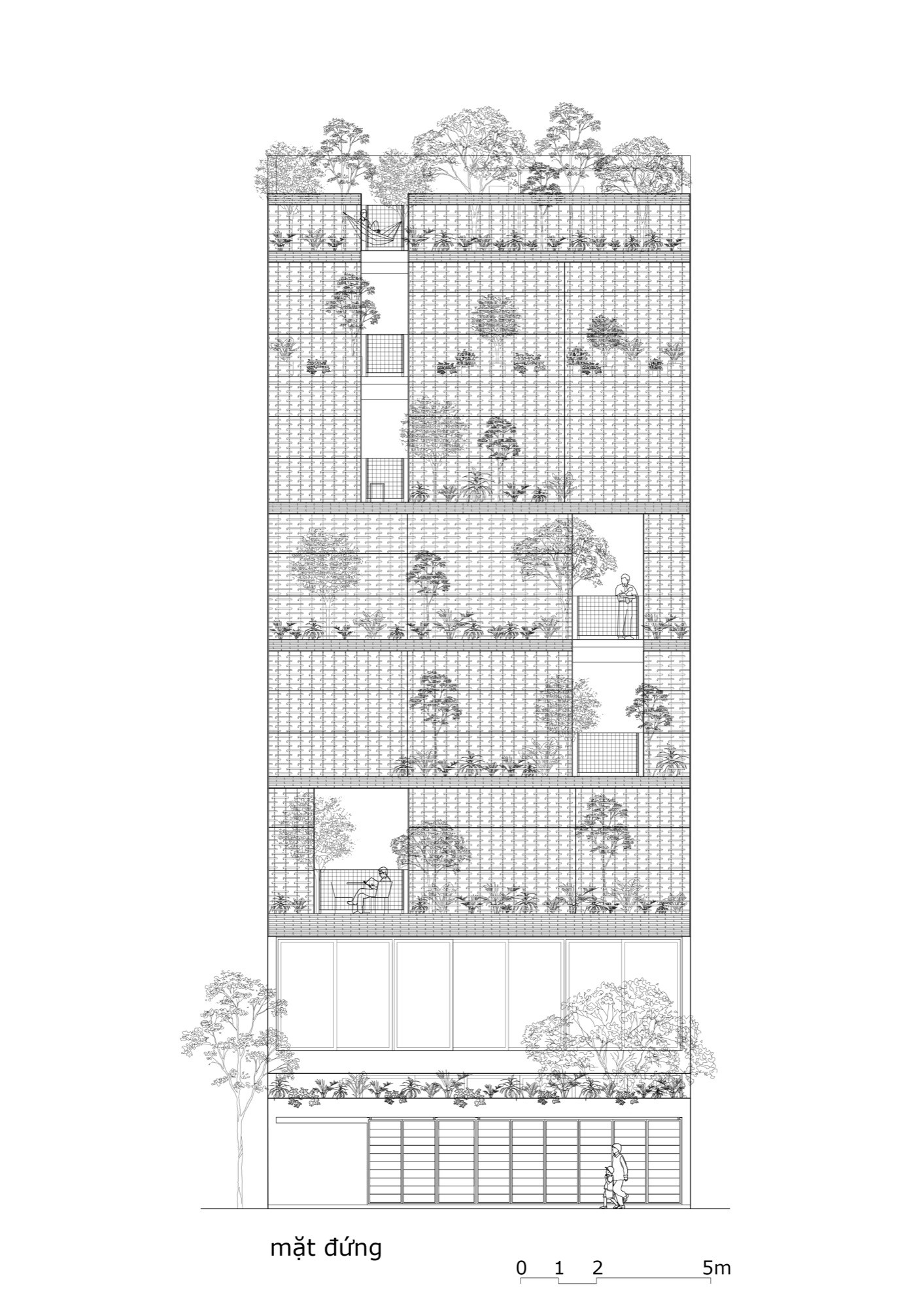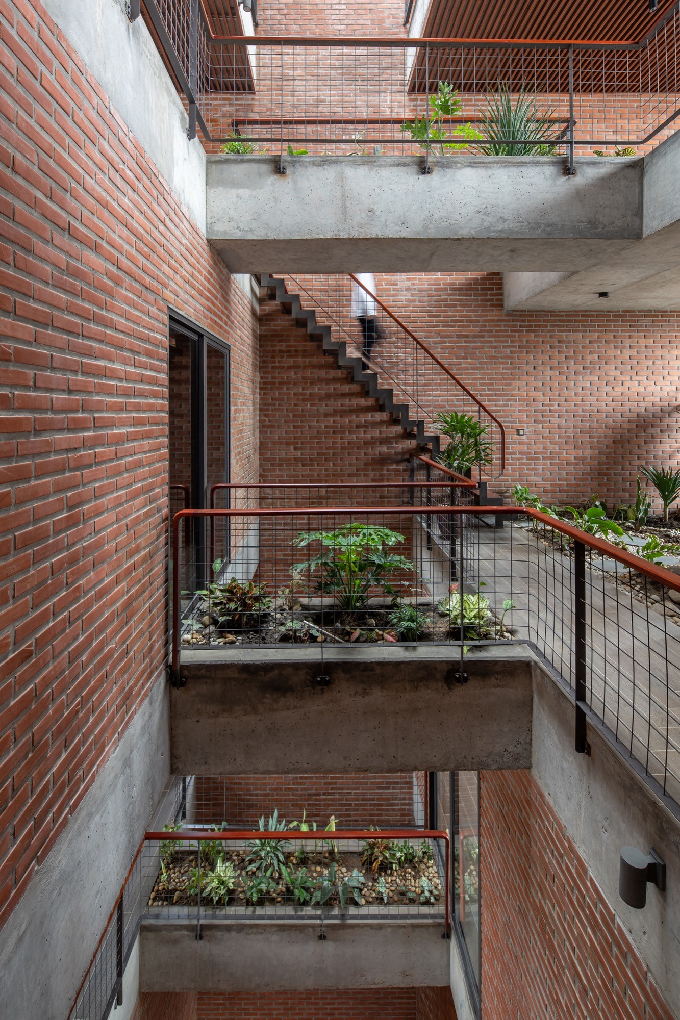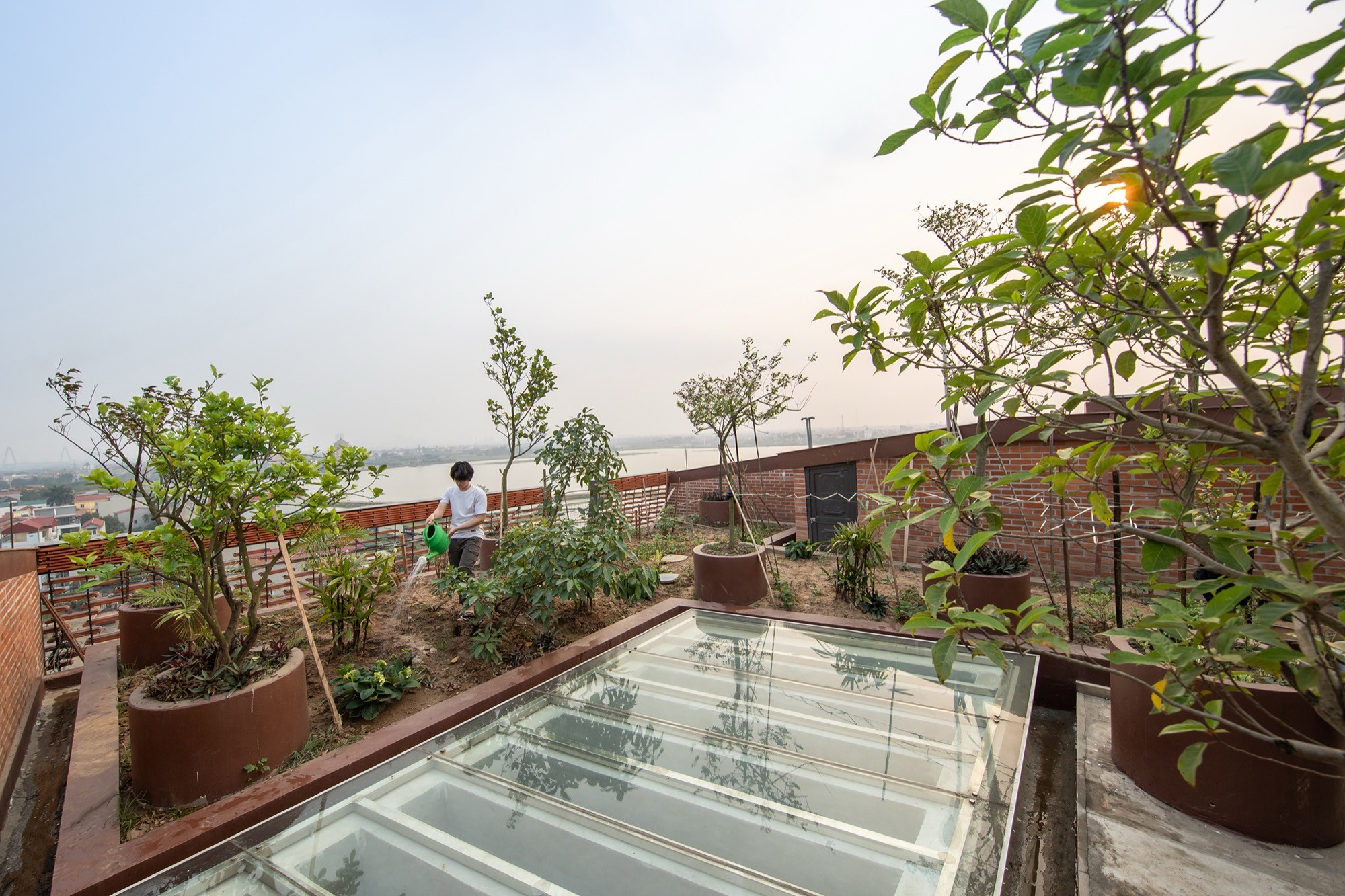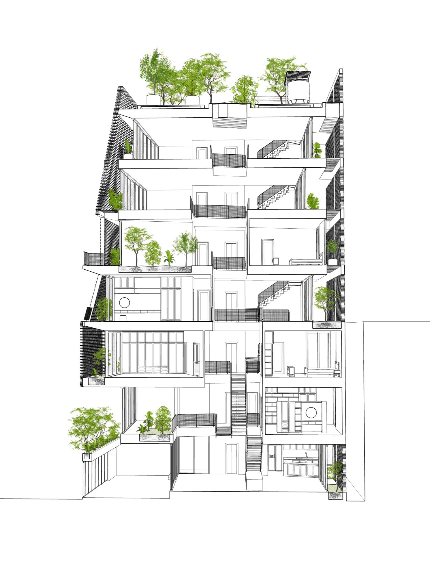 Cây xanh được đưa vào từng tầng và trên mái, không tách biệt mà gắn trực tiếp với không gian ở. Sự hiện diện của đất, nước và bóng râm giúp điều hòa nhiệt độ, đồng thời làm mềm các bề mặt kiến trúc. Ngôi nhà vì thế không hoạt động như một khối độc lập, mà như một hệ mở, nơi vật liệu, không gian và khí hậu cùng tham gia định hình trải nghiệm sống.