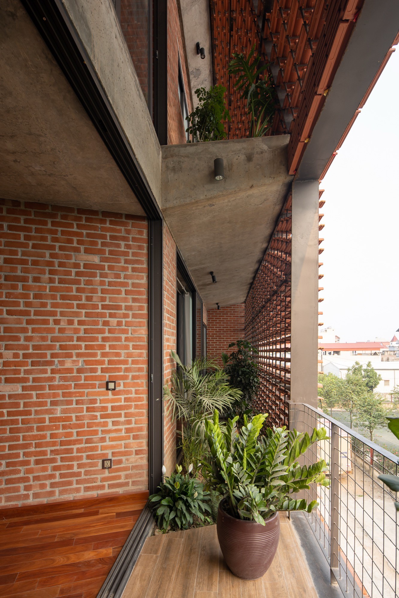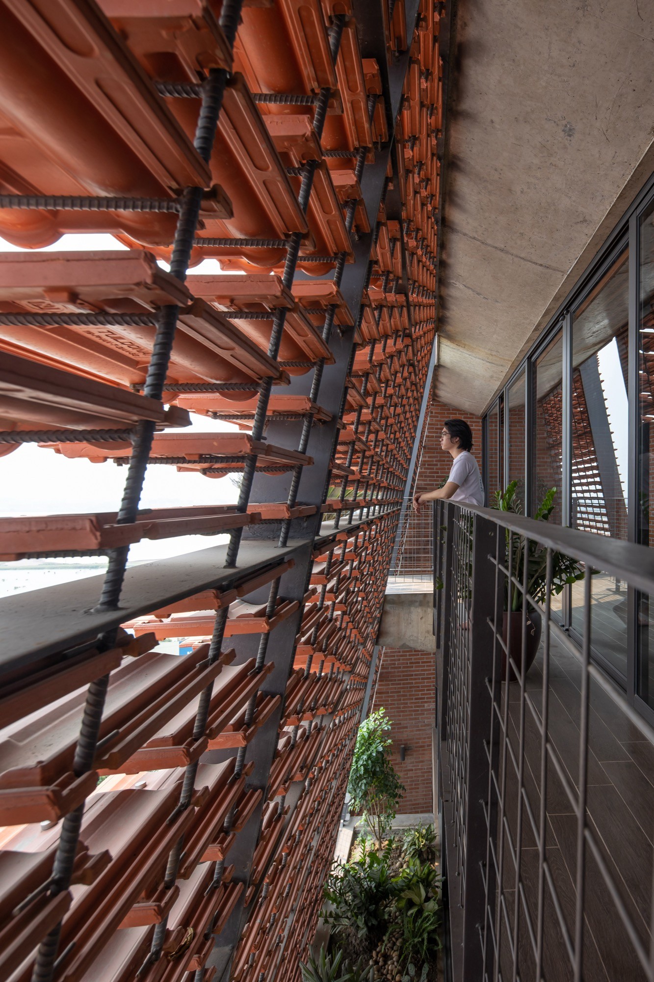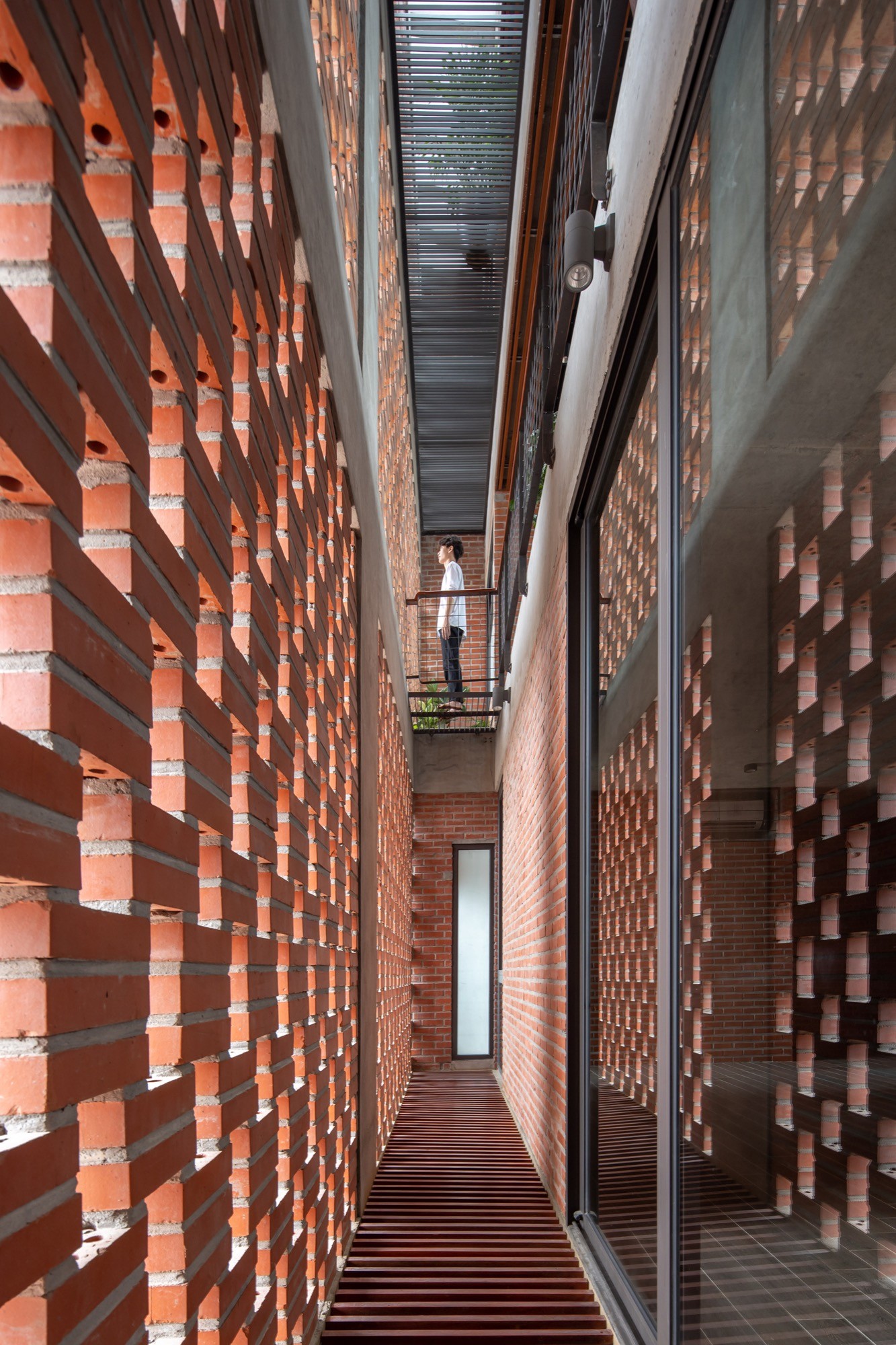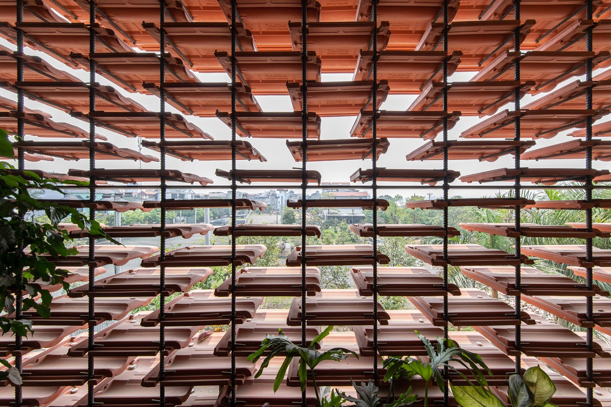 Vật liệu được sử dụng tiết chế nhưng có chủ đích. Lớp vỏ gạch đục lỗ phía ngoài hoạt động như một “màng lọc” thụ động, giảm bức xạ trực tiếp nhưng vẫn giữ được độ thông thoáng. Phía trước, lớp ngói treo tạo thêm một lớp đệm không khí, hạn chế tích nhiệt và tạo bóng đổ biến đổi theo thời gian. Hai lớp vật liệu này không chỉ mang lại hiệu quả vi khí hậu mà còn tái hiện một cách kín đáo ký ức về tường gạch, mái ngói quen thuộc.