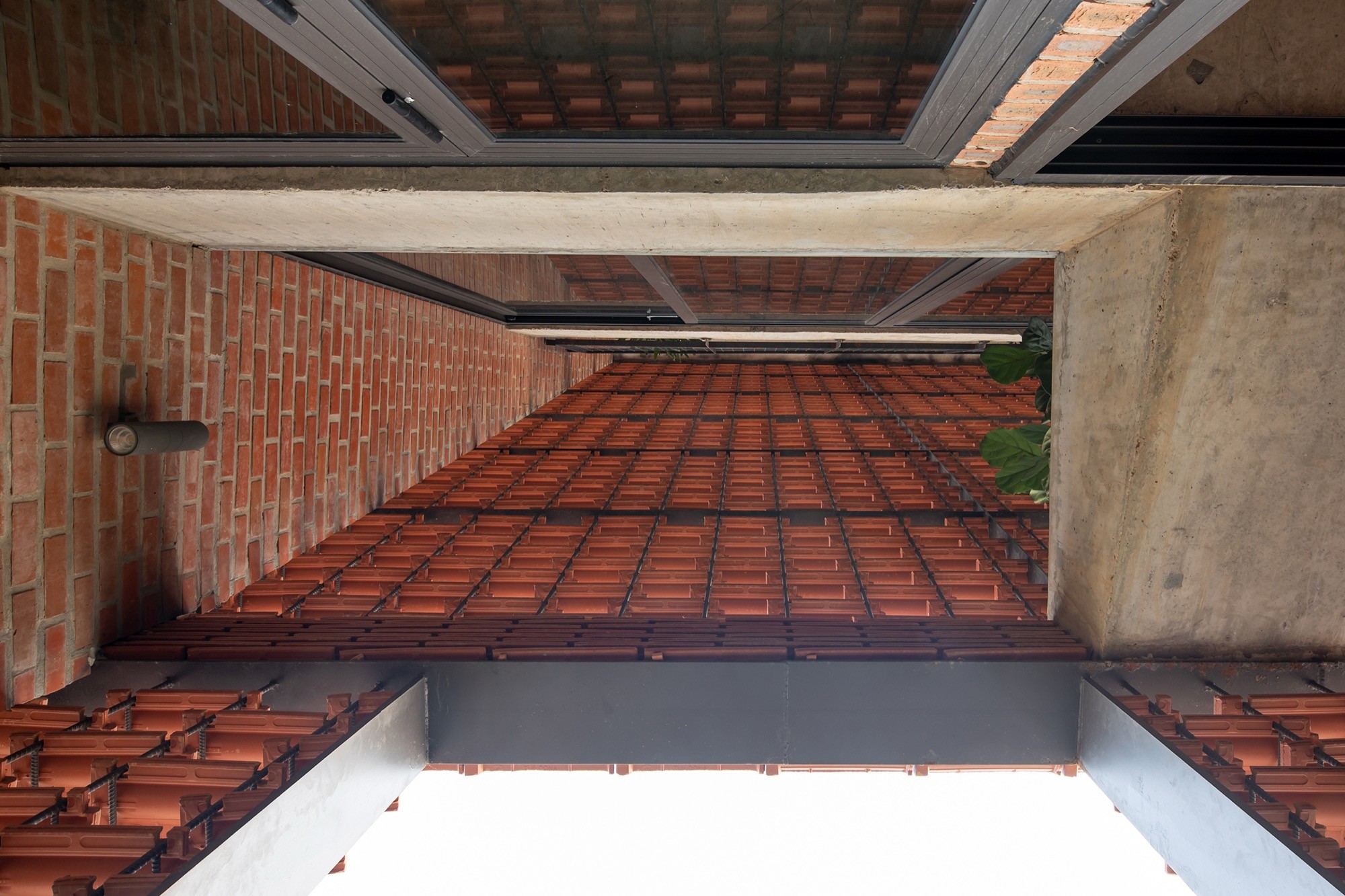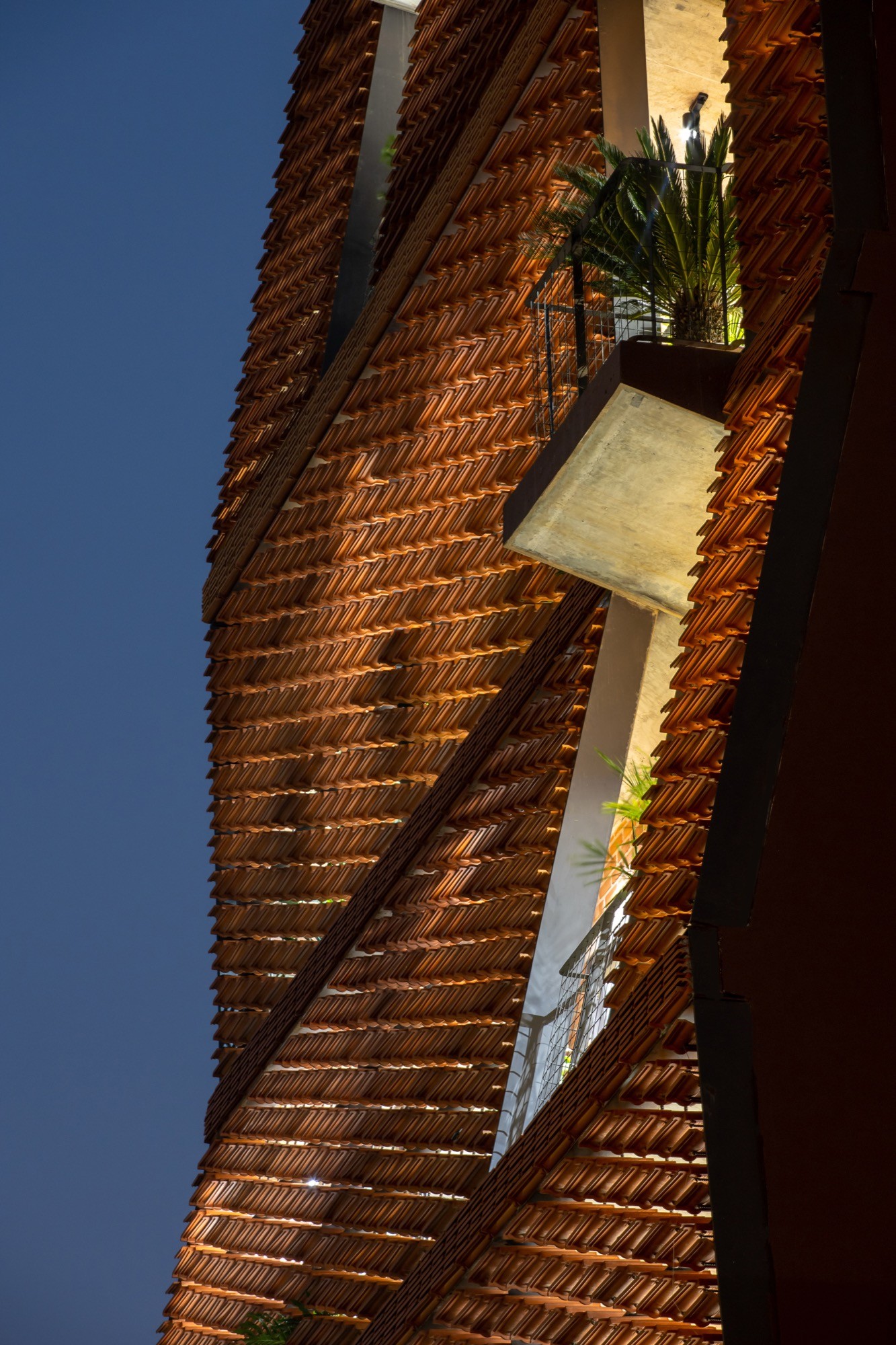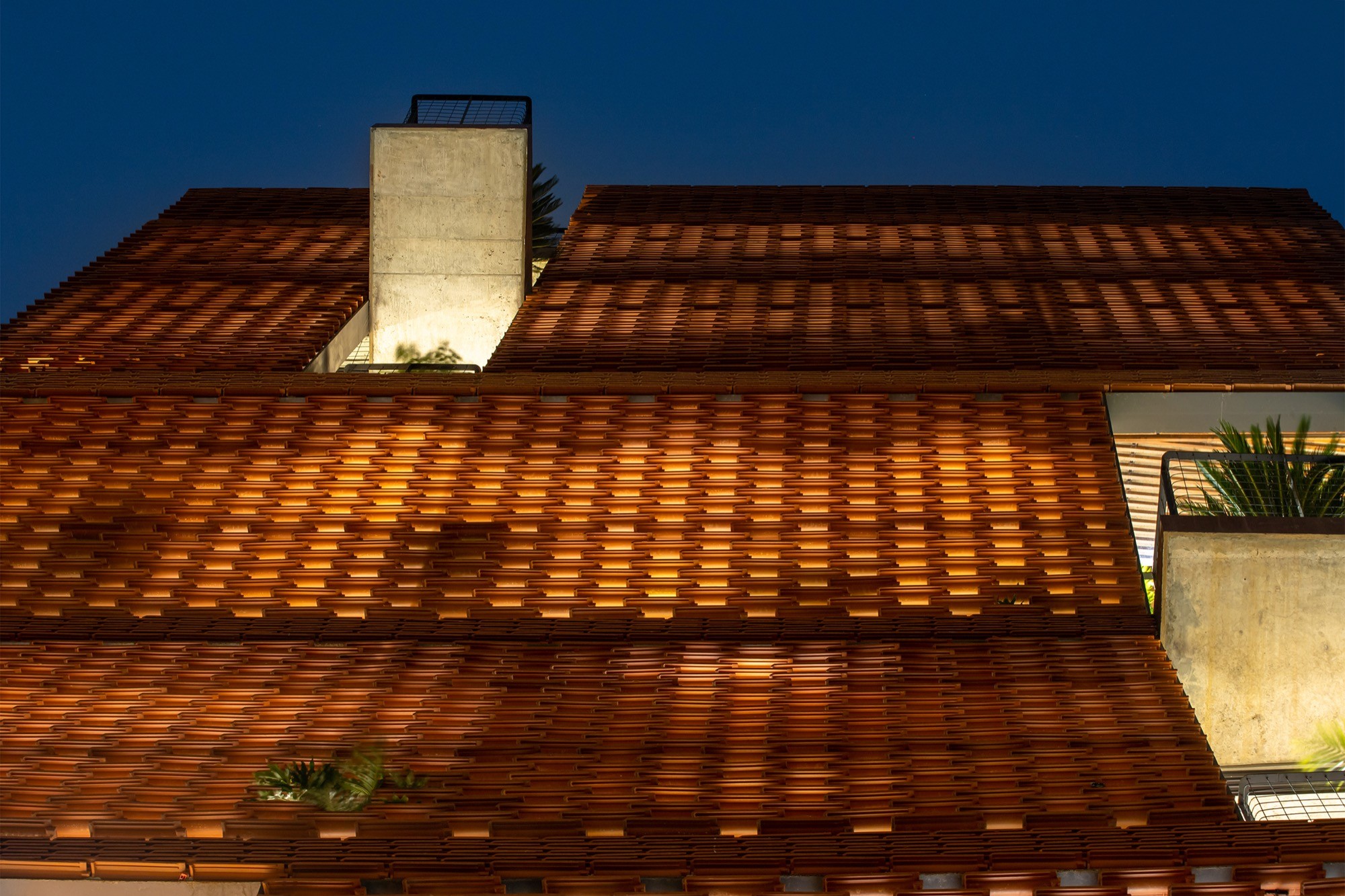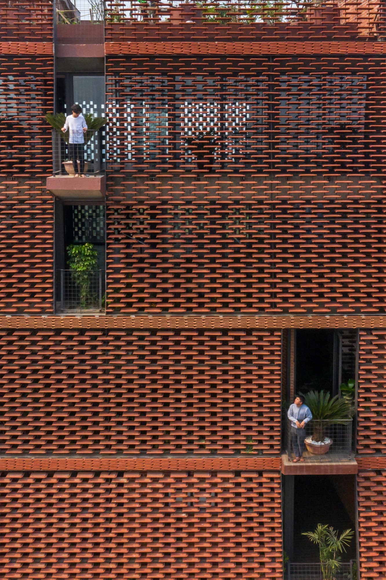 Vật liệu được sử dụng tiết chế nhưng có chủ đích. Lớp vỏ gạch đục lỗ phía ngoài hoạt động như một “màng lọc” thụ động, giảm bức xạ trực tiếp nhưng vẫn giữ được độ thông thoáng. Phía trước, lớp ngói treo tạo thêm một lớp đệm không khí, hạn chế tích nhiệt và tạo bóng đổ biến đổi theo thời gian. Hai lớp vật liệu này không chỉ mang lại hiệu quả vi khí hậu mà còn tái hiện một cách kín đáo ký ức về tường gạch, mái ngói quen thuộc.