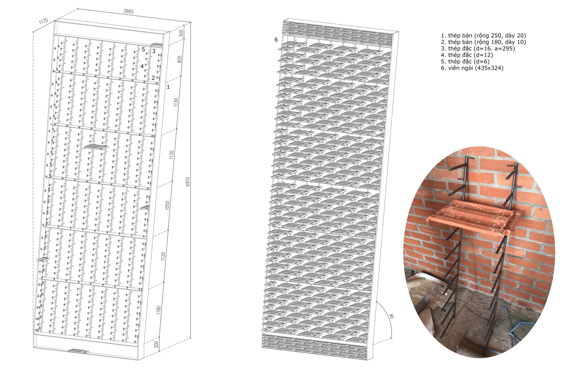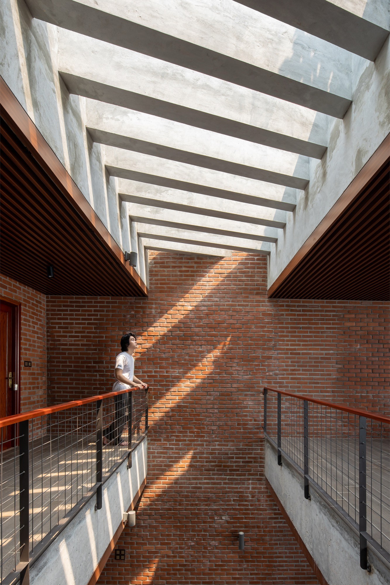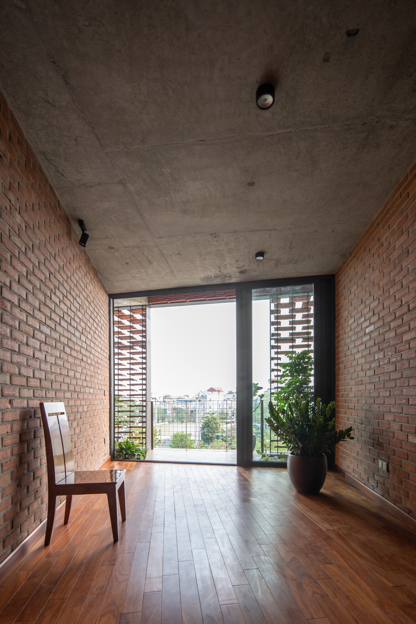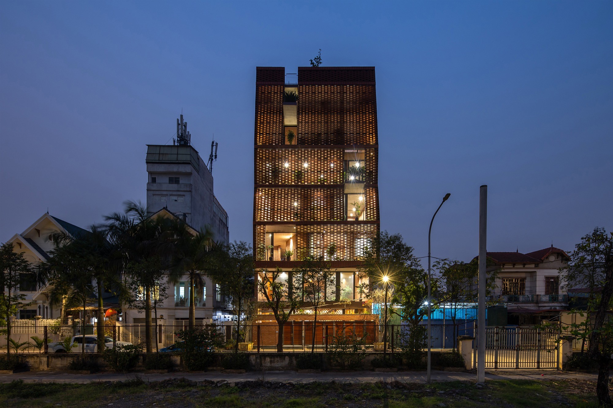 Vật liệu được sử dụng tiết chế nhưng có chủ đích. Lớp vỏ gạch đục lỗ phía ngoài hoạt động như một “màng lọc” thụ động, giảm bức xạ trực tiếp nhưng vẫn giữ được độ thông thoáng. Phía trước, lớp ngói treo tạo thêm một lớp đệm không khí, hạn chế tích nhiệt và tạo bóng đổ biến đổi theo thời gian. Hai lớp vật liệu này không chỉ mang lại hiệu quả vi khí hậu mà còn tái hiện một cách kín đáo ký ức về tường gạch, mái ngói quen thuộc.