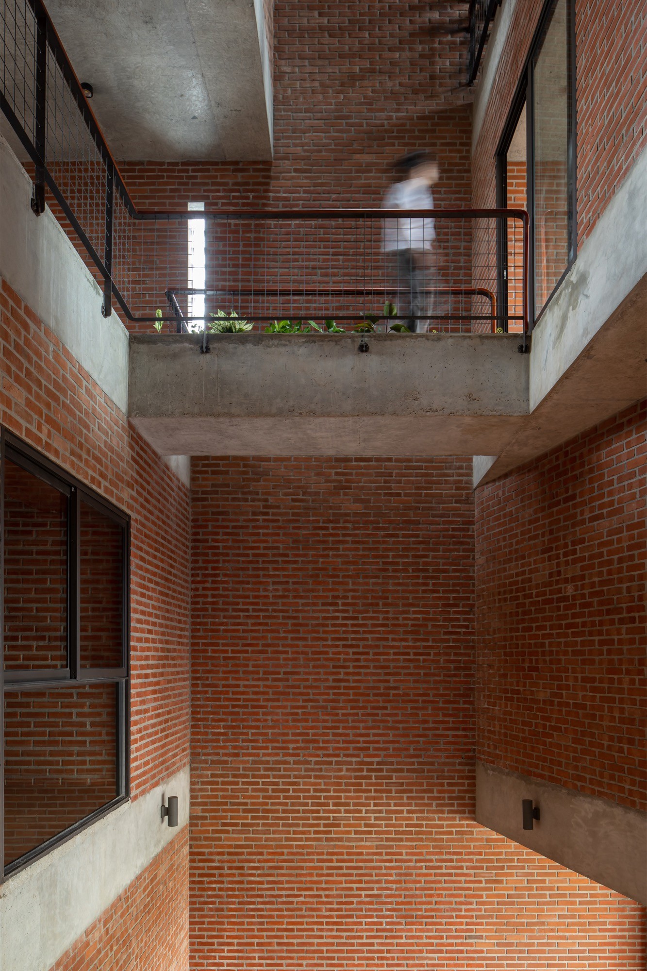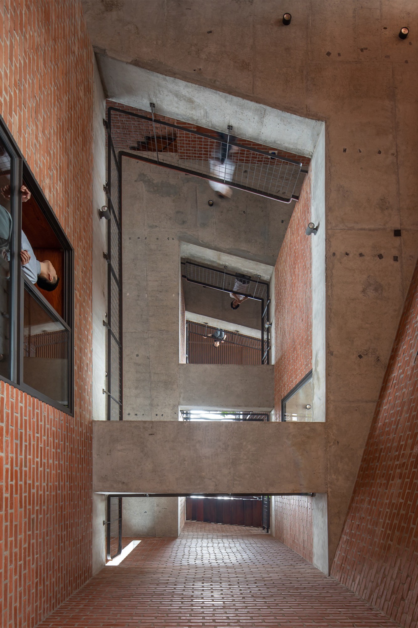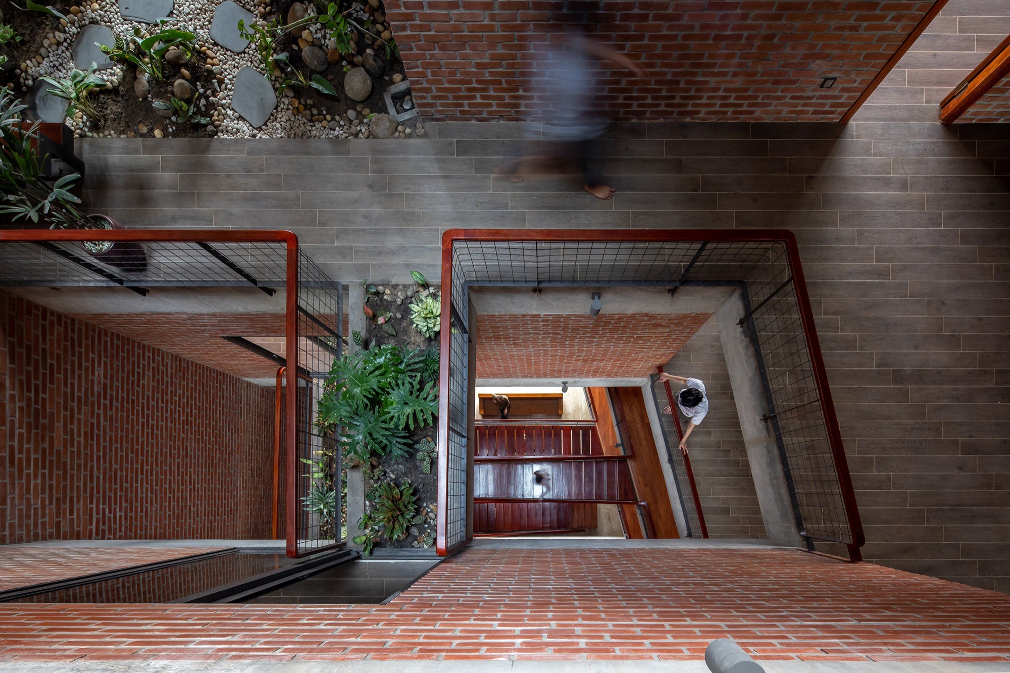 Ý tưởng “dòng chảy” không chỉ dừng ở hình ảnh mà chi phối cách sắp xếp không gian. Các tầng được xếp lệch, tạo nên những khoảng đệm liên tục giữa trong và ngoài. Cầu thang, hành lang và các sân tầng không tách rời mà nối tiếp nhau, giúp dòng di chuyển của con người, gió và ánh sáng diễn ra tự nhiên. Sự co giãn của các không gian ở tạo nên những góc nhìn thay đổi, đồng thời làm dịu cảm giác chiều sâu hẹp của nhà ống.