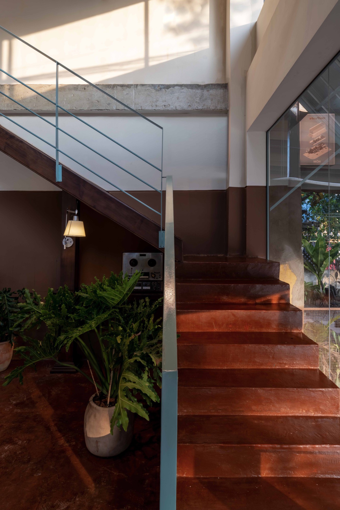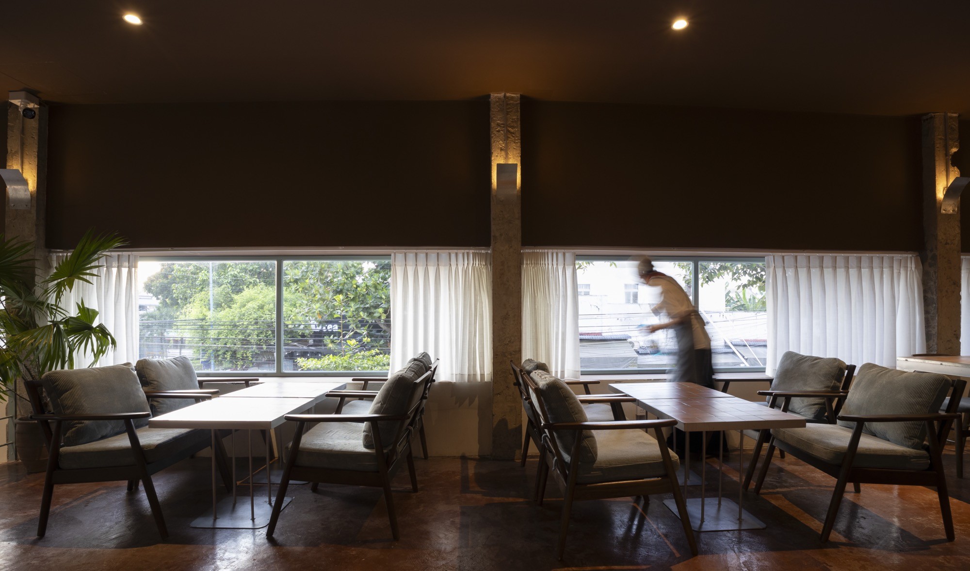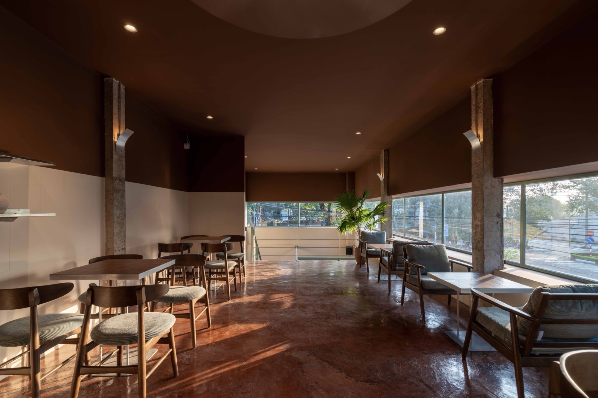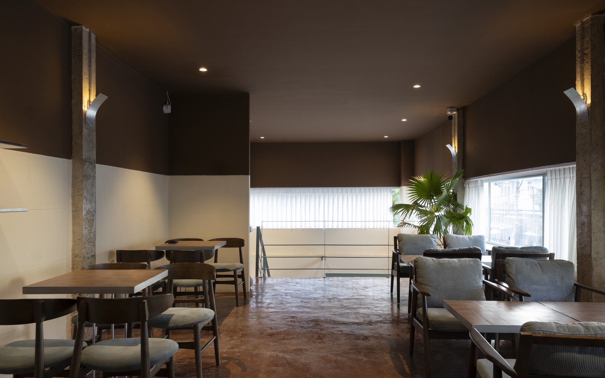 Bên trong, không gian được điều chỉnh bằng ánh sáng và vật liệu. Bê tông cũ kết hợp với gỗ, vải và cây xanh tạo nên một bảng vật liệu ấm, giúp giảm độ cứng của lớp vỏ bên ngoài. Các không gian không tách rời mà liên tục chuyển tiếp, hình thành một chiều sâu trải nghiệm từ ngoài vào trong.