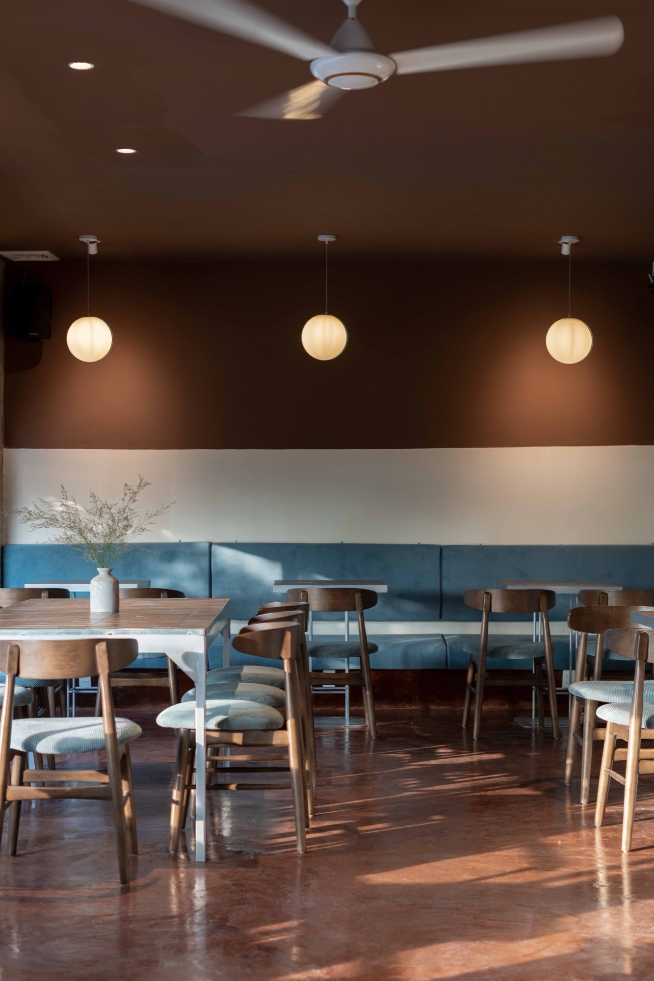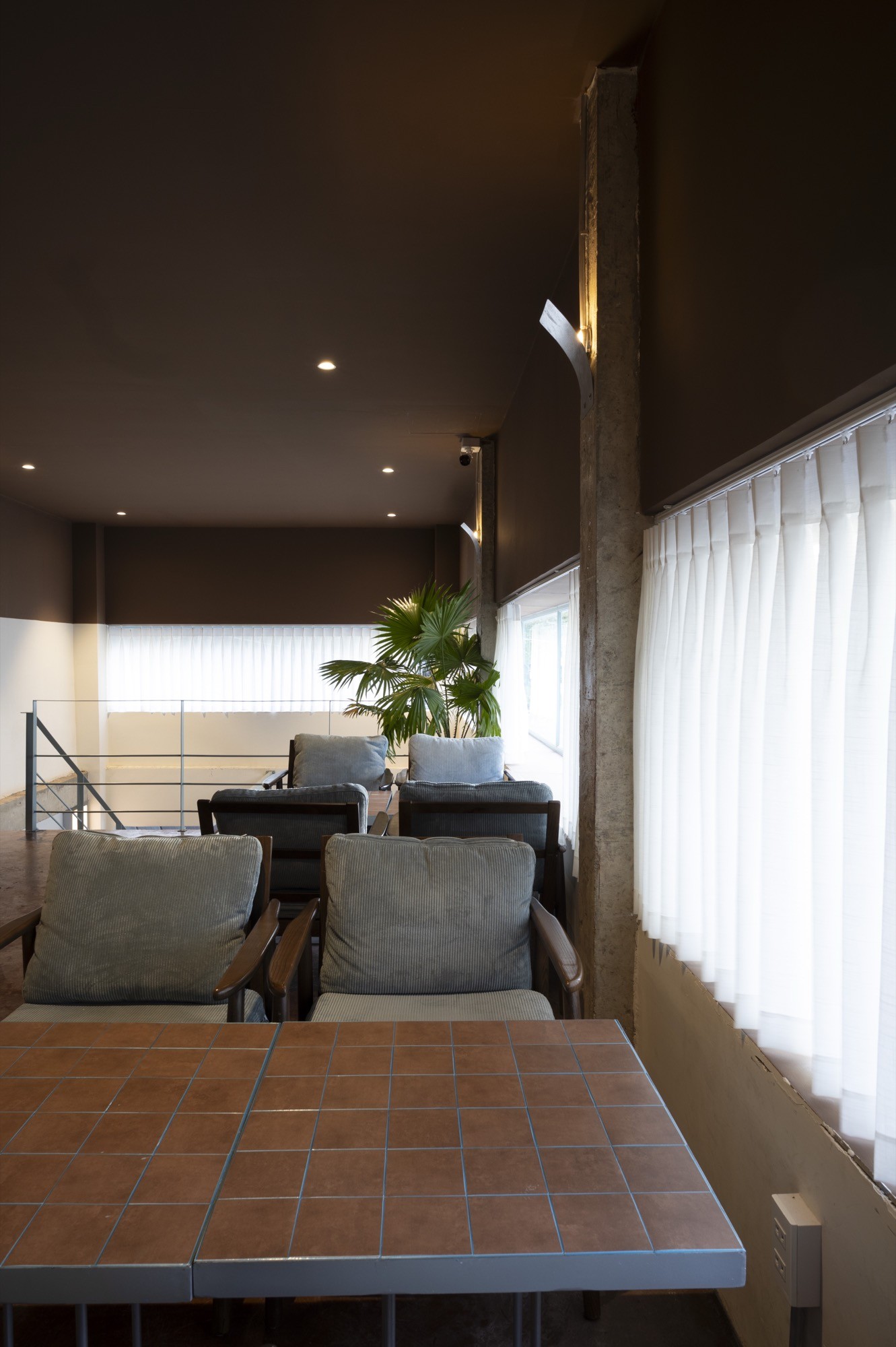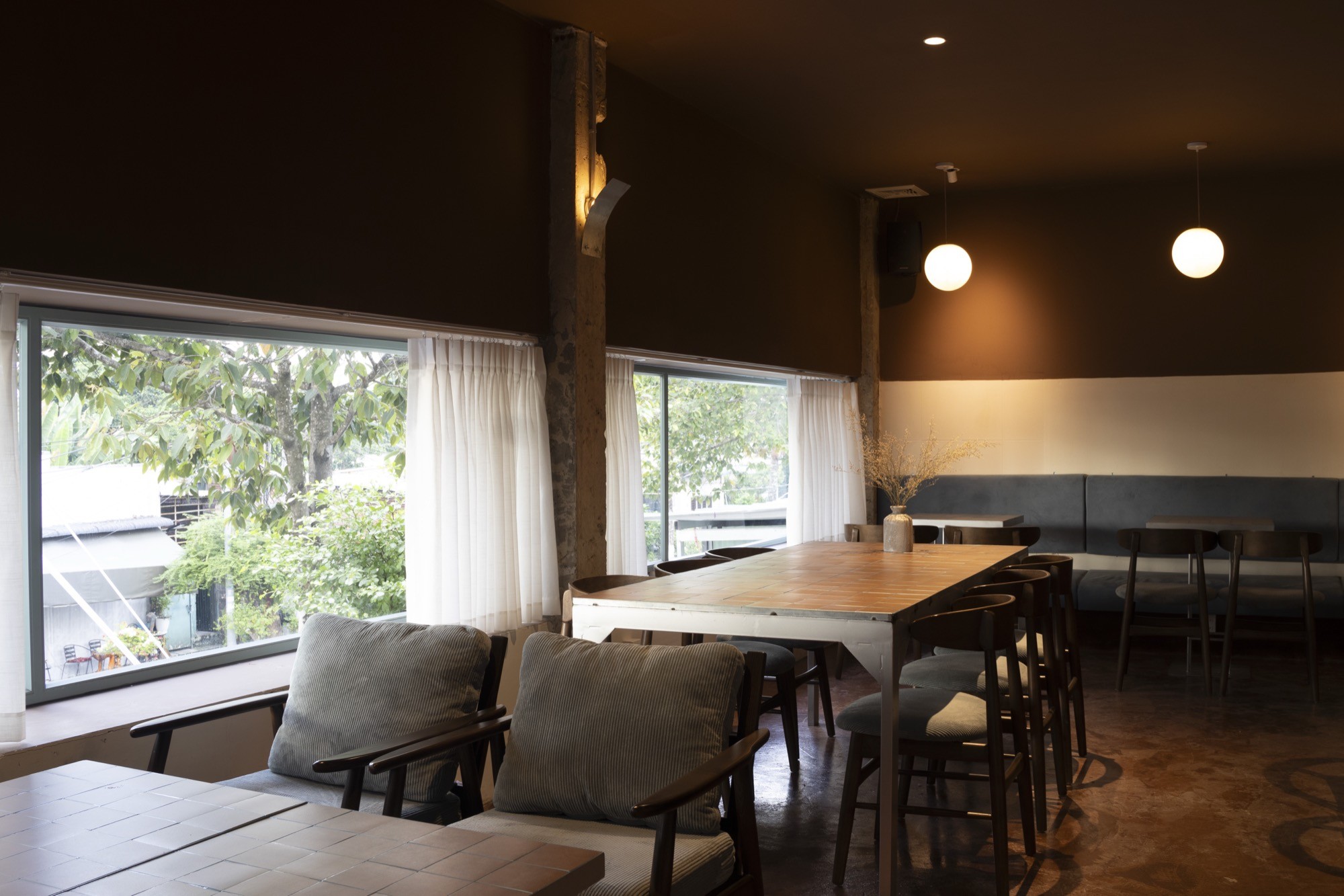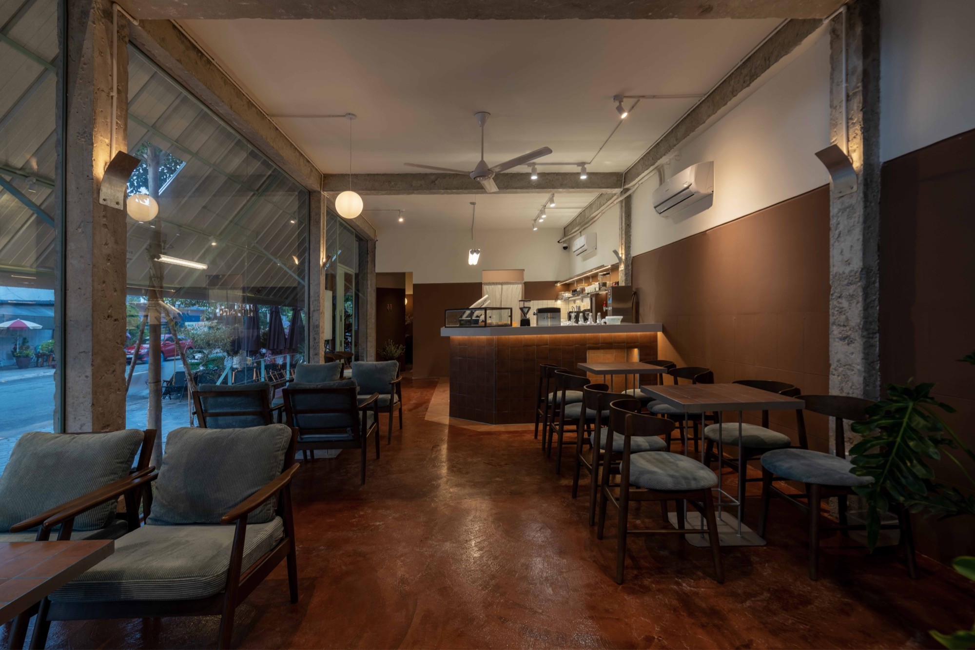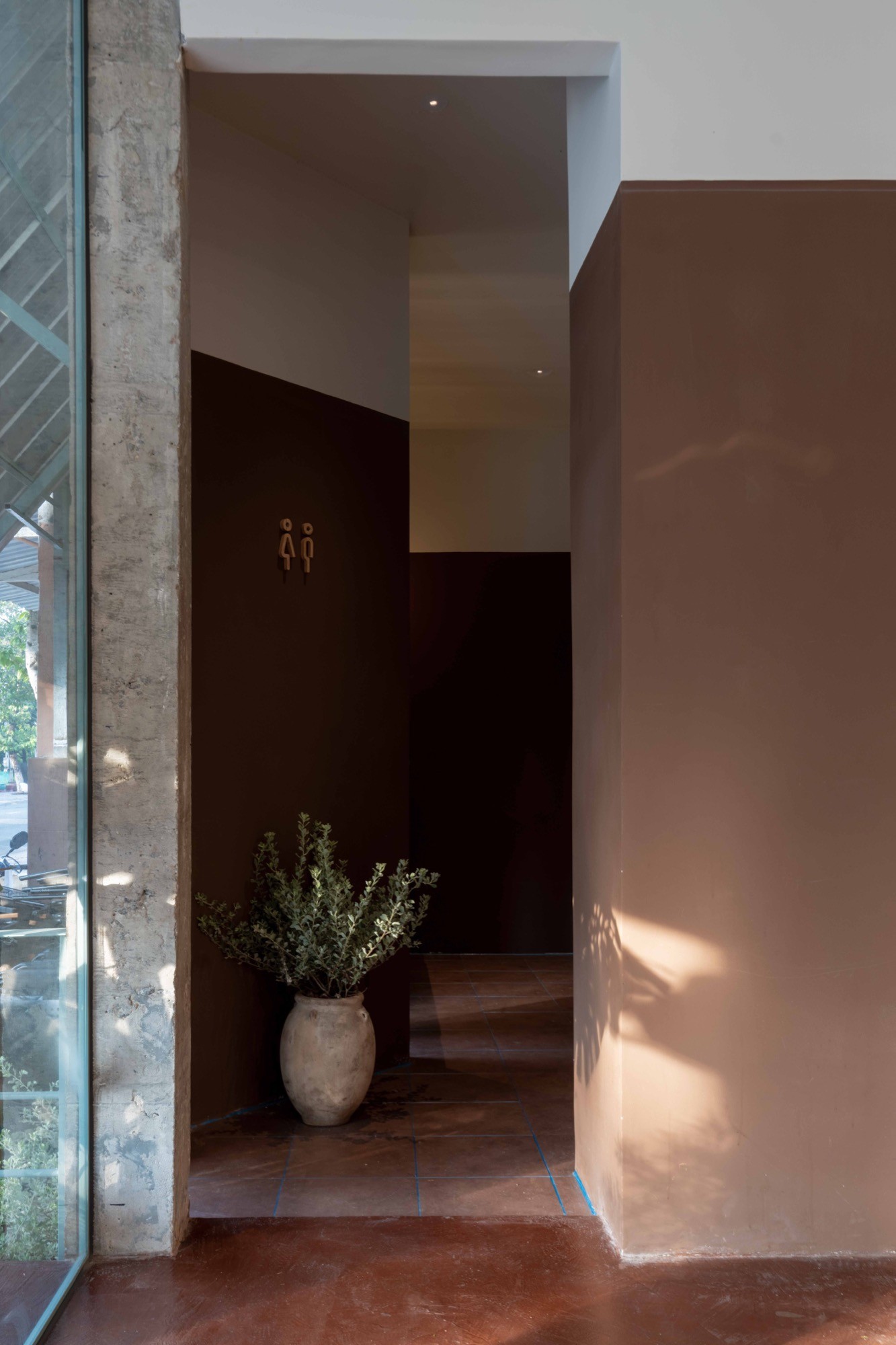 Bên trong, không gian được điều chỉnh bằng ánh sáng và vật liệu. Bê tông cũ kết hợp với gỗ, vải và cây xanh tạo nên một bảng vật liệu ấm, giúp giảm độ cứng của lớp vỏ bên ngoài. Các không gian không tách rời mà liên tục chuyển tiếp, hình thành một chiều sâu trải nghiệm từ ngoài vào trong.