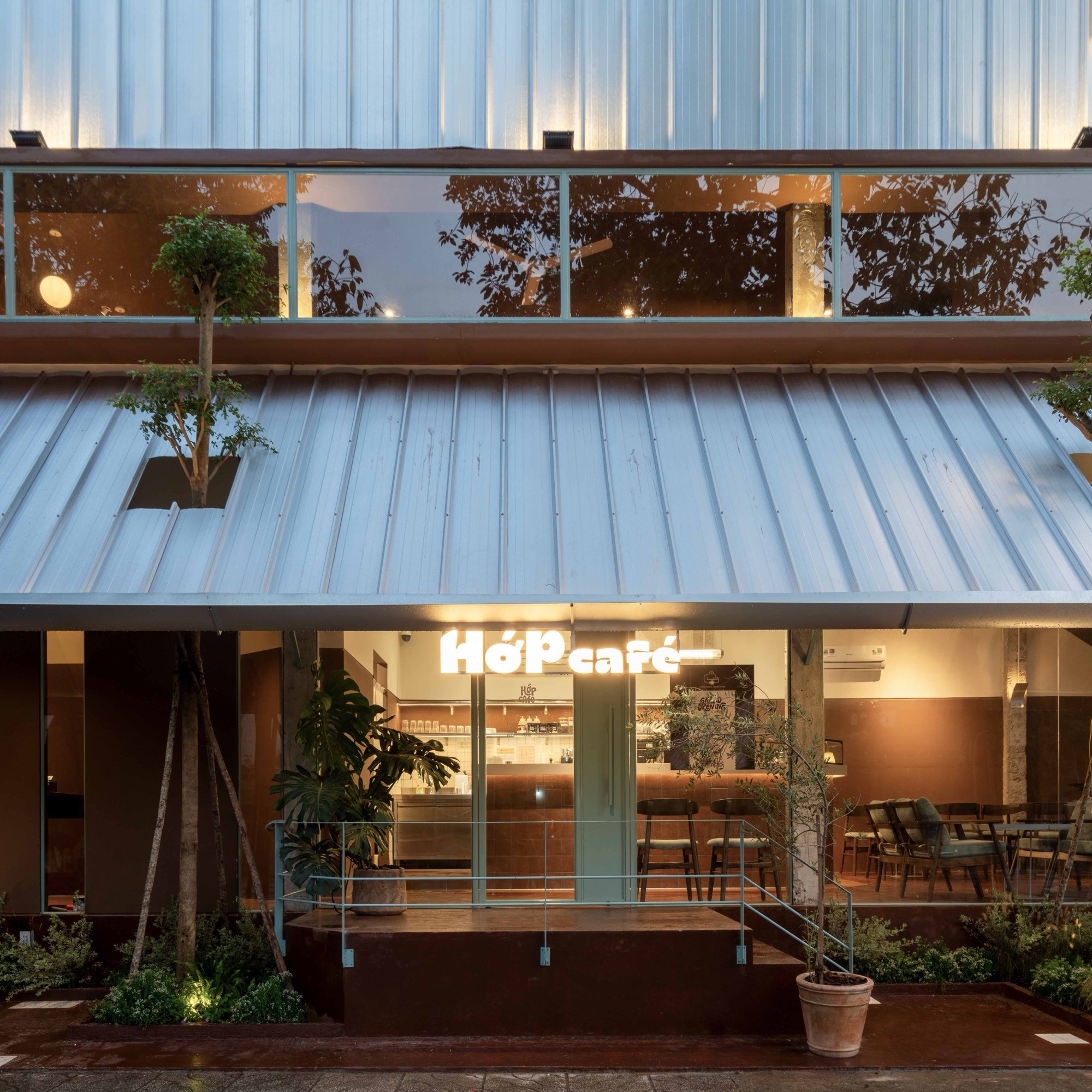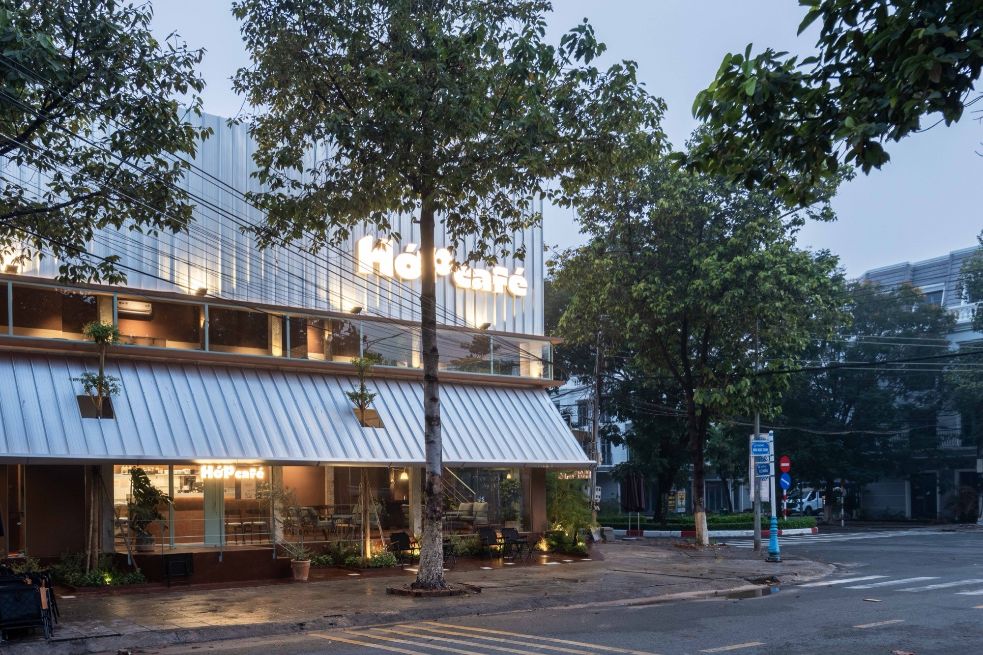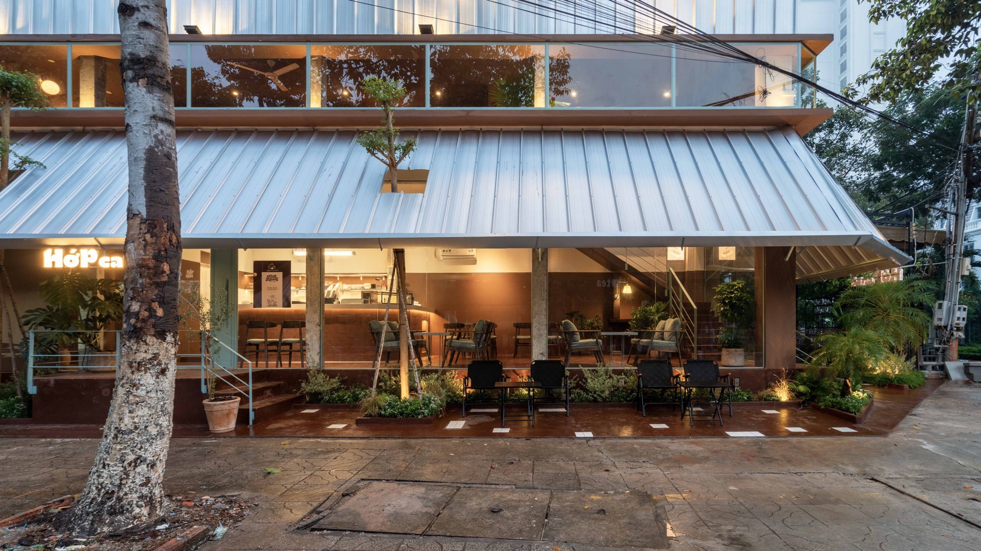 Nằm tại một góc giao lộ nhiều chuyển động của Tây Ninh, HỚP Cafe được tổ chức như một chuỗi không gian chuyển tiếp, dẫn dắt từ trạng thái ồn ào của đô thị vào một môi trường tĩnh hơn bên trong. Thay vì xoá bỏ bối cảnh sẵn có, công trình giữ lại các yếu tố thô như tường, cột bê tông và lớp tole, tạo nên một lớp vỏ mang tính công nghiệp, rõ ràng và có khoảng cách với đường phố.
