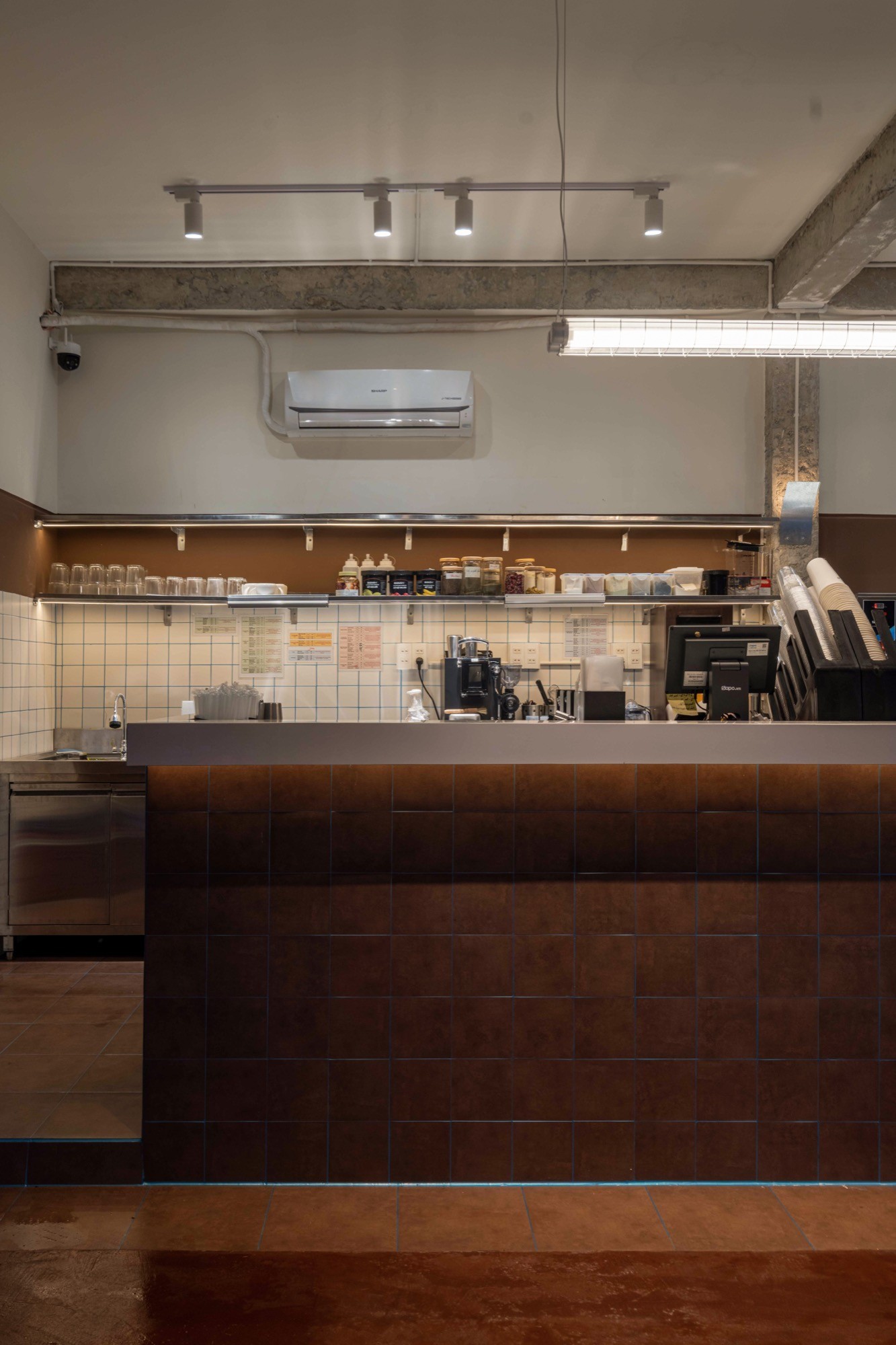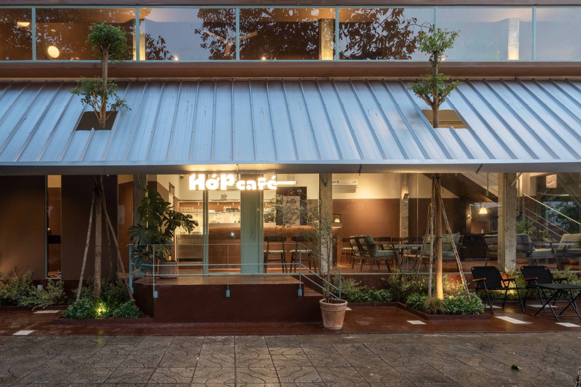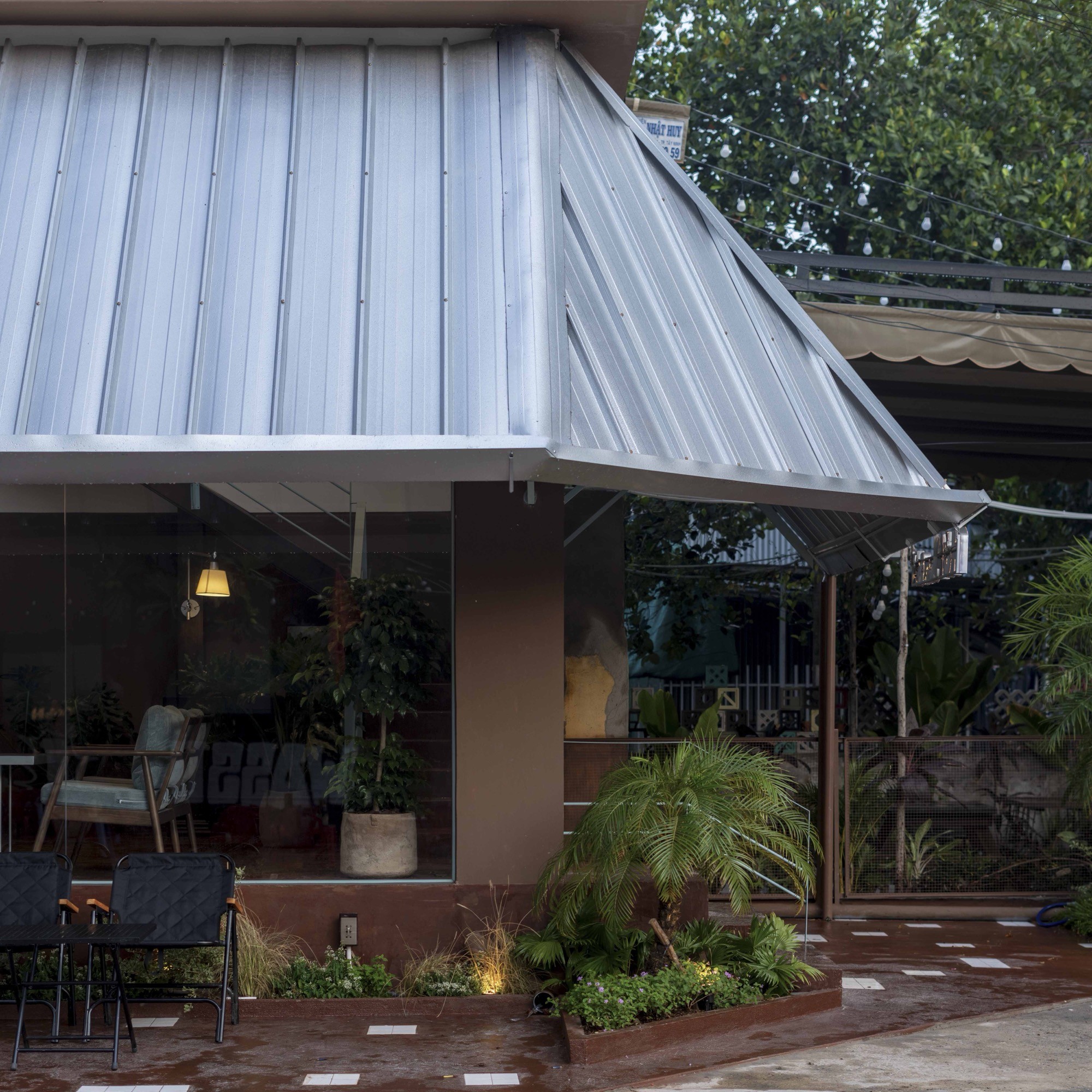 Nằm tại một góc giao lộ nhiều chuyển động của Tây Ninh, HỚP Cafe được tổ chức như một chuỗi không gian chuyển tiếp, dẫn dắt từ trạng thái ồn ào của đô thị vào một môi trường tĩnh hơn bên trong. Thay vì xoá bỏ bối cảnh sẵn có, công trình giữ lại các yếu tố thô như tường, cột bê tông và lớp tole, tạo nên một lớp vỏ mang tính công nghiệp, rõ ràng và có khoảng cách với đường phố.