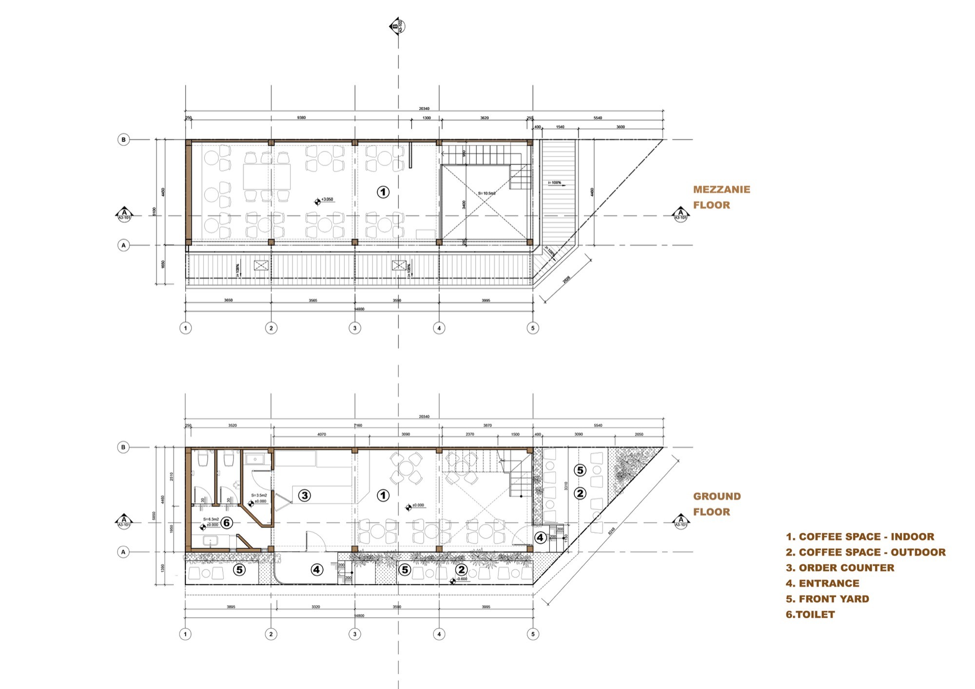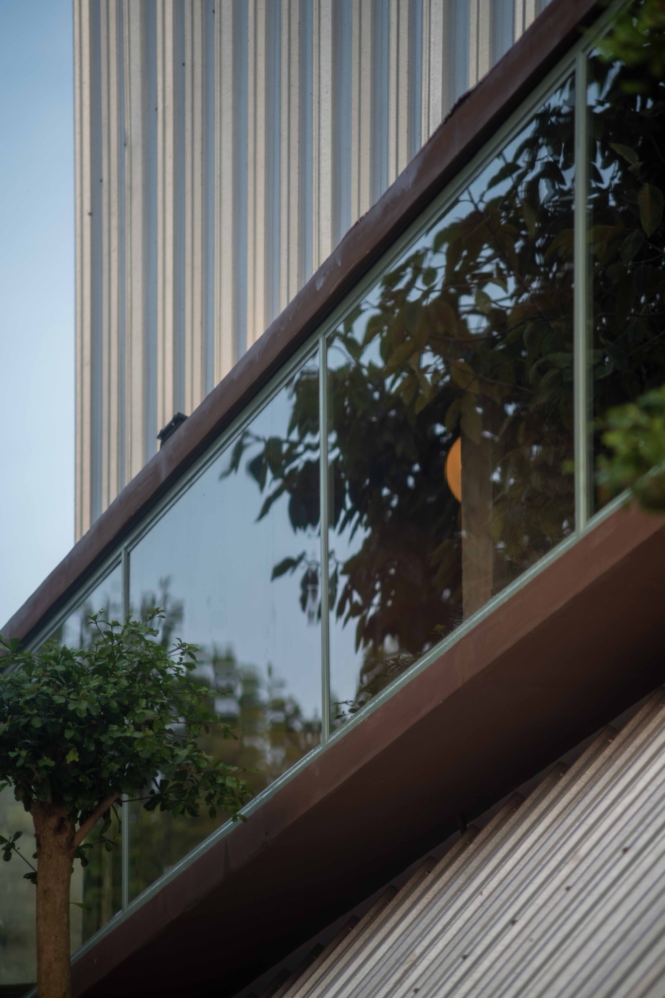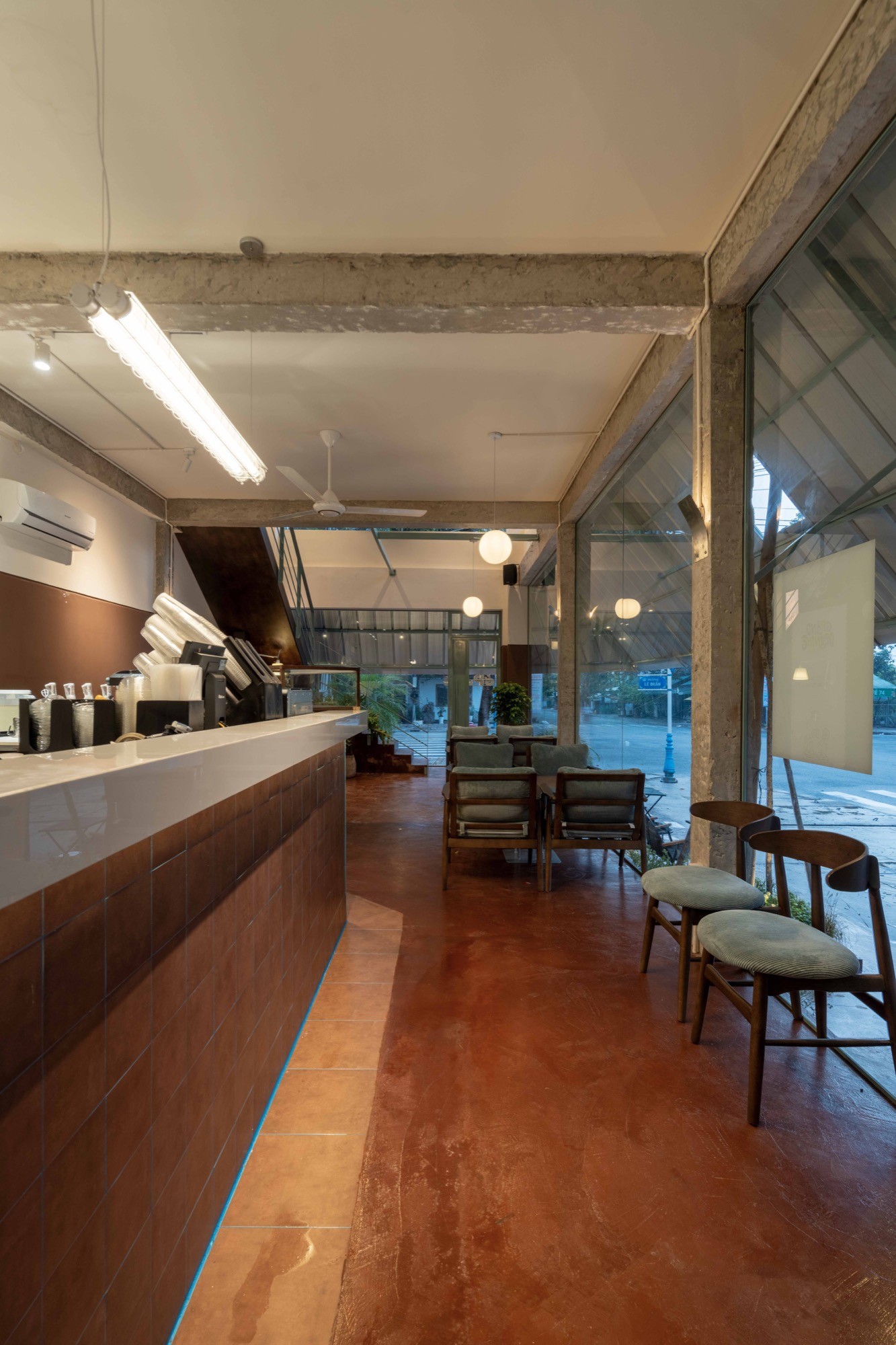 Lớp mái nghiêng ở tầng trệt đóng vai trò như một lớp trung gian. Nó vừa che chắn, vừa hạ thấp tỷ lệ công trình, đưa không gian về gần với người đi bộ. Tại đây, ranh giới giữa trong và ngoài không bị cắt đứt mà được điều tiết, cho phép ánh sáng, âm thanh và chuyển động từ phố đi vào một cách có kiểm soát. Công trình vì vậy không tách mình khỏi đô thị, mà thiết lập một trạng thái cân bằng giữa mở và đóng, giữa tiếp nhận và tiết chế.