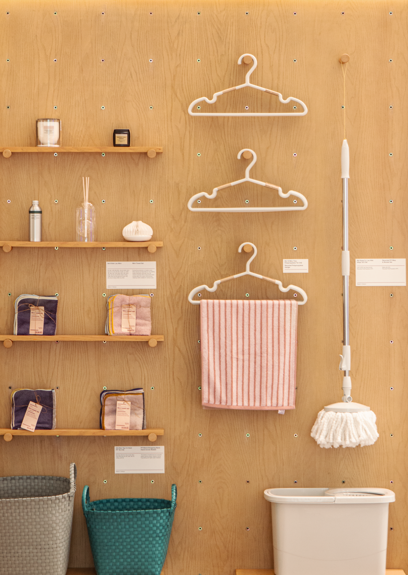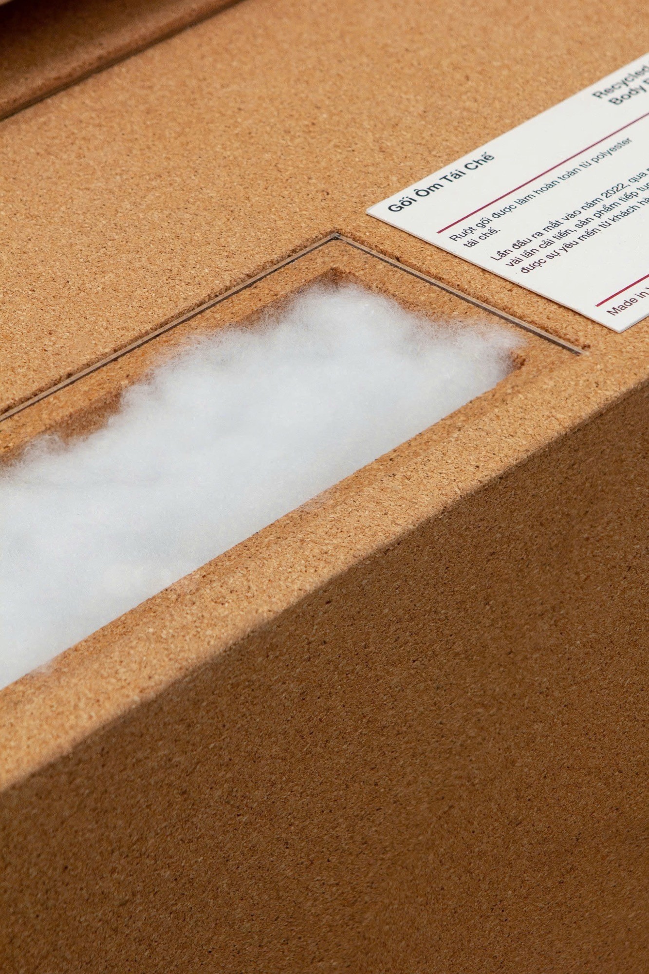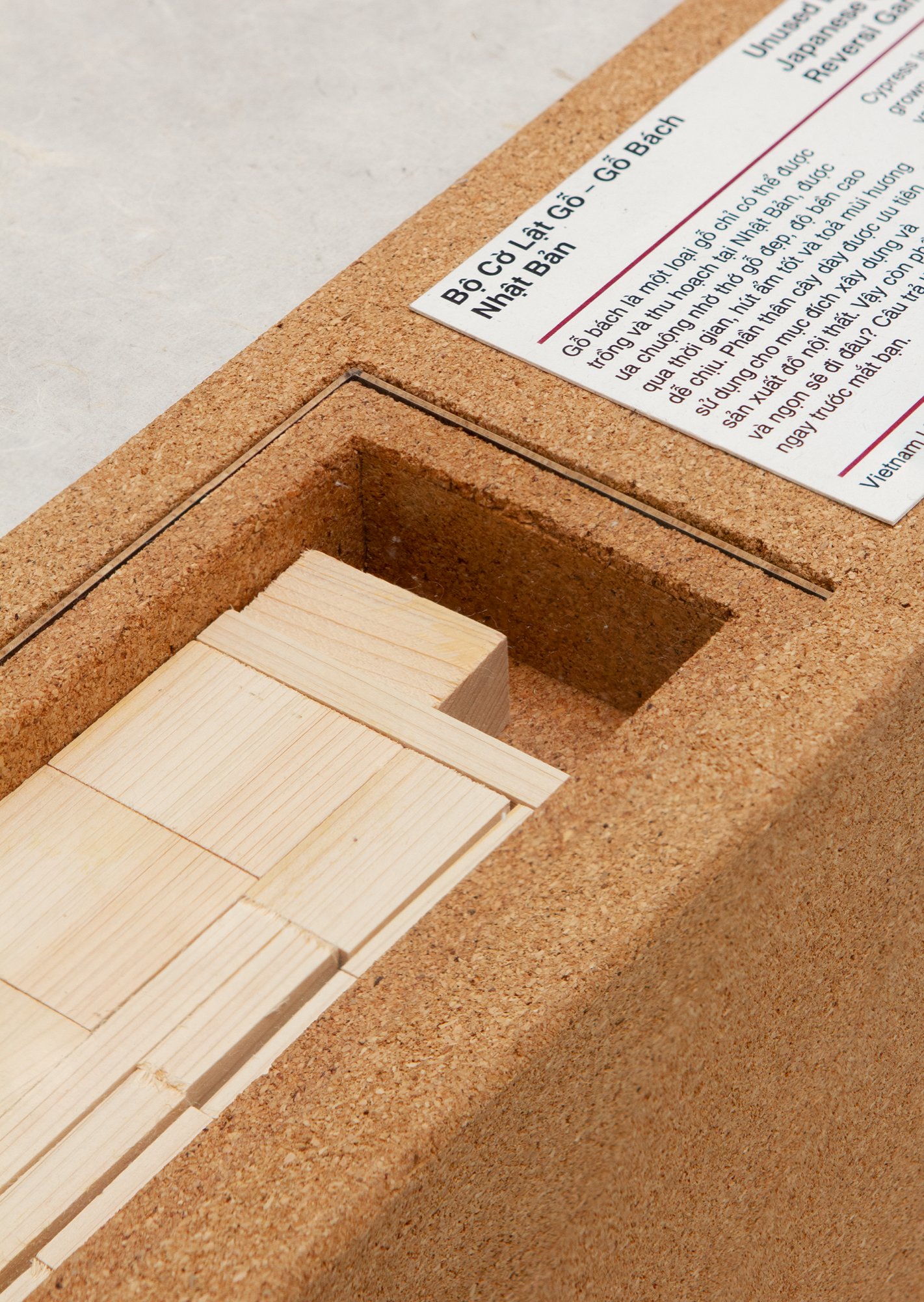 Bên trong cấu trúc chính, hệ các hộp phụ bằng cork được bổ sung như một lớp trung gian. Chúng không chỉ hỗ trợ trưng bày, mà còn làm nổi bật vai trò của vật liệu trong cách sản phẩm được cảm nhận. Bề mặt mềm, ấm và có độ thô nhẹ của cork tạo nên một đối trọng với lớp vỏ trung tính bên ngoài, đồng thời gợi mở cách MUJI tiếp cận vật liệu như một phần của trải nghiệm sử dụng hàng ngày.