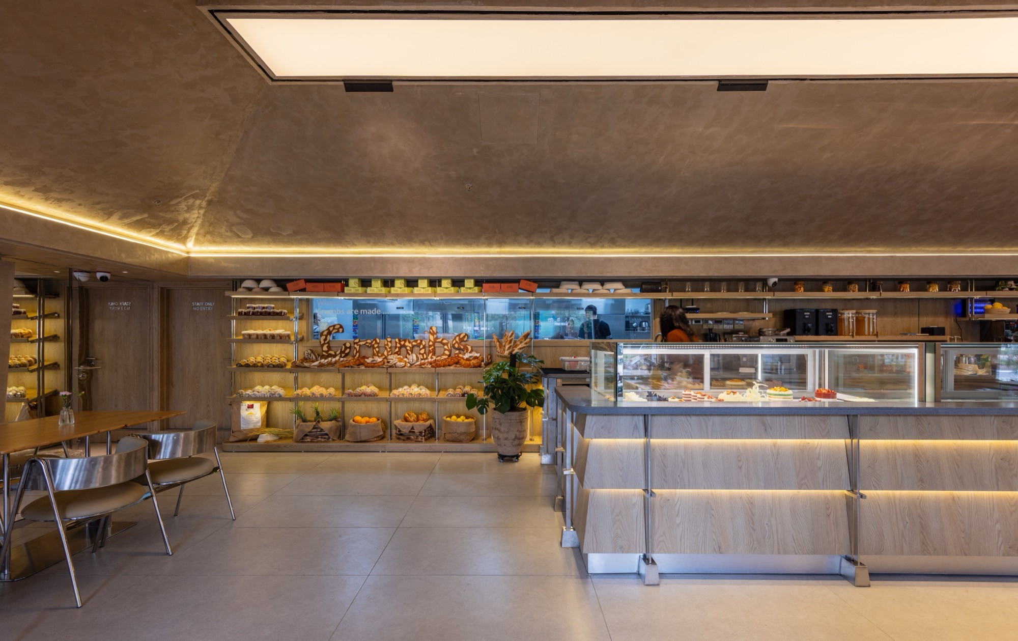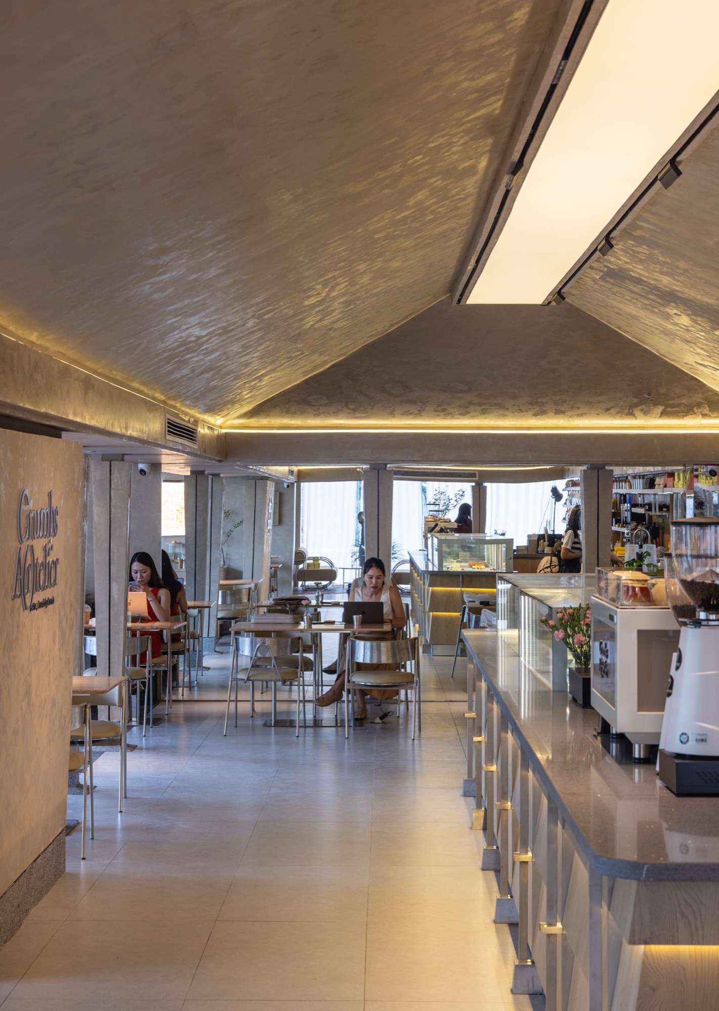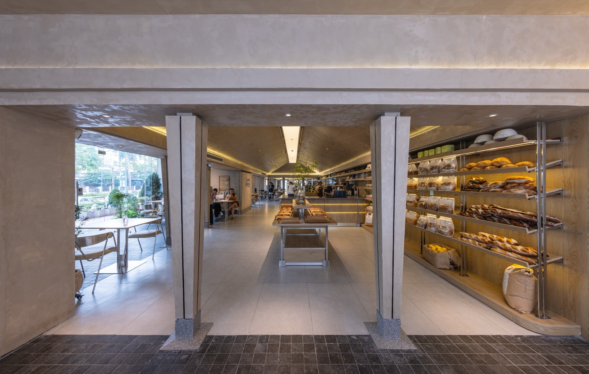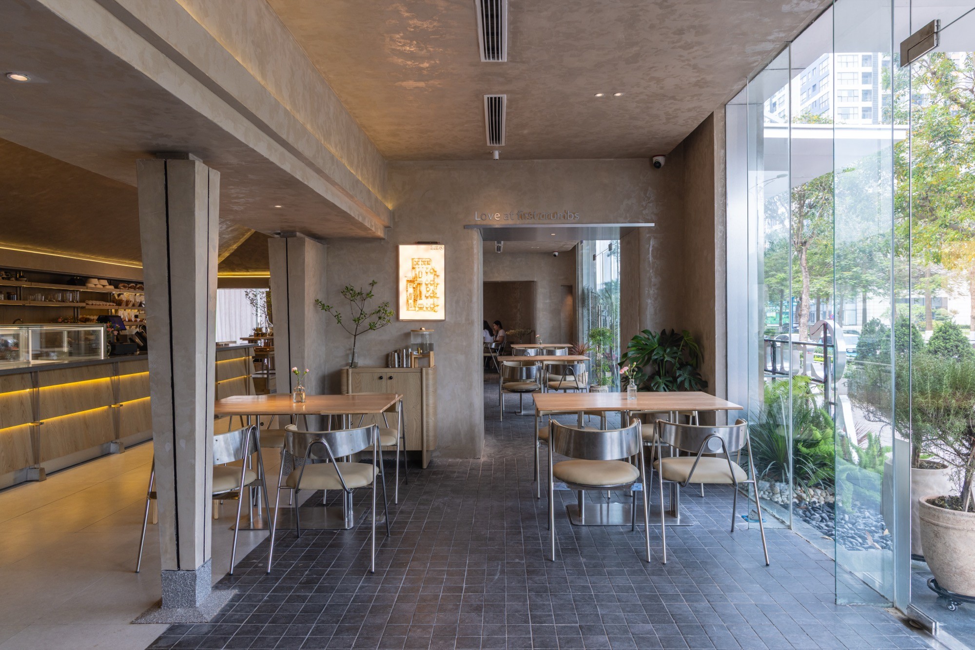 Tổ chức không gian dựa trên sự điều chỉnh cao độ và hình khối trần. Hệ trần hành lang thấp hơn dẫn vào khu vực trung tâm, nơi mái dốc được nhấn mạnh như một điểm hội tụ thị giác. Giải pháp này không chỉ mở rộng cảm nhận về chiều cao mà còn định hướng chuyển động, đưa tầm nhìn của khách hàng về phía quầy bánh – yếu tố cốt lõi của công năng. Các cột hiện trạng được xử lý lại về tỷ lệ và hình thức nhằm giảm cảm giác thô cứng, đồng thời duy trì sự liên tục trong trải nghiệm không gian.