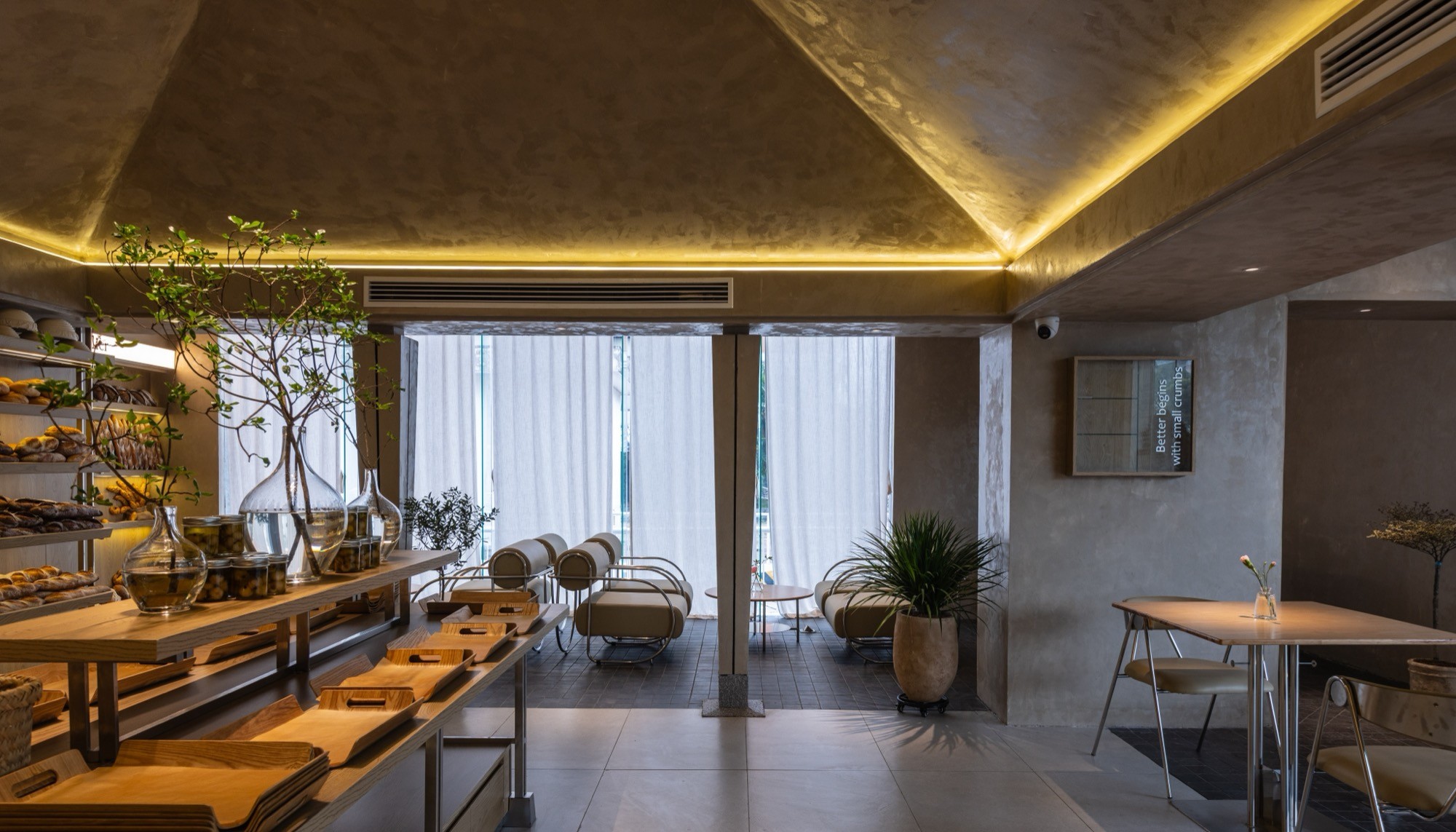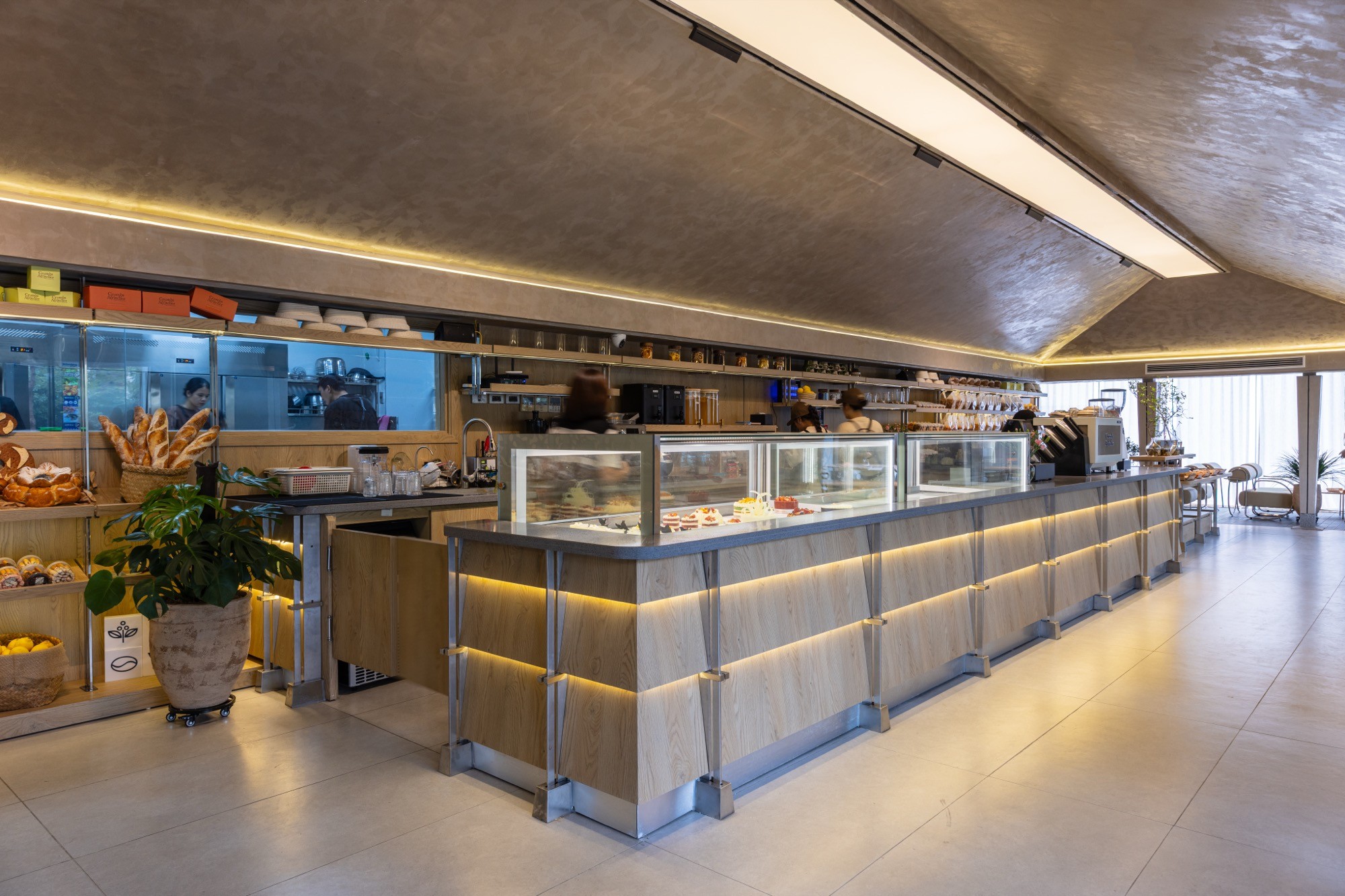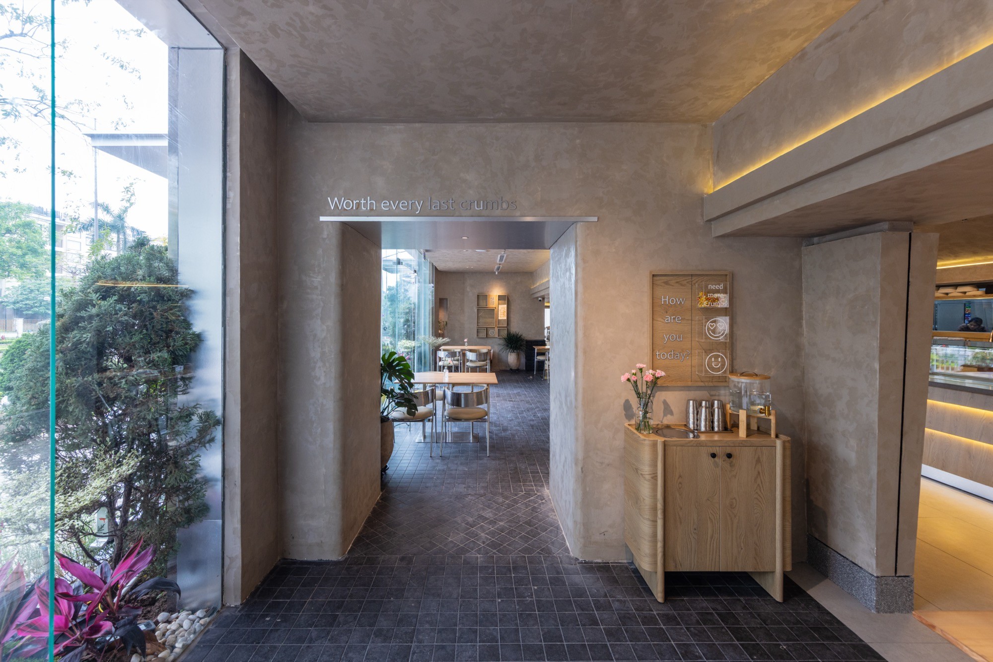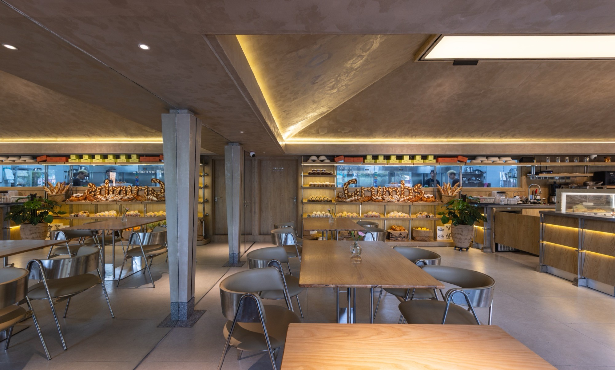 Tổ chức không gian dựa trên sự điều chỉnh cao độ và hình khối trần. Hệ trần hành lang thấp hơn dẫn vào khu vực trung tâm, nơi mái dốc được nhấn mạnh như một điểm hội tụ thị giác. Giải pháp này không chỉ mở rộng cảm nhận về chiều cao mà còn định hướng chuyển động, đưa tầm nhìn của khách hàng về phía quầy bánh – yếu tố cốt lõi của công năng. Các cột hiện trạng được xử lý lại về tỷ lệ và hình thức nhằm giảm cảm giác thô cứng, đồng thời duy trì sự liên tục trong trải nghiệm không gian.