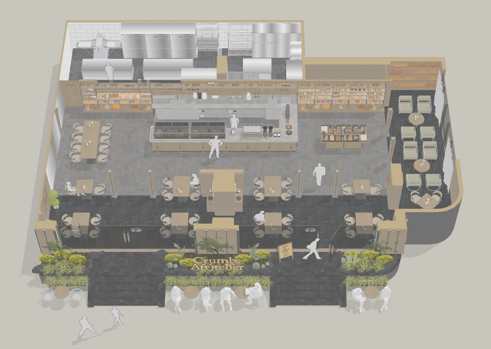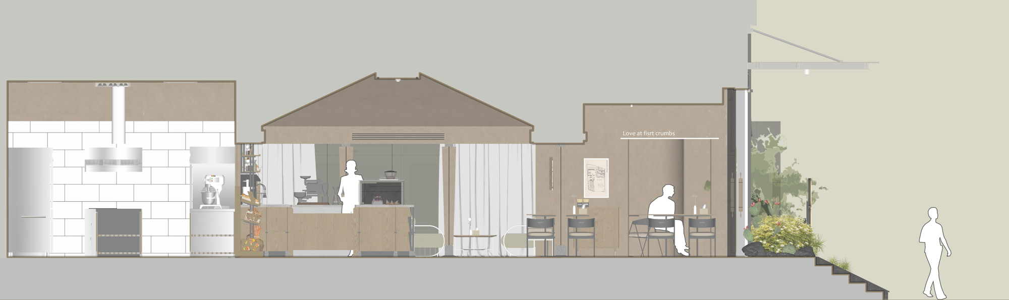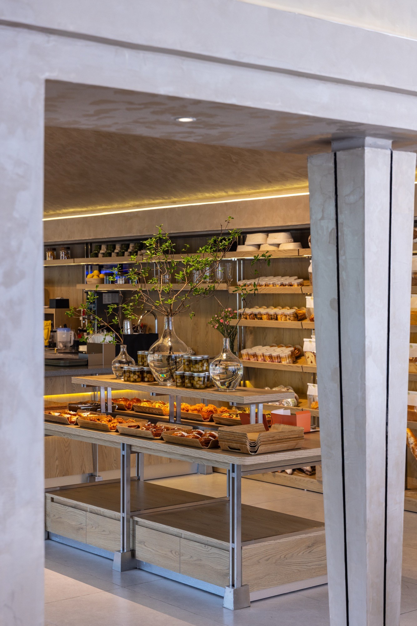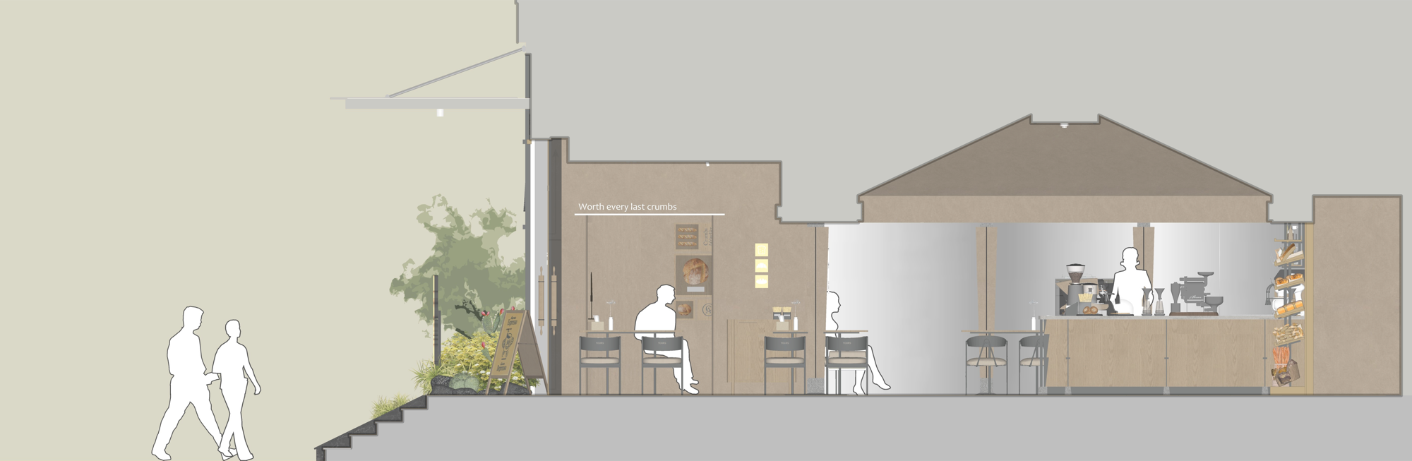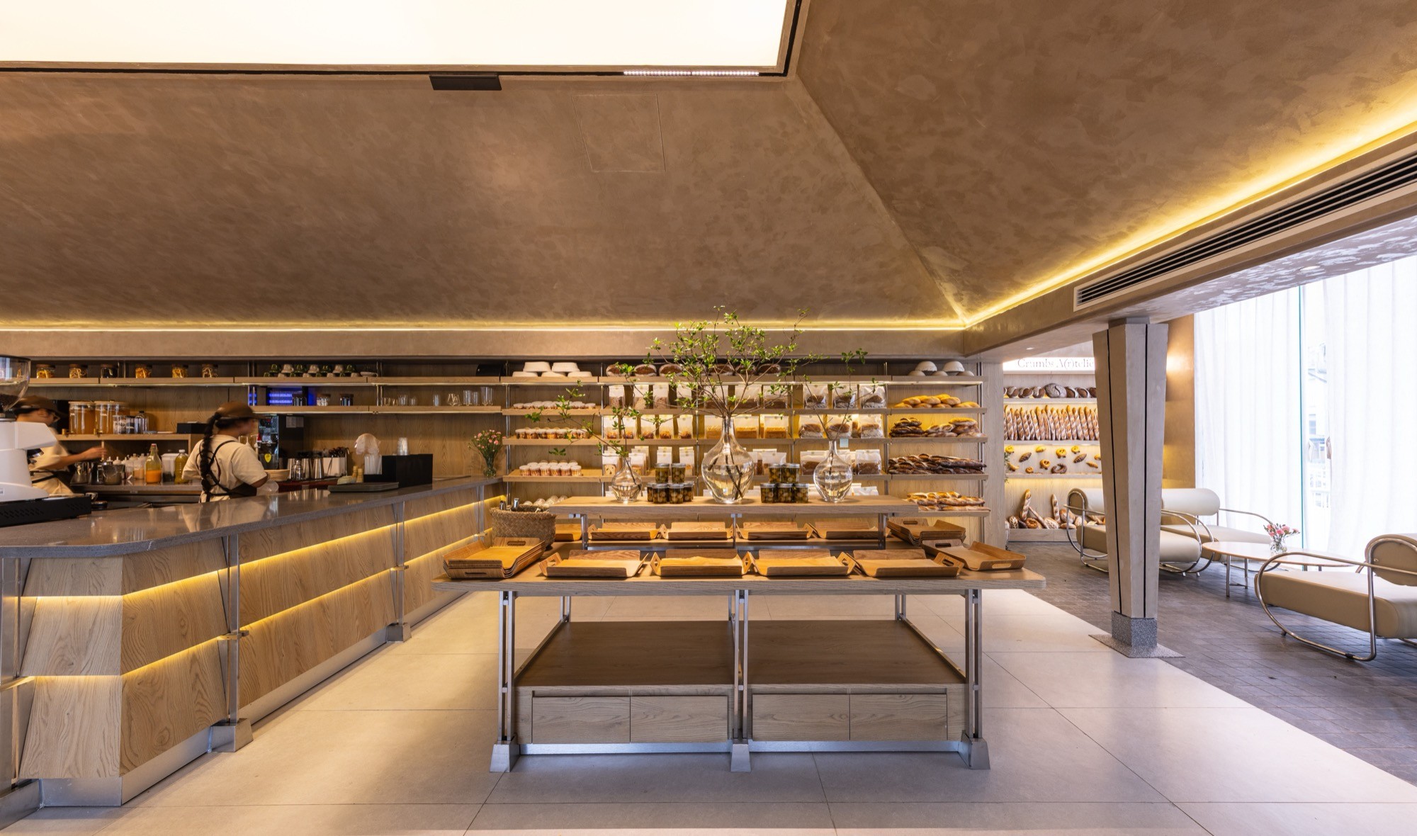 Tổ chức không gian dựa trên sự điều chỉnh cao độ và hình khối trần. Hệ trần hành lang thấp hơn dẫn vào khu vực trung tâm, nơi mái dốc được nhấn mạnh như một điểm hội tụ thị giác. Giải pháp này không chỉ mở rộng cảm nhận về chiều cao mà còn định hướng chuyển động, đưa tầm nhìn của khách hàng về phía quầy bánh – yếu tố cốt lõi của công năng. Các cột hiện trạng được xử lý lại về tỷ lệ và hình thức nhằm giảm cảm giác thô cứng, đồng thời duy trì sự liên tục trong trải nghiệm không gian.