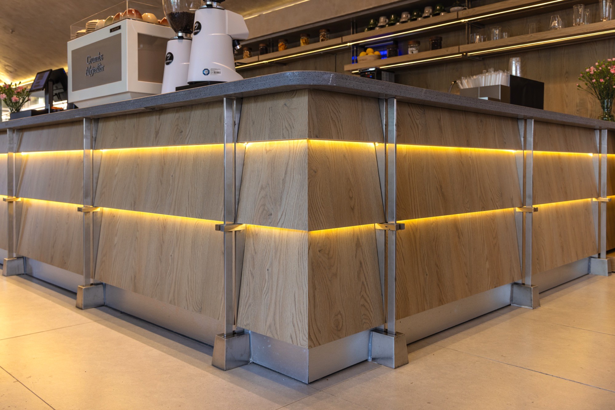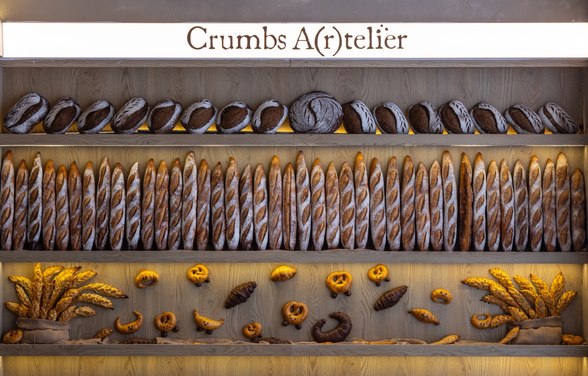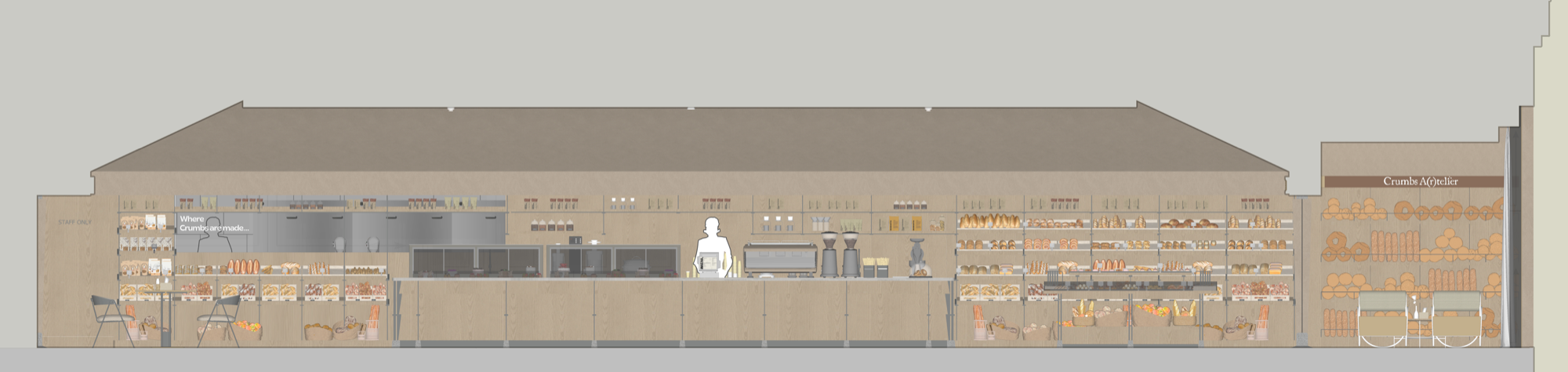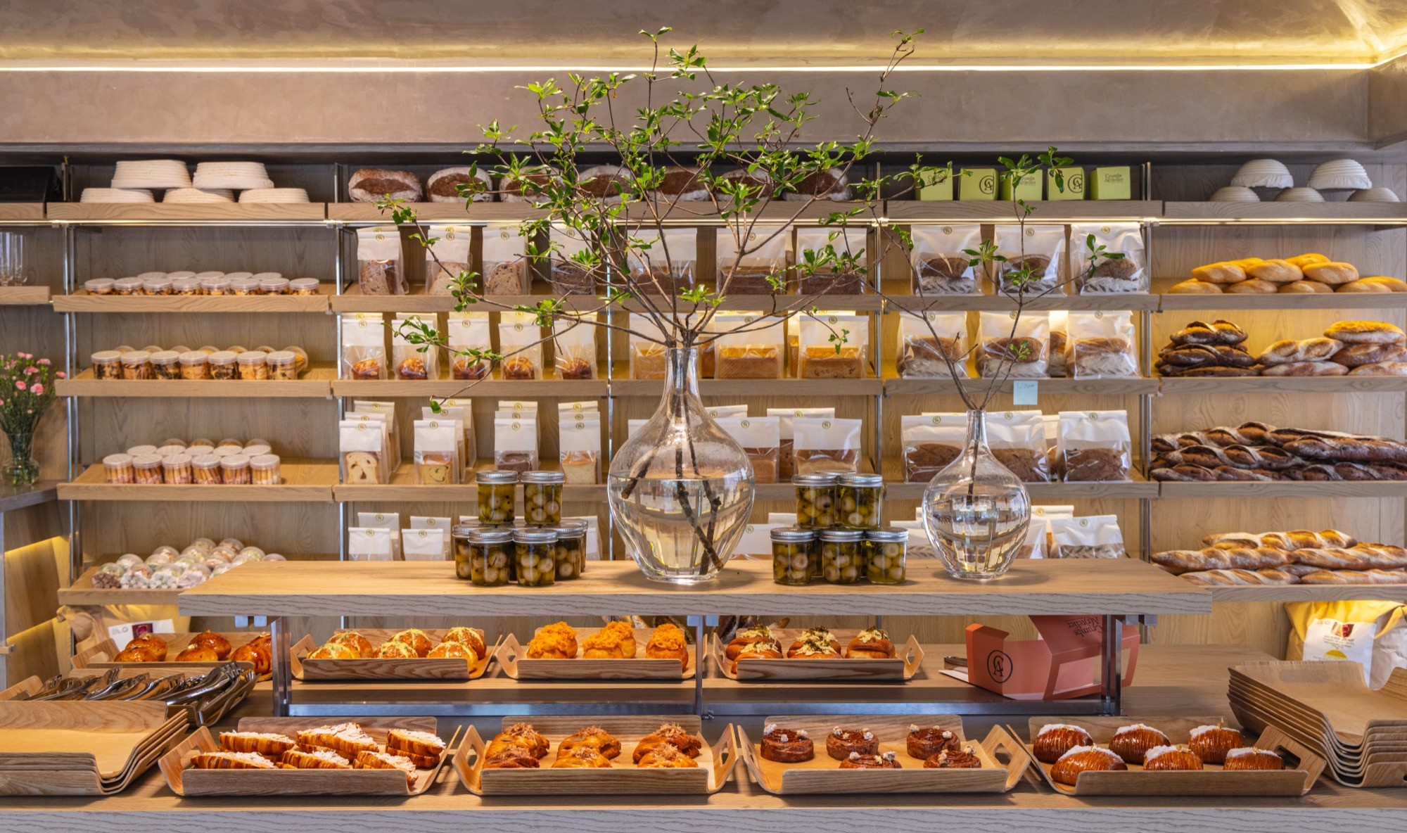 Tổ chức không gian dựa trên sự điều chỉnh cao độ và hình khối trần. Hệ trần hành lang thấp hơn dẫn vào khu vực trung tâm, nơi mái dốc được nhấn mạnh như một điểm hội tụ thị giác. Giải pháp này không chỉ mở rộng cảm nhận về chiều cao mà còn định hướng chuyển động, đưa tầm nhìn của khách hàng về phía quầy bánh – yếu tố cốt lõi của công năng. Các cột hiện trạng được xử lý lại về tỷ lệ và hình thức nhằm giảm cảm giác thô cứng, đồng thời duy trì sự liên tục trong trải nghiệm không gian.
