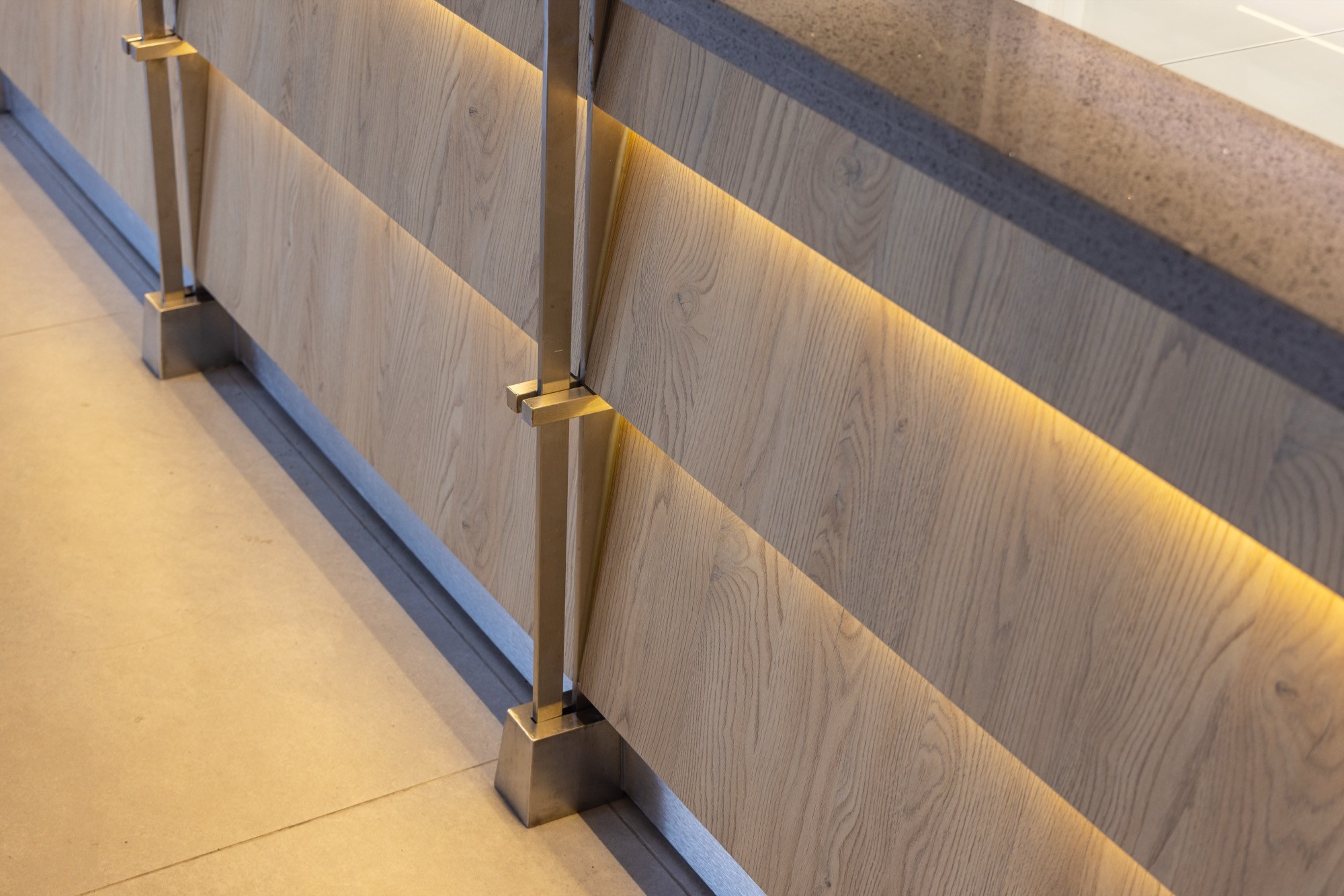 Ánh sáng được kiểm soát ở mức vừa phải, kết hợp giữa nguồn tự nhiên từ các vách kính lớn và ánh sáng nhân tạo có chủ đích. Hệ gương được bố trí xen kẽ không chỉ giúp mở rộng không gian theo chiều sâu mà còn tăng cường hiệu ứng phản chiếu, làm rõ hơn các lớp không gian và chuyển động của người sử dụng.