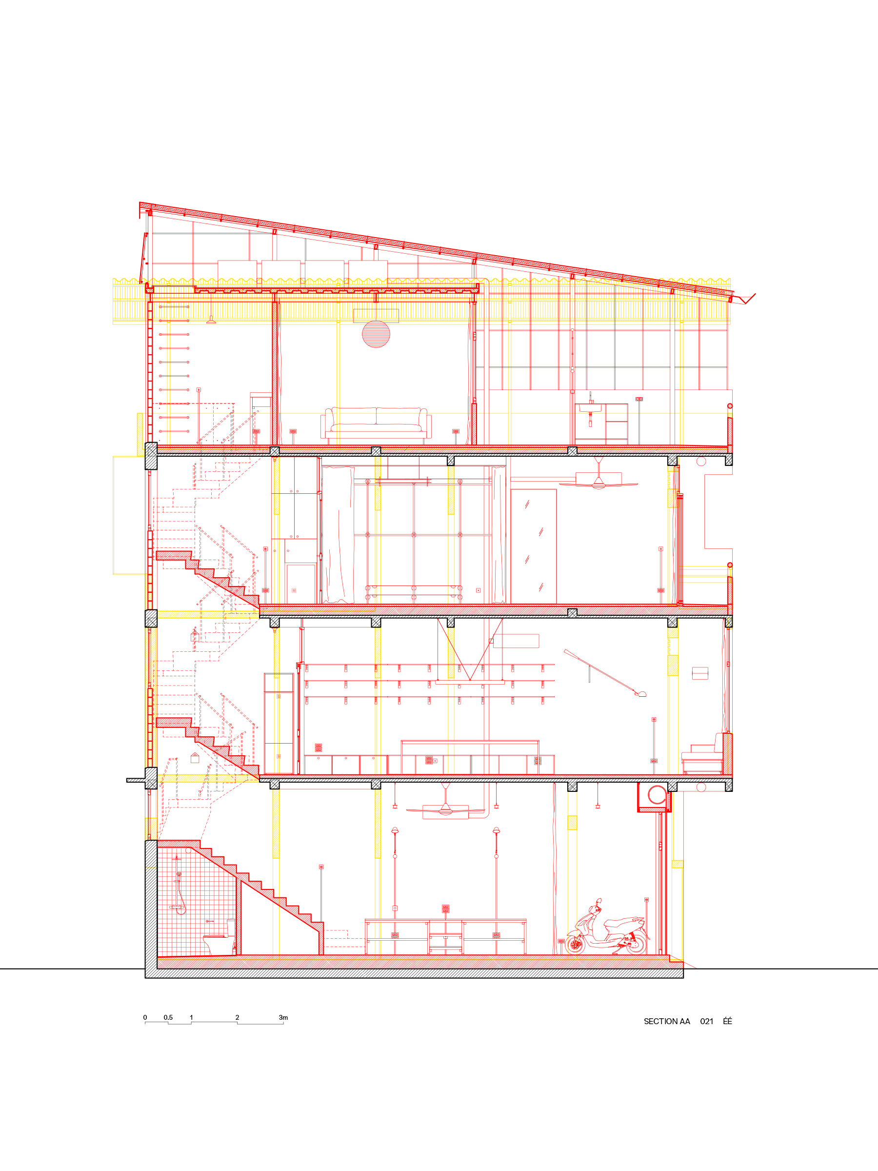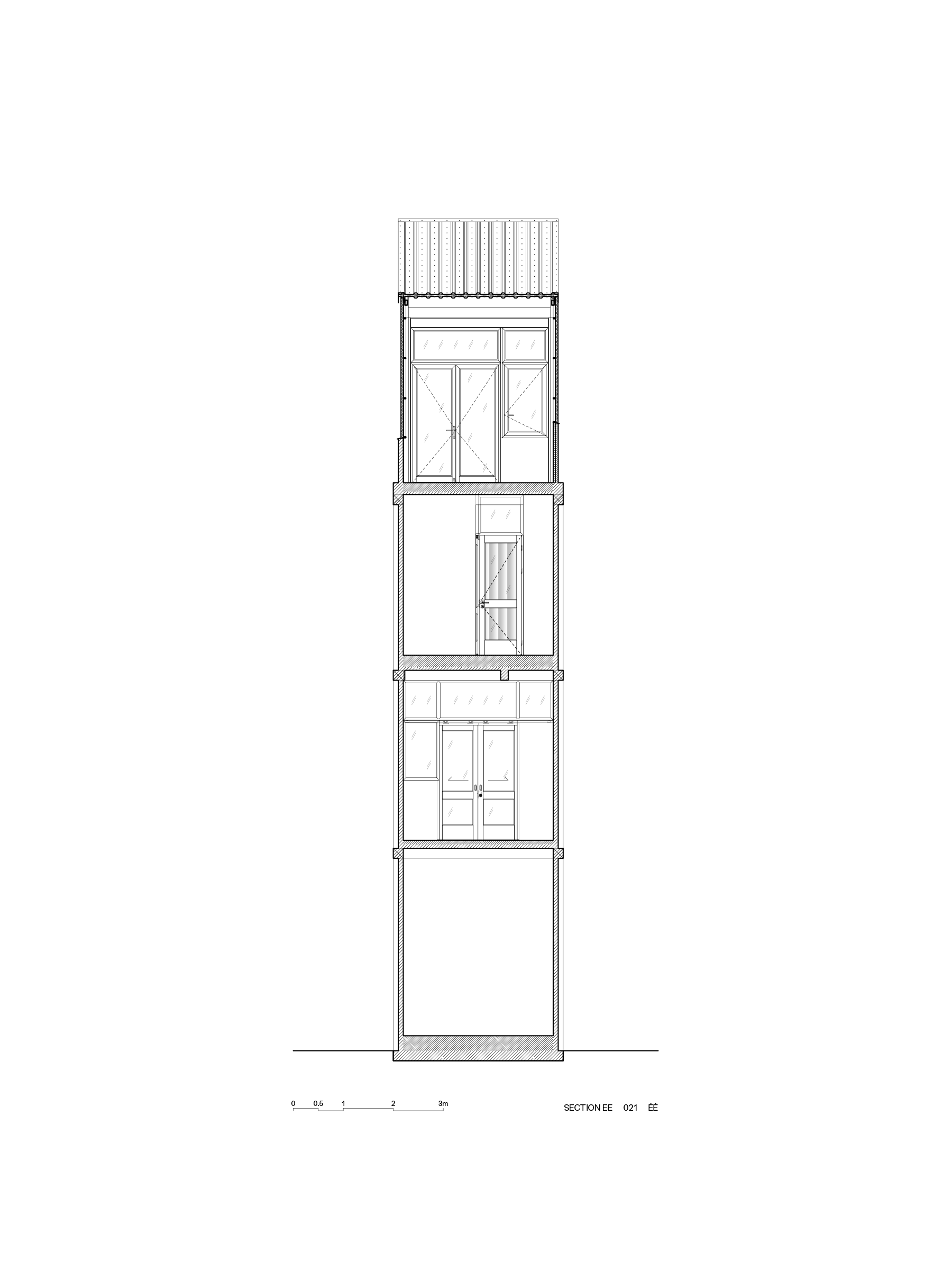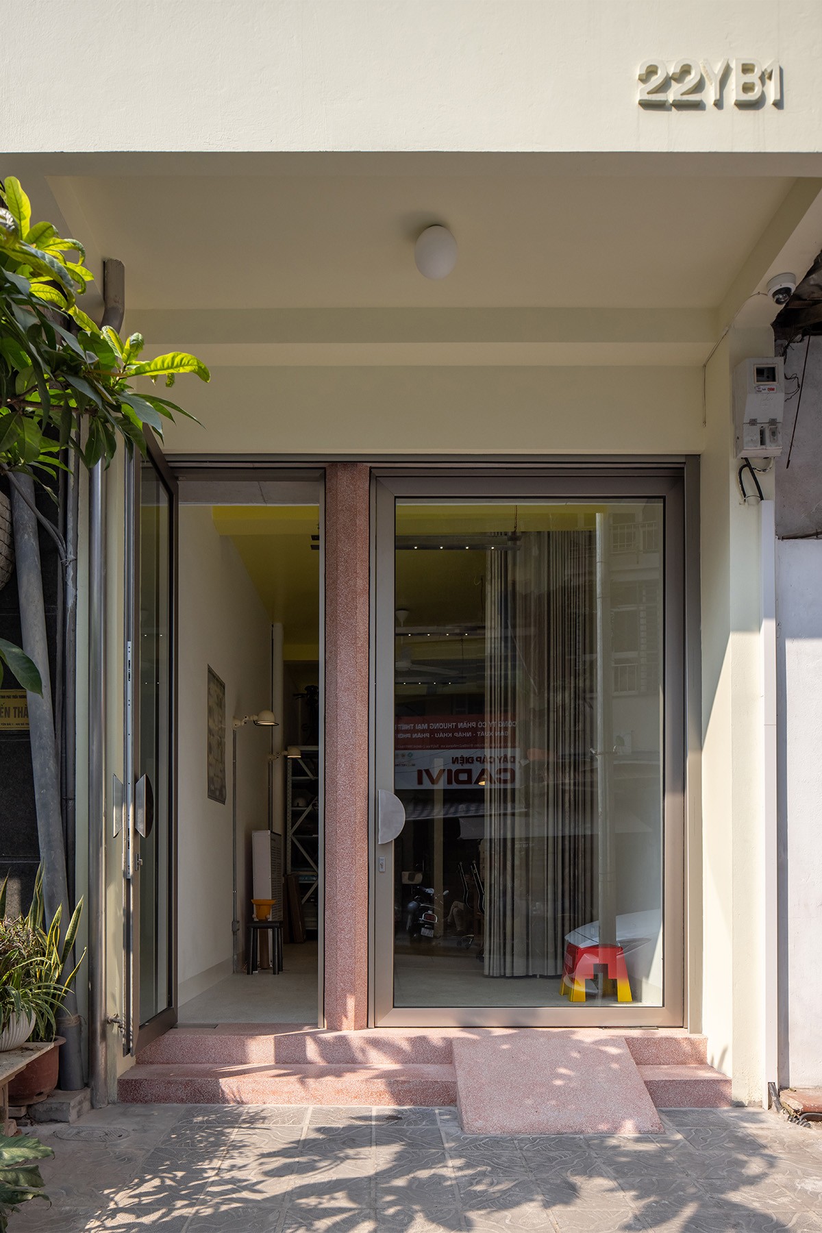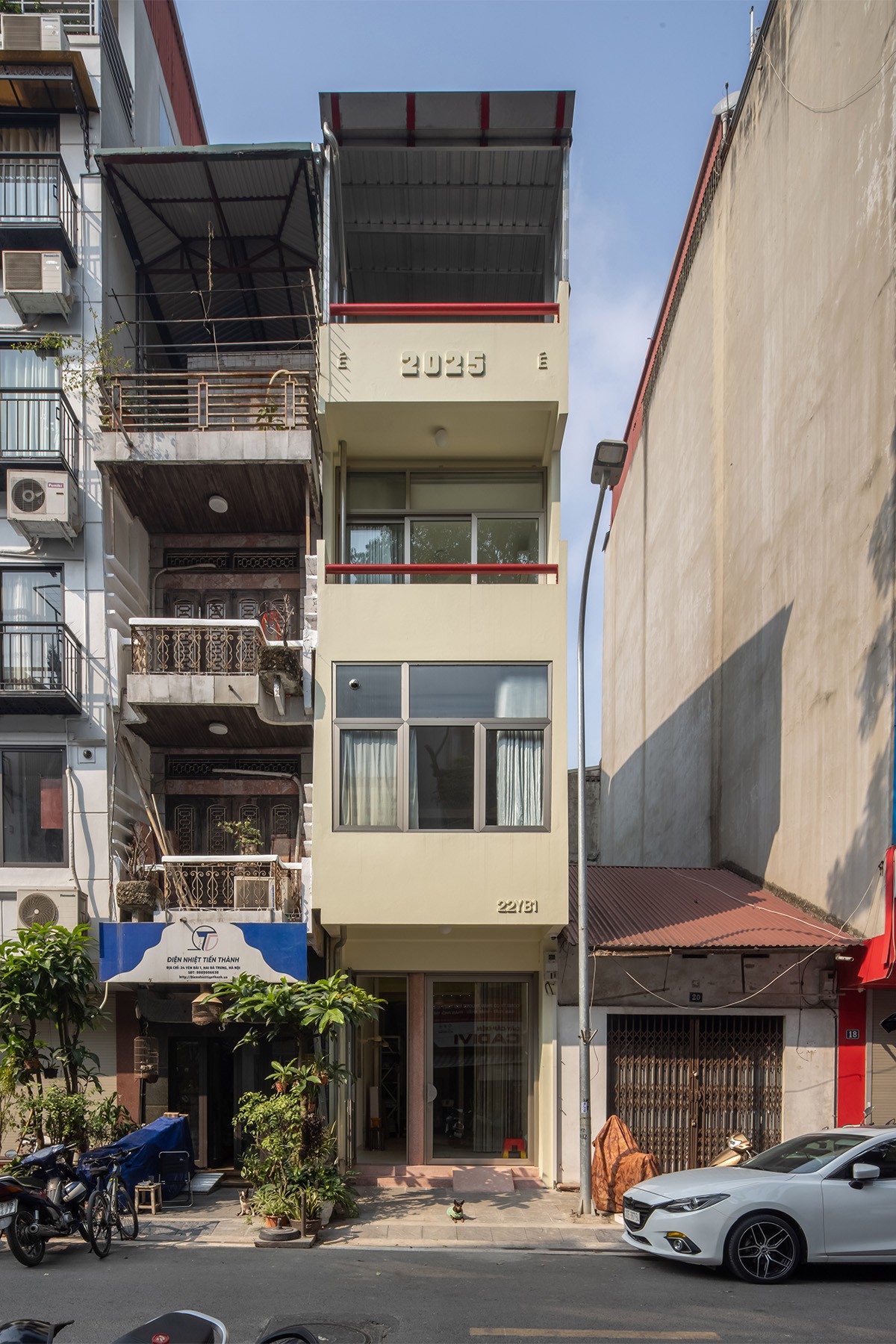 Mặt tiền được giữ lại như một dấu vết ký ức đô thị, với địa chỉ và năm “tái sinh” được đắp nổi như một cách ghi nhận sự tiếp nối. sự can thiệp diễn ra bên trong: cầu thang dời về cuối nhà, vách ngăn được gỡ bỏ, một khoảng rỗng xuất hiện để ánh sáng và không khí đi xuyên qua công trình.