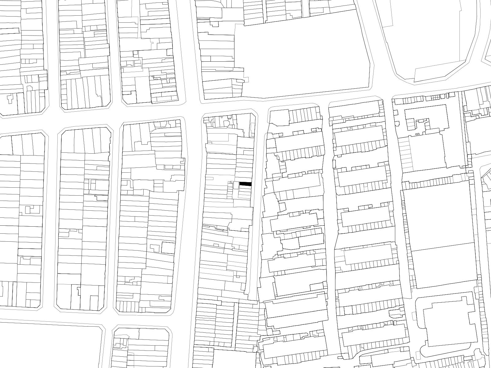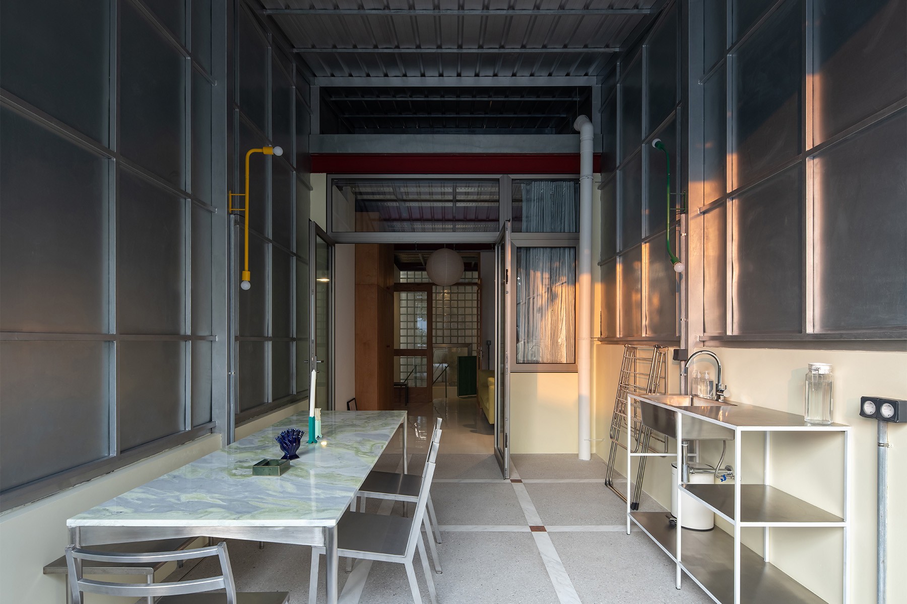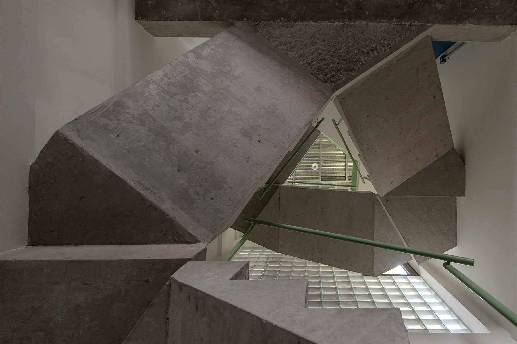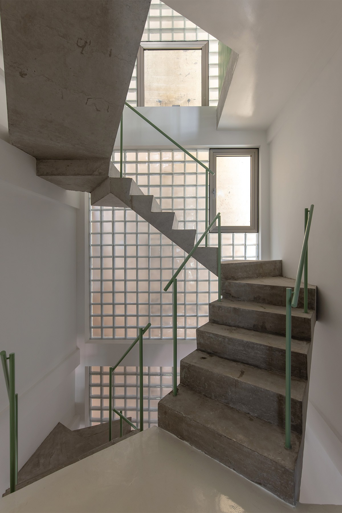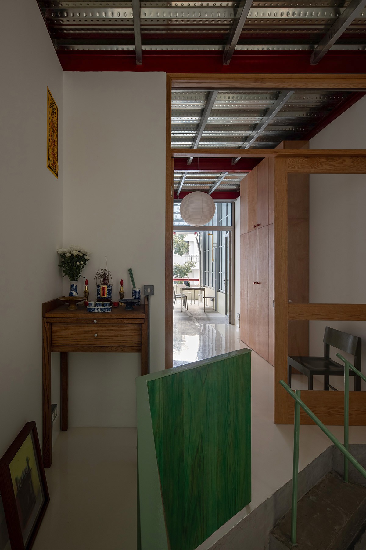 Mặt tiền được giữ lại như một dấu vết ký ức đô thị, với địa chỉ và năm “tái sinh” được đắp nổi như một cách ghi nhận sự tiếp nối. sự can thiệp diễn ra bên trong: cầu thang dời về cuối nhà, vách ngăn được gỡ bỏ, một khoảng rỗng xuất hiện để ánh sáng và không khí đi xuyên qua công trình.