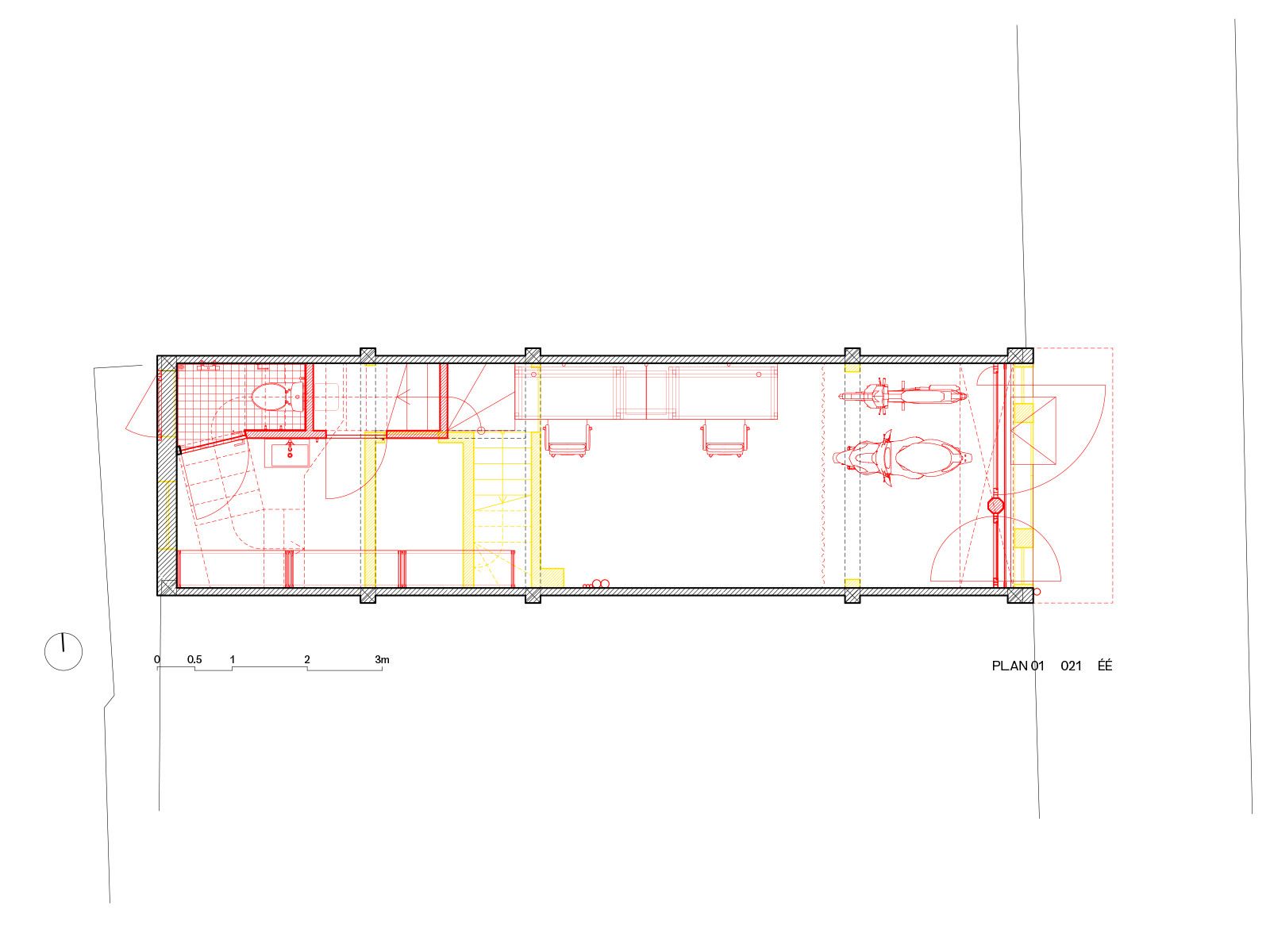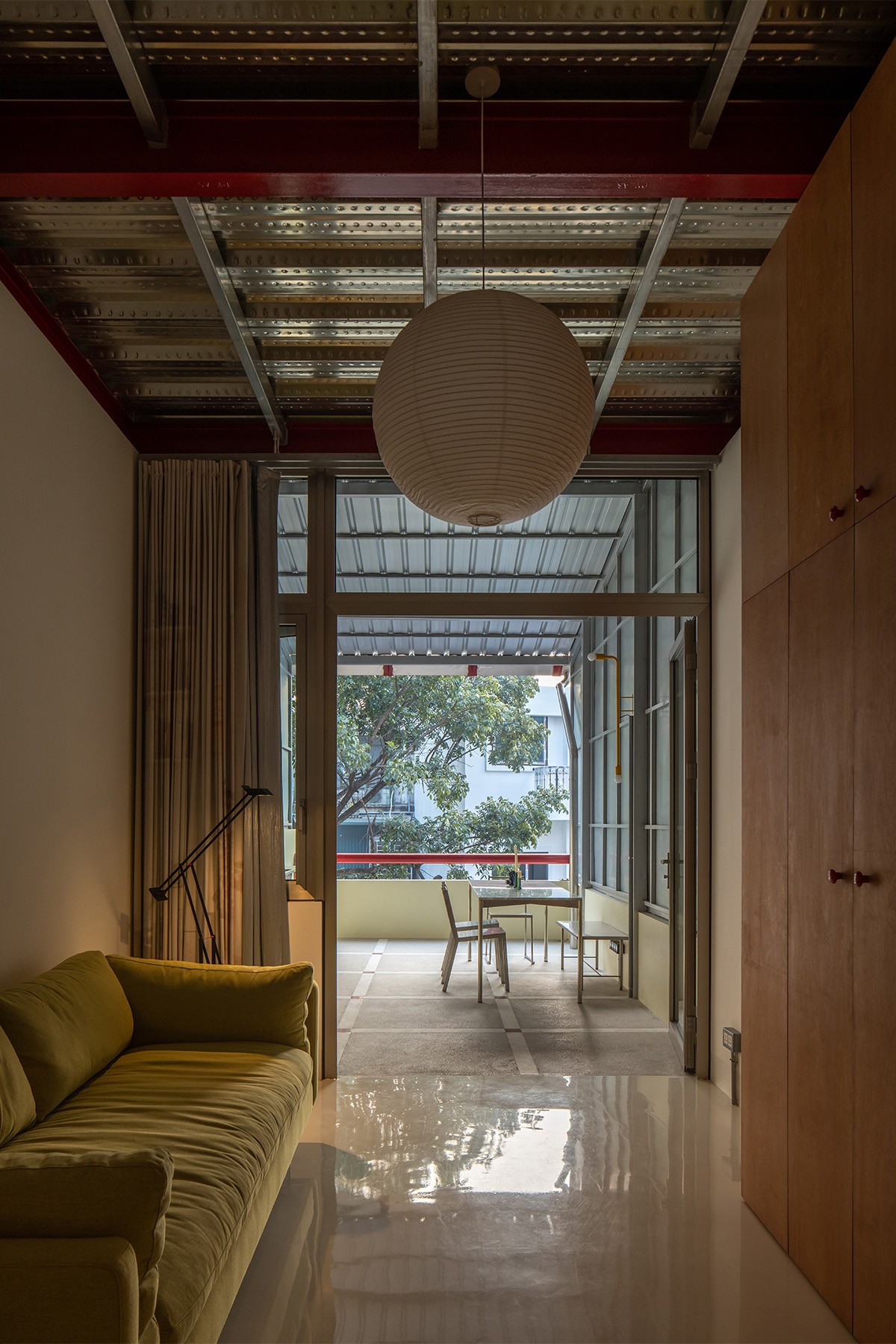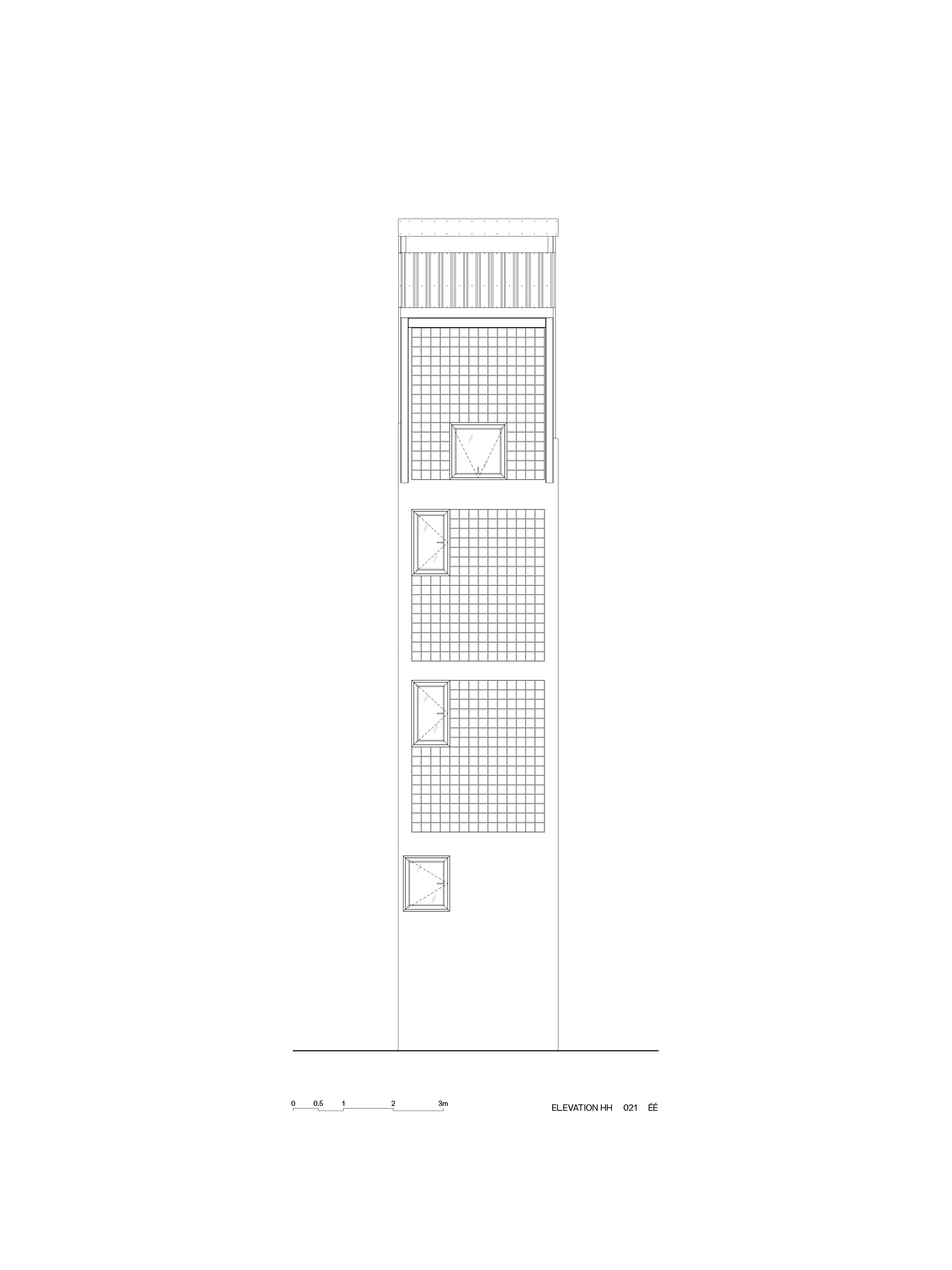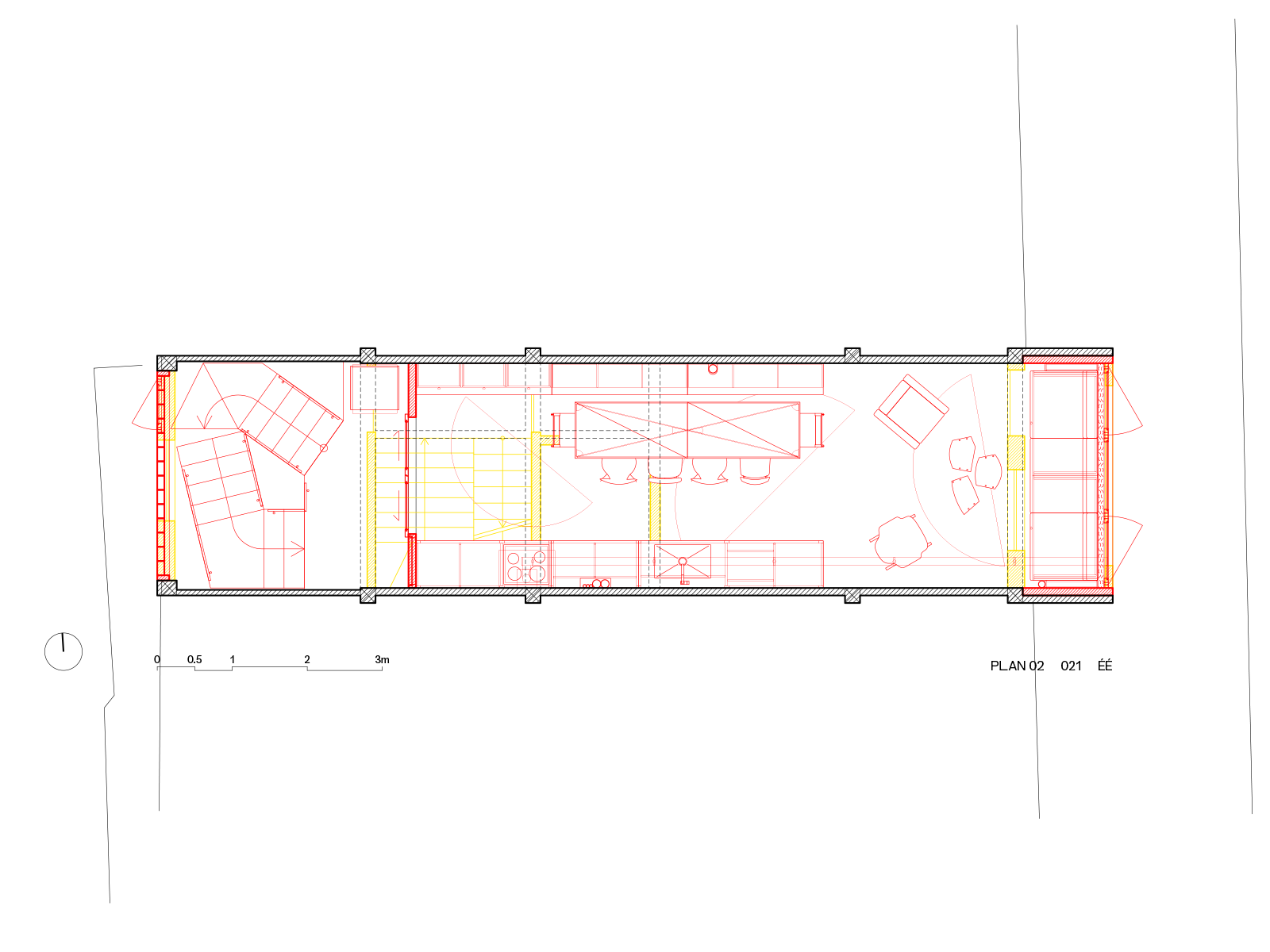 Mặt tiền được giữ lại như một dấu vết ký ức đô thị, với địa chỉ và năm “tái sinh” được đắp nổi như một cách ghi nhận sự tiếp nối. sự can thiệp diễn ra bên trong: cầu thang dời về cuối nhà, vách ngăn được gỡ bỏ, một khoảng rỗng xuất hiện để ánh sáng và không khí đi xuyên qua công trình.