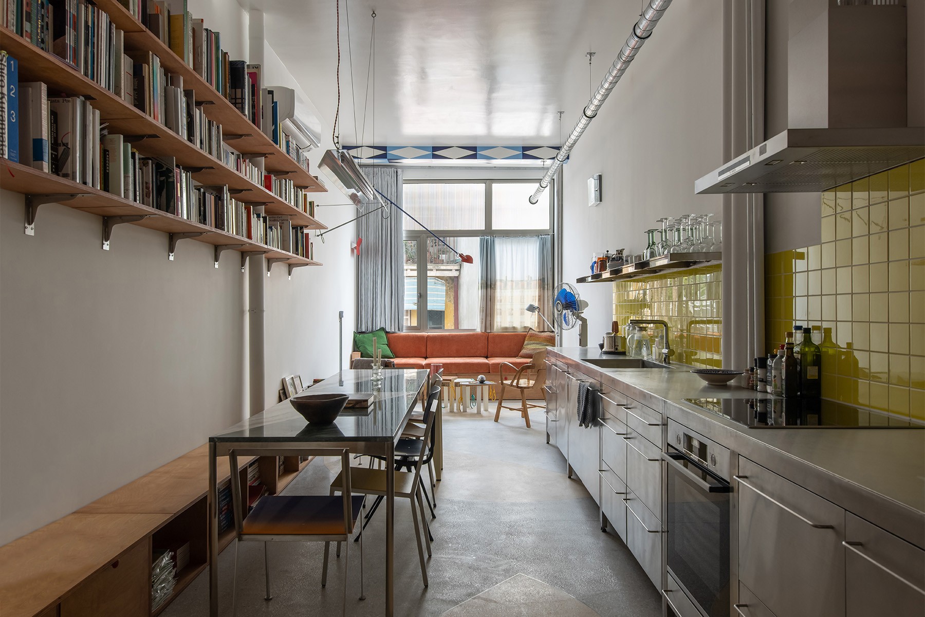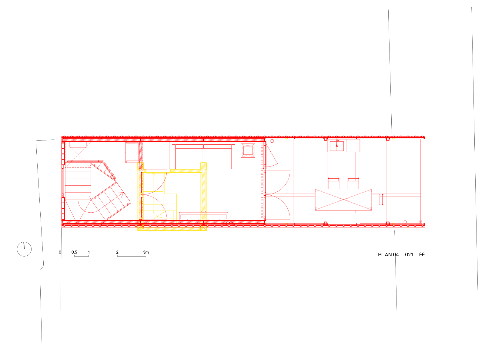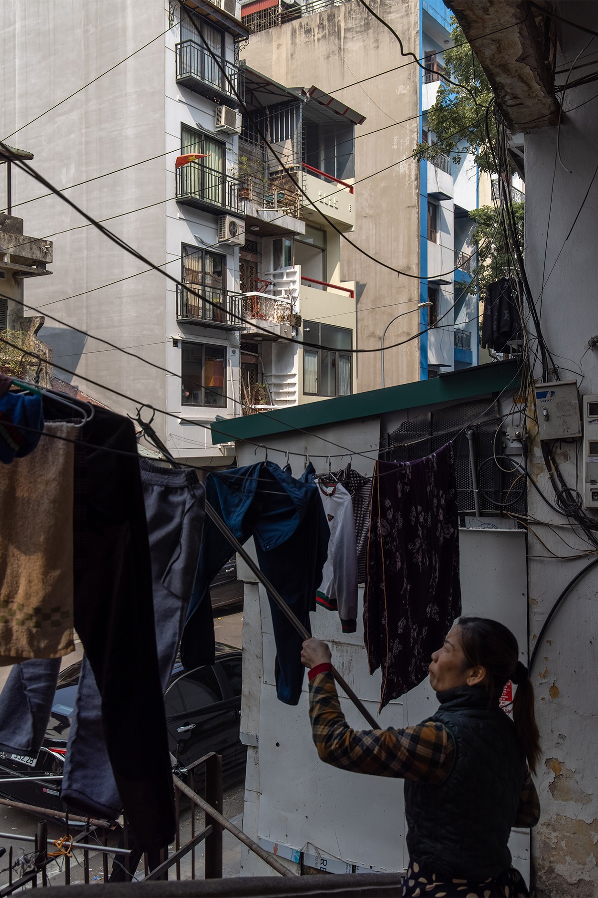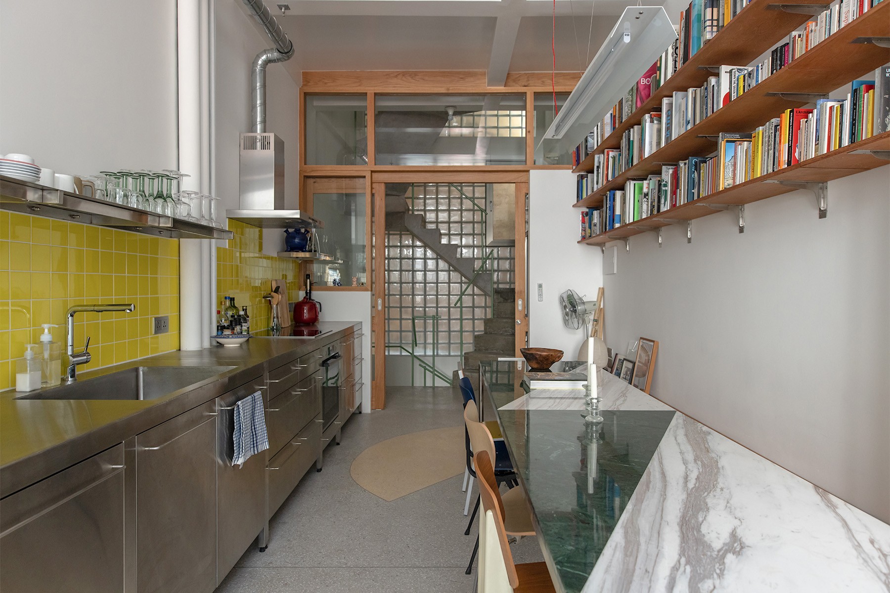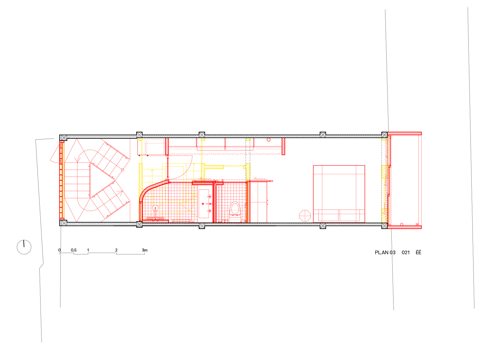 Mặt tiền được giữ lại như một dấu vết ký ức đô thị, với địa chỉ và năm “tái sinh” được đắp nổi như một cách ghi nhận sự tiếp nối. sự can thiệp diễn ra bên trong: cầu thang dời về cuối nhà, vách ngăn được gỡ bỏ, một khoảng rỗng xuất hiện để ánh sáng và không khí đi xuyên qua công trình.