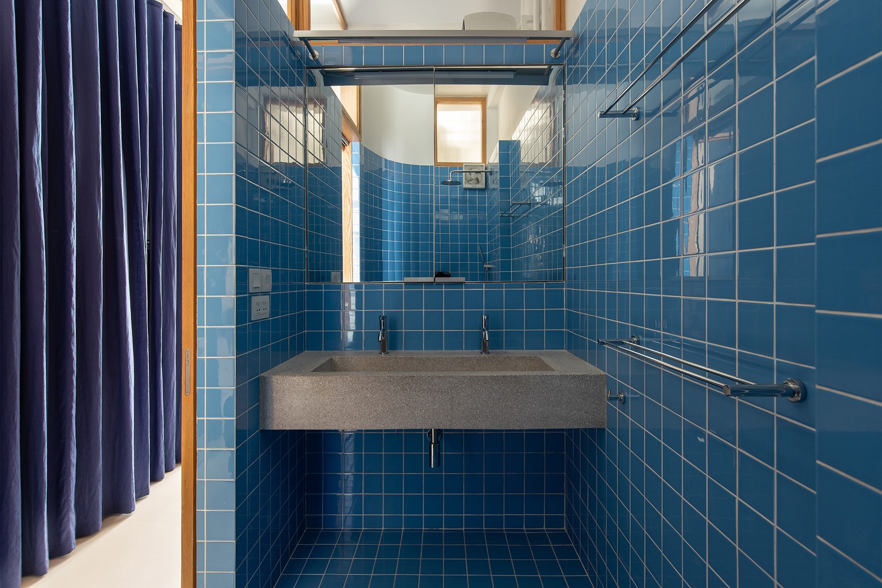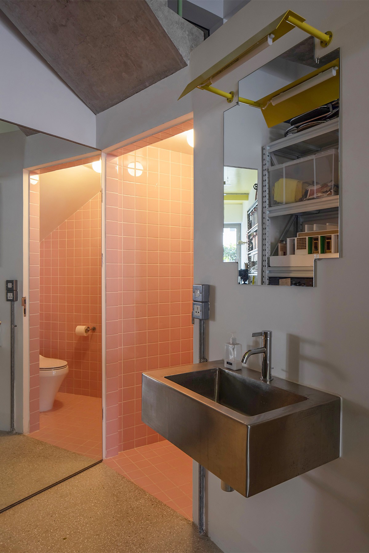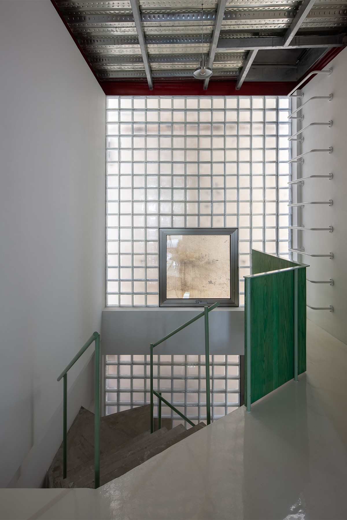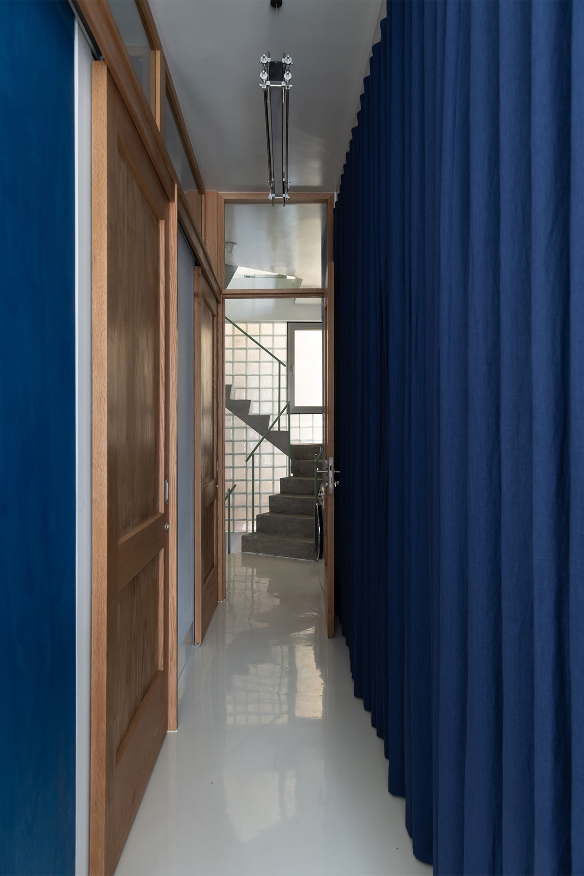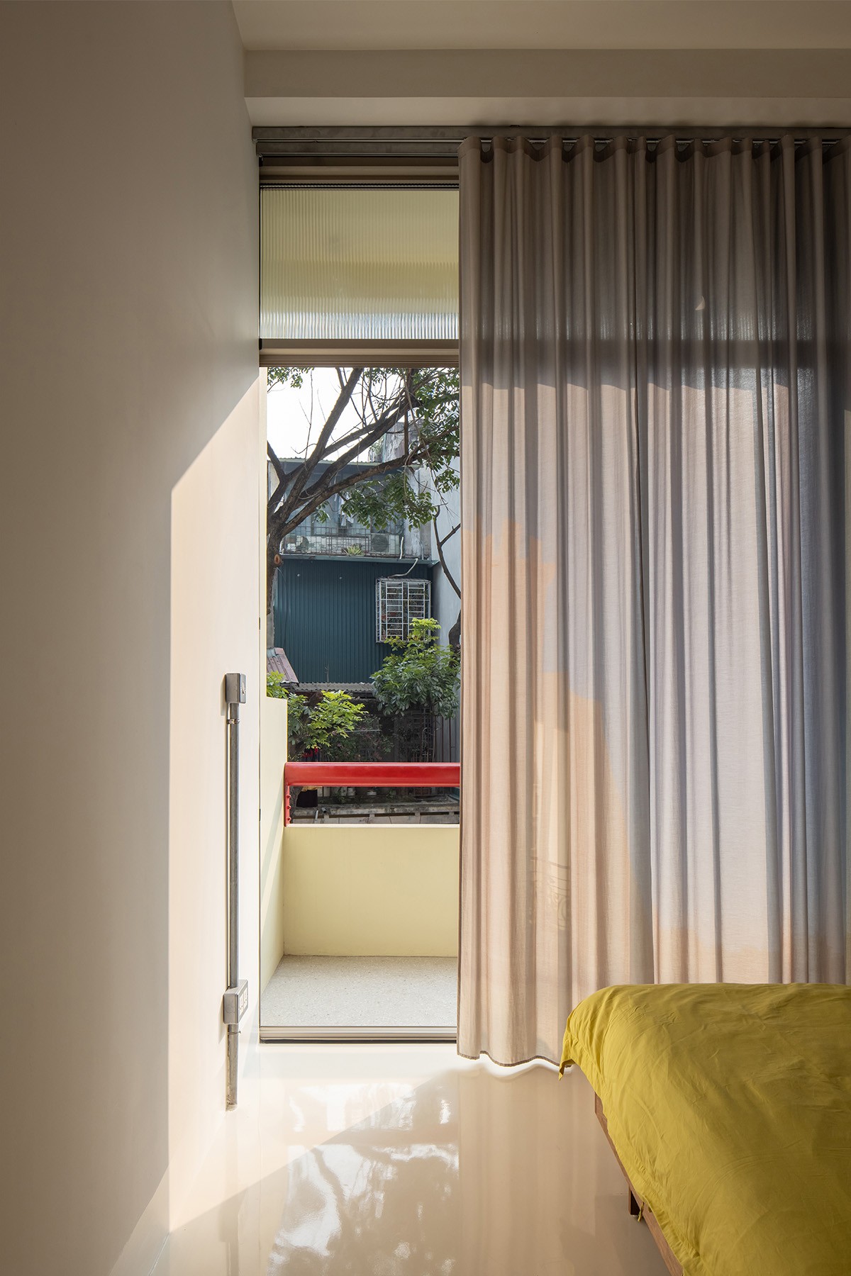 Phía sau, lớp gạch kính hoạt động như một vùng trung gian, đủ mở để lấy sáng nhưng cũng đủ kín để giữ nhịp sống riêng. Những điều chỉnh này không nhằm tạo hình, mà để trả lại những điều kiện sống cơ bản cho người sử dụng. Phần còn lại của công trình được giữ ở mức tối giản. Các bề mặt gần như trung tính, nhường chỗ cho một vài điểm nhấn màu sắc xuất hiện rải rác.
