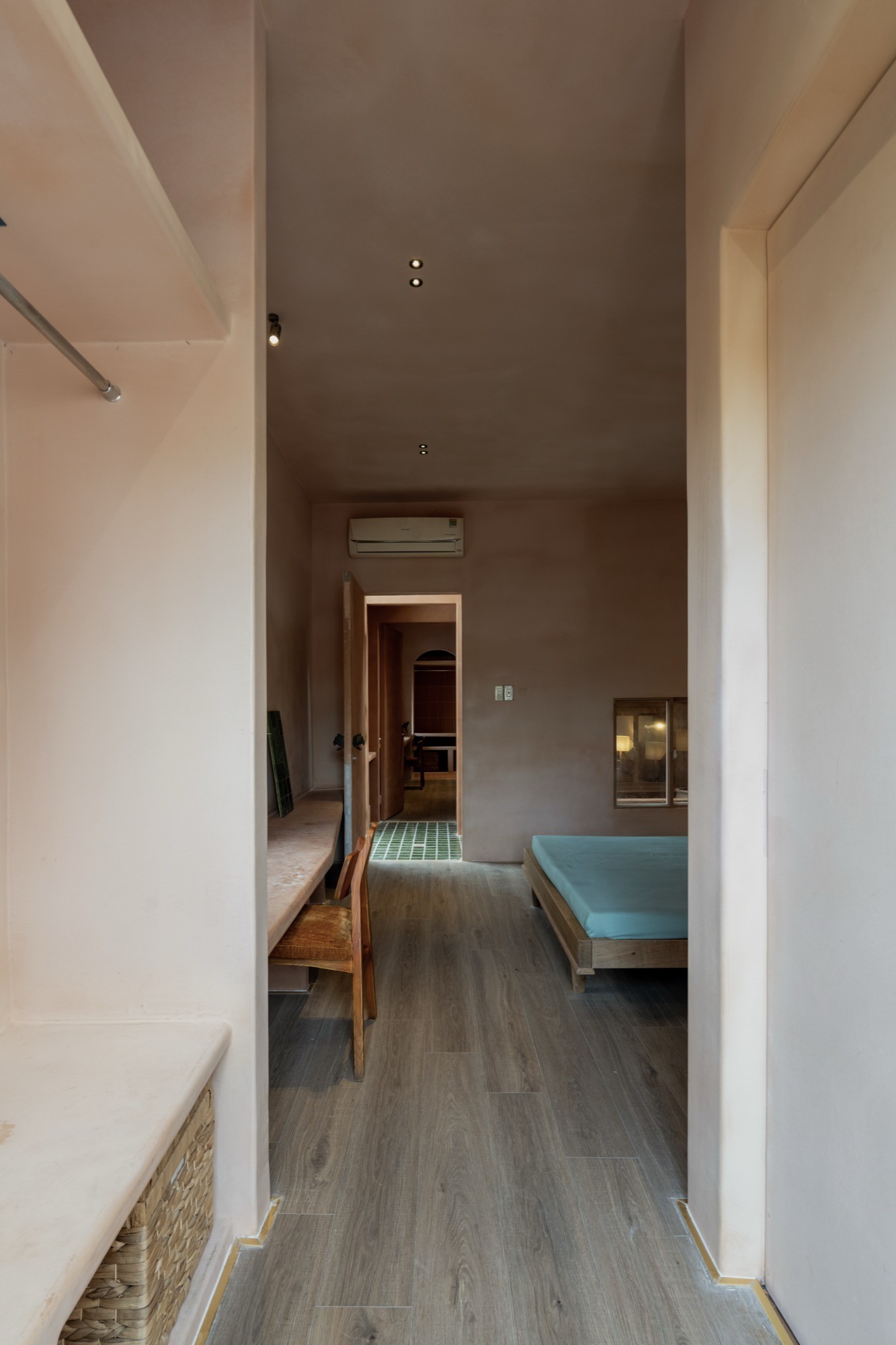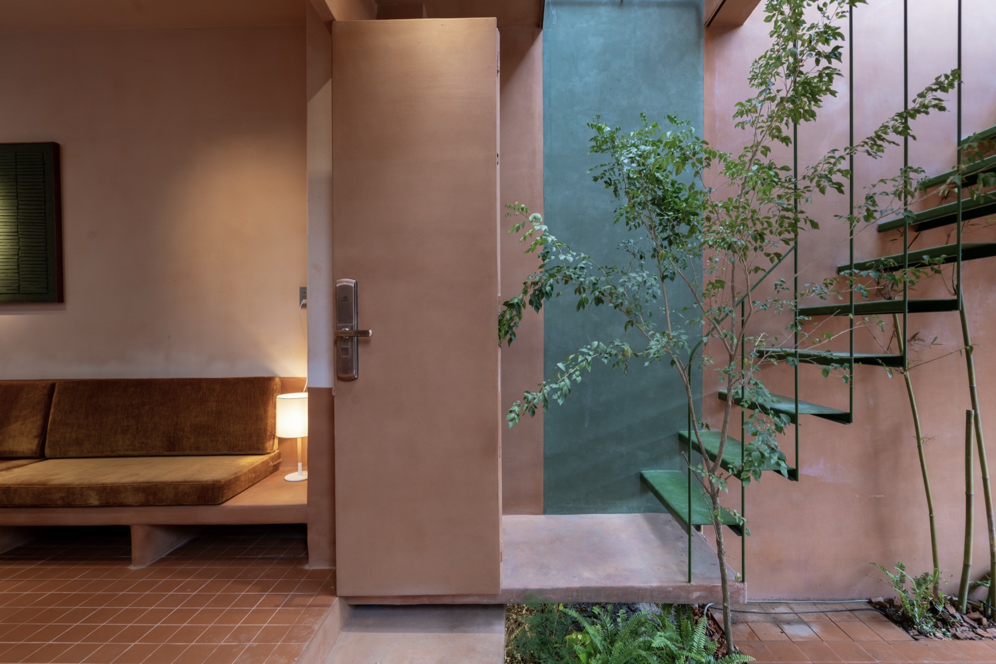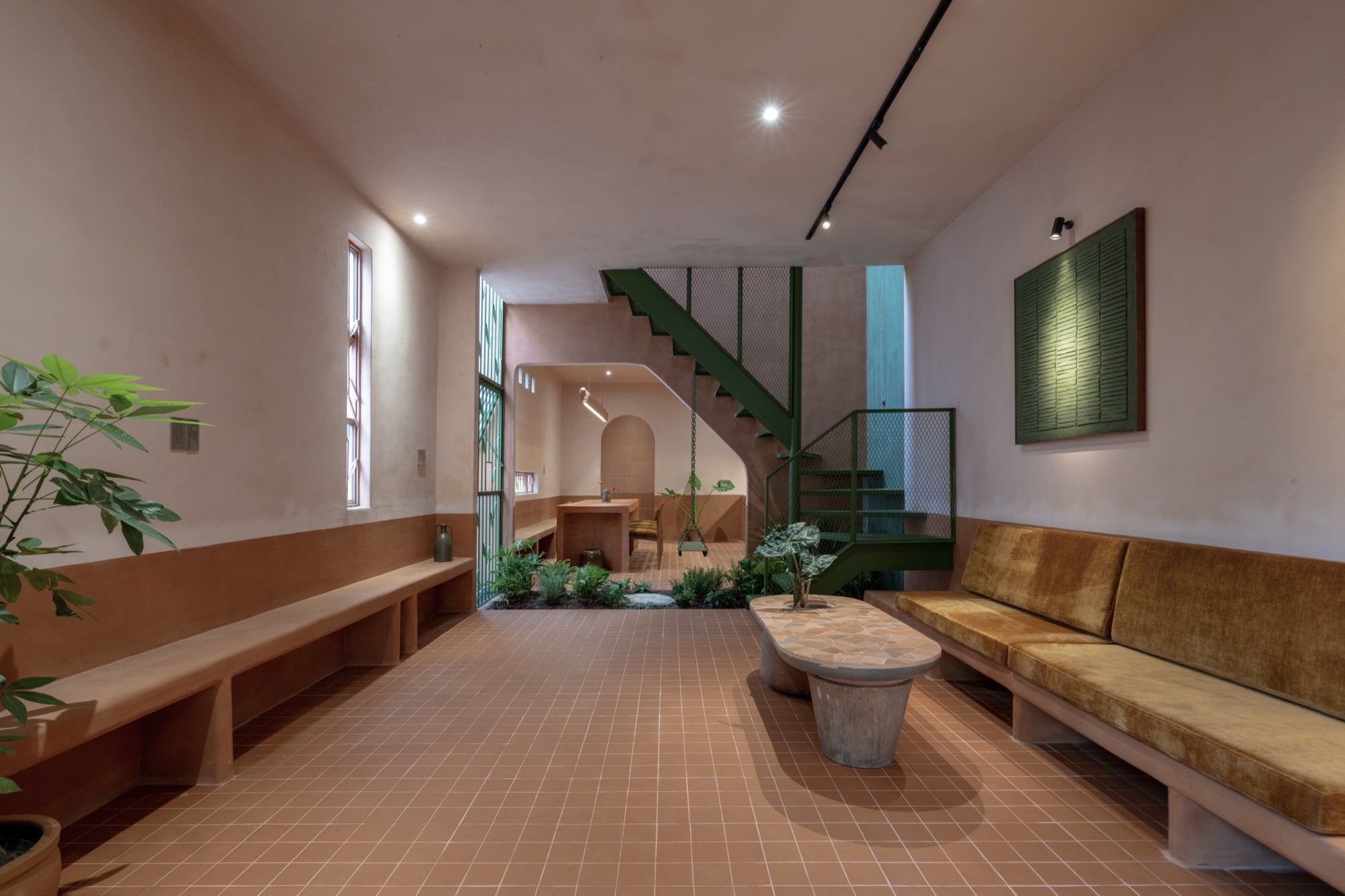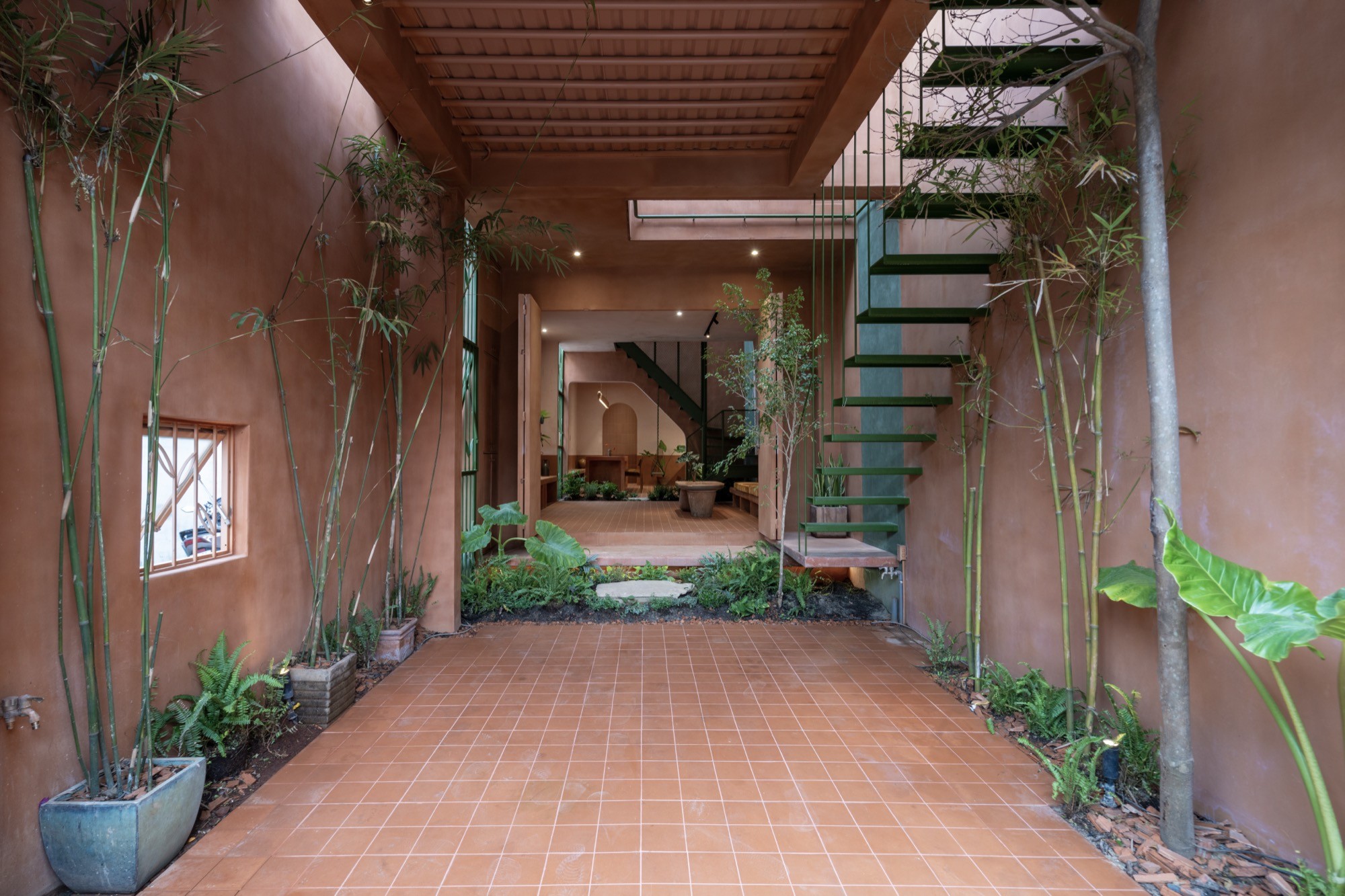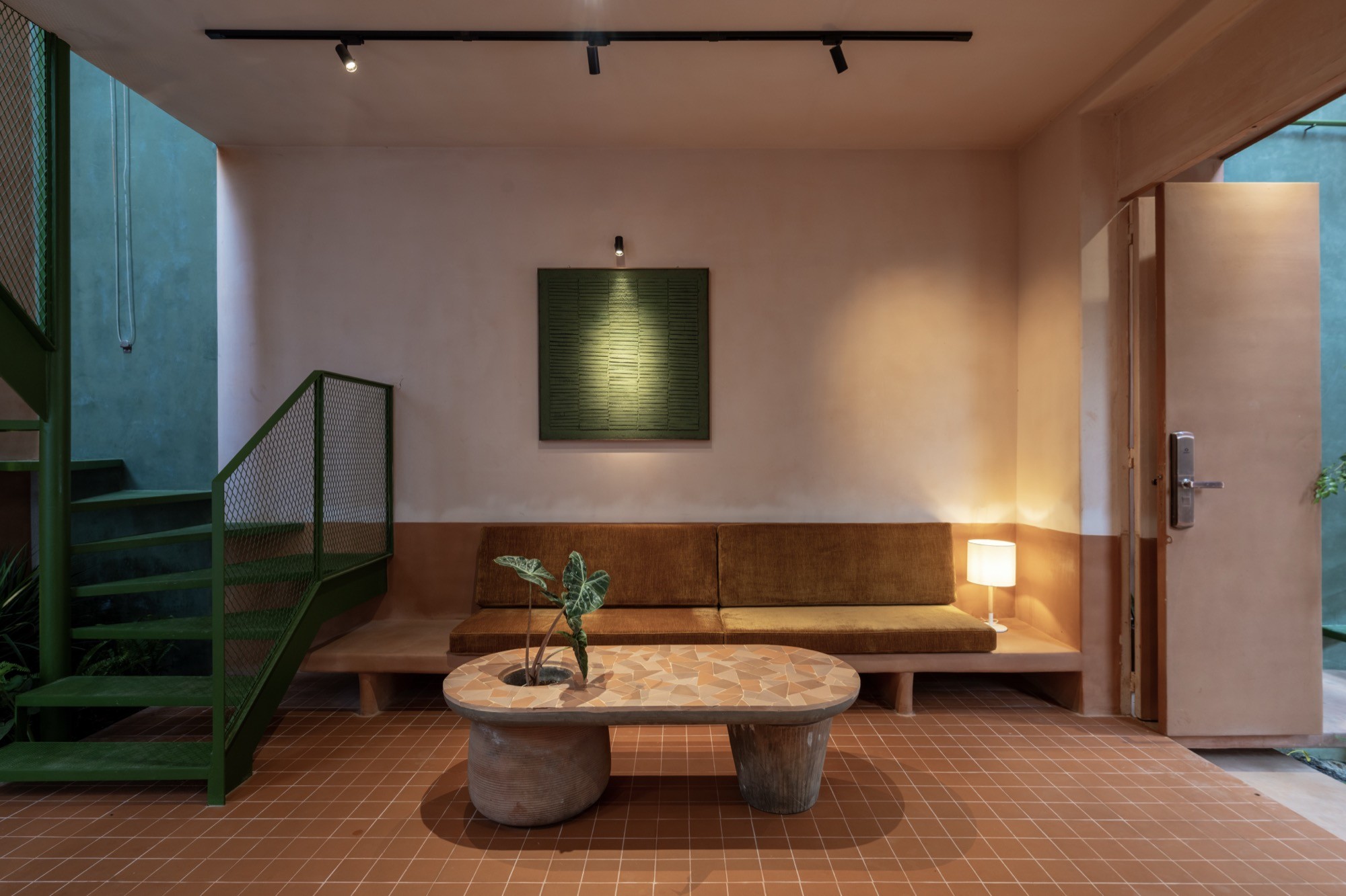 Bảng vật liệu thiên về sắc độ đất với gạch gốm, gỗ tái chế, sắt thô và hỗn hợp đất sét cải tiến để thích ứng khí hậu. Nội thất phần lớn do chính gia chủ chế tác, từ những chi tiết gợi hình ảnh đời sống nông thôn đến các cấu kiện tái sử dụng