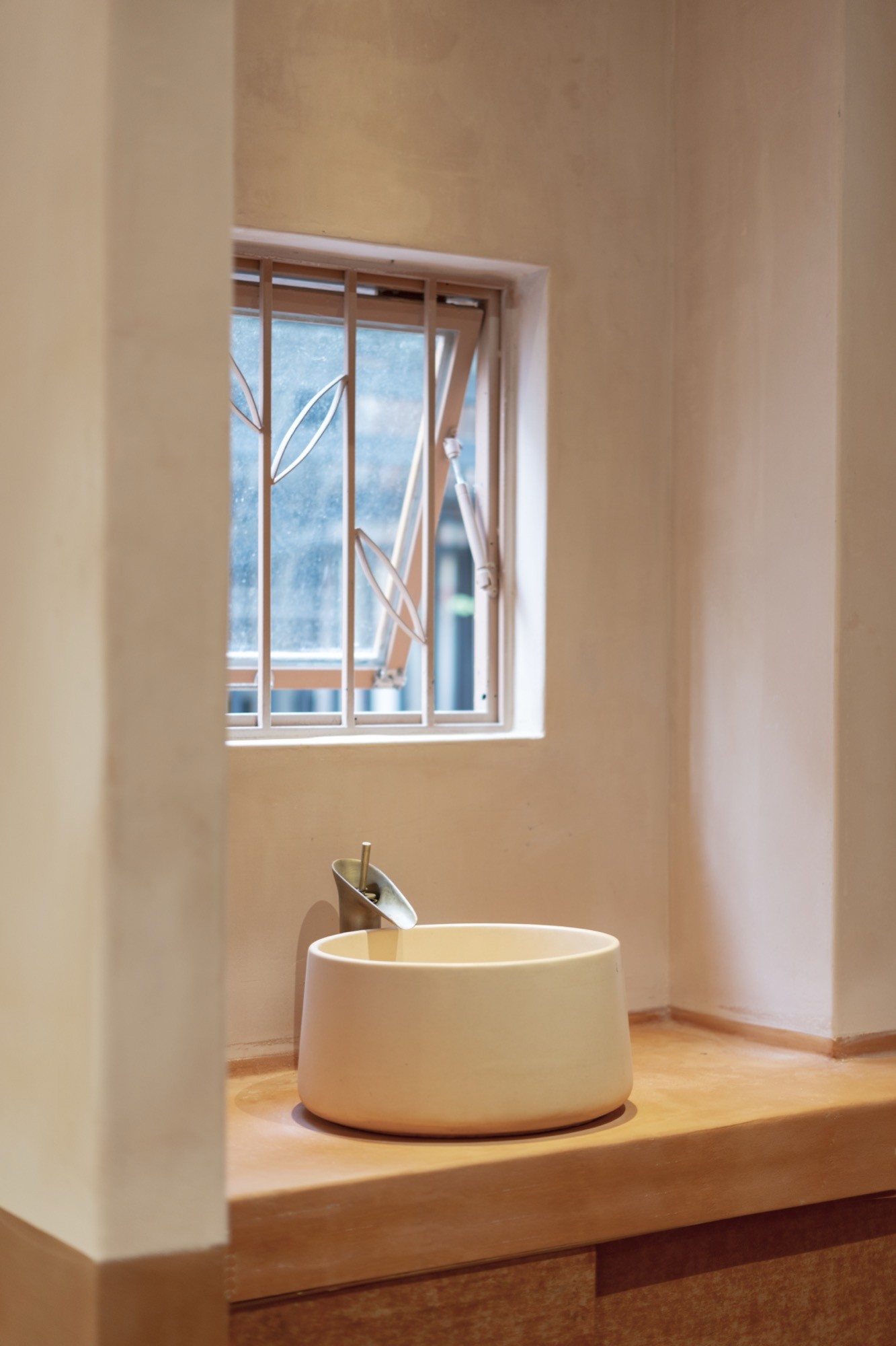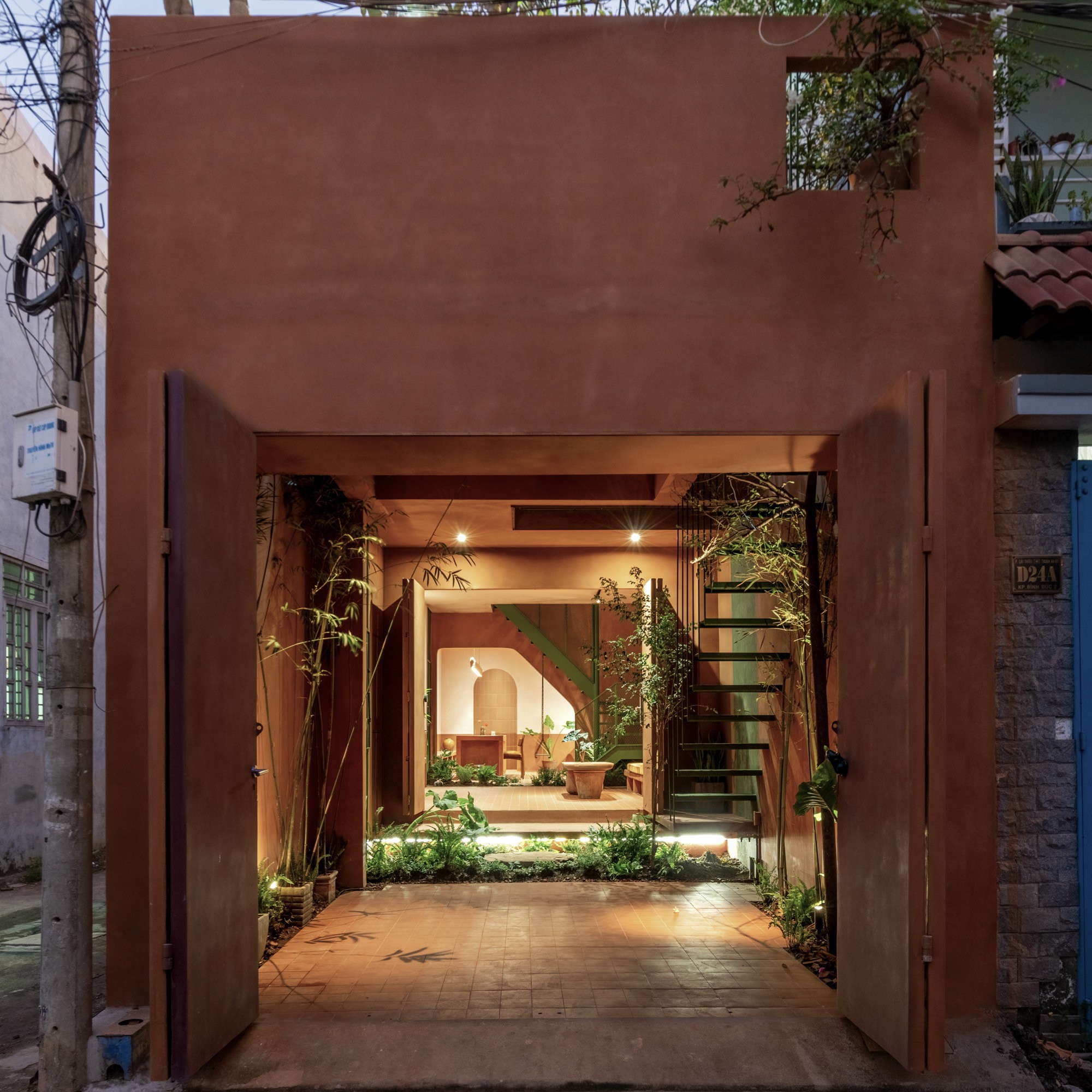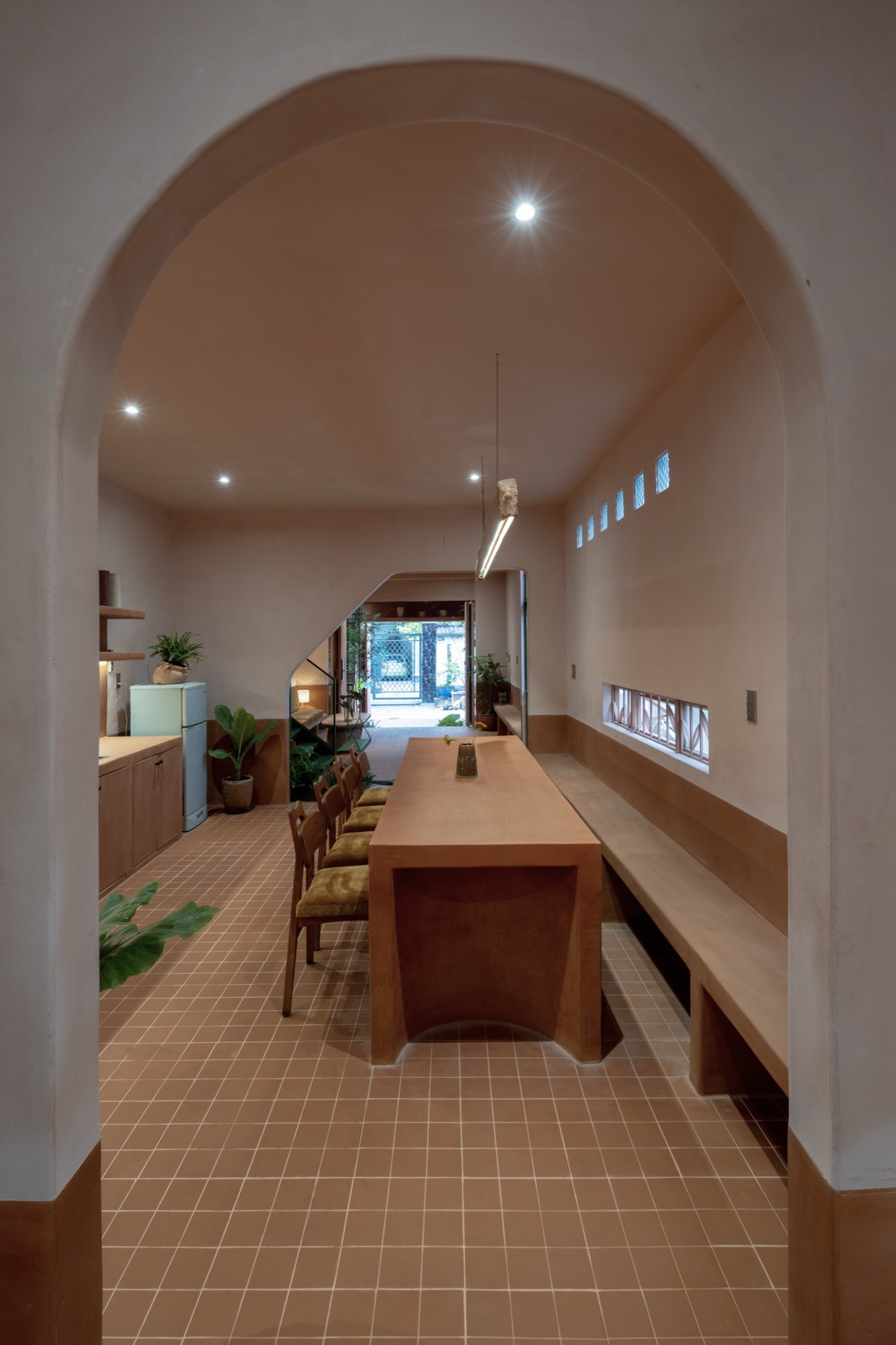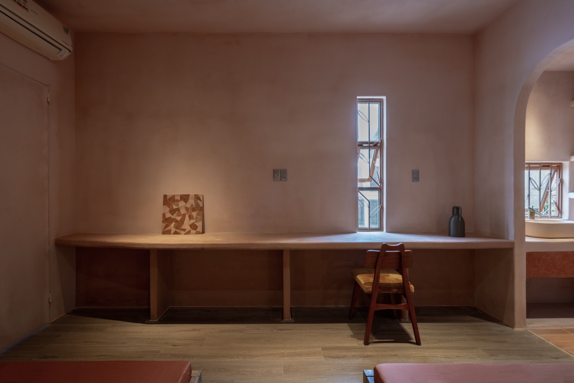 Bảng vật liệu thiên về sắc độ đất với gạch gốm, gỗ tái chế, sắt thô và hỗn hợp đất sét cải tiến để thích ứng khí hậu. Nội thất phần lớn do chính gia chủ chế tác, từ những chi tiết gợi hình ảnh đời sống nông thôn đến các cấu kiện tái sử dụng